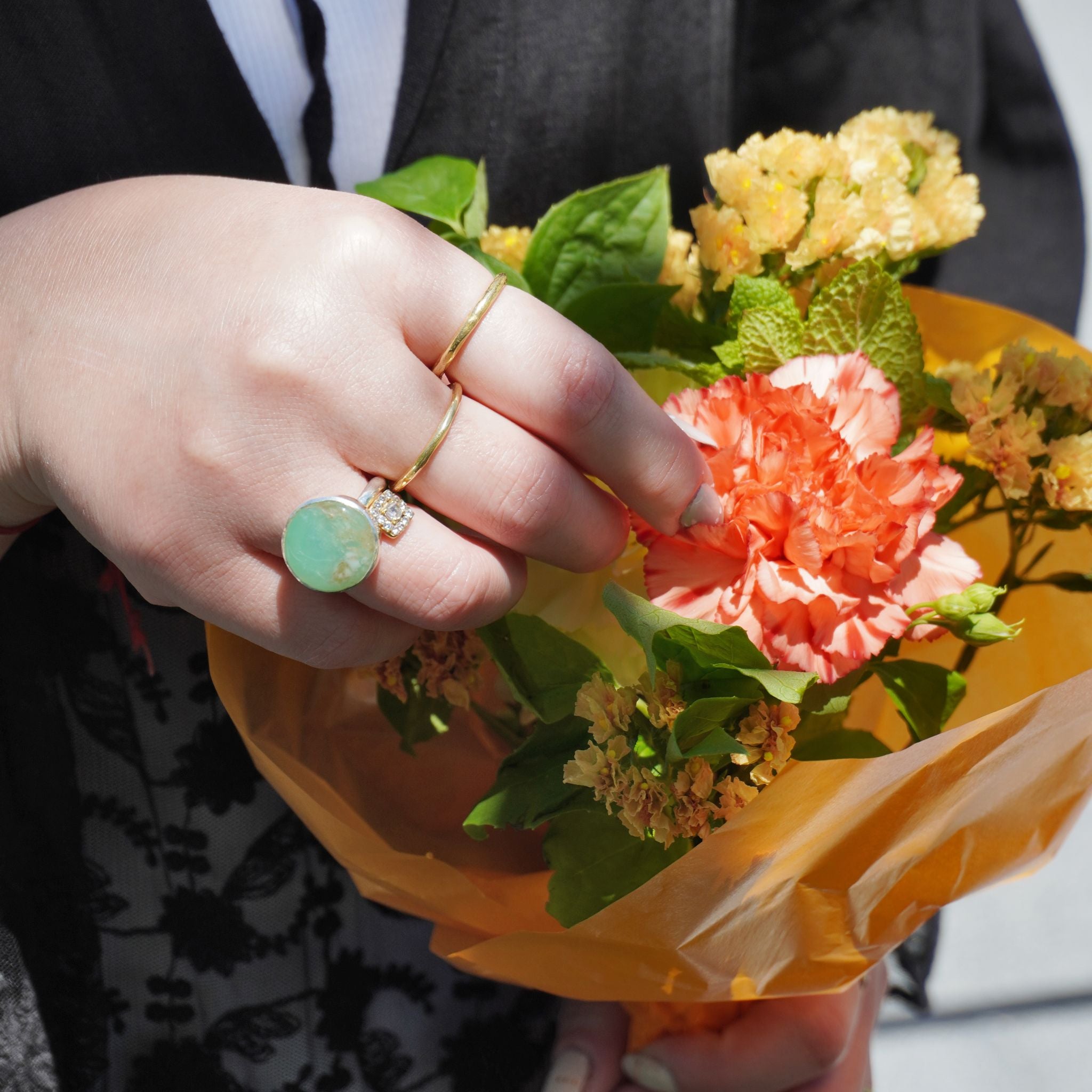 色や質感のバランス、結婚指輪やお持ちのリングとのスタイリングのコツまでたっぷりと写真に収めました。