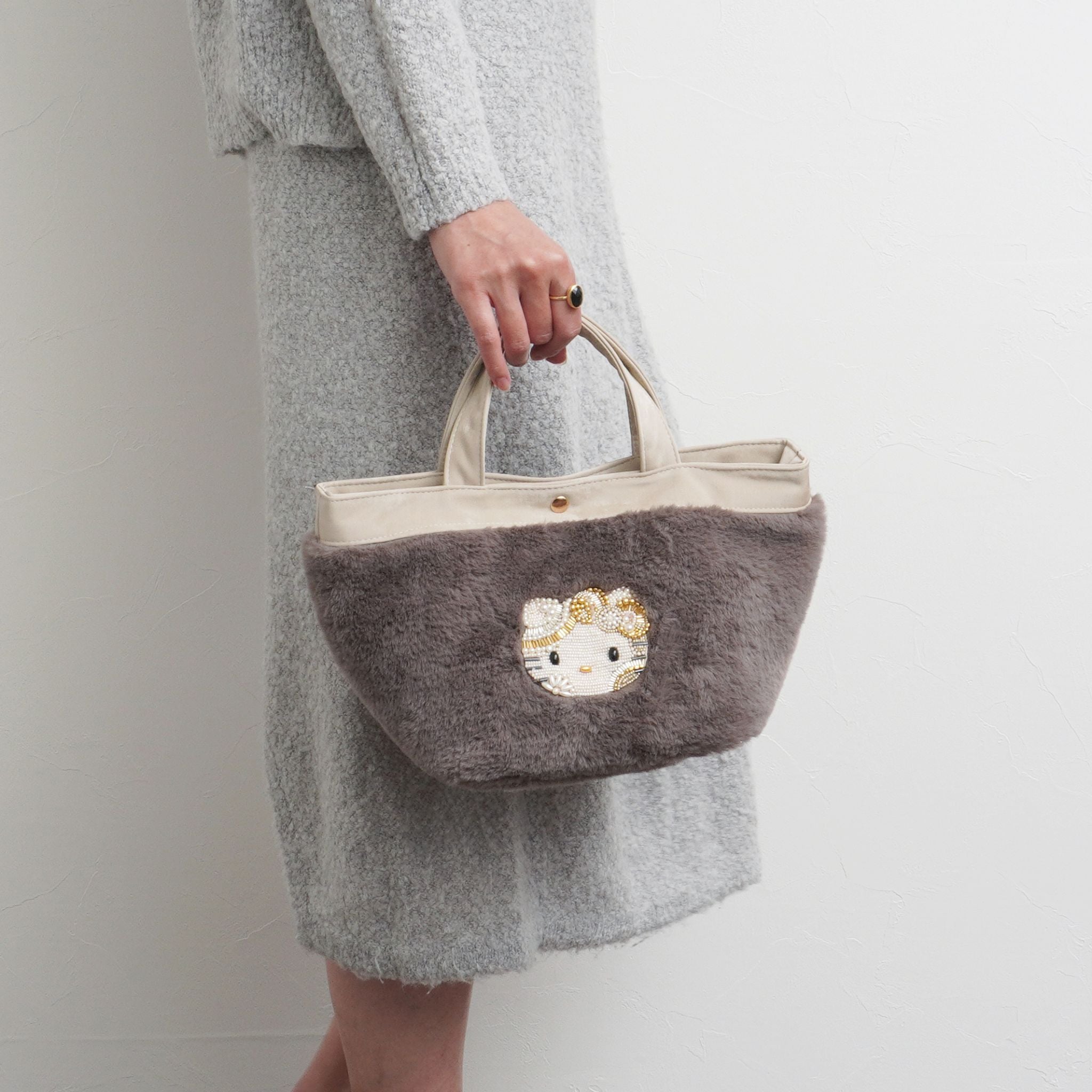 HelloKittyのビーズ刺繍が柔らかな肌触りのファーのバッグになりました。きらびやかなビーズのHelloKittyとファーの相性がバツグン。持つだけでシーズンムードと上品さが漂います。ふわふわもこもことしたファー素材が持つ温かみと柔らかさが、コーディネートに上品さと季節感をプラスします。持ち手部分はレザー調の素材で仕上げておりメリハリよく。