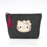 クラシックなブラックデニムと、ハローキティのビジューモチーフが絶妙なバランスで融合したポーチ。やや大きめサイズで、コスメから充電器まで幅広く収納可能。タッセルチャームがアクセントになり、カジュアルながらも華やかさを演出します。日常使いはもちろん、旅行にも便利なサイズ感で、実用性と可愛さを兼ね備えたポーチです。