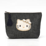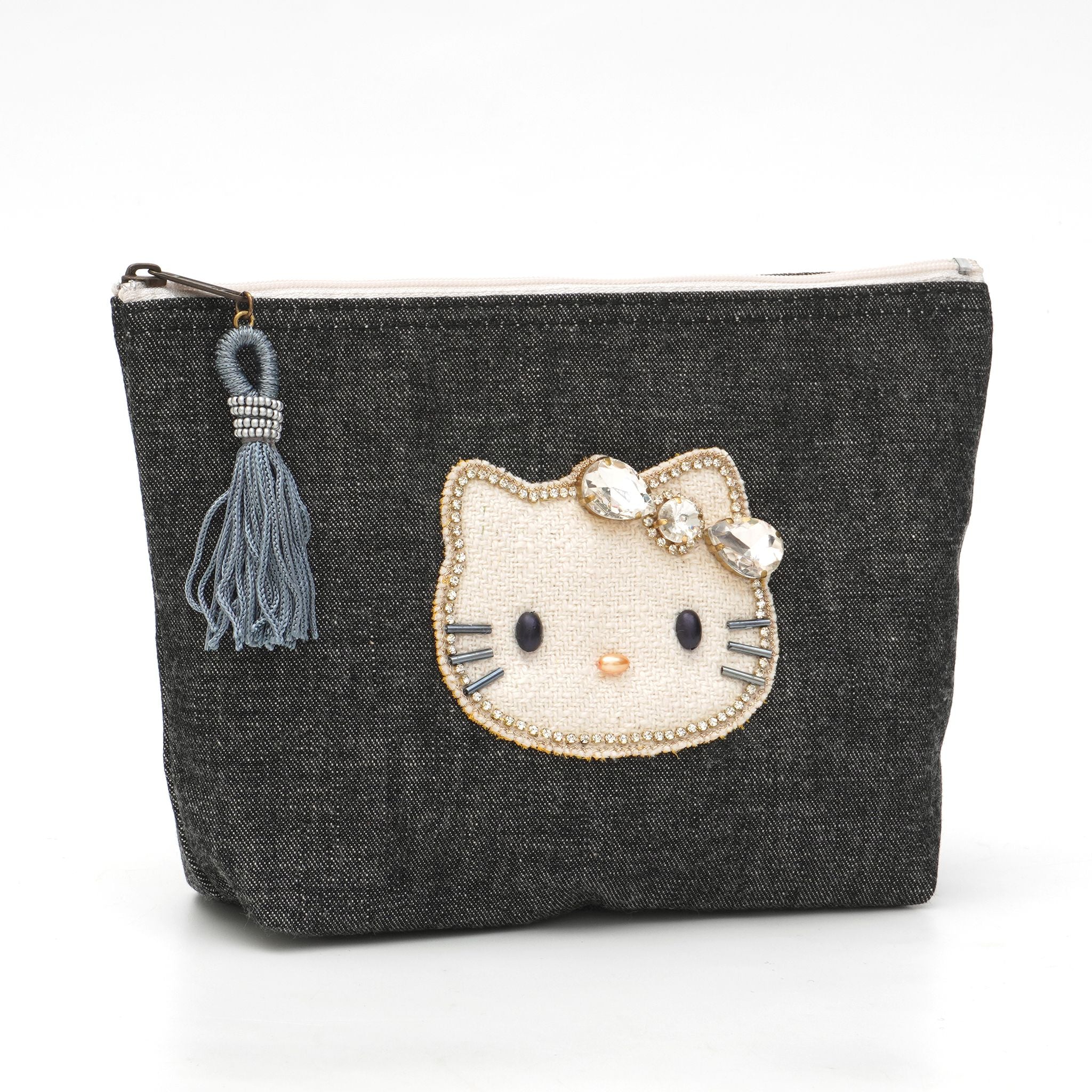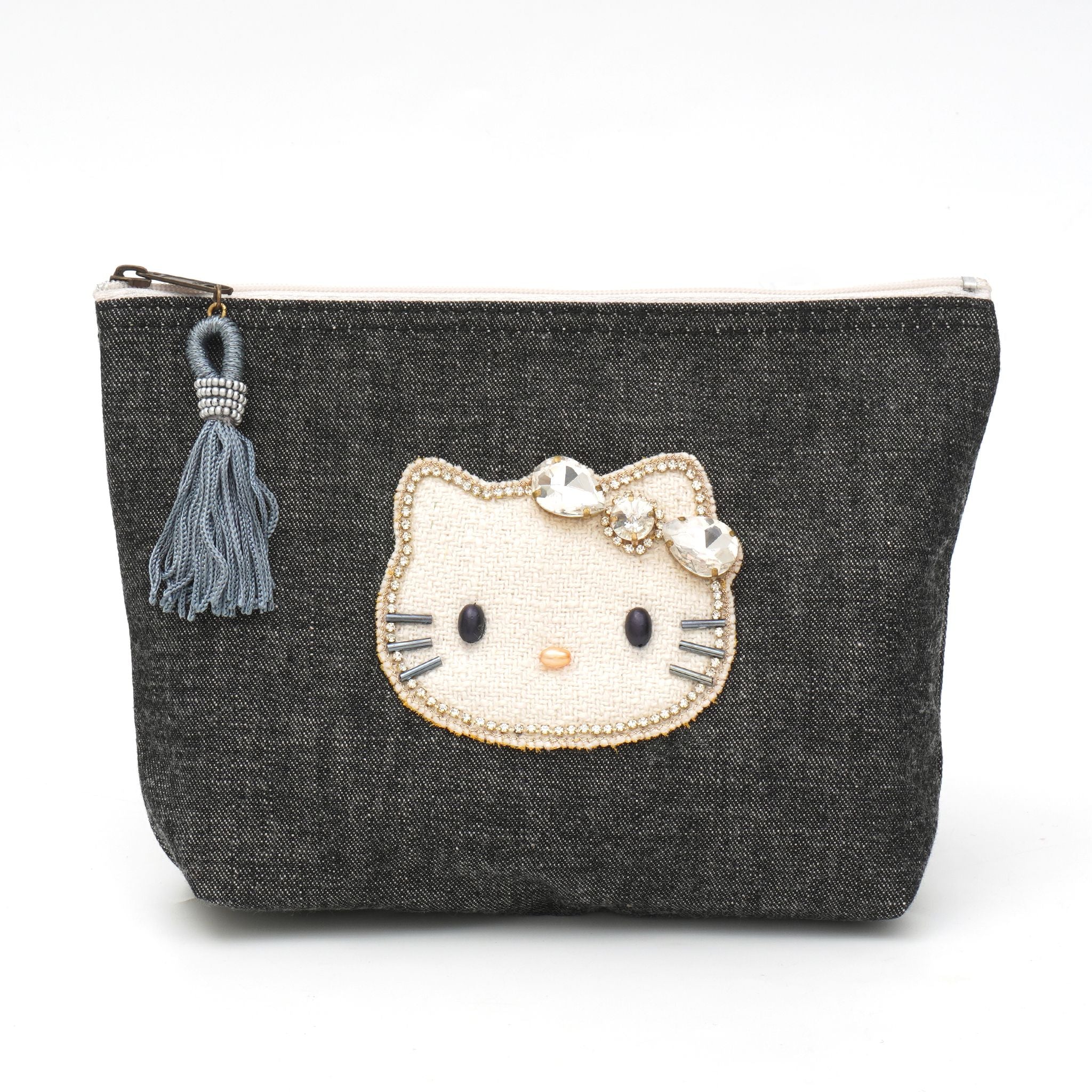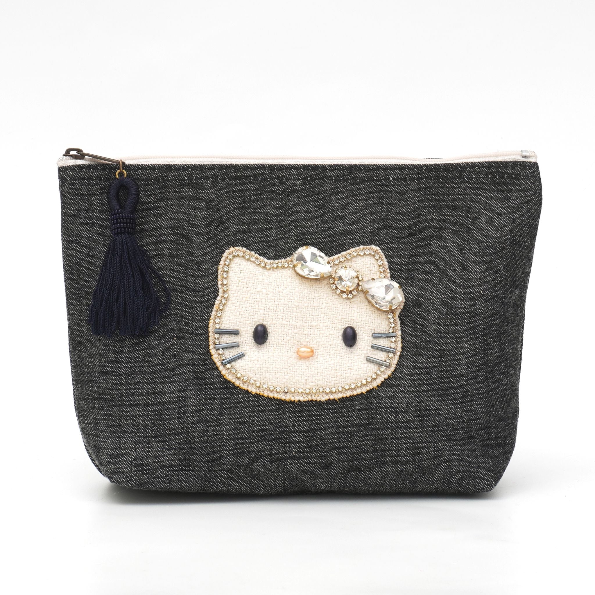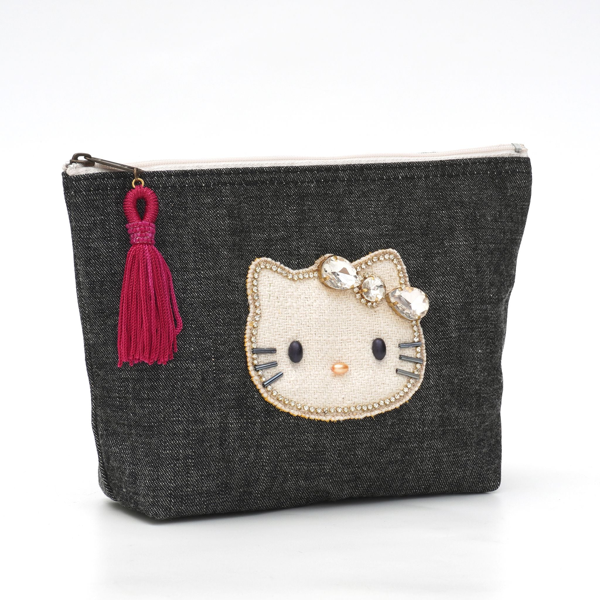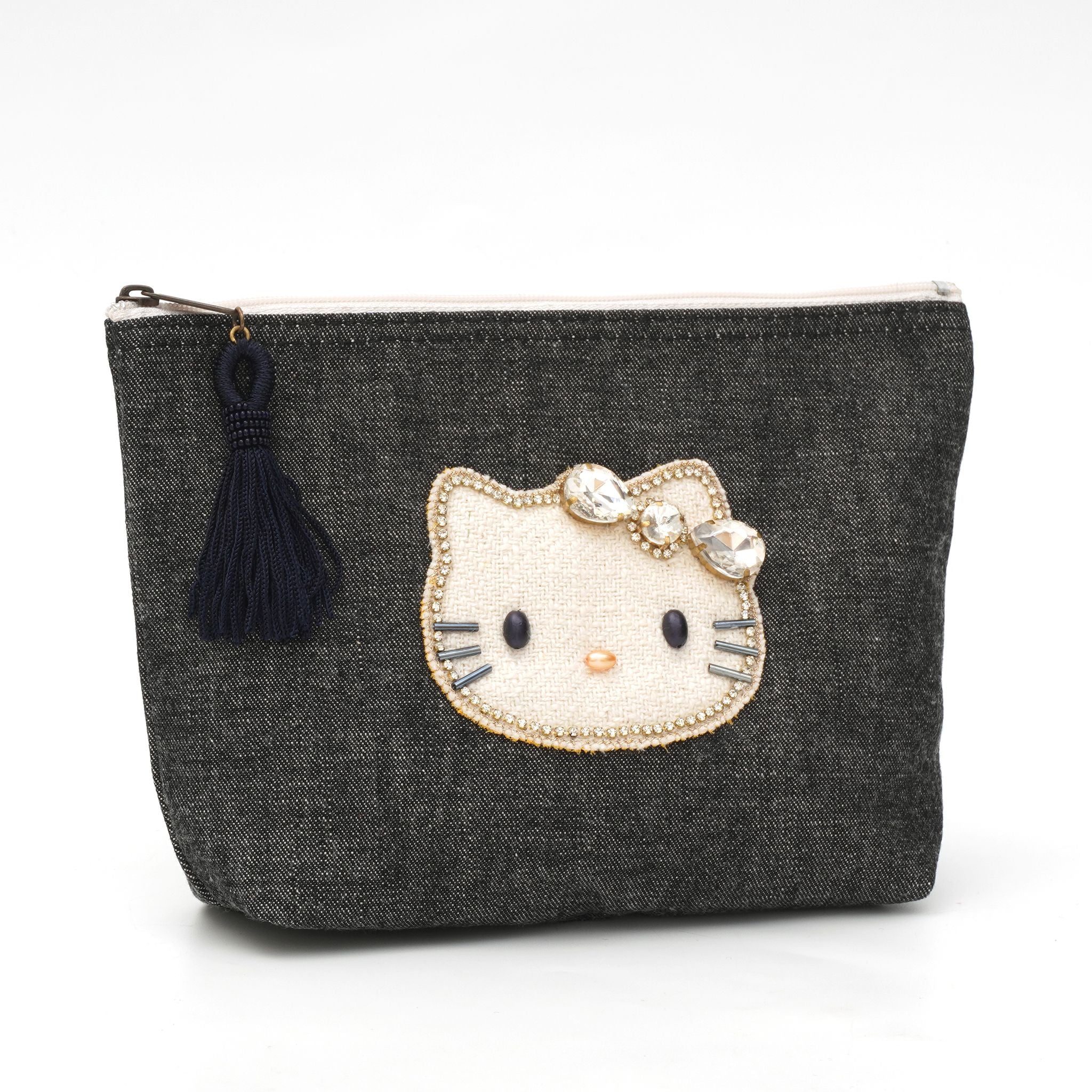 落ち着いたブラックデニムに、きらめくビジューリボンのキティが映える、大人のためのスペシャルアイテムです。バッグ・ポーチ・ミニポーチの3型展開。
