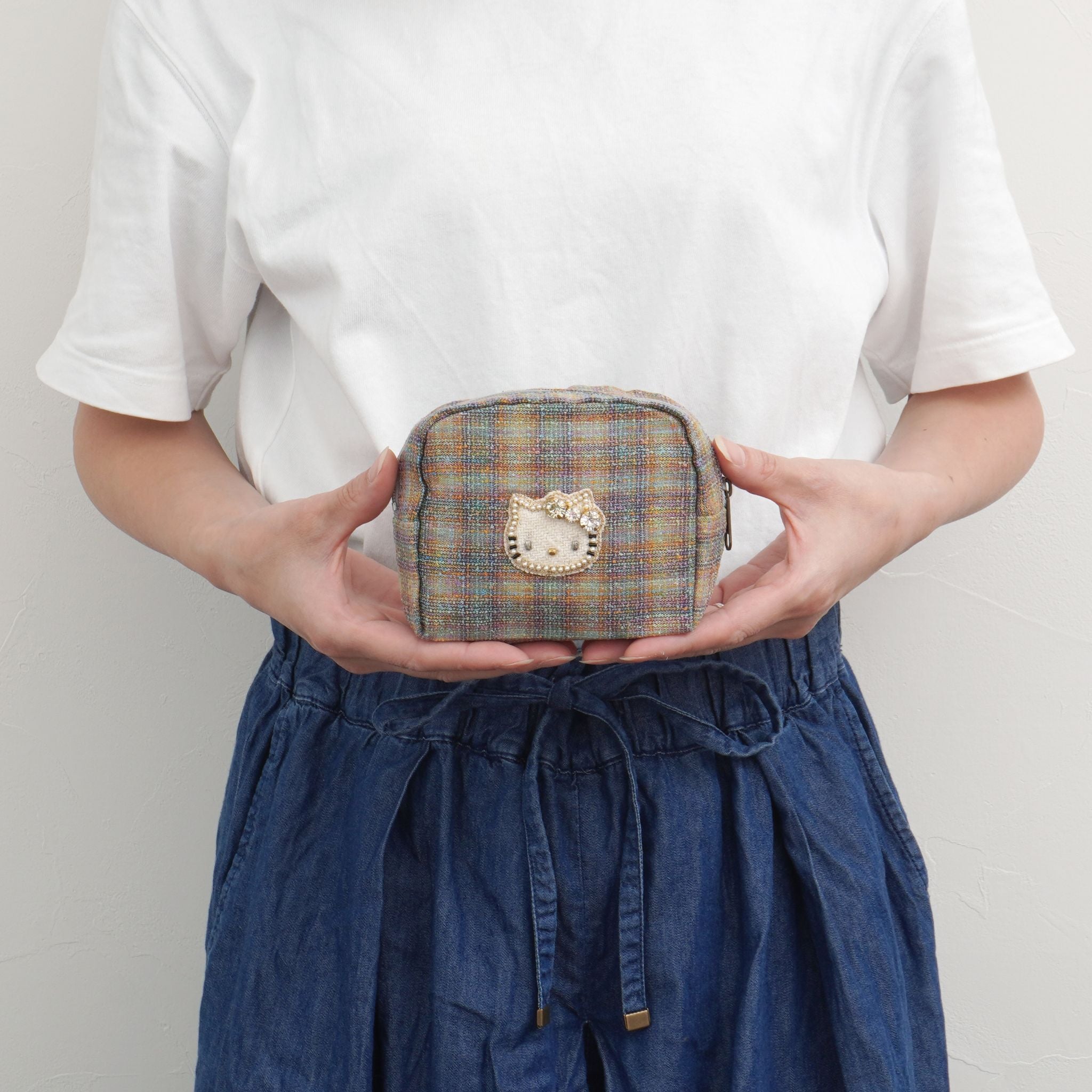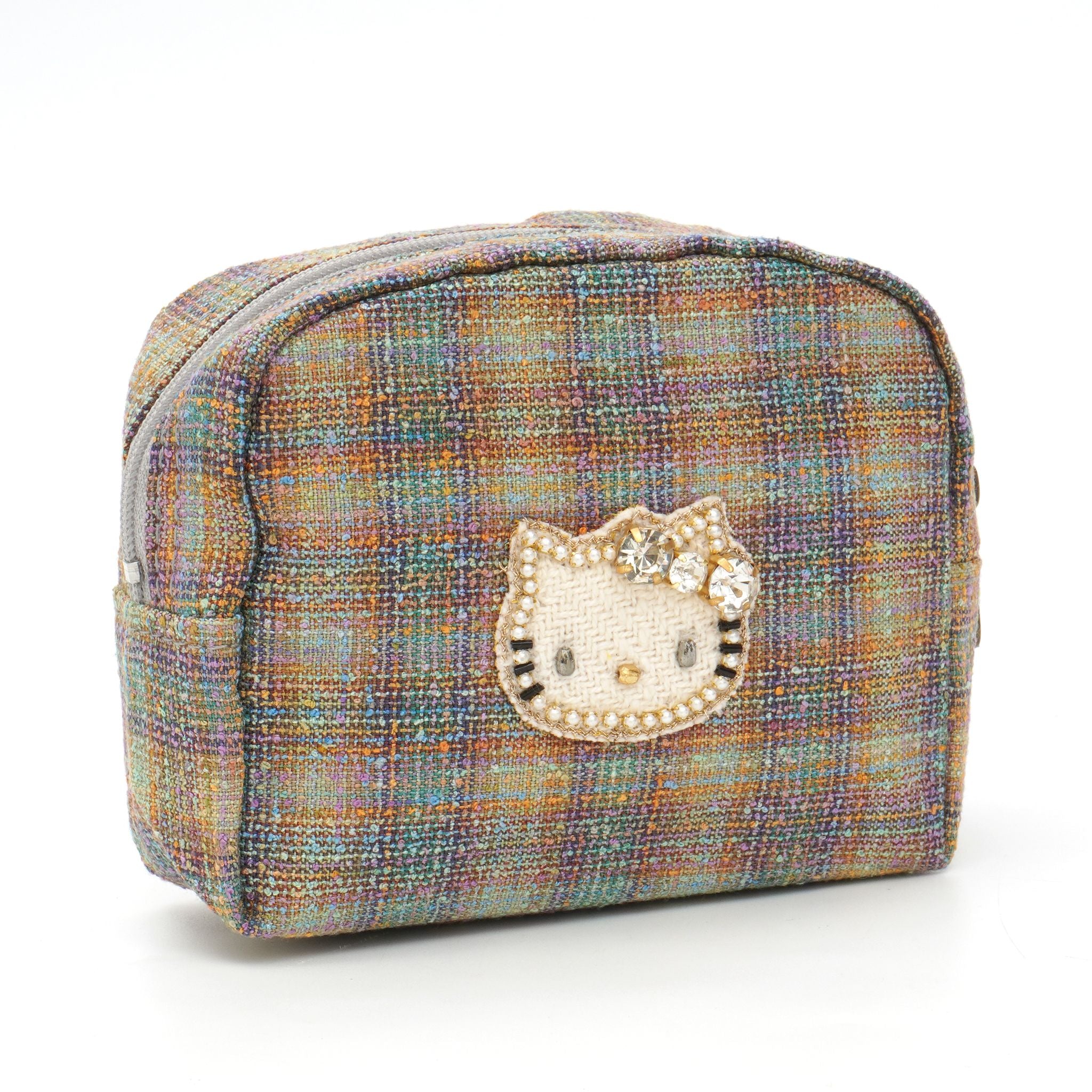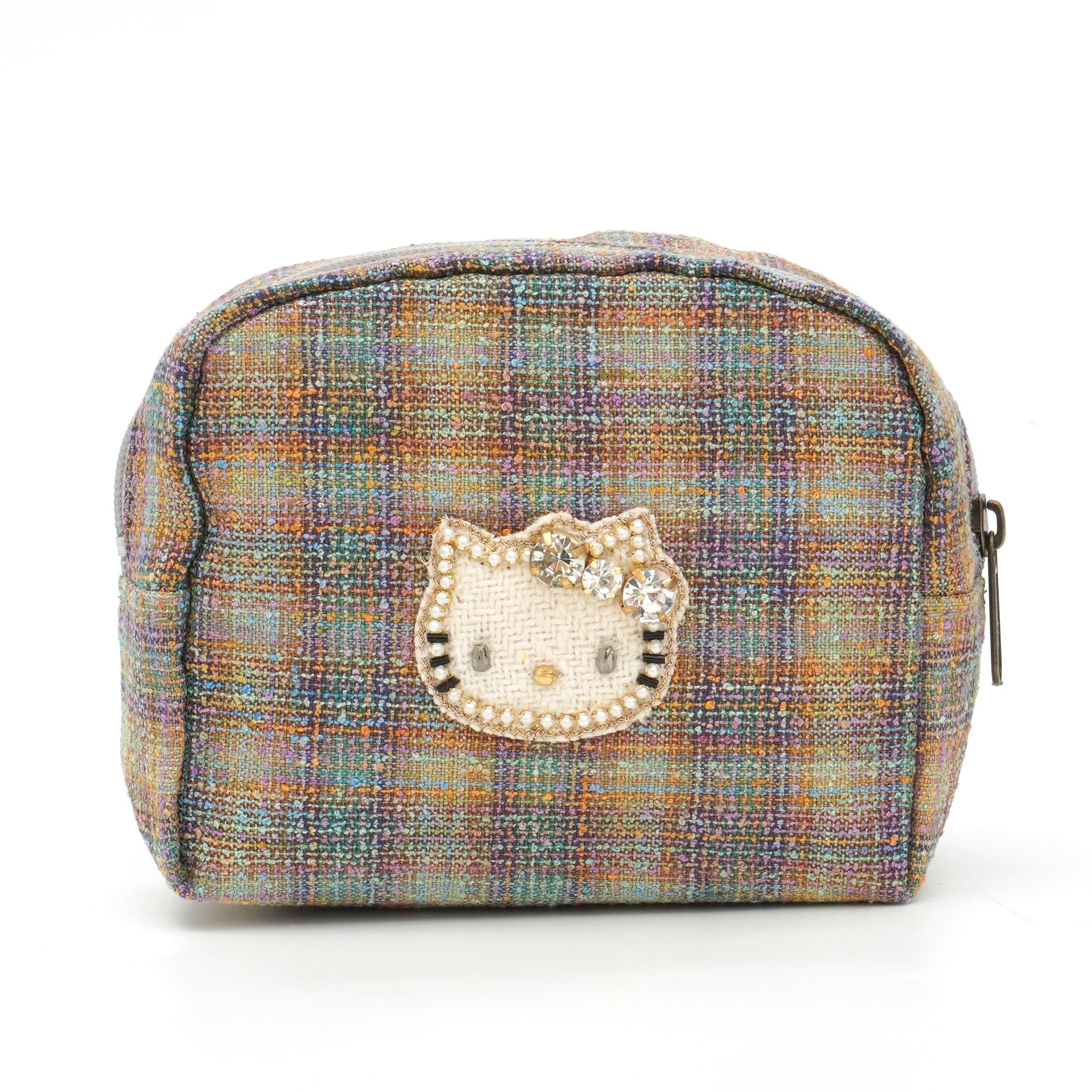 カラフルな糸が織りなすレインボーのようなツイード生地に、きらめくキティのビジューモチーフをあしらったポーチ。上品な光沢とあたたかみのある素材が、見る角度によってさりげなく表情を変えます。メイク道具やアクセサリーをまとめるのにちょうどいいサイズ感で、バッグの中を華やかに彩ります。持っているだけで気分が上がる、ハッピーカラーのポーチです。