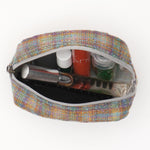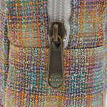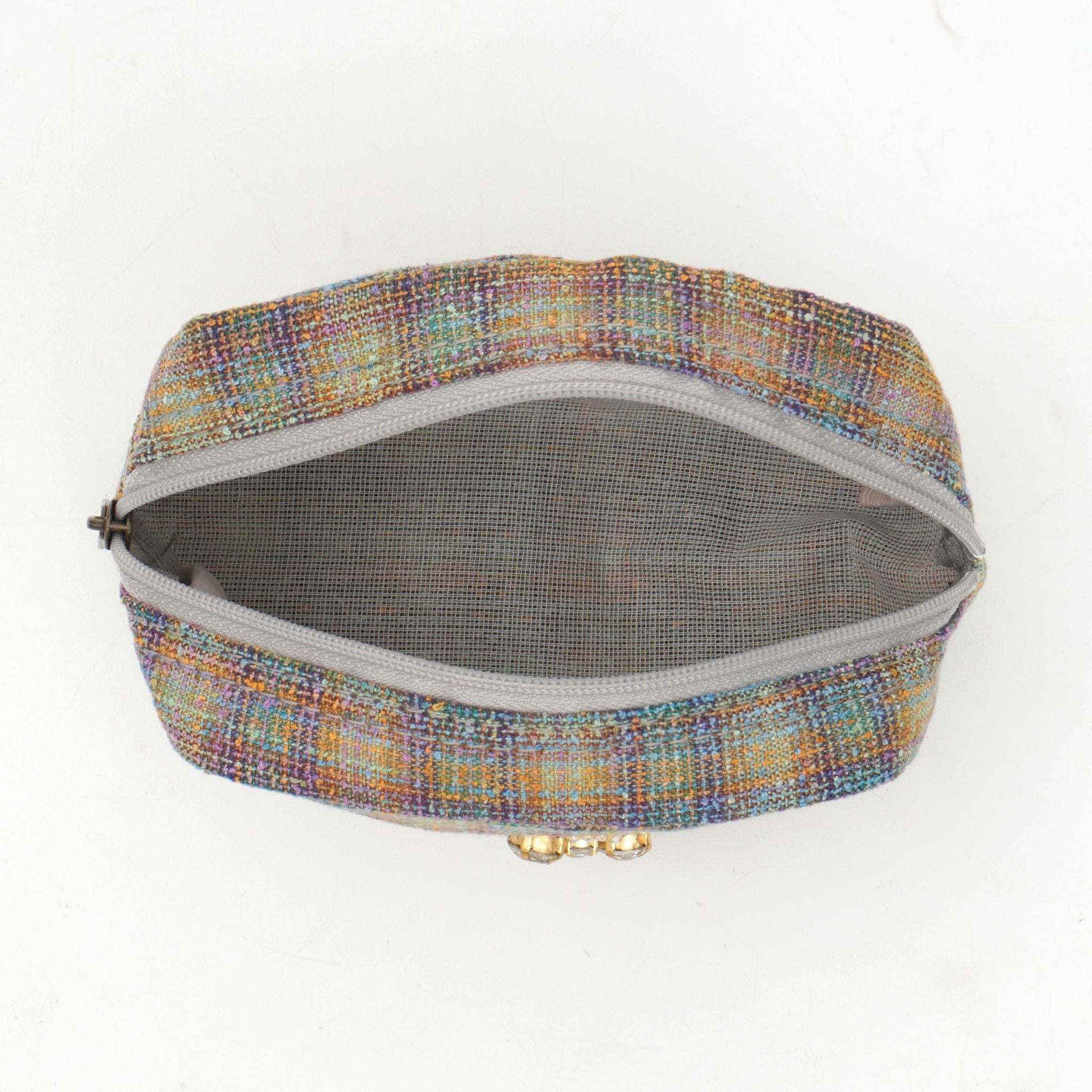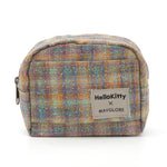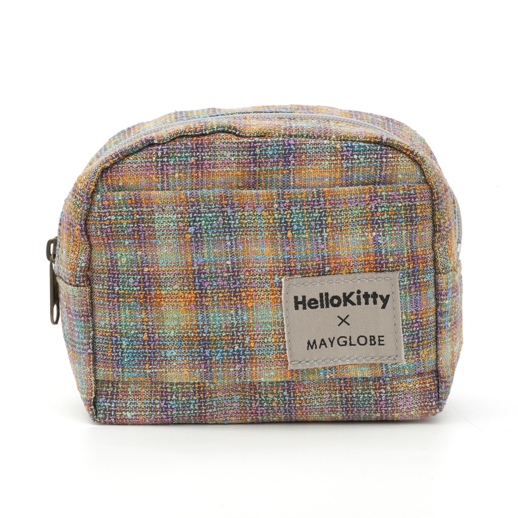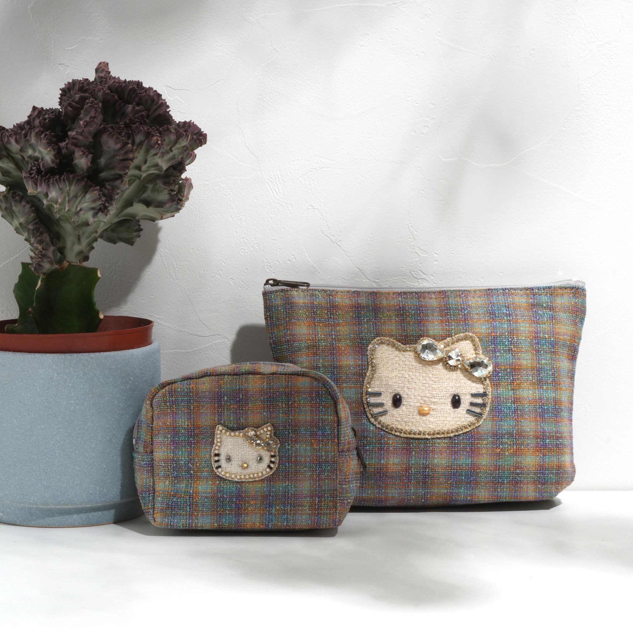 カラフルな糸が織りなすレインボーのようなツイード生地に、きらめくキティのビジューモチーフをあしらったポーチ。上品な光沢とあたたかみのある素材が、見る角度によってさりげなく表情を変えます。メイク道具やアクセサリーをまとめるのにちょうどいいサイズ感で、バッグの中を華やかに彩ります。持っているだけで気分が上がる、ハッピーカラーのポーチです。