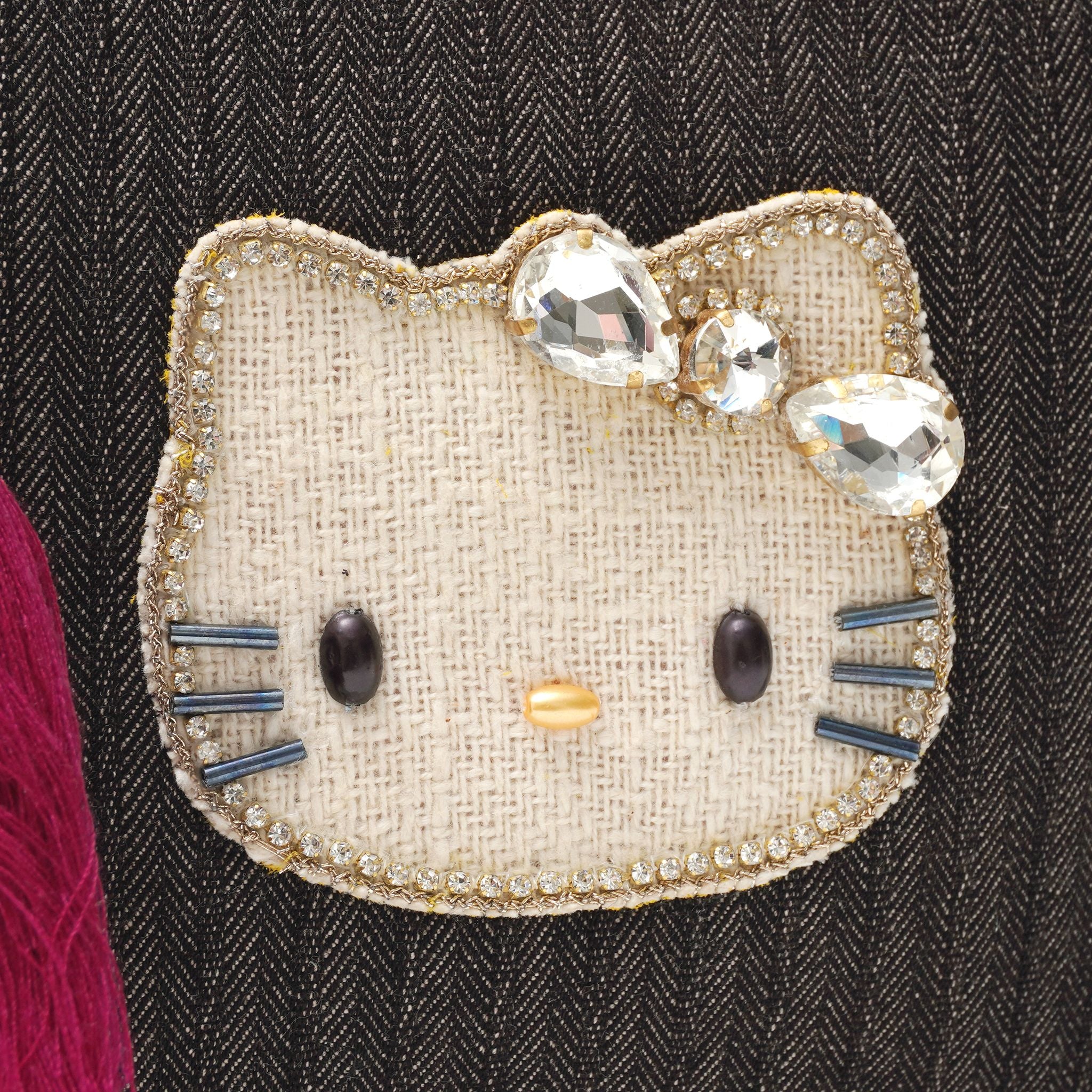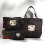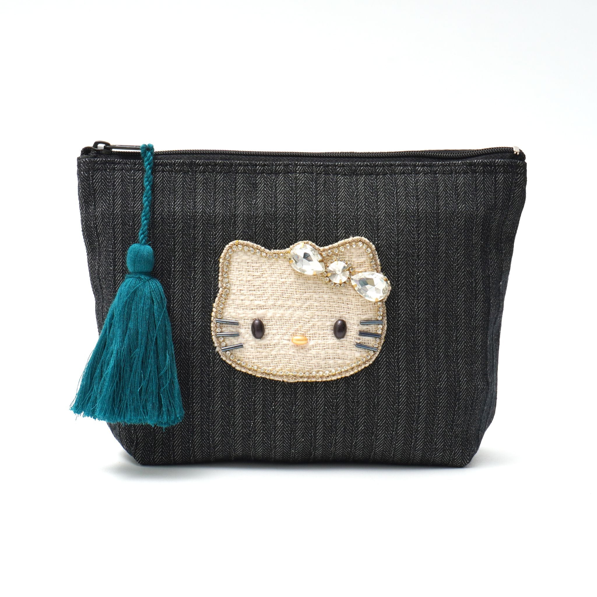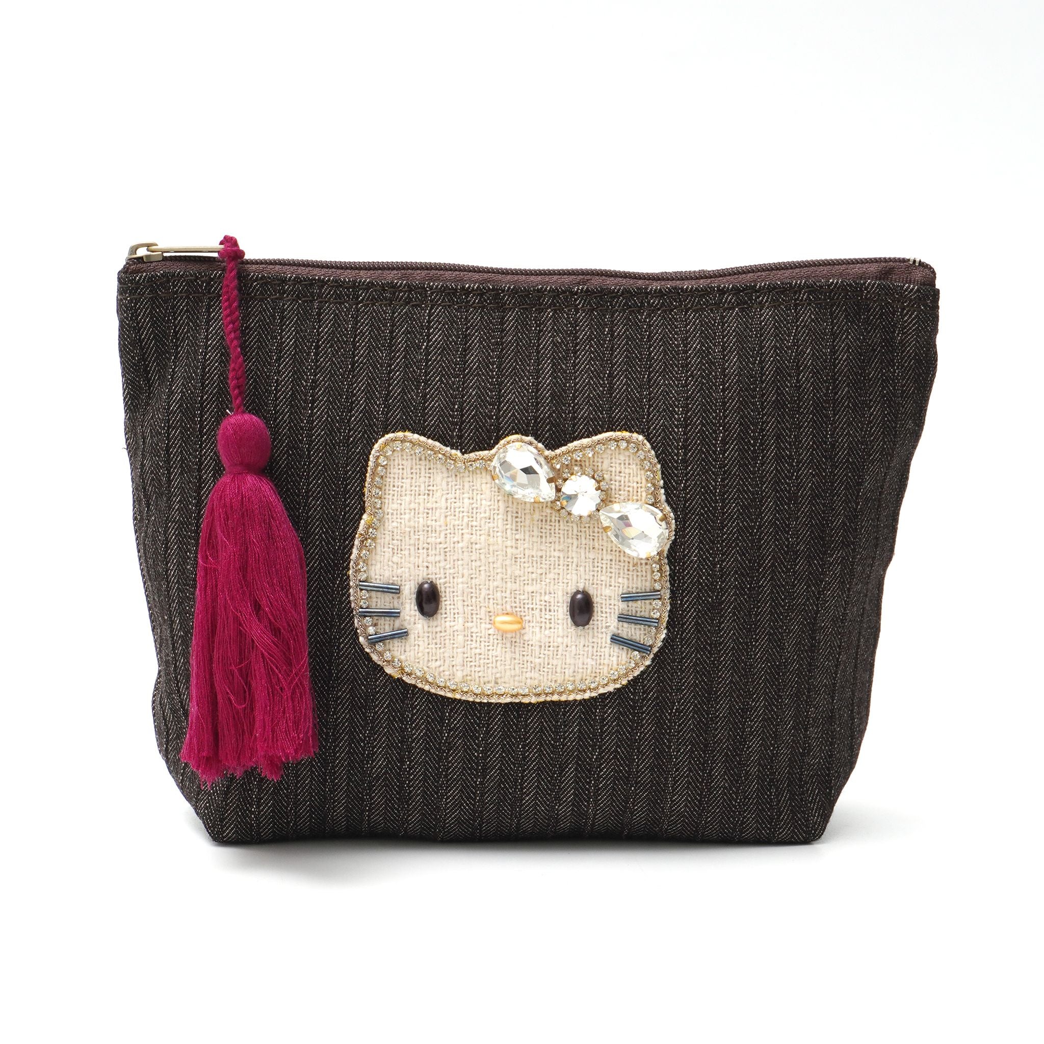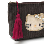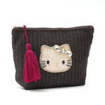 上品なヘリンボーン織りのデニム素材に、きらめくキティのビジューモチーフをあしらったポーチ。深みのあるカラーに映えるタッセルがアクセントになり、大人かわいい印象を引き立てます。柔らかな素材感で使いやすく、コスメや小物をすっきり収納できるサイズ感。カジュアルにも上品にもなじむ、毎日持ち歩きたくなるポーチです。