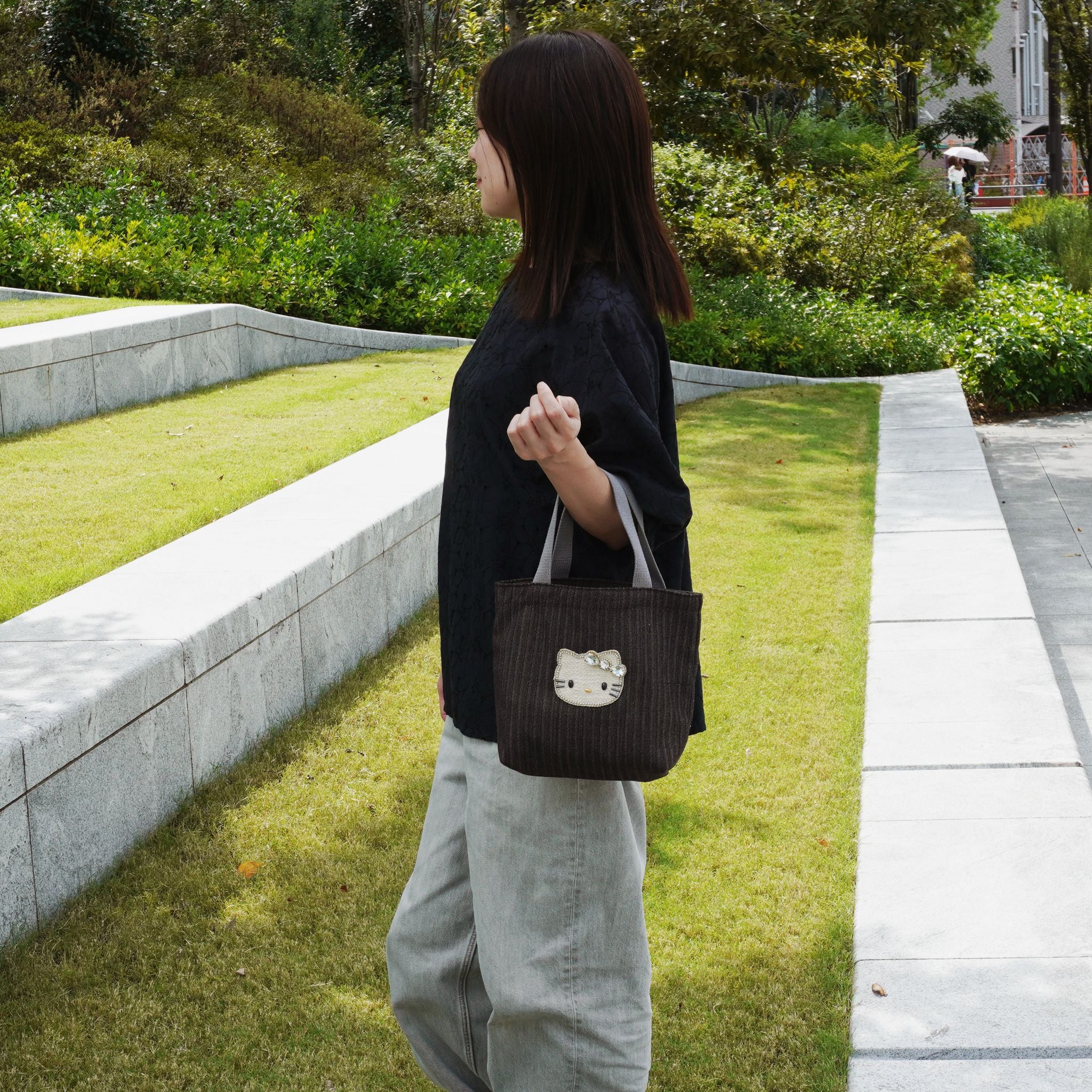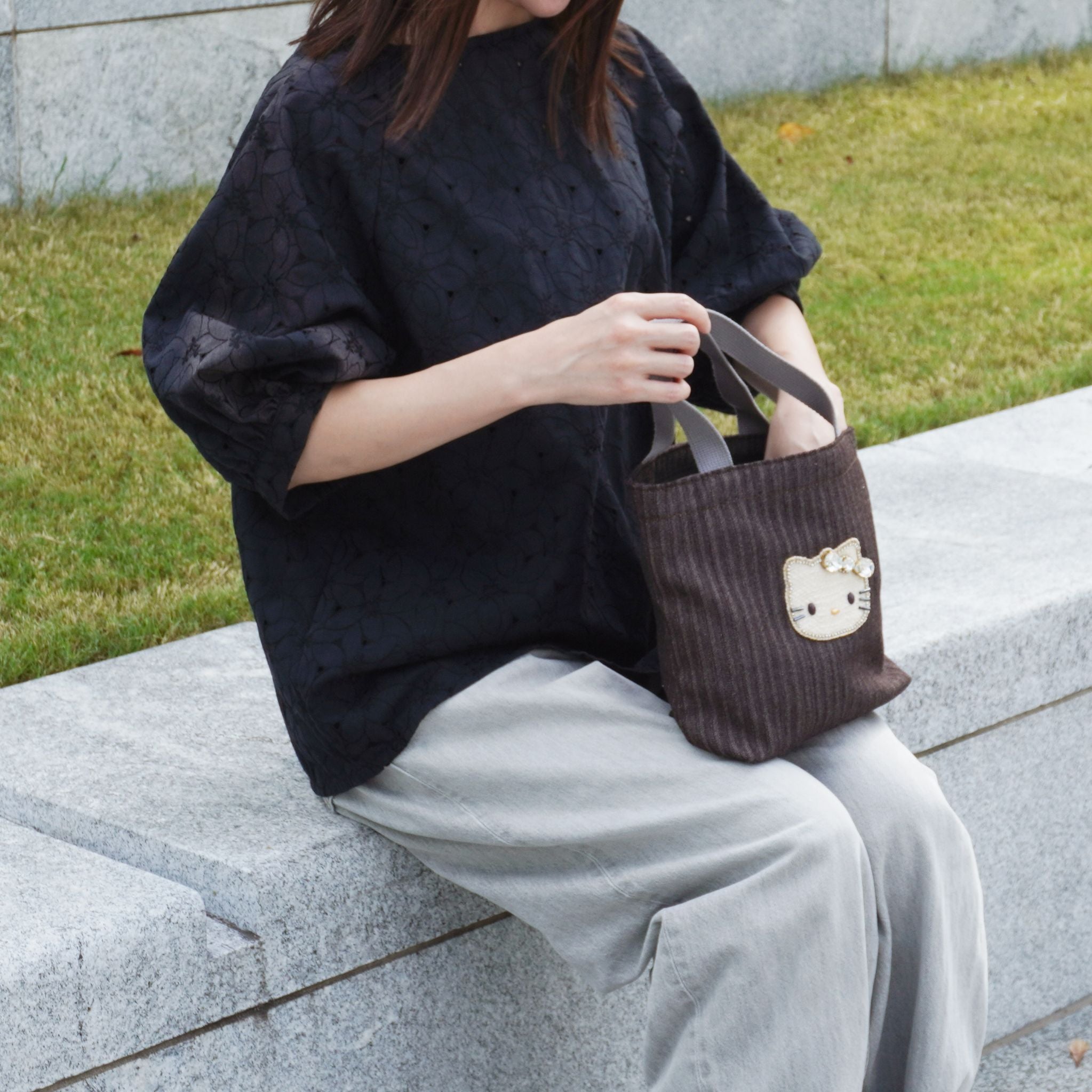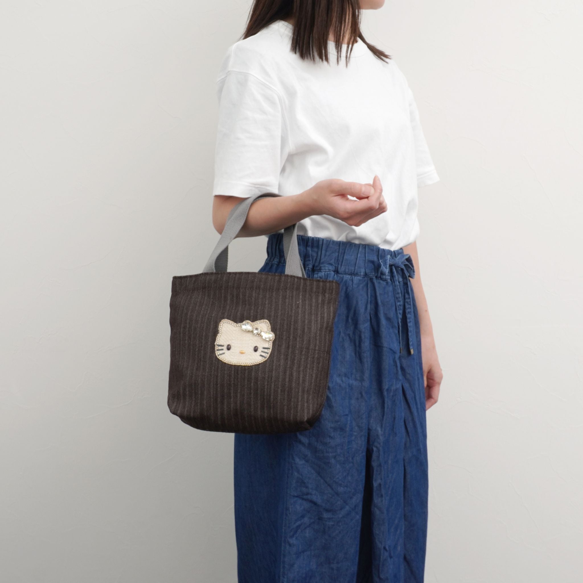 上品なヘリンボーン織りのデニム素材に、きらめくキティのビジューモチーフをあしらったトートバッグ。落ち着いたトーンの生地と、グレーの持ち手が大人かわいい印象を演出します。マチがあり見た目以上に収納力があるので、ランチバッグやお散歩バッグとしても活躍。カジュアルスタイルにもきれいめコーデにもなじむ、毎日使いたくなるバッグです。