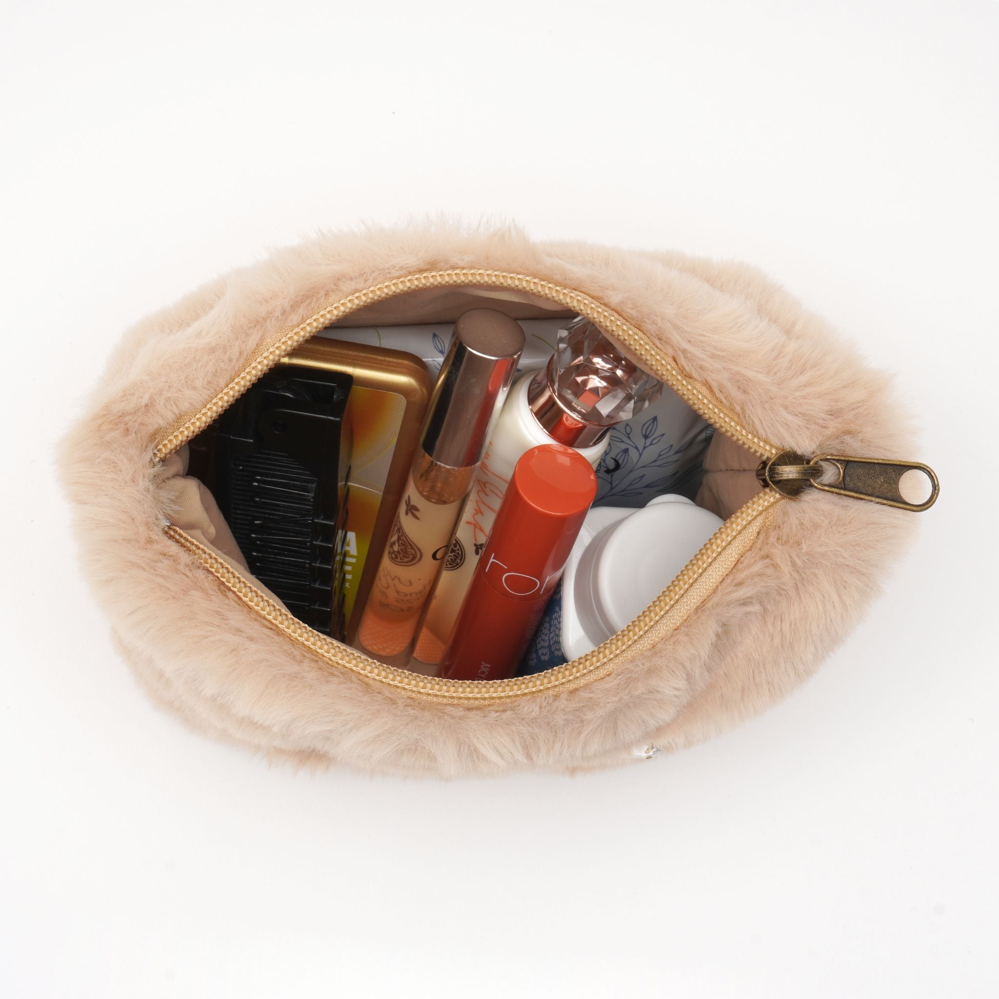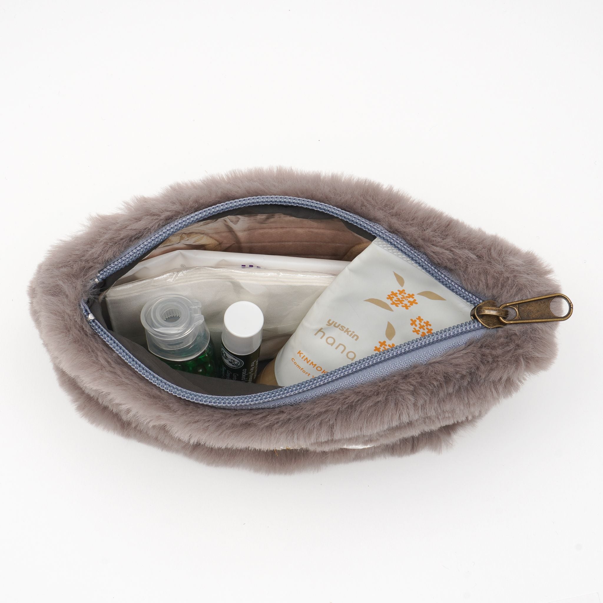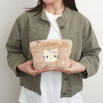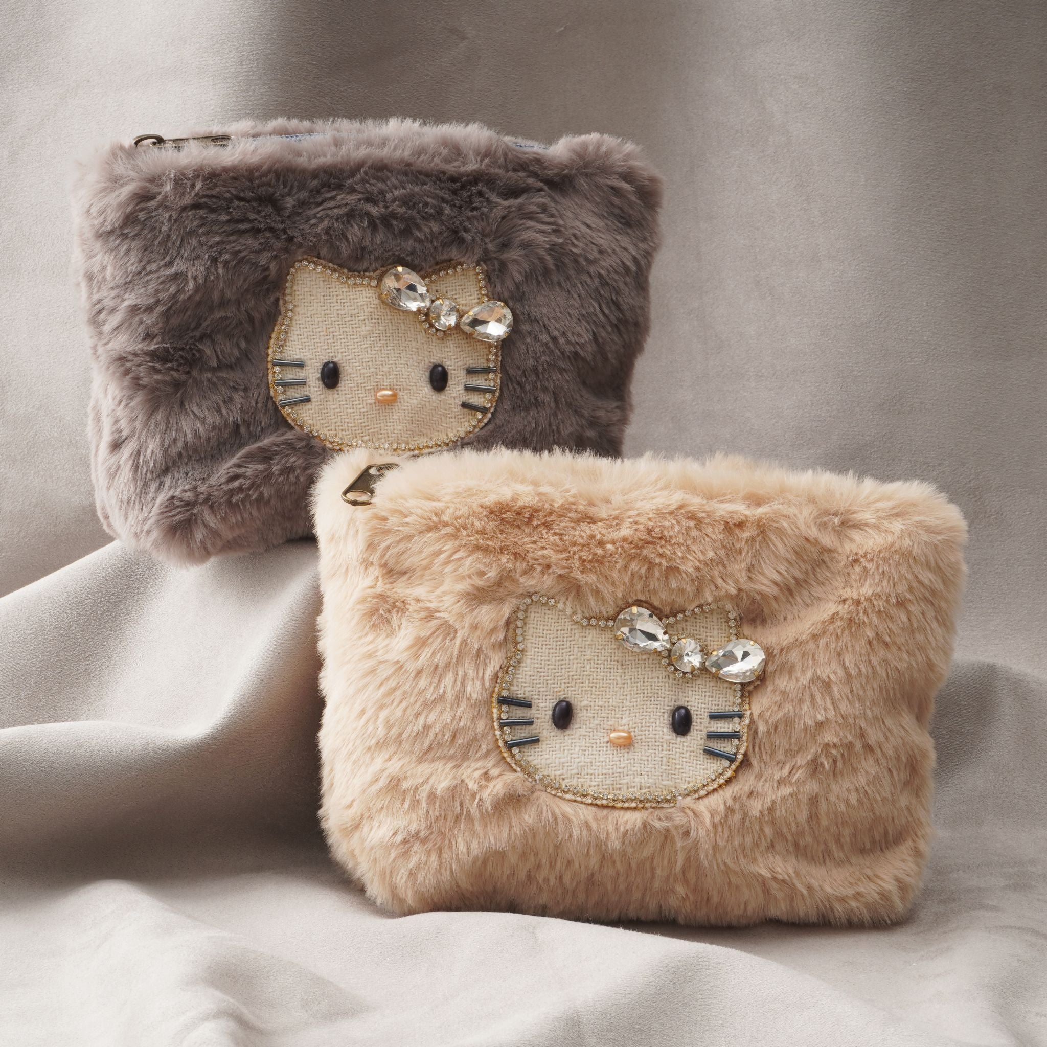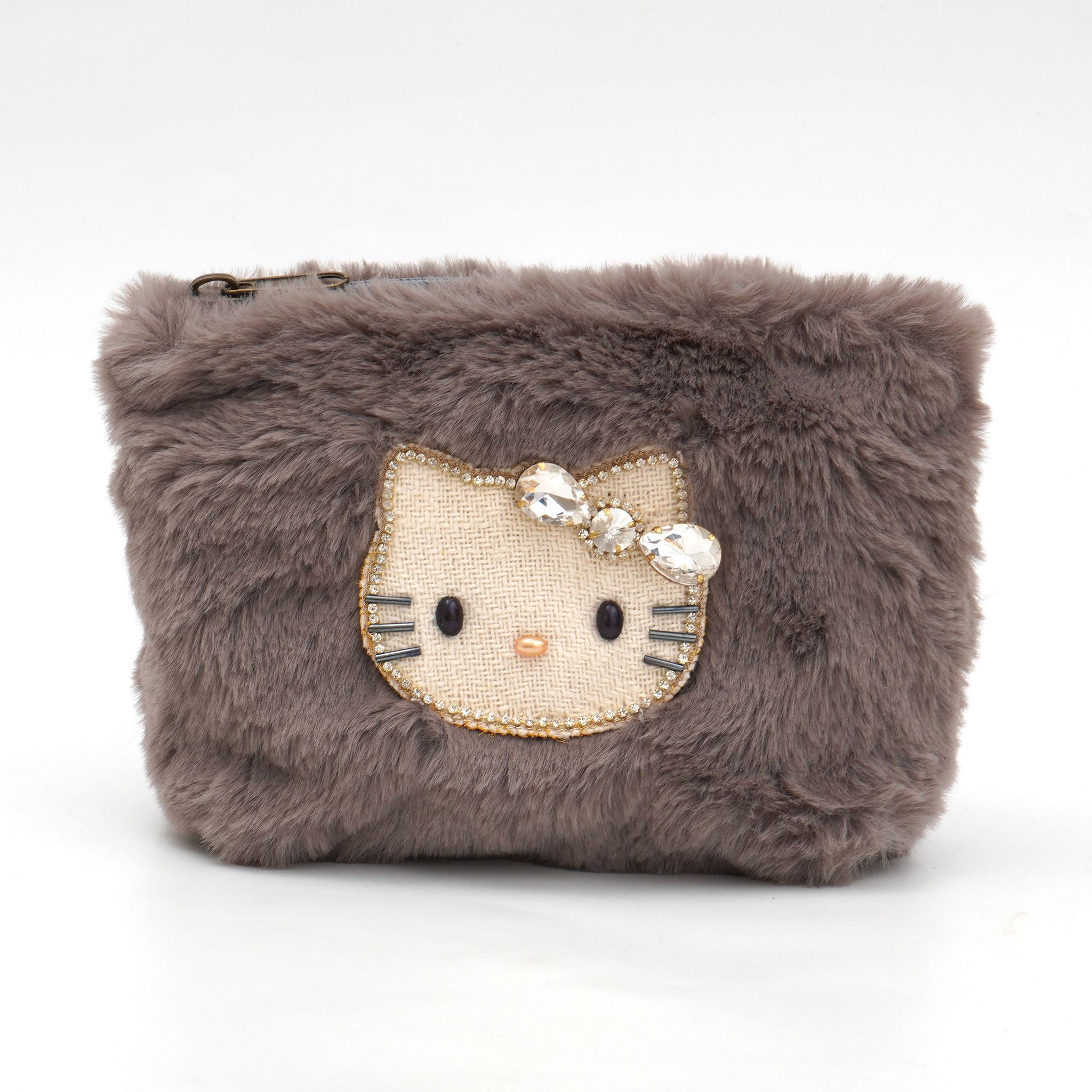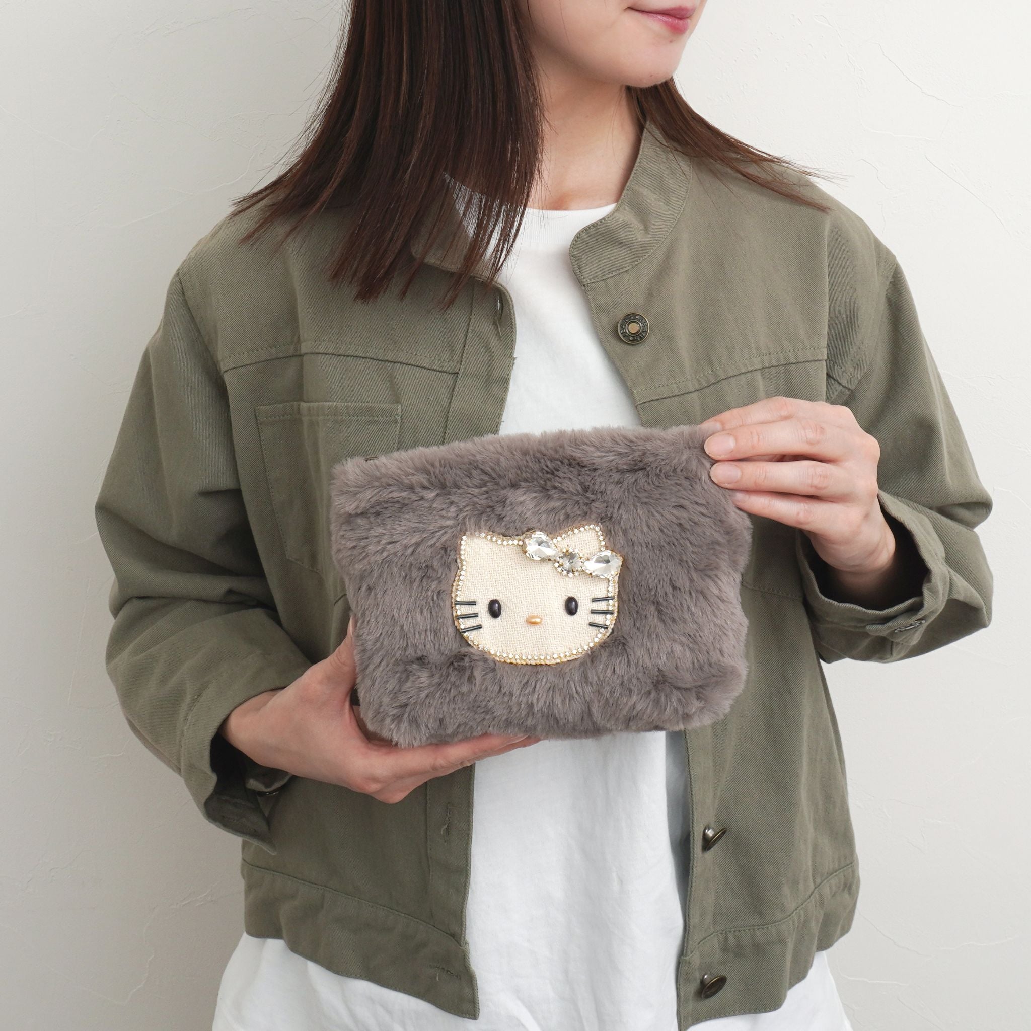 ふわふわのファー素材に、きらめくキティのビジューモチーフをあしらったポーチ。思わず触れたくなるようなやわらかな手ざわりで、持つだけで季節感と癒しをプラスします。コスメや小物をすっきり収納できるサイズ感で、バッグの中も華やかに。優しいカラーリングが秋冬コーデにもぴったりな、見た目も気分もあたたかくなるポーチです。