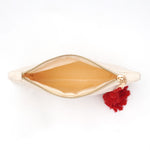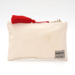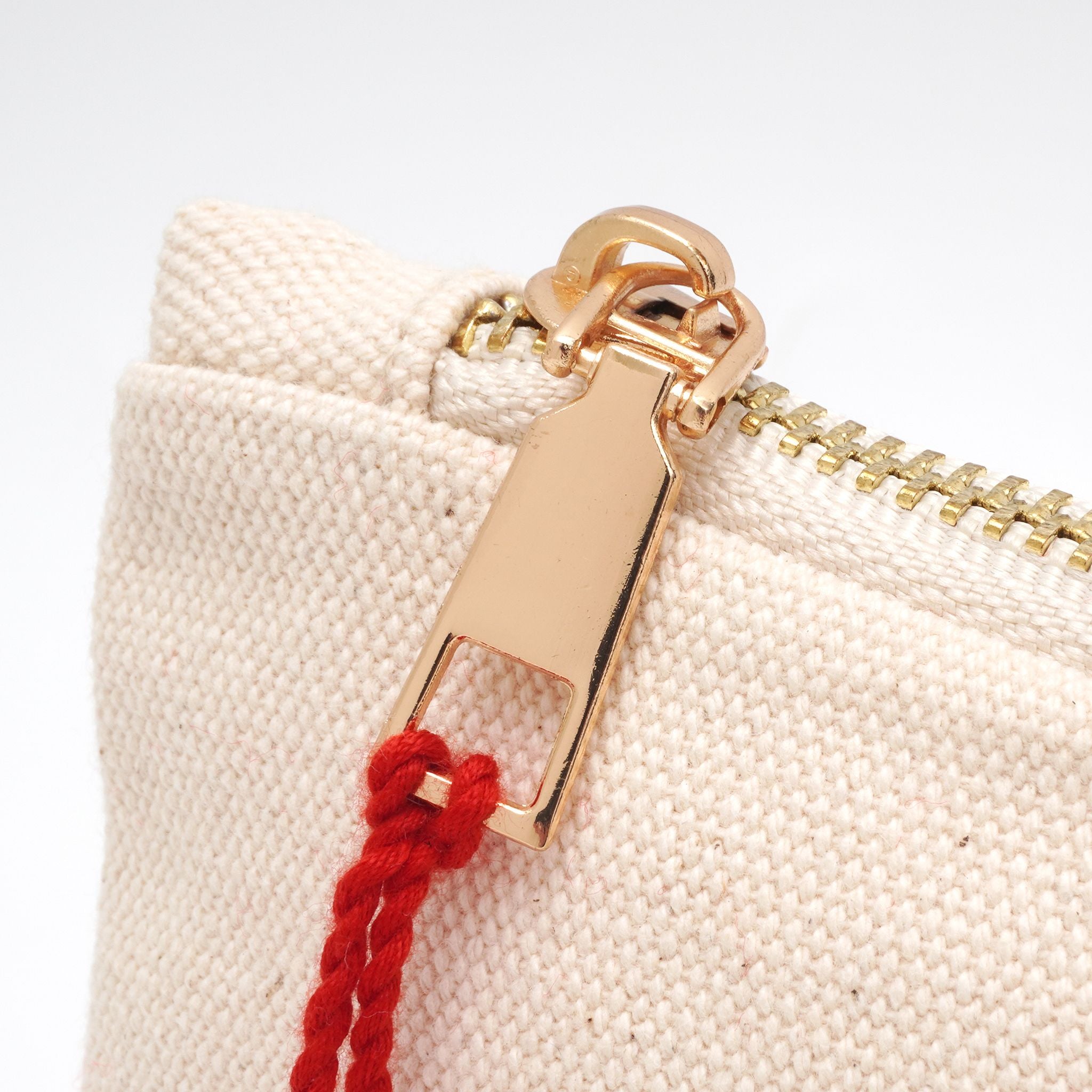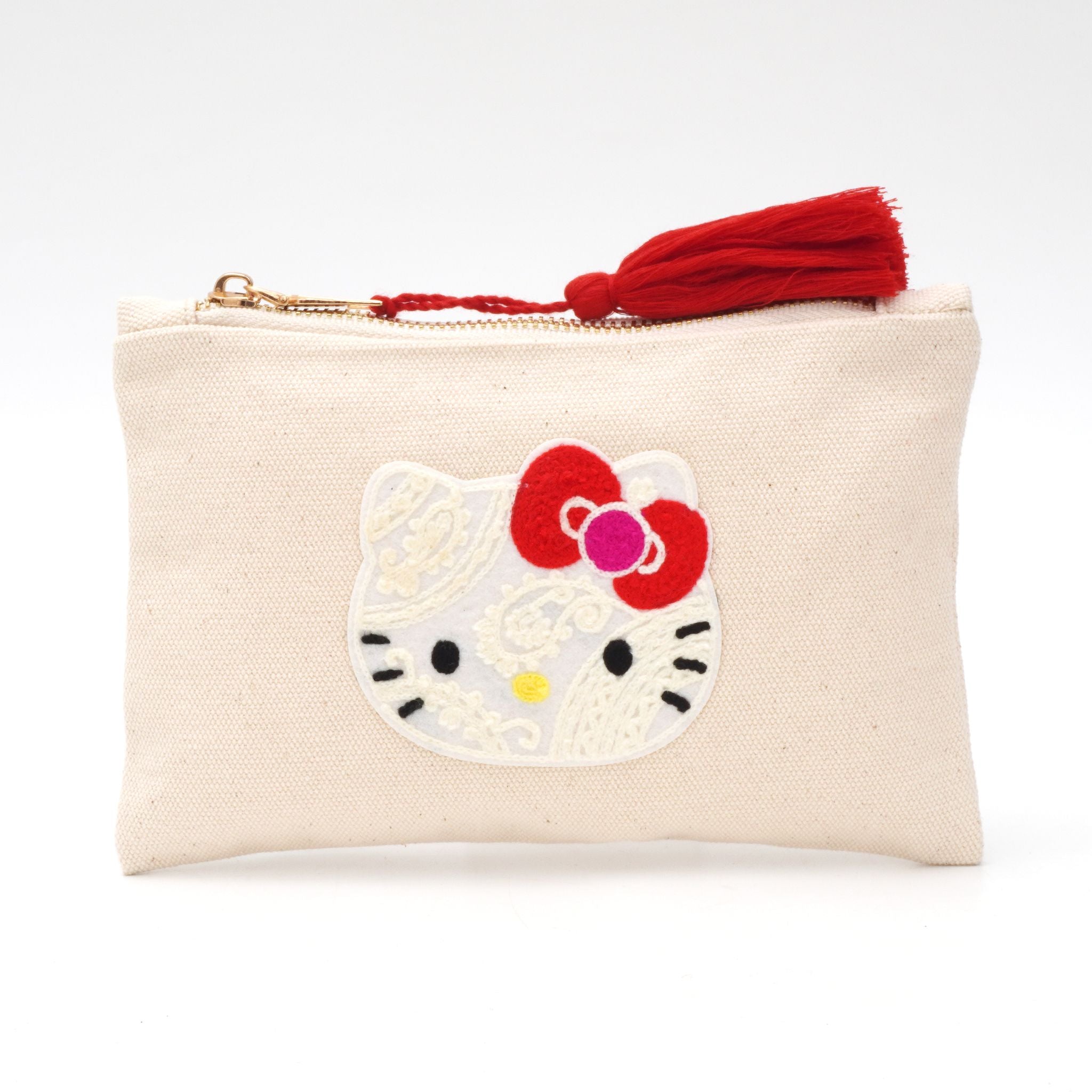やわらかな生成りキャンバス地に、レース模様のキティフェイスをアップリケしたフラットポーチ。鮮やかな赤いタッセルがアクセントになり、ナチュラルな中にも華やかさをプラスします。薄型でバッグの中でもかさばらず、カードやリップ、鍵など小物の収納にぴったり。シンプルながらも温もりを感じるデザインで、デイリーにもギフトにもおすすめのポーチです。