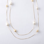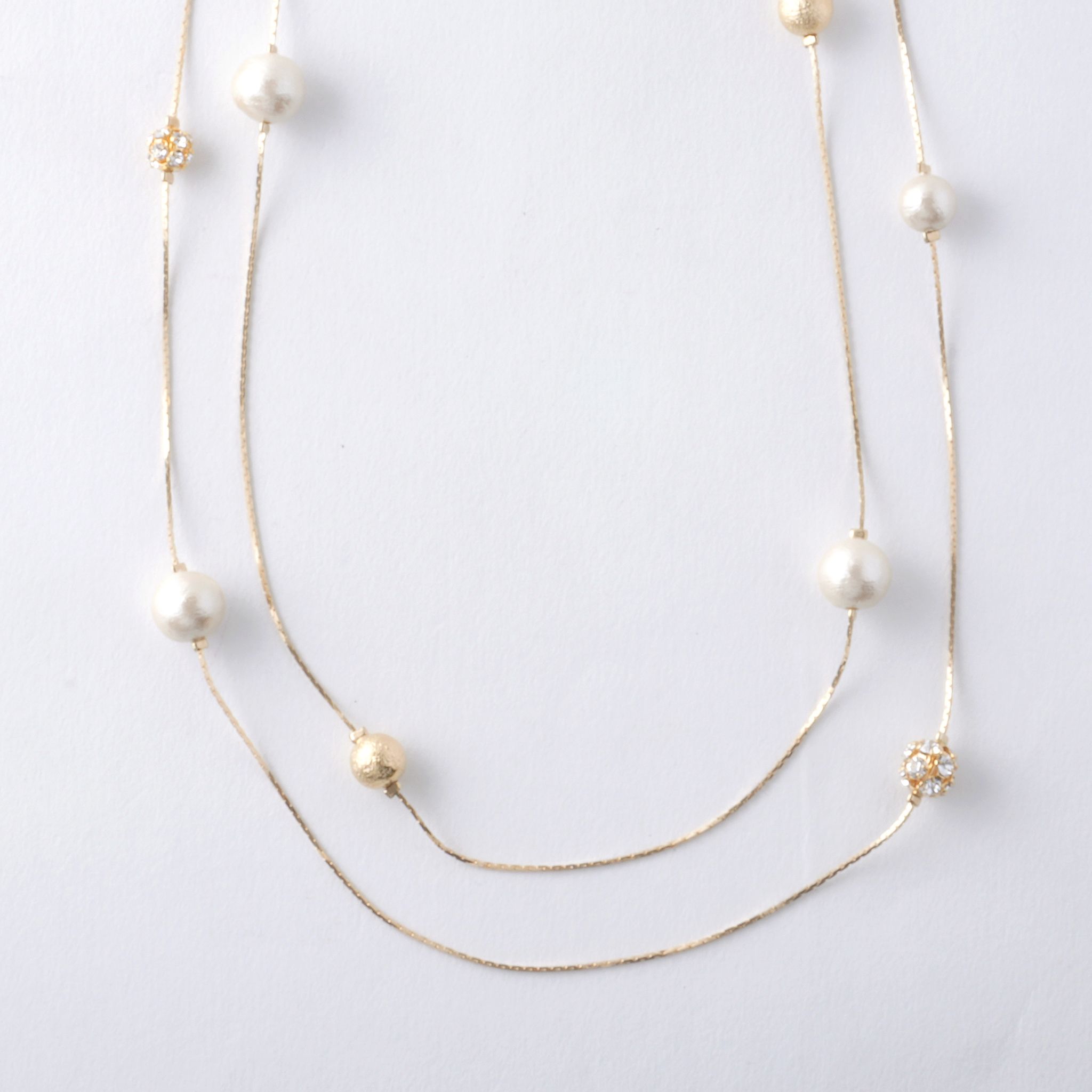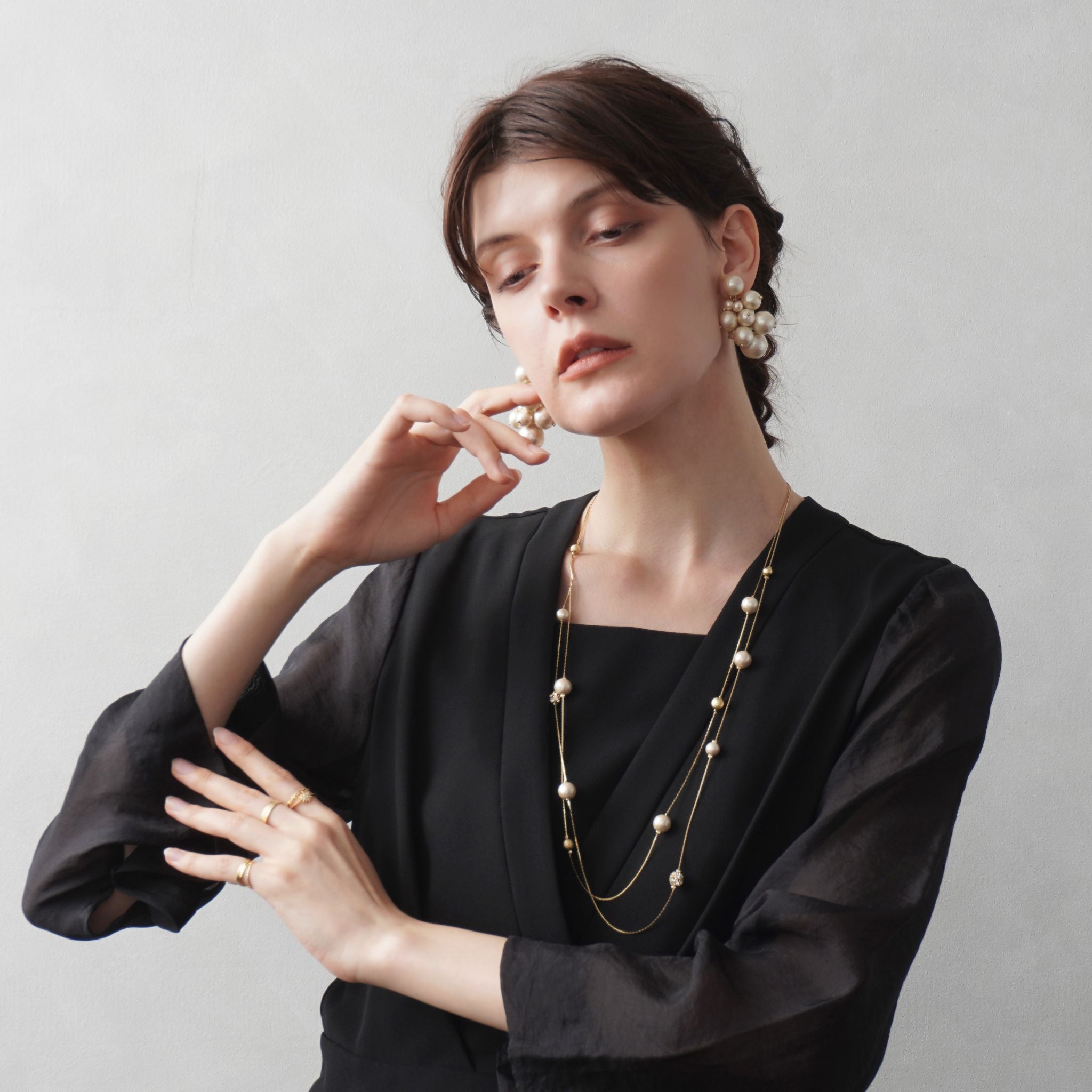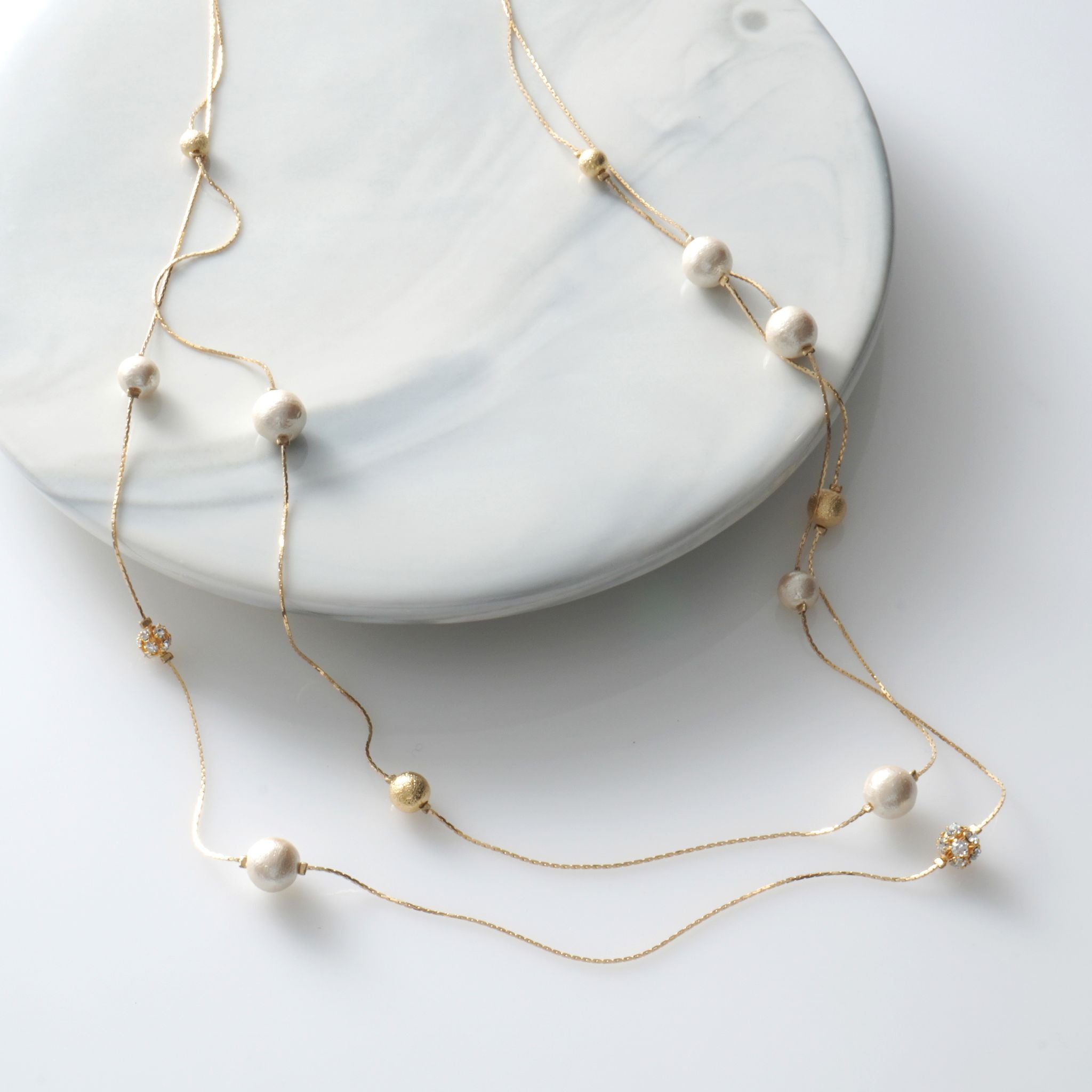 繊細なチェーンに異なる大きさのコットンパールとビーズを贅沢にあしらった3連ロングネックレス。軽やかに揺れるパールが顔まわりを明るく見せ、女性らしさを引き立てます。シンプルな装いに加えるだけで、洗練された印象に。驚くほど軽く、肩こり知らずなのも嬉しいポイント。華やかさと実用性を兼ね備えた、大人のための優秀アクセサリーです。
