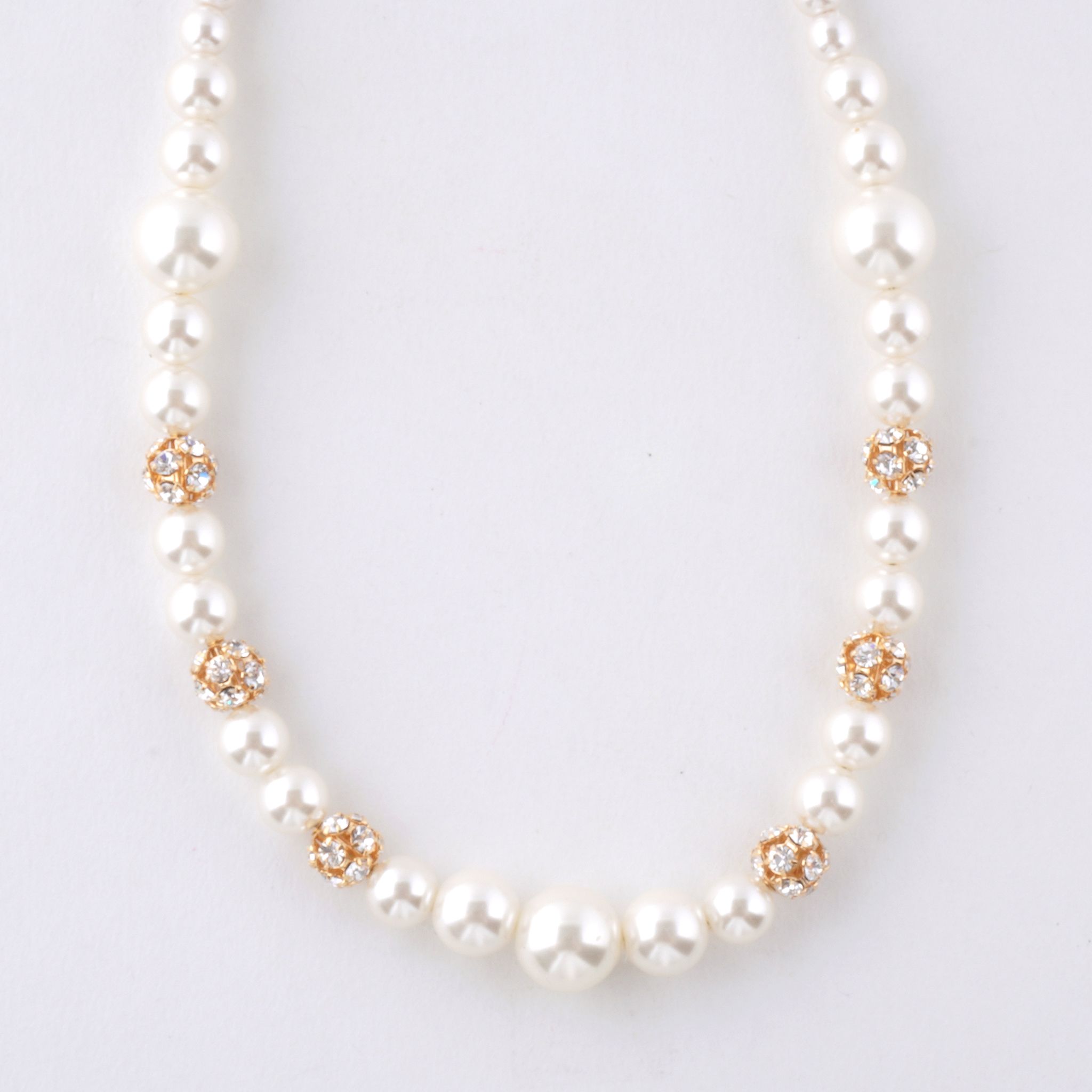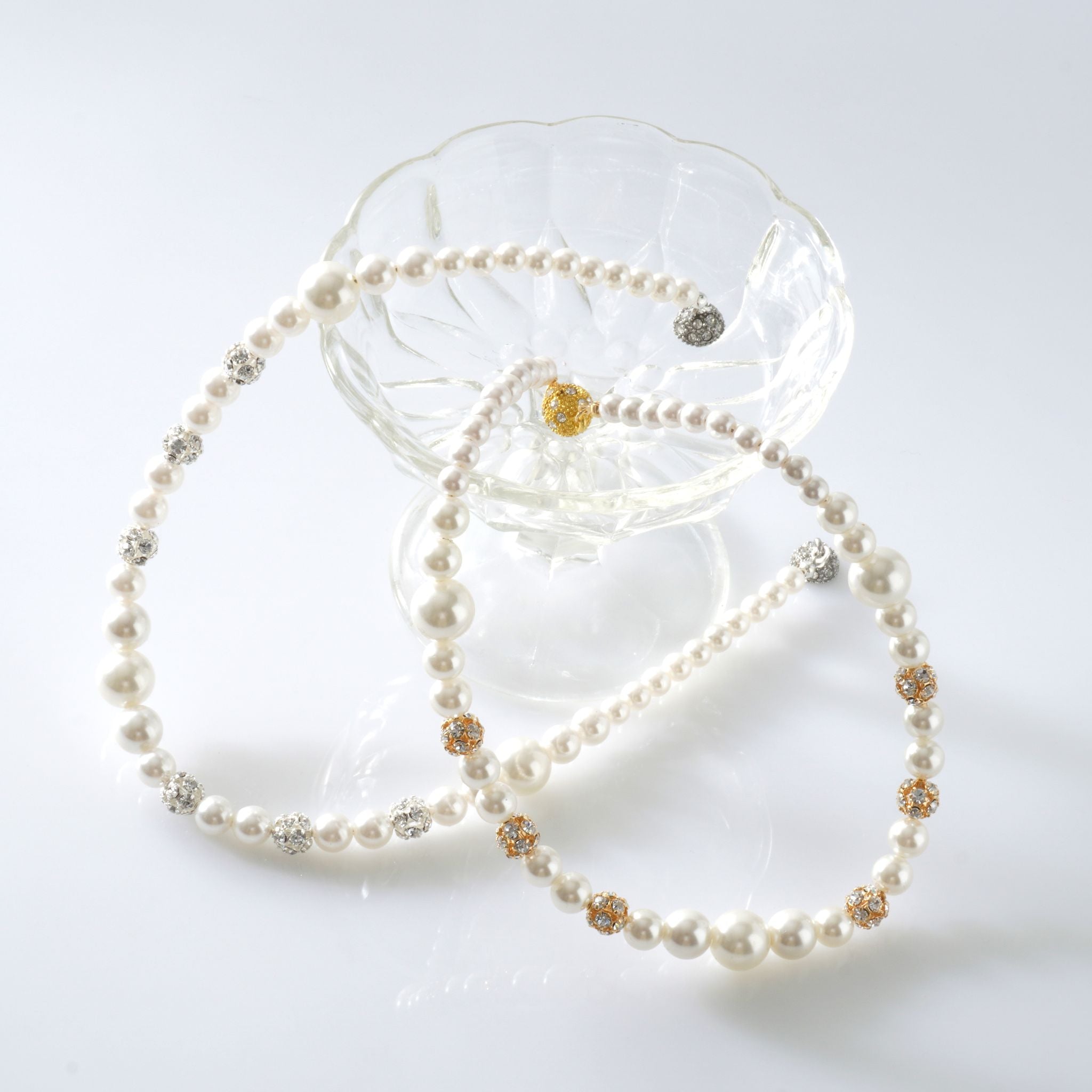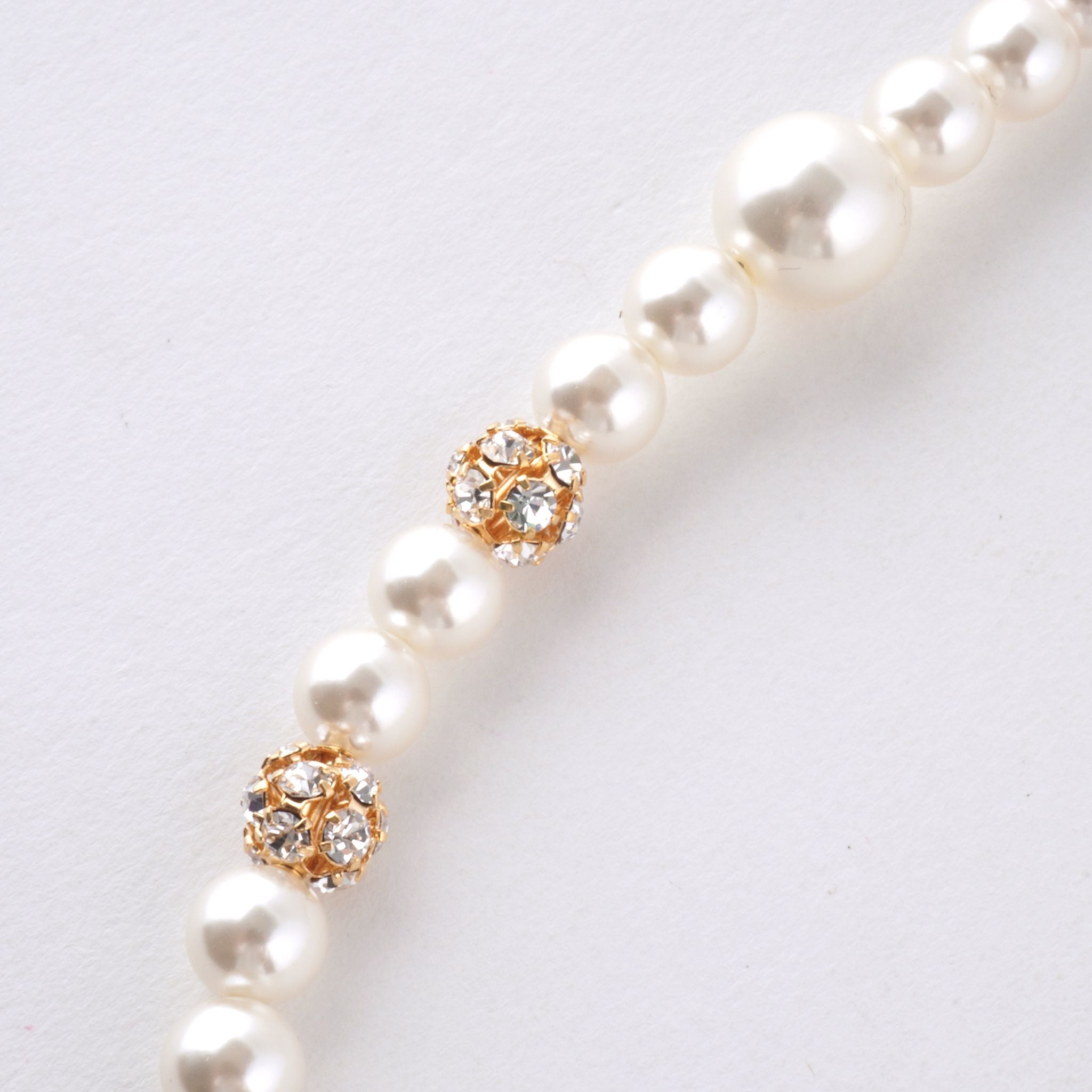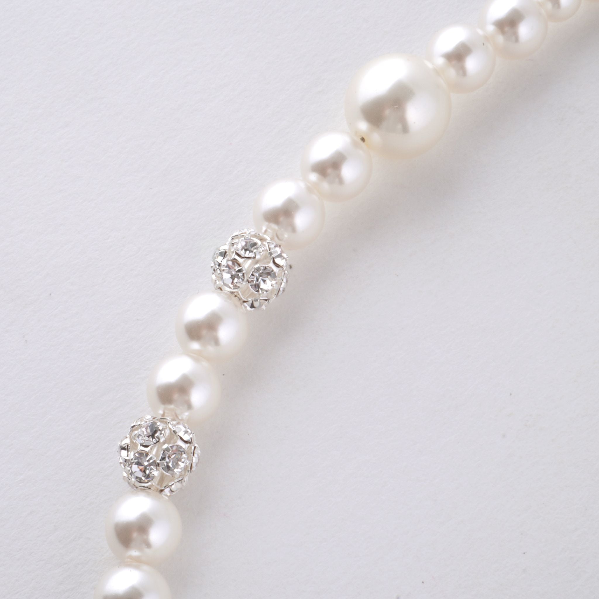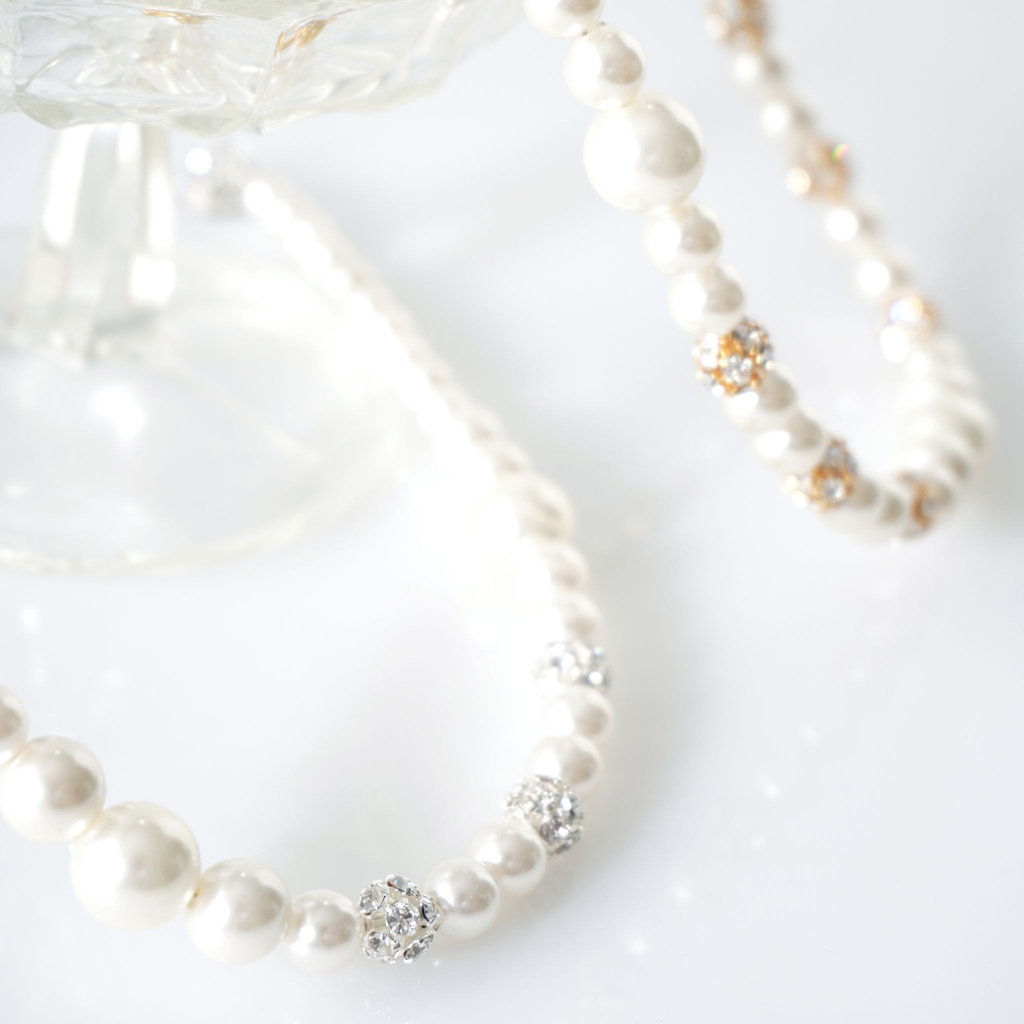 異なるサイズのパールを丁寧に連ね、間にあしらったクリスタルボールが柔らかな光を添えるエレガントなネックレス。シンプルな一連とはひと味違う、華やかさと品の良さを両立したデザインです。首もとにそっと寄り添う長さで、フォーマルドレスからシンプルなニットスタイルまで幅広く活躍。パールのやさしい艶とクリスタルの繊細なきらめきが、顔まわりを明るく見せてくれます。