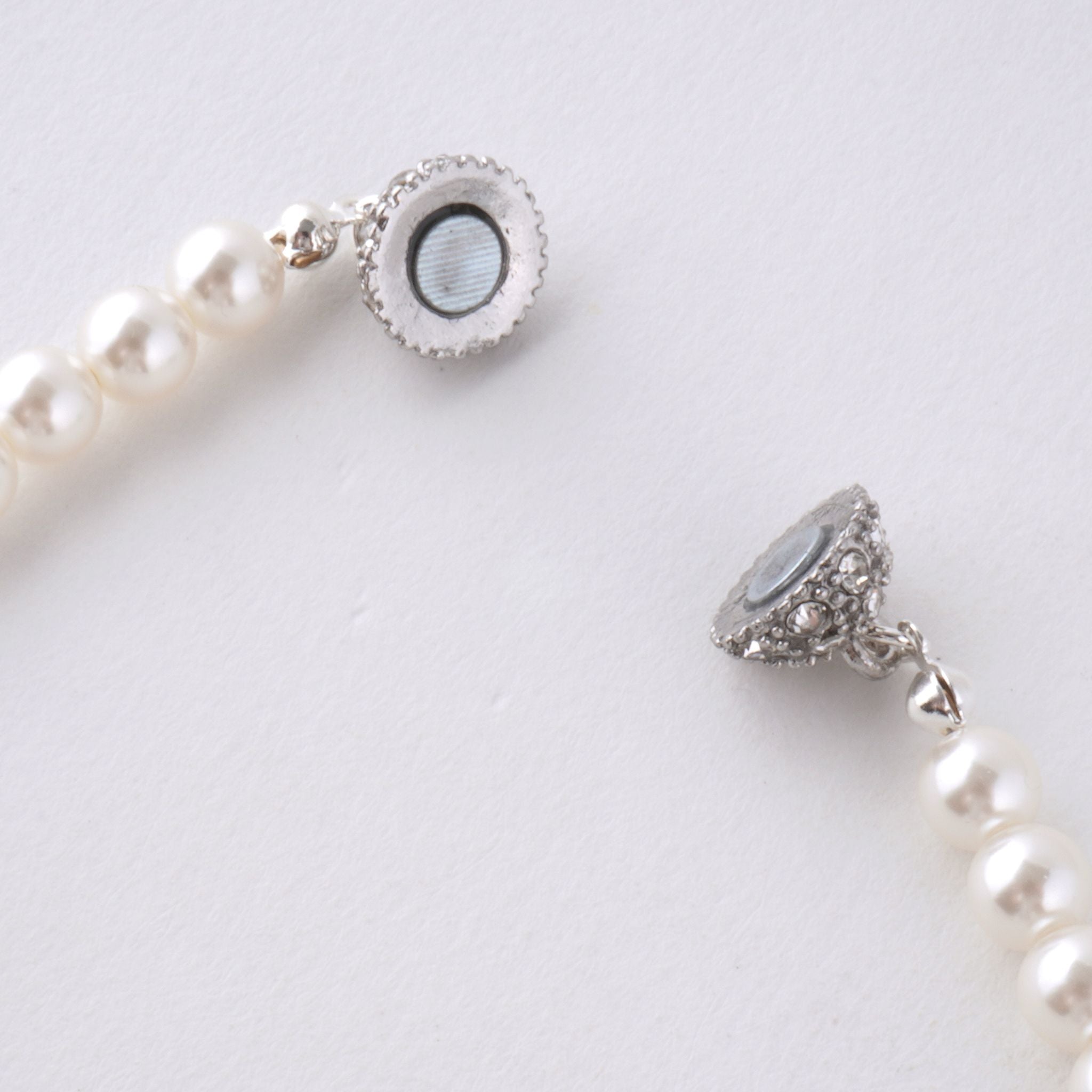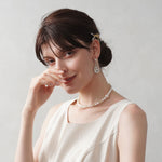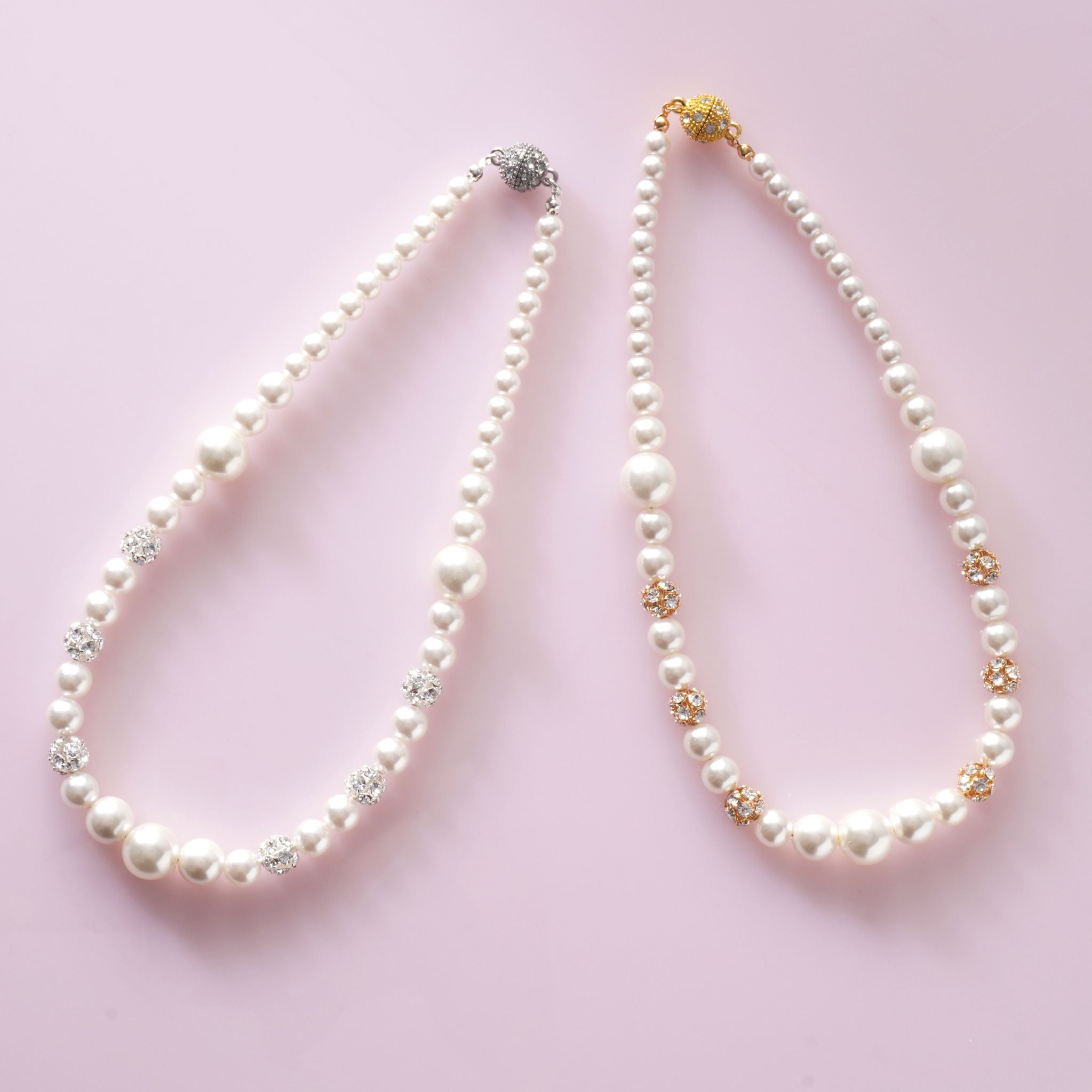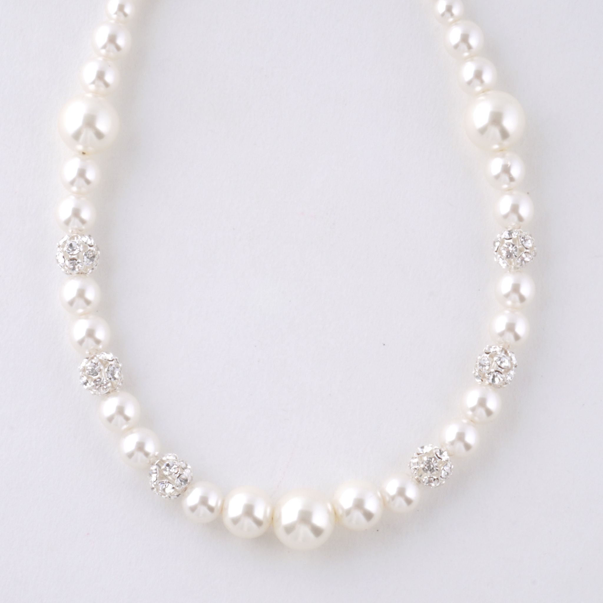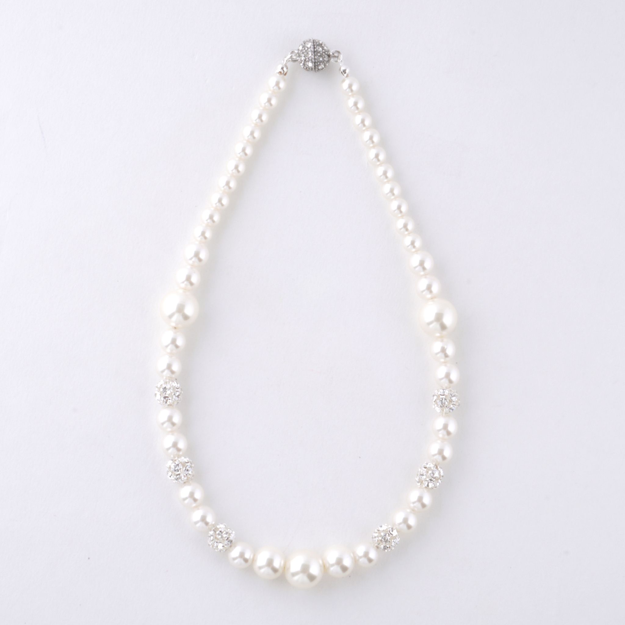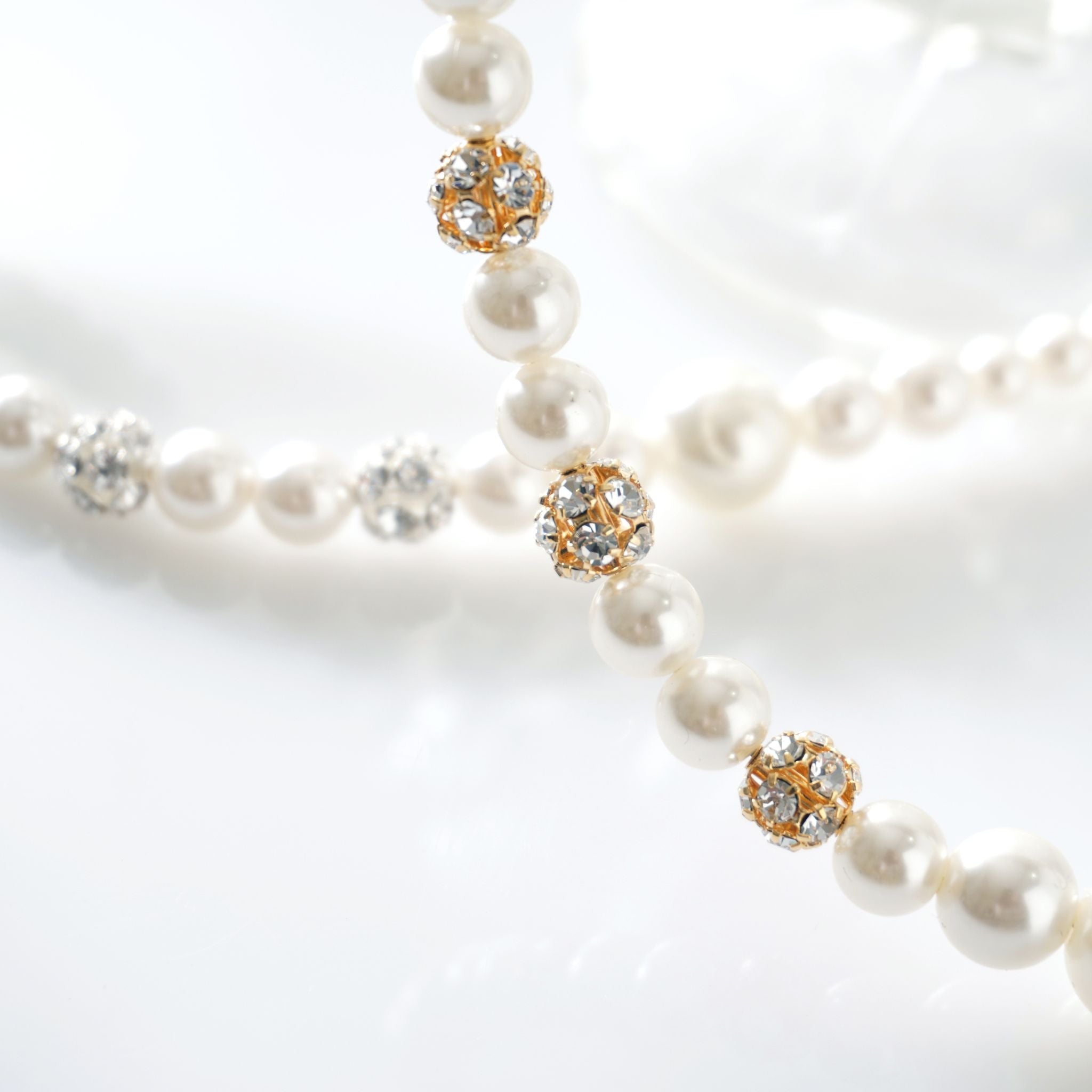 異なるサイズのパールを丁寧に連ね、間にあしらったクリスタルボールが柔らかな光を添えるエレガントなネックレス。シンプルな一連とはひと味違う、華やかさと品の良さを両立したデザインです。首もとにそっと寄り添う長さで、フォーマルドレスからシンプルなニットスタイルまで幅広く活躍。パールのやさしい艶とクリスタルの繊細なきらめきが、顔まわりを明るく見せてくれます。
