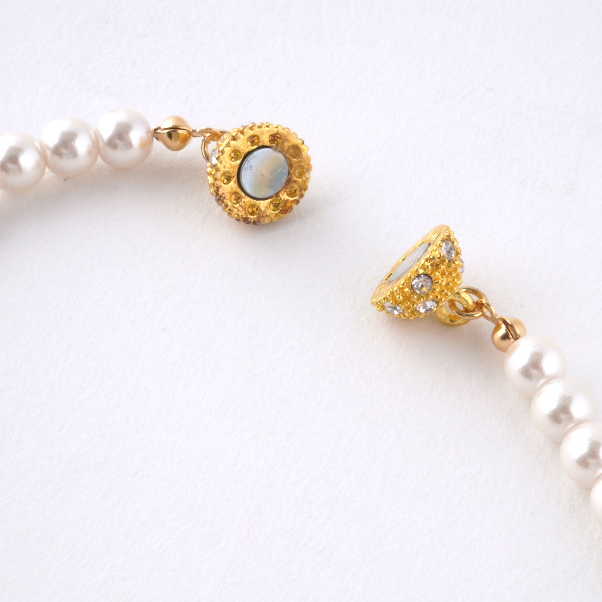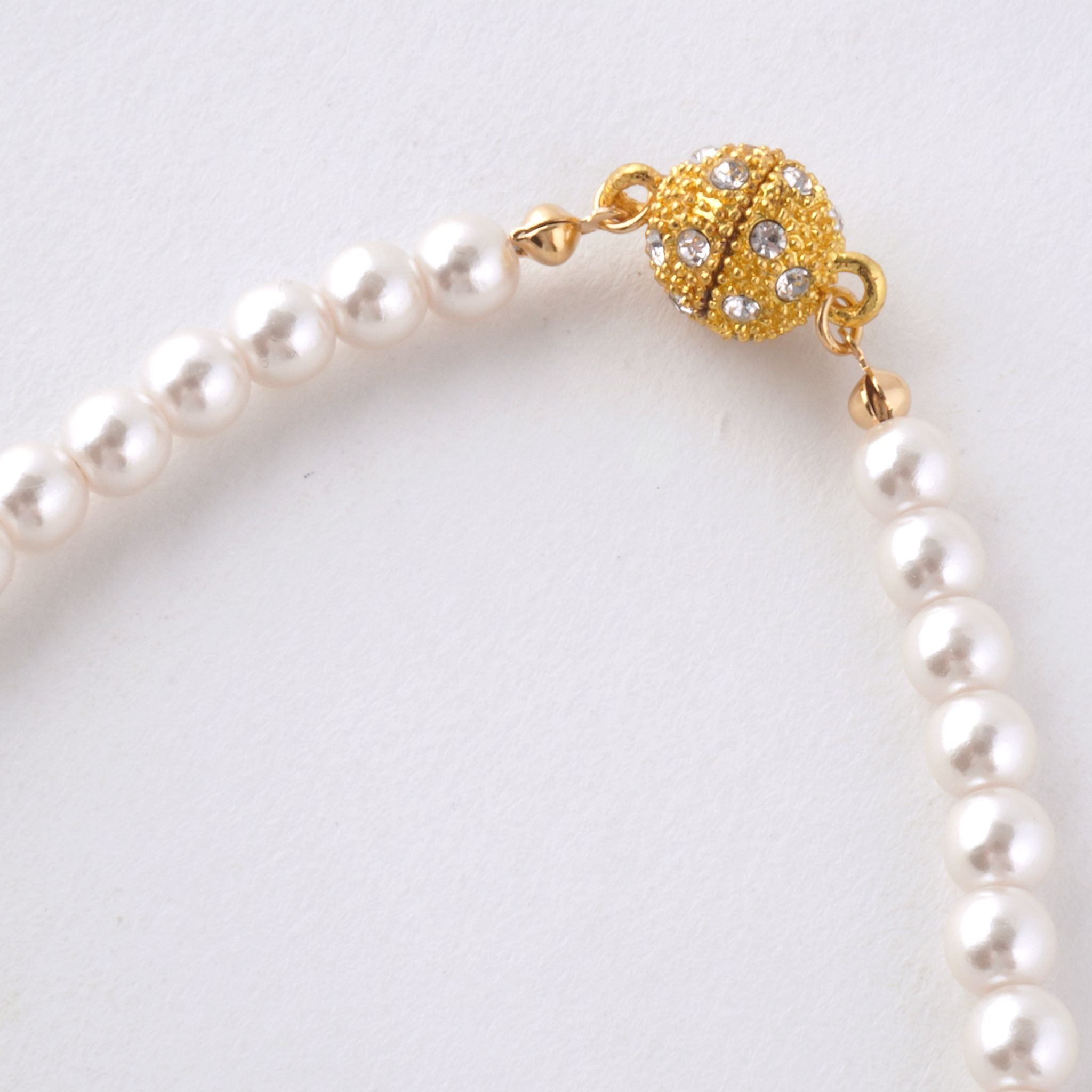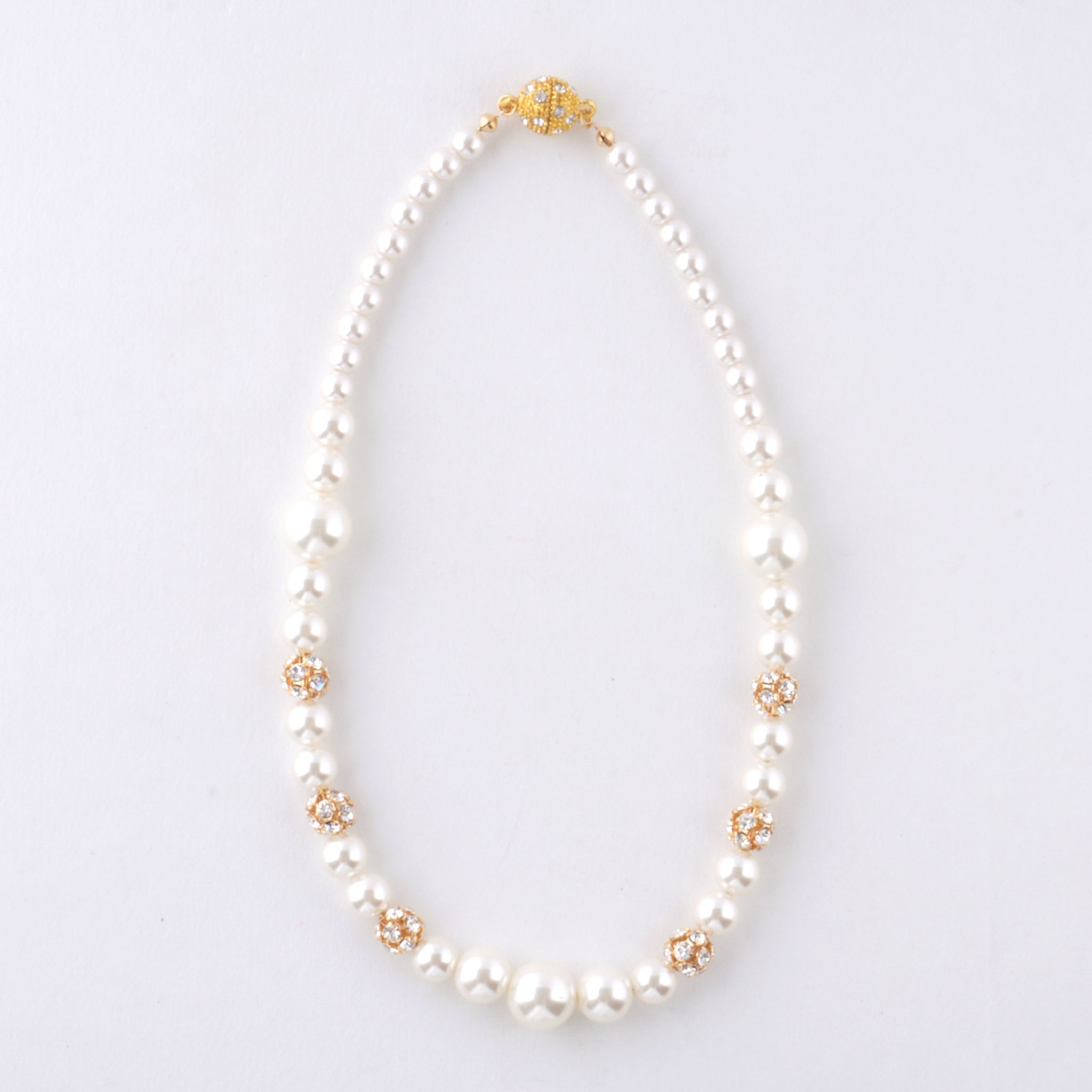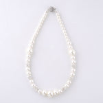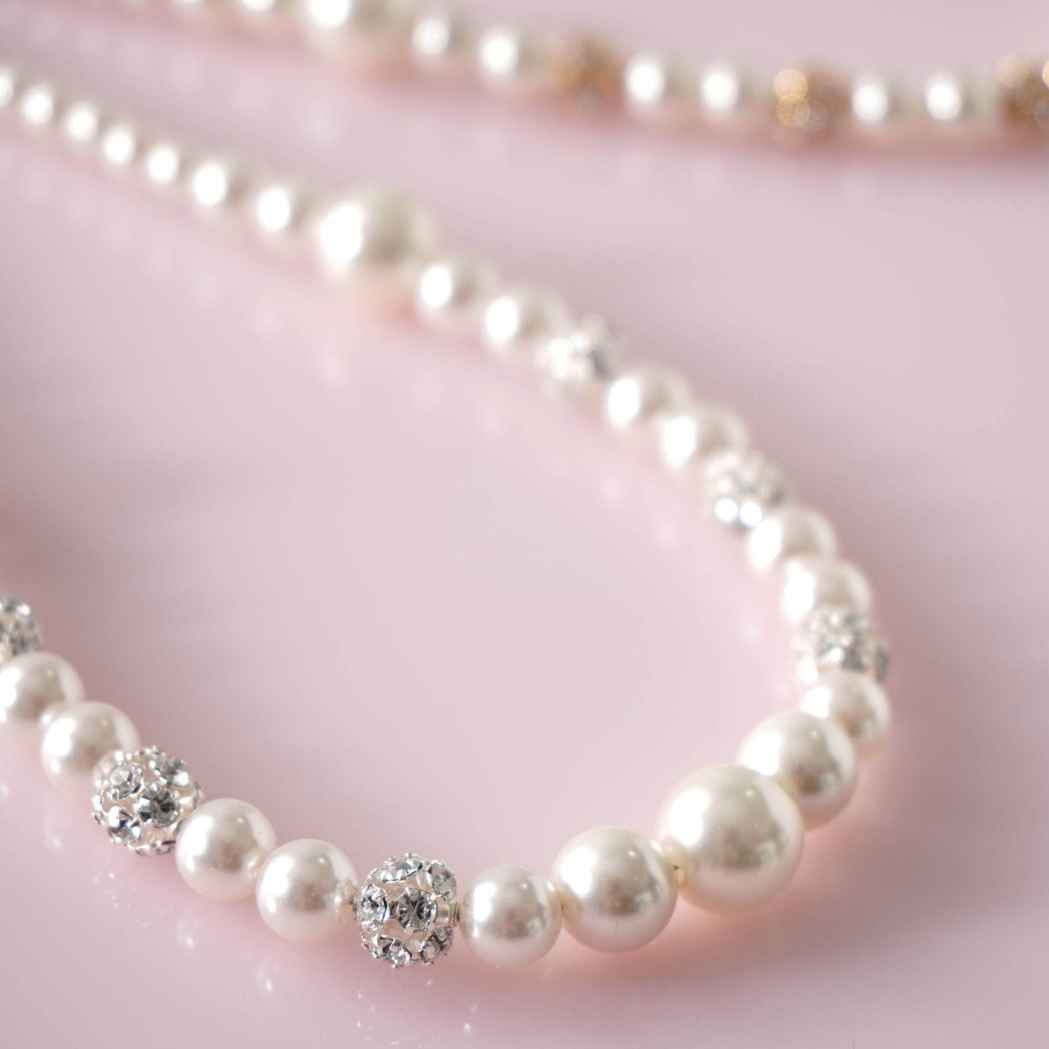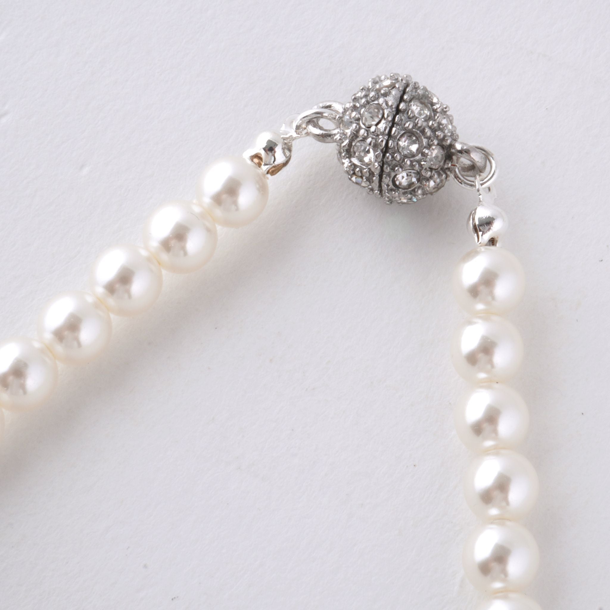 異なるサイズのパールを丁寧に連ね、間にあしらったクリスタルボールが柔らかな光を添えるエレガントなネックレス。シンプルな一連とはひと味違う、華やかさと品の良さを両立したデザインです。首もとにそっと寄り添う長さで、フォーマルドレスからシンプルなニットスタイルまで幅広く活躍。パールのやさしい艶とクリスタルの繊細なきらめきが、顔まわりを明るく見せてくれます。