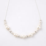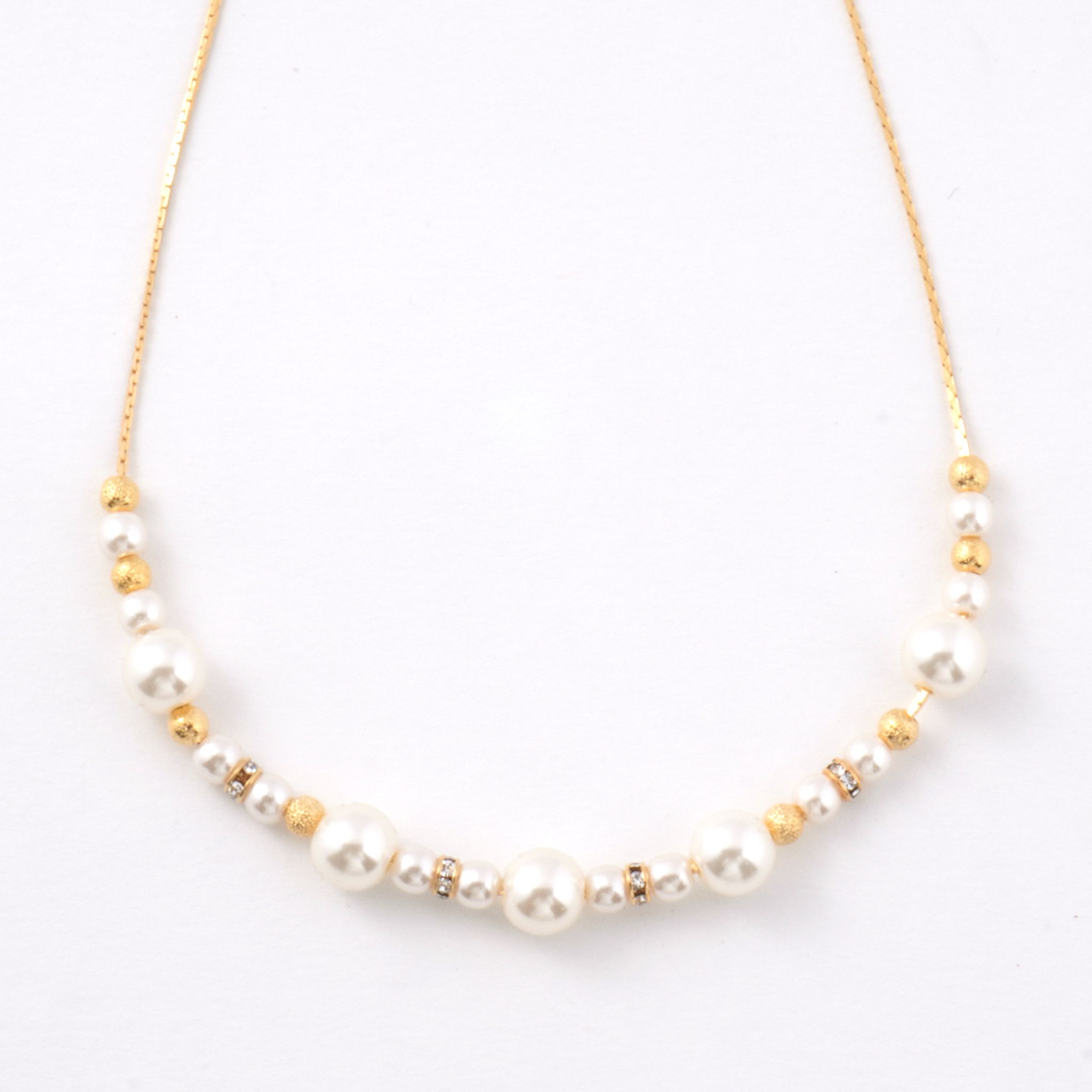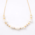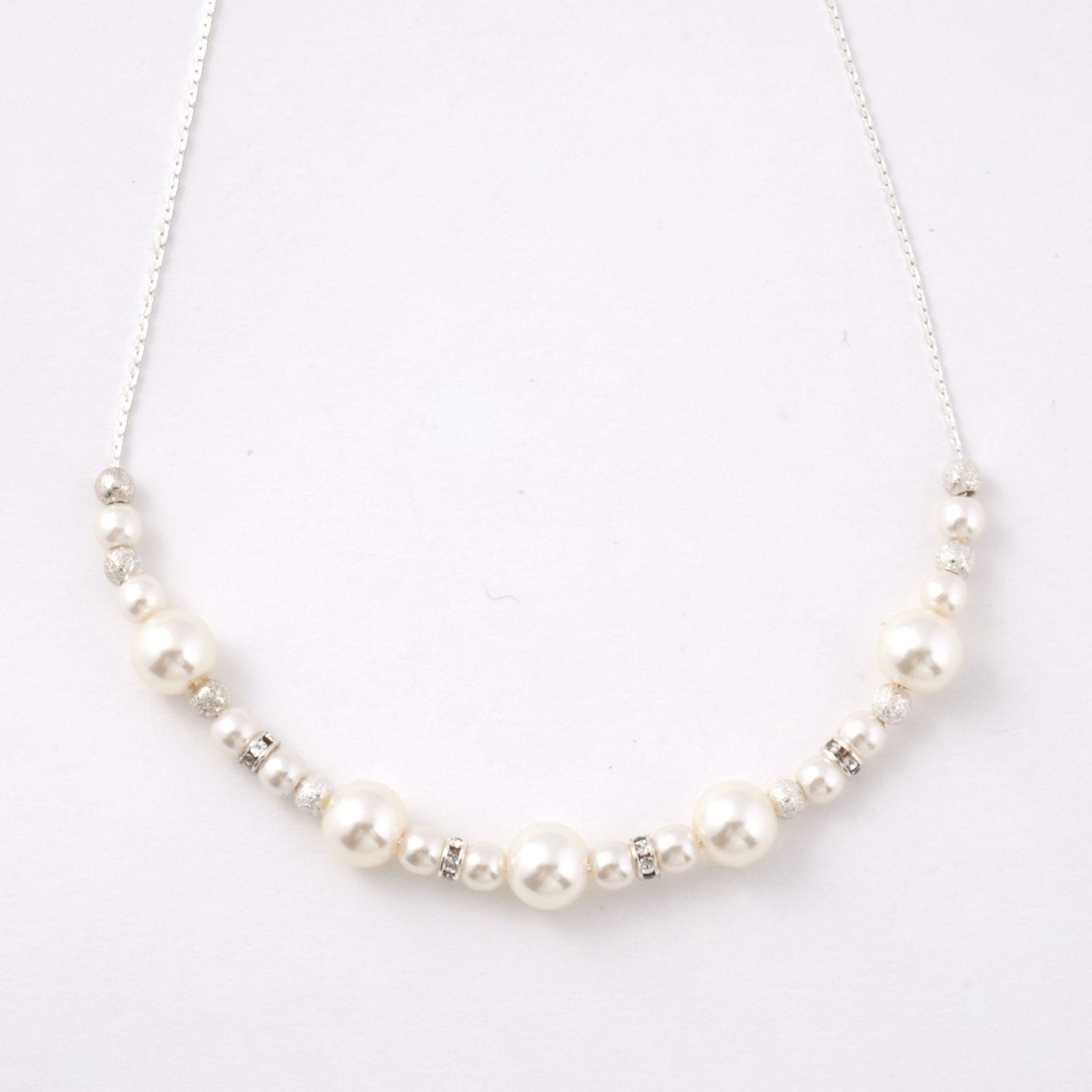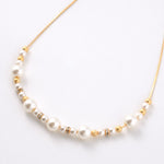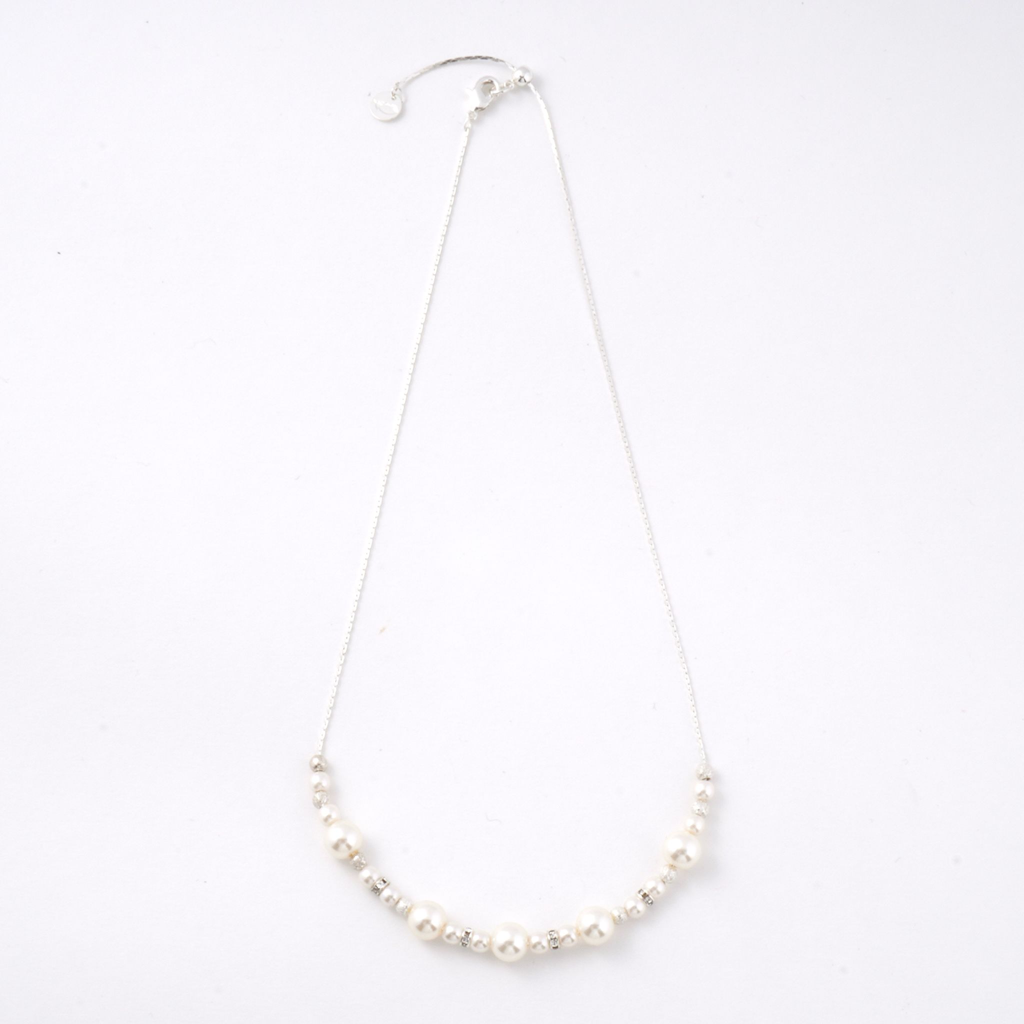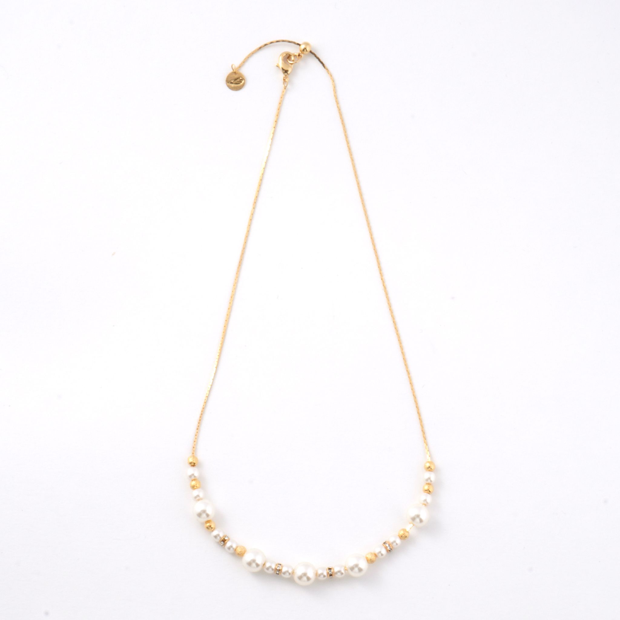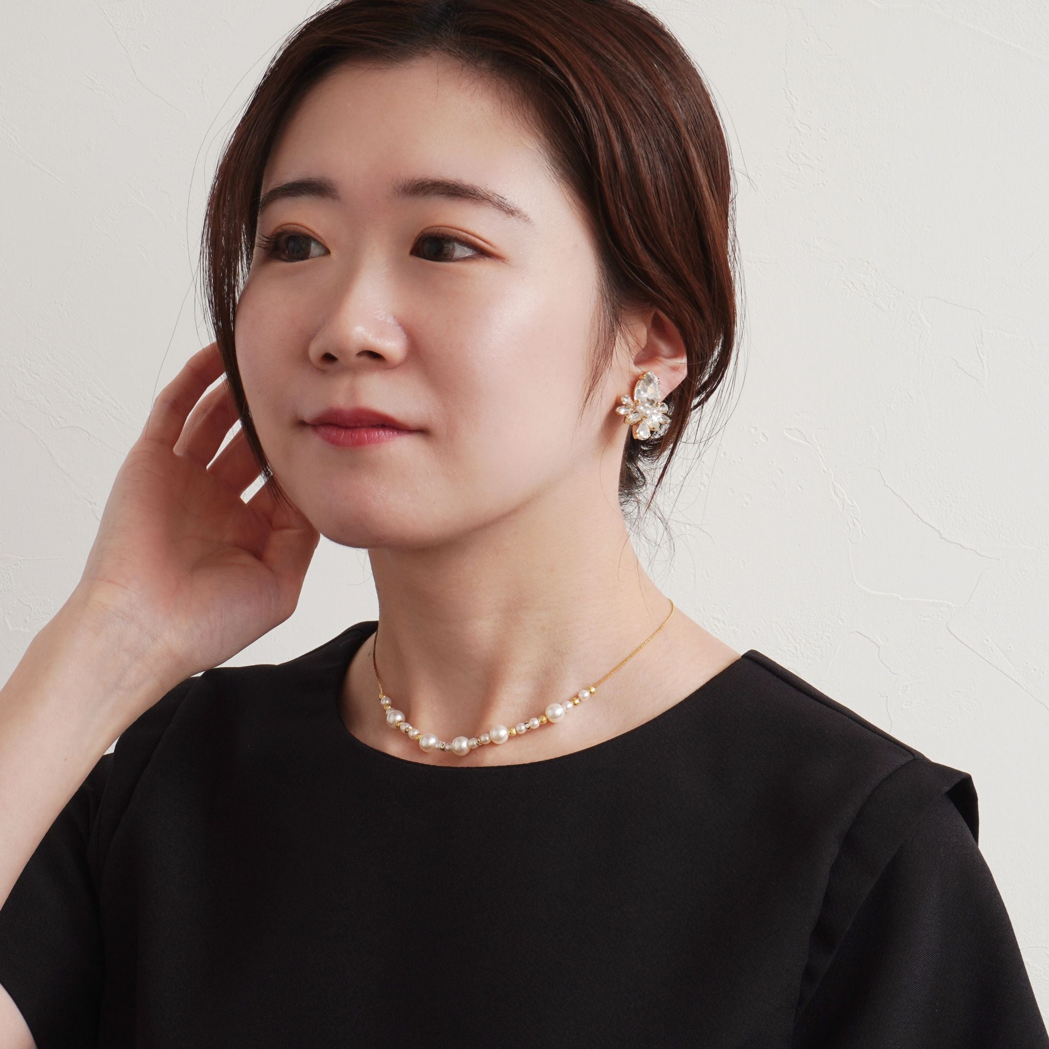 パールと小さなビジューのパーツを中央のみに配置することで、胸元に程よい輝きを添えながらも、すっきりと洗練された印象を演出します。主張しすぎないデザインは、デコルテ周りを上品に抑えたい方や、アクセサリーをさりげなく楽しみたい方にぴったり。顔周りにほどよい華やぎを添えながら、首元をすっきりと見せてくれます。