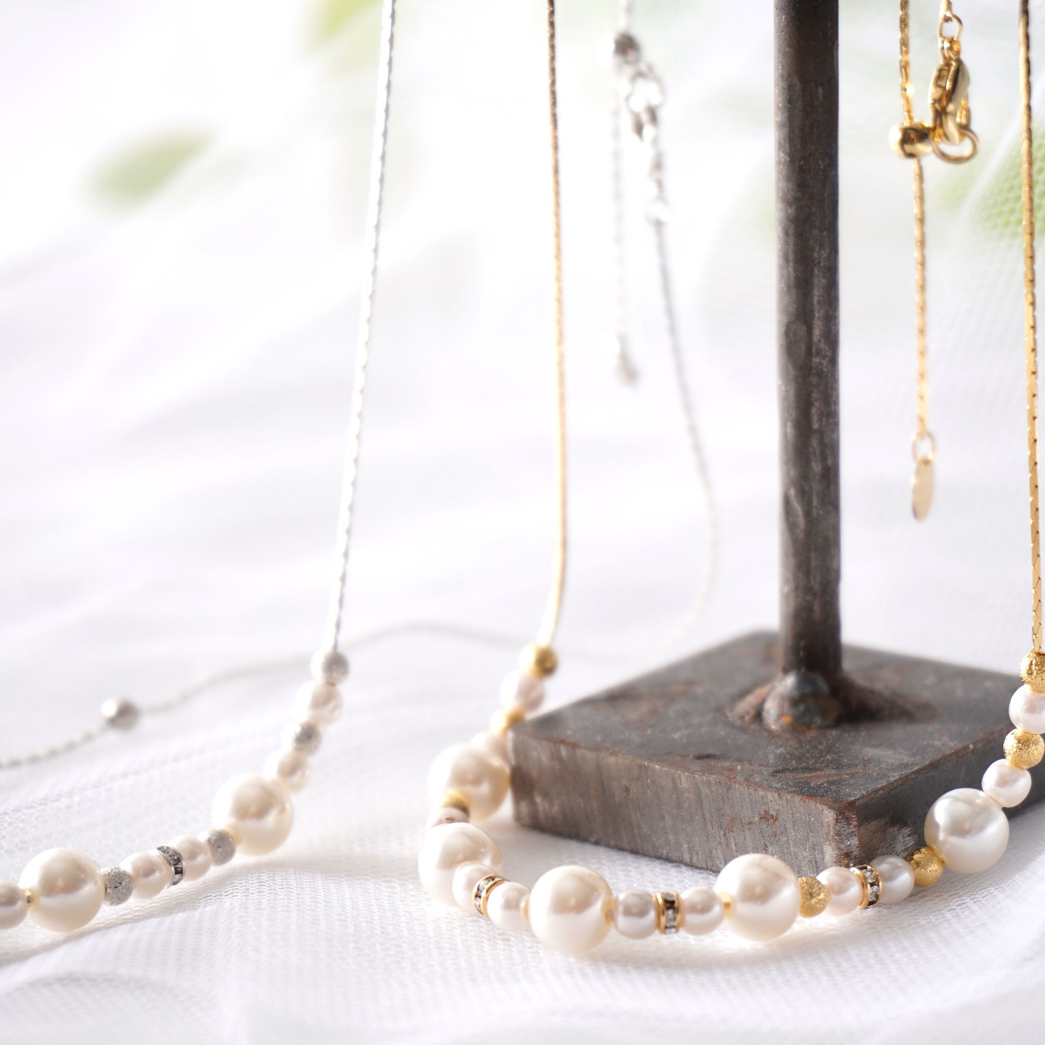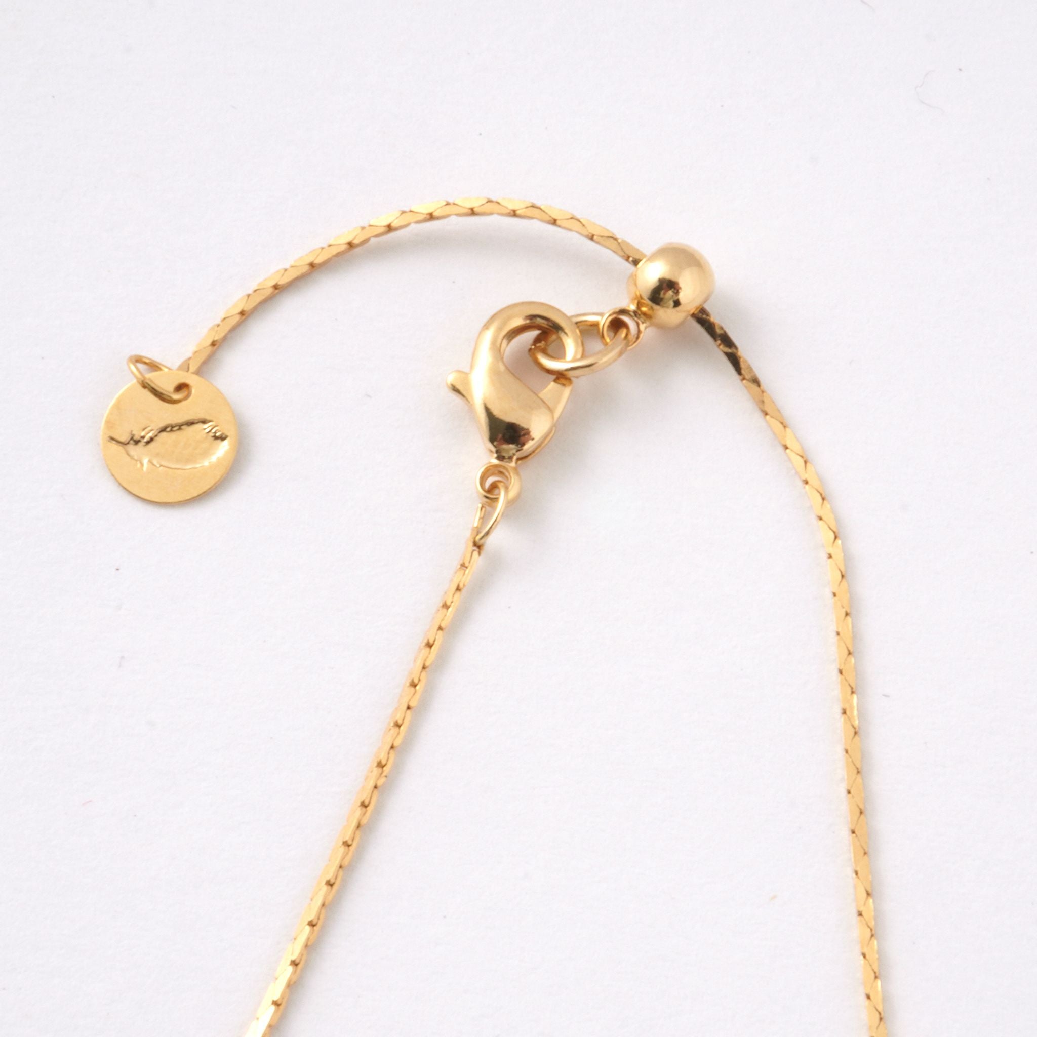 チェーンはスライドスルー仕様で、チョーカー風からやや長めまで自由に長さ調整が可能。ネックラインやその日のコーディネートに合わせて、美しいバランスでお使いいただけます。フォーマルな装いにはもちろん、シンプルなニットやブラウスにも自然に馴染む、日常使いしやすい一本です。