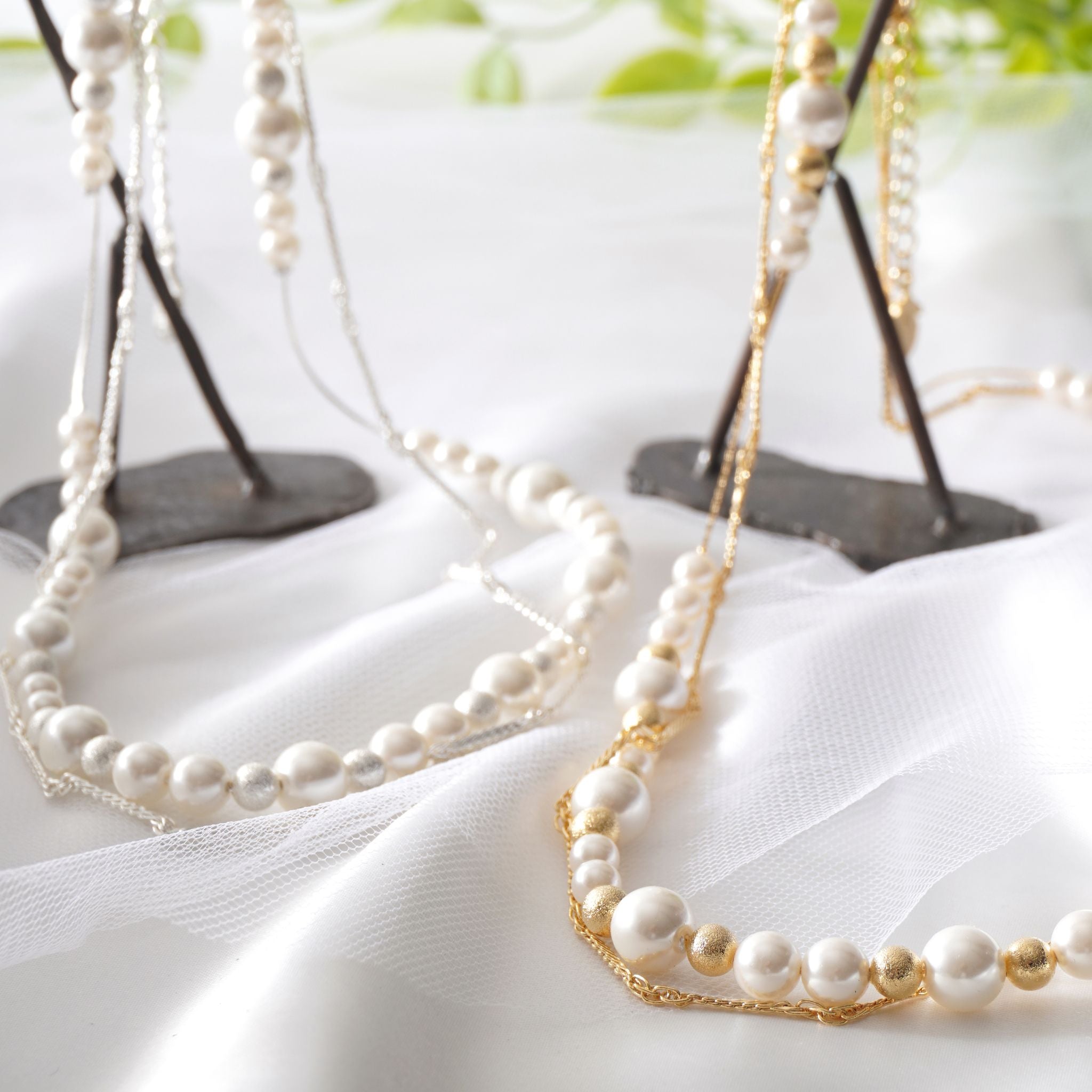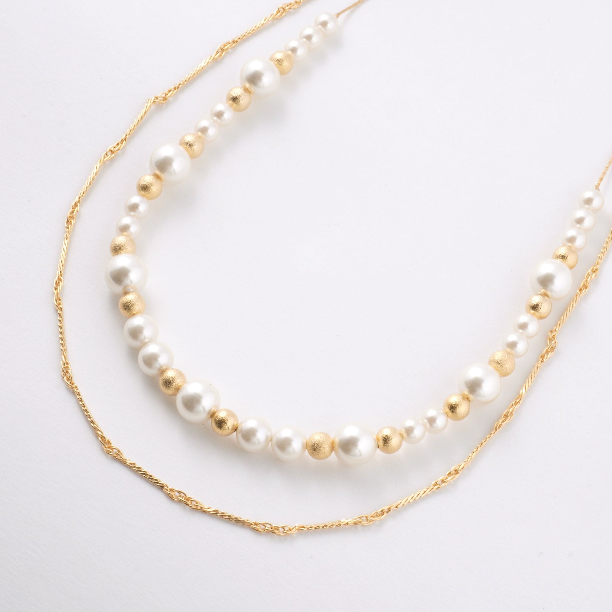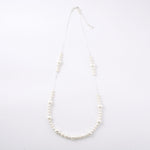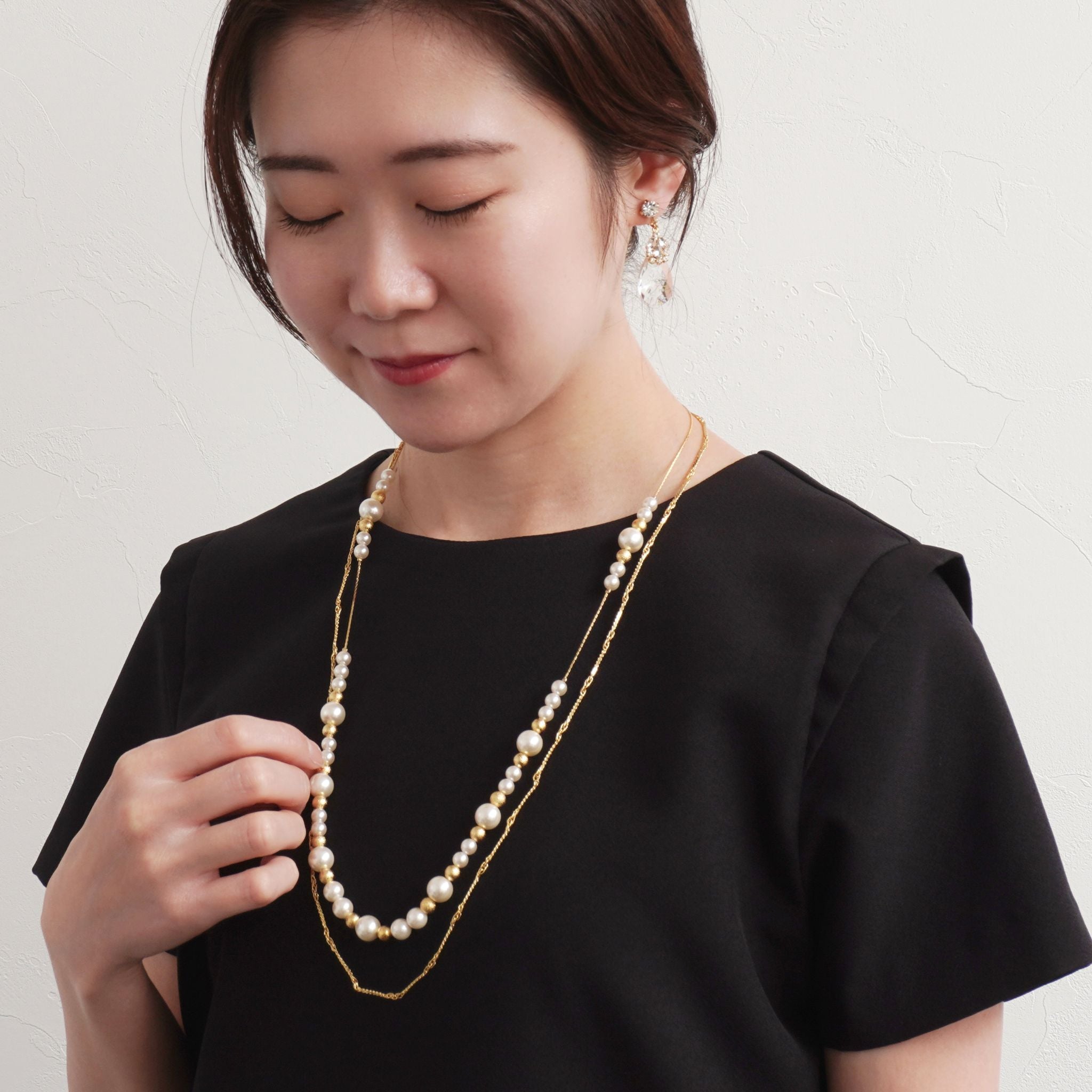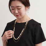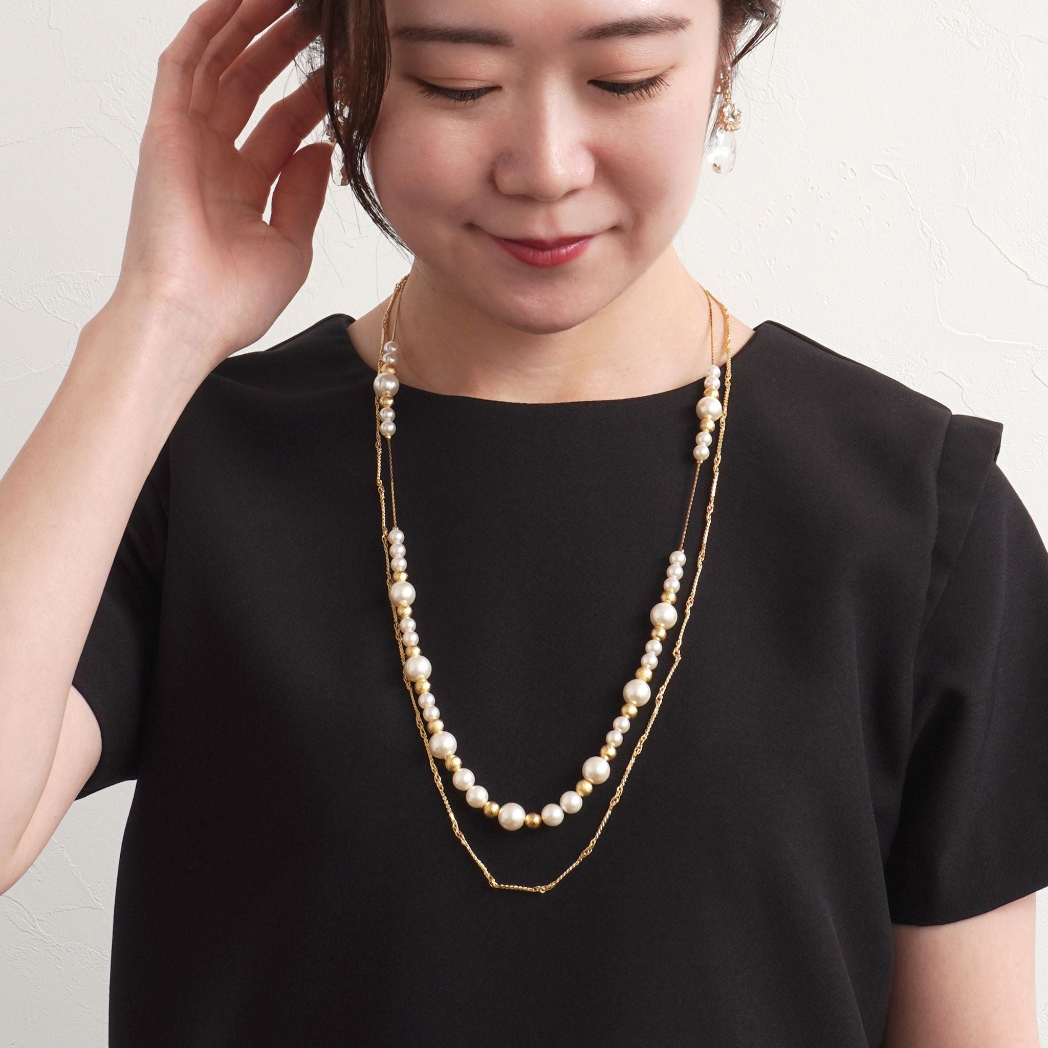 デコルテから胸元にかけて、優雅なラインを描くロングパールネックレス。大小のパールをリズミカルに並べたデザインに、繊細なチェーンを組み合わせることで、軽やかさと上品な華やぎを両立しました。長めのシルエットが縦のラインを美しく強調し、装いをすっきりと見せながら、コーディネートに洗練された印象を添えます。