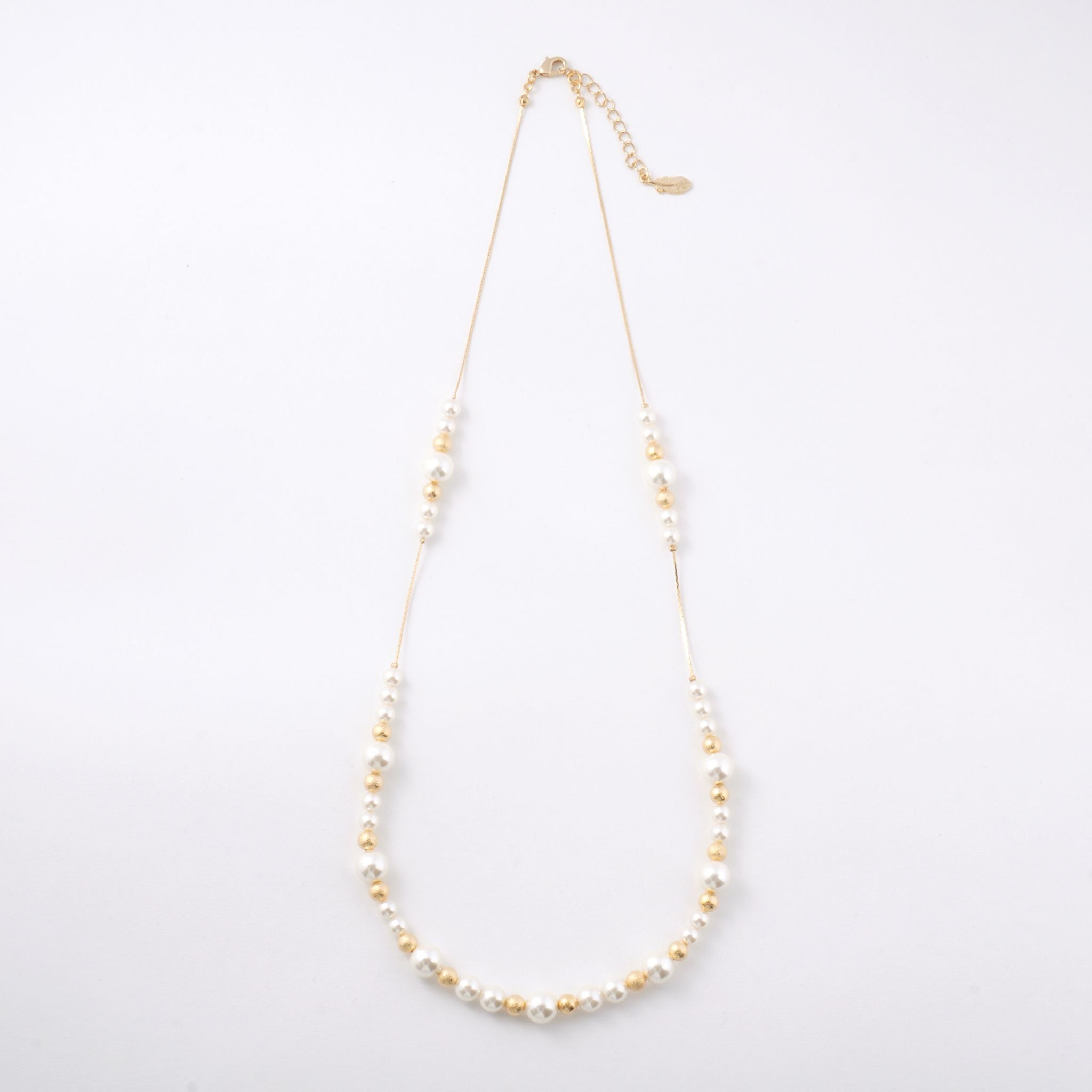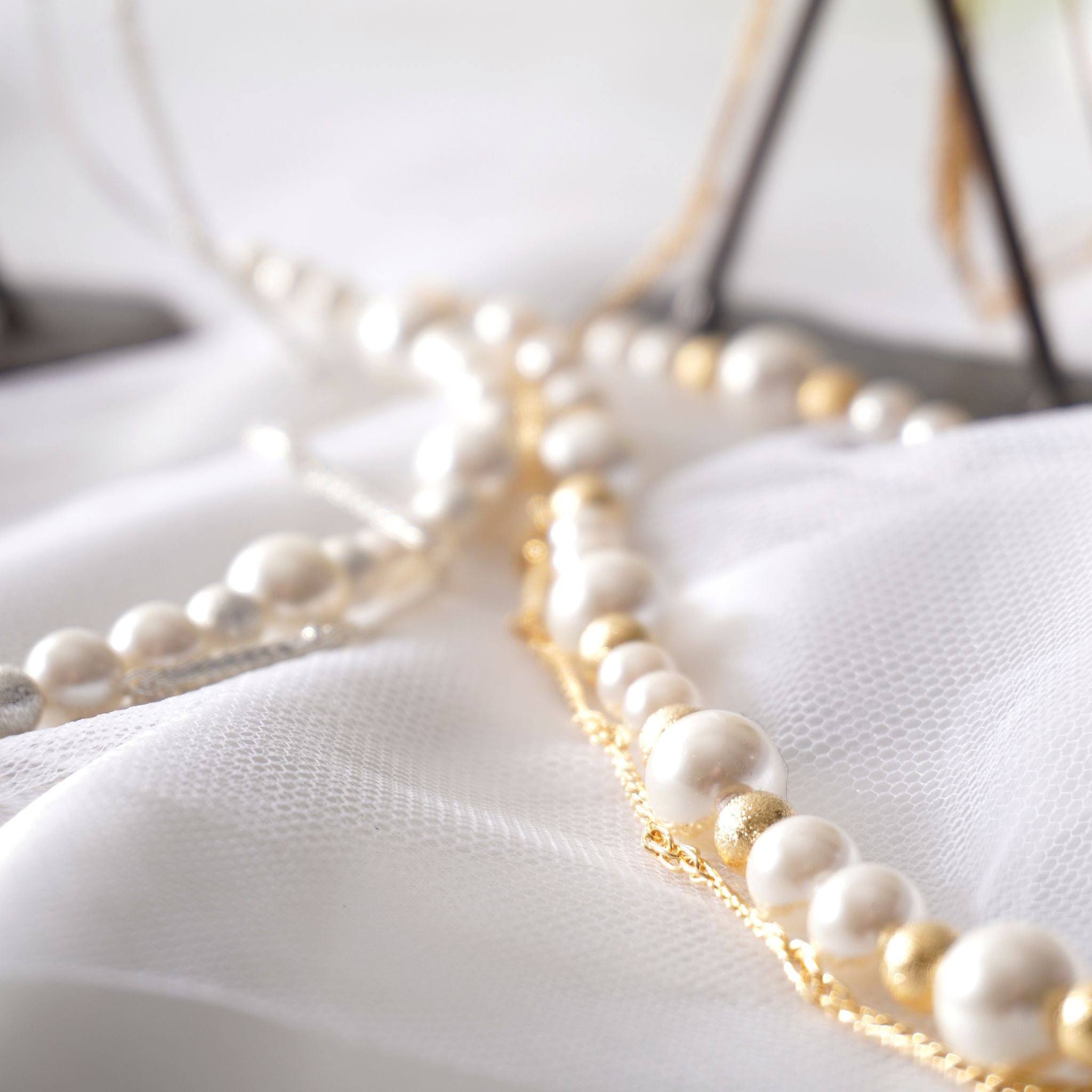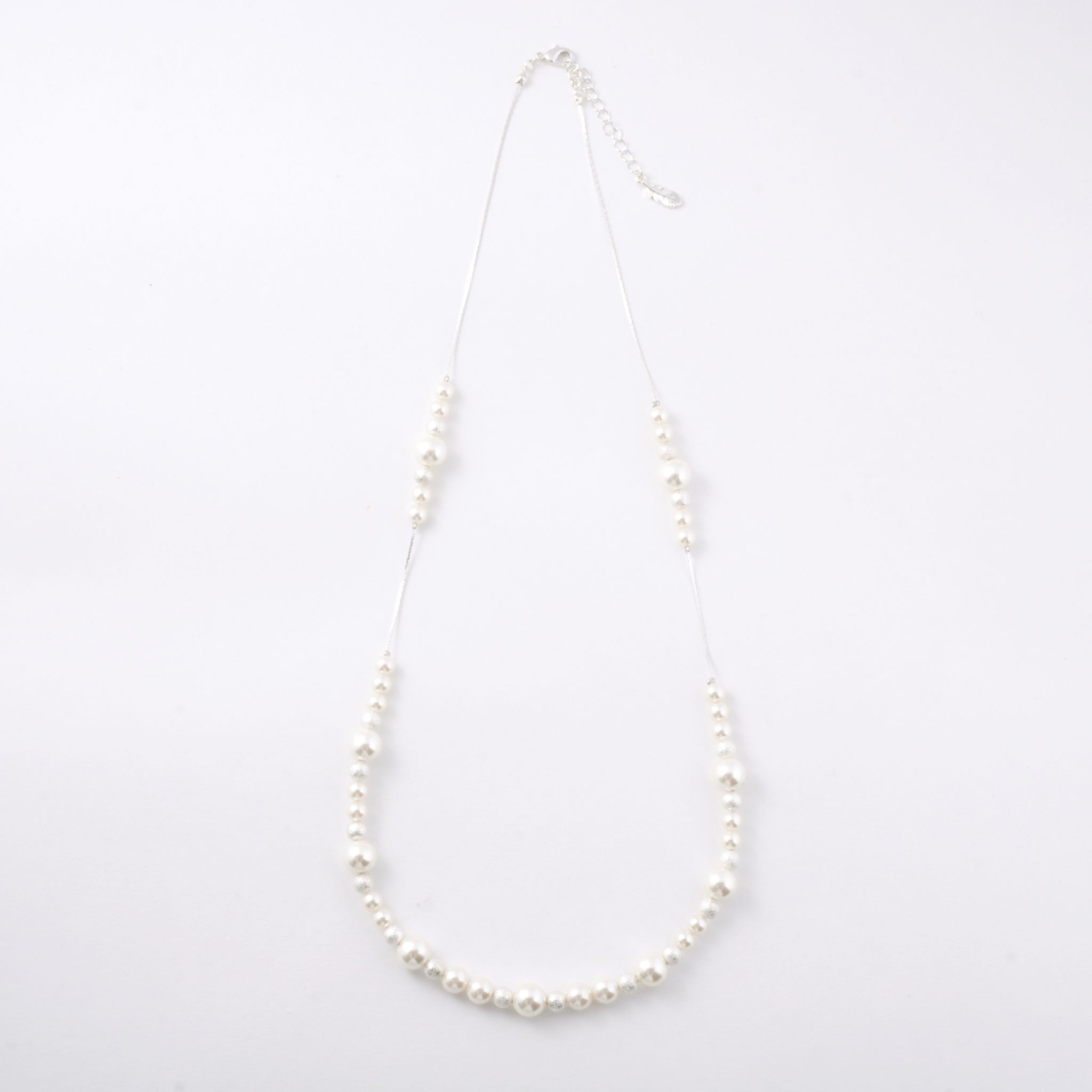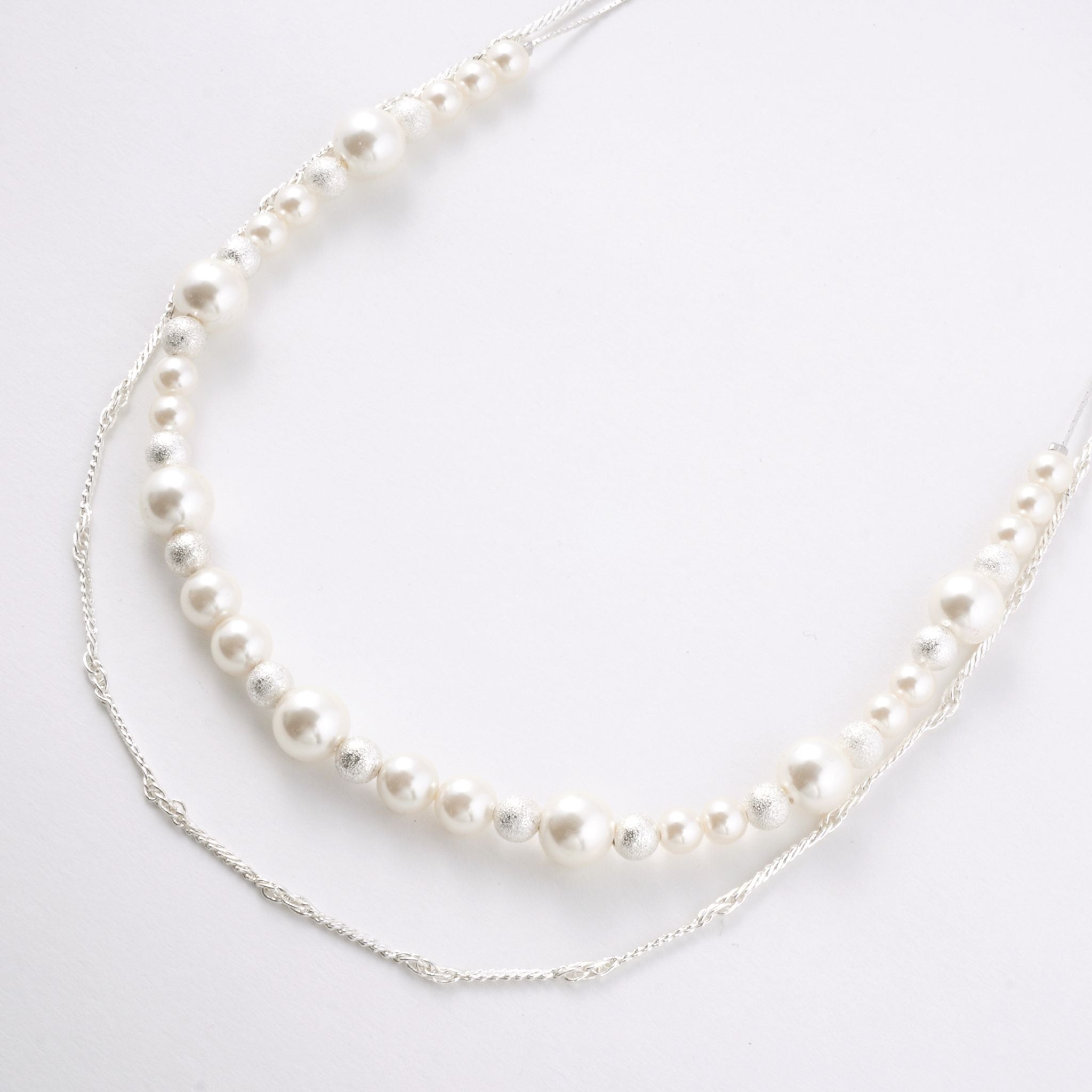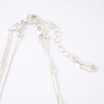 デコルテから胸元にかけて、優雅なラインを描くロングパールネックレス。大小のパールをリズミカルに並べたデザインに、繊細なチェーンを組み合わせることで、軽やかさと上品な華やぎを両立しました。長めのシルエットが縦のラインを美しく強調し、装いをすっきりと見せながら、コーディネートに洗練された印象を添えます。