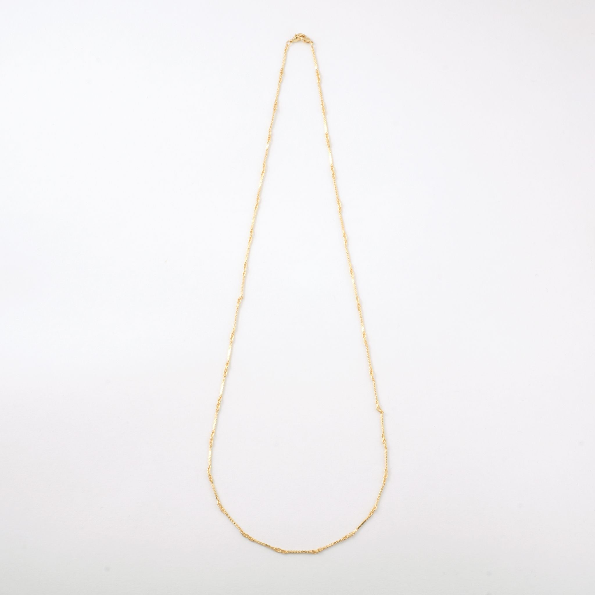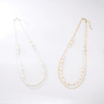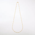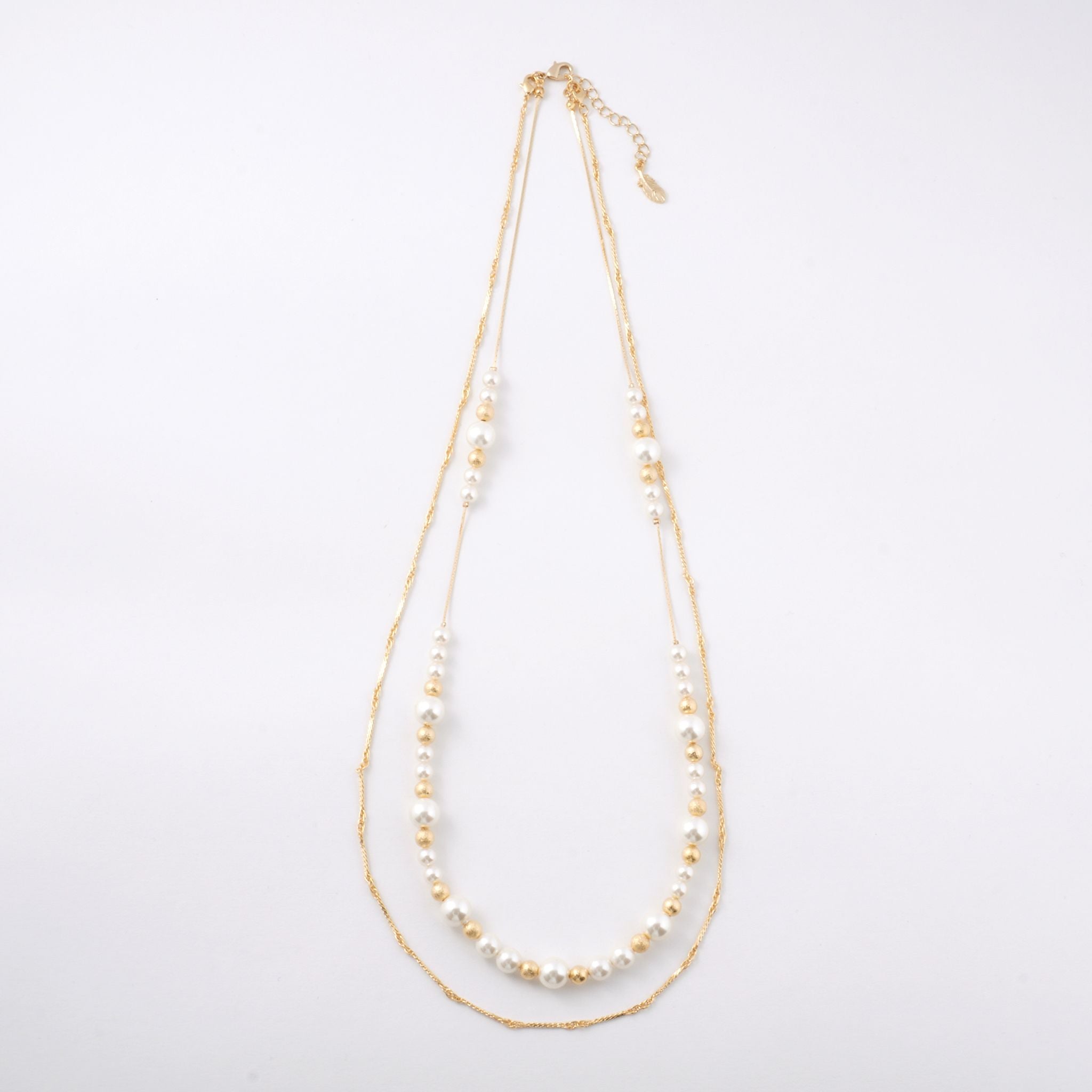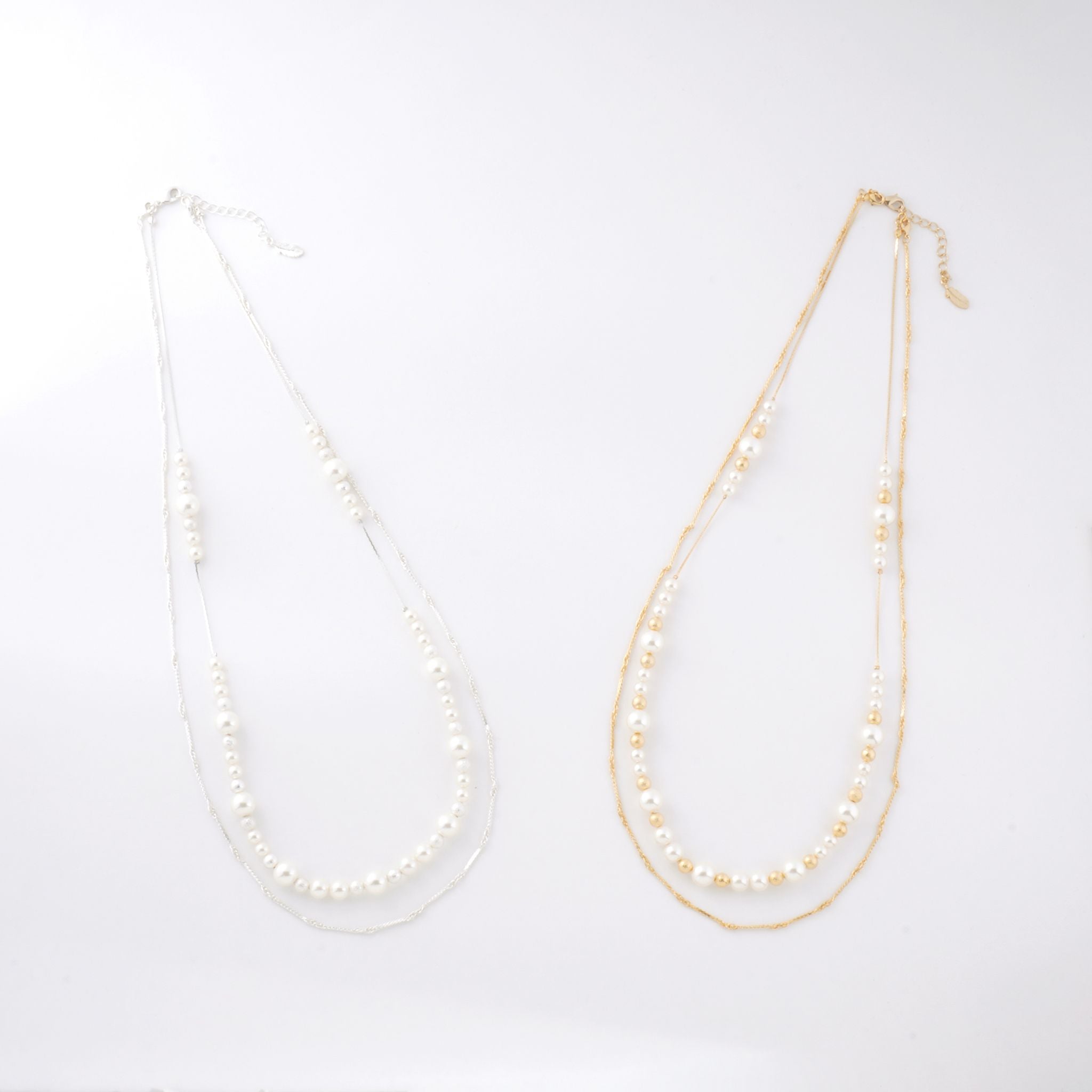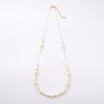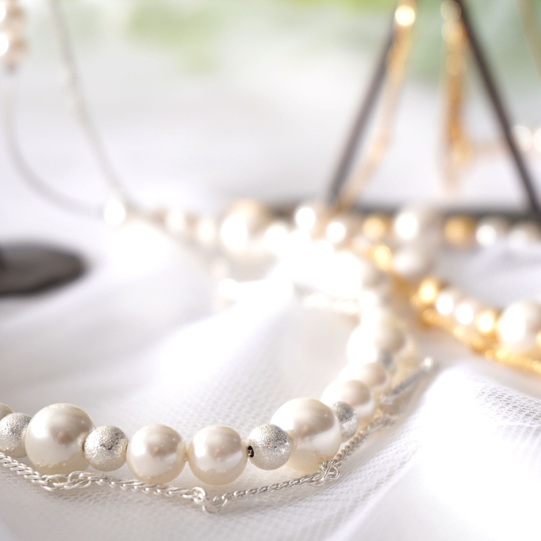 デコルテから胸元にかけて、優雅なラインを描くロングパールネックレス。大小のパールをリズミカルに並べたデザインに、繊細なチェーンを組み合わせることで、軽やかさと上品な華やぎを両立しました。長めのシルエットが縦のラインを美しく強調し、装いをすっきりと見せながら、コーディネートに洗練された印象を添えます。