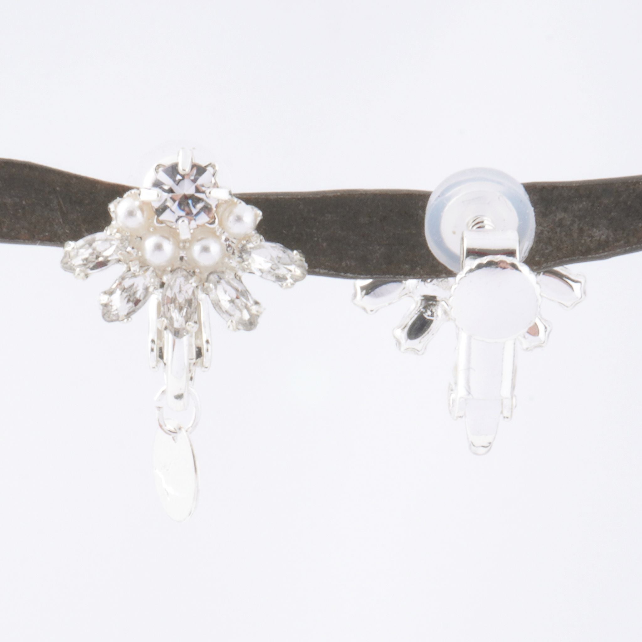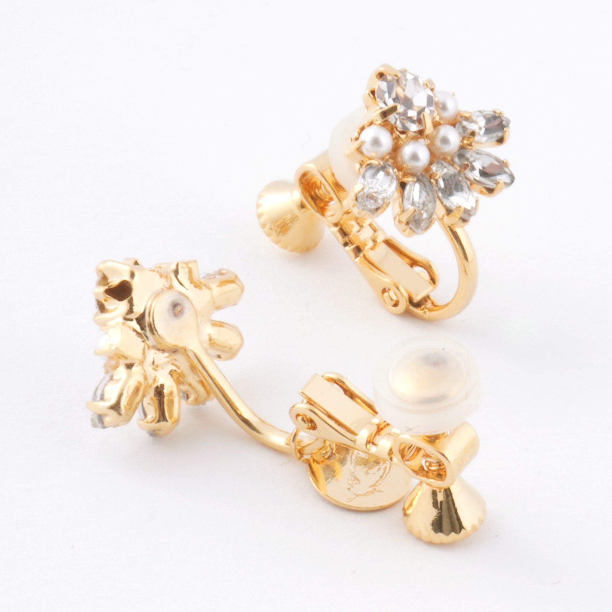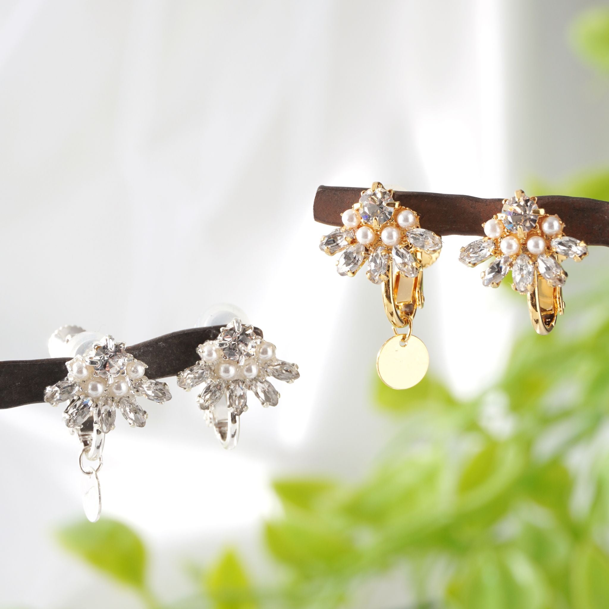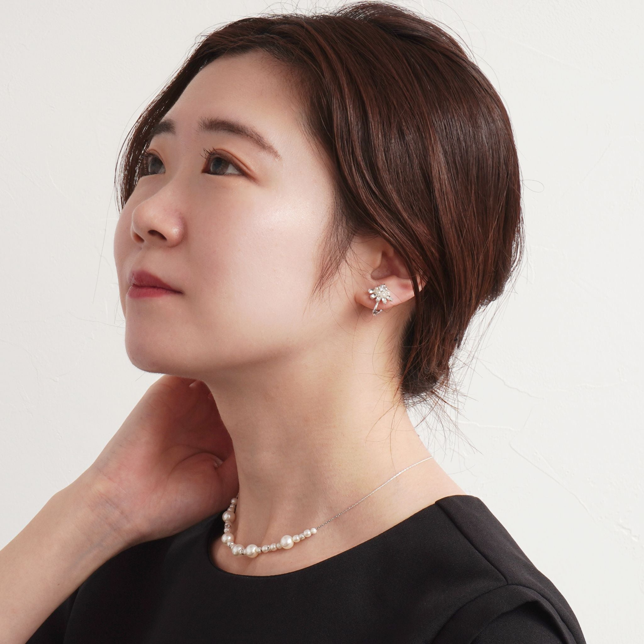 中央のストーンを囲むようにパールとビジューをバランスよくあしらい、末広がりに広がるシルエットが可憐で上品な印象を演出します。小ぶりながらも繊細な輝きが重なり合い、耳たぶにちゅんと寄り添うような可愛らしいフォルムが顔周りをやさしく引き立てます。