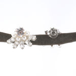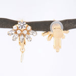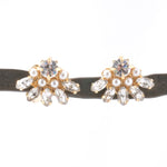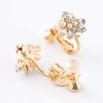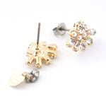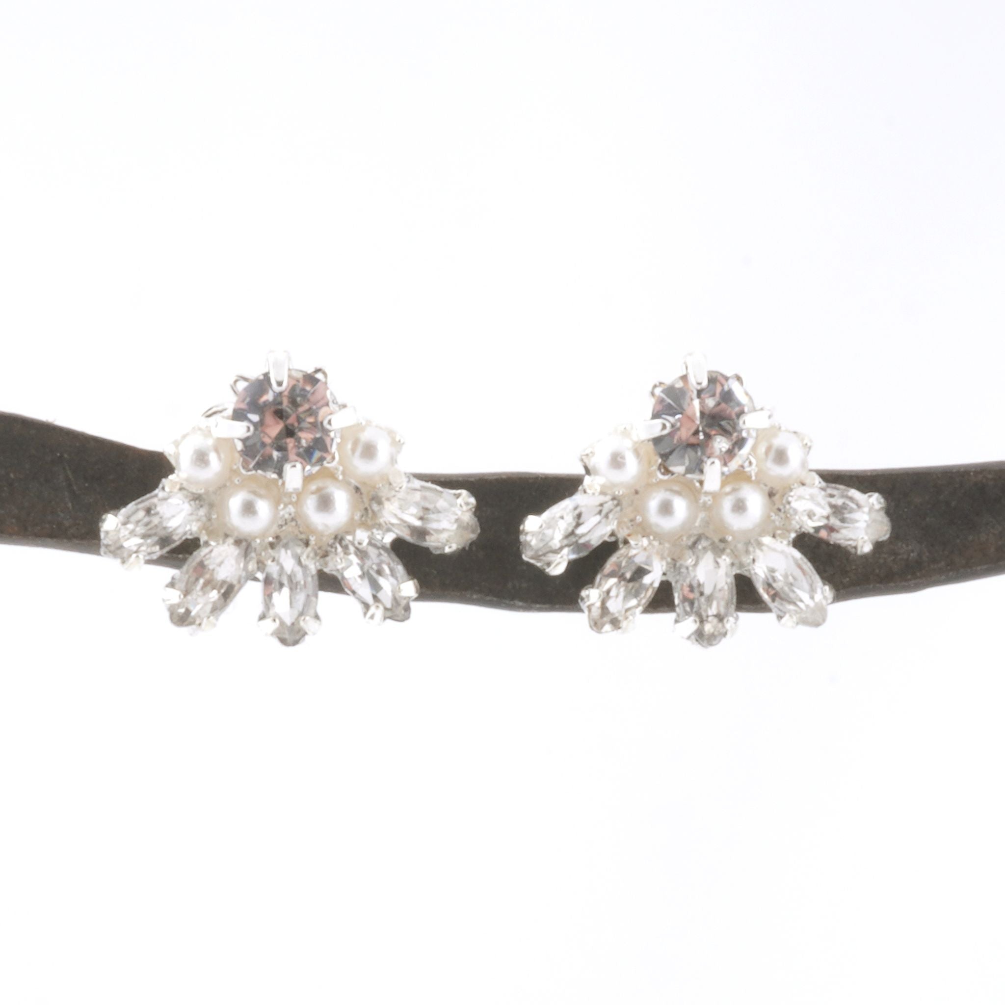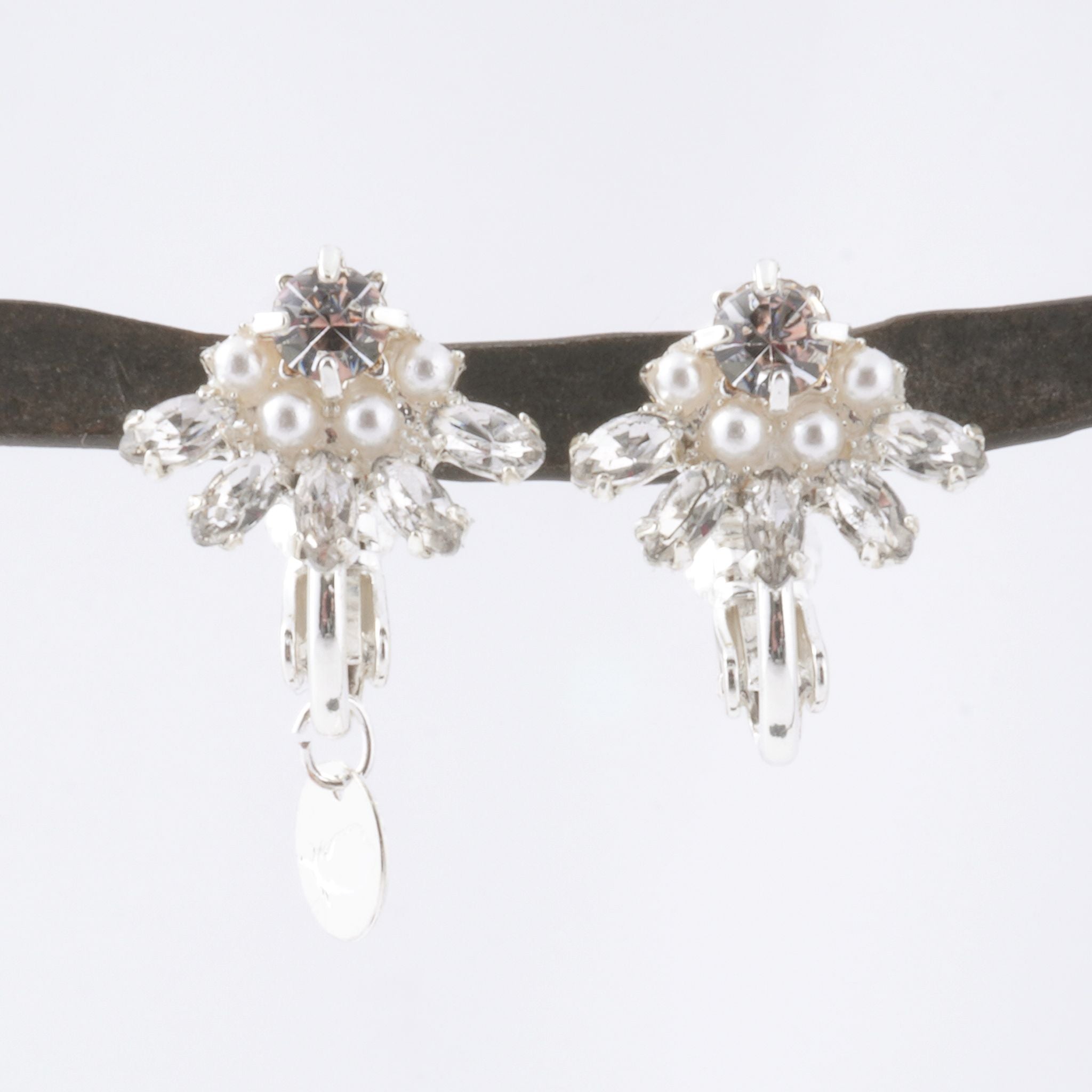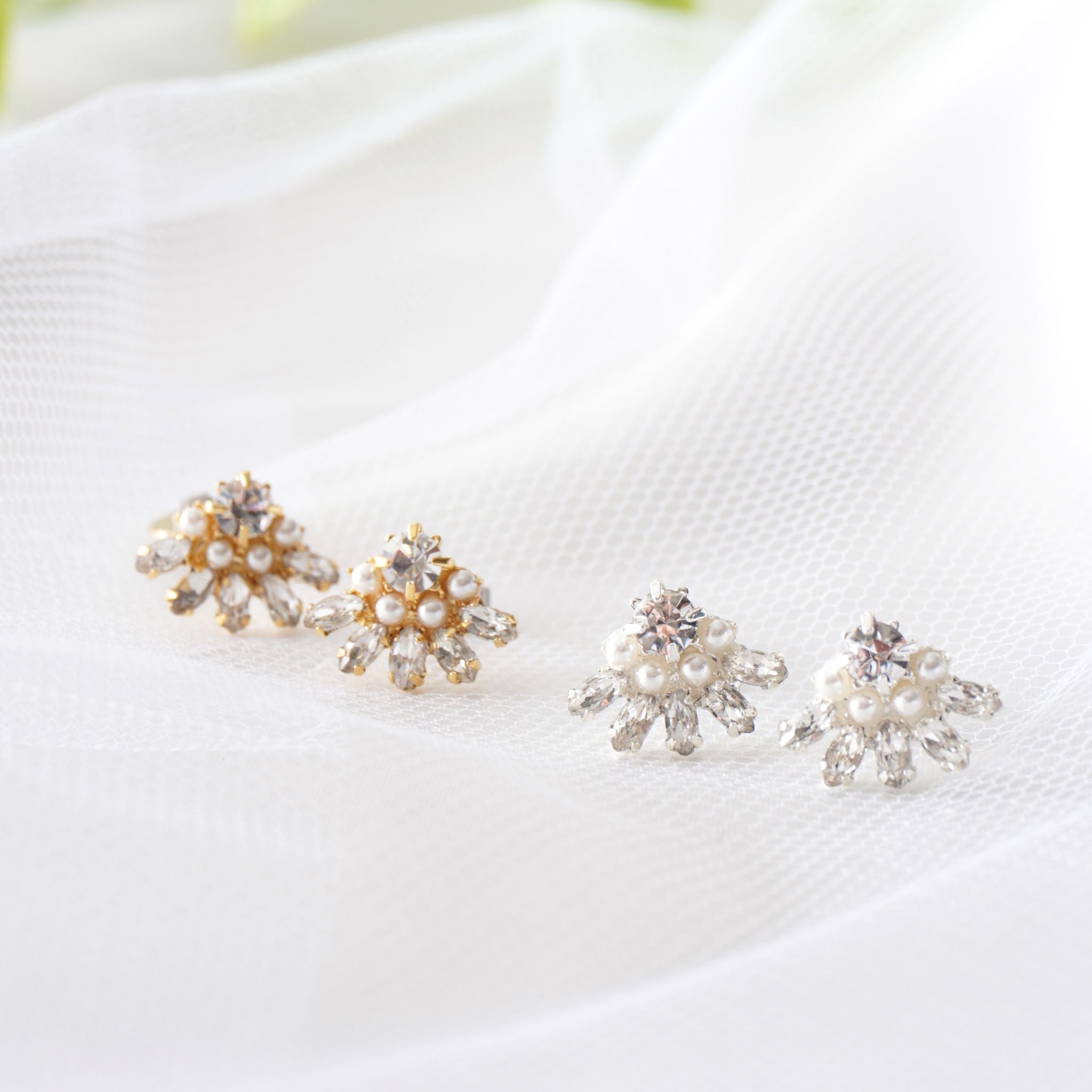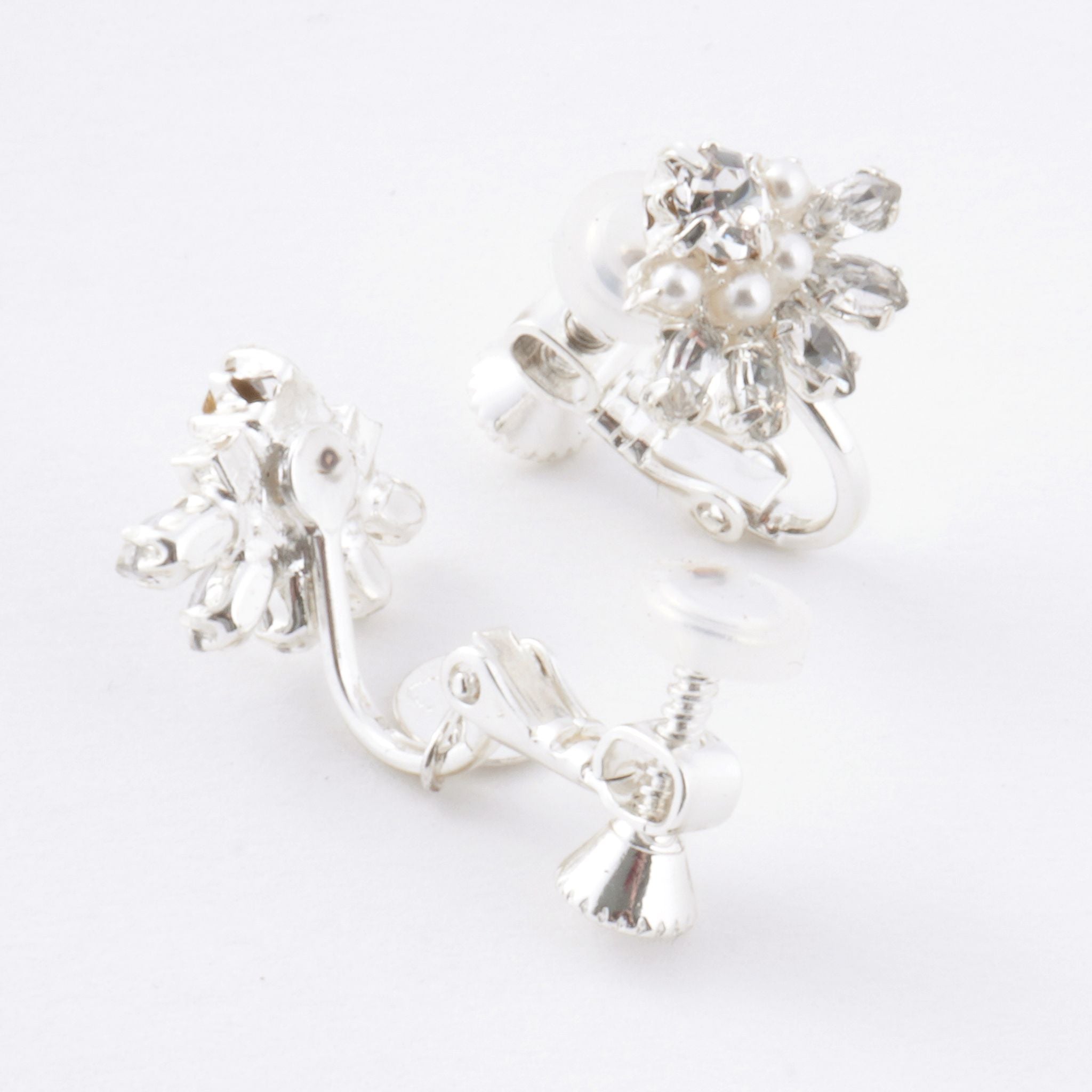 中央のストーンを囲むようにパールとビジューをバランスよくあしらい、末広がりに広がるシルエットが可憐で上品な印象を演出します。小ぶりながらも繊細な輝きが重なり合い、耳たぶにちゅんと寄り添うような可愛らしいフォルムが顔周りをやさしく引き立てます。