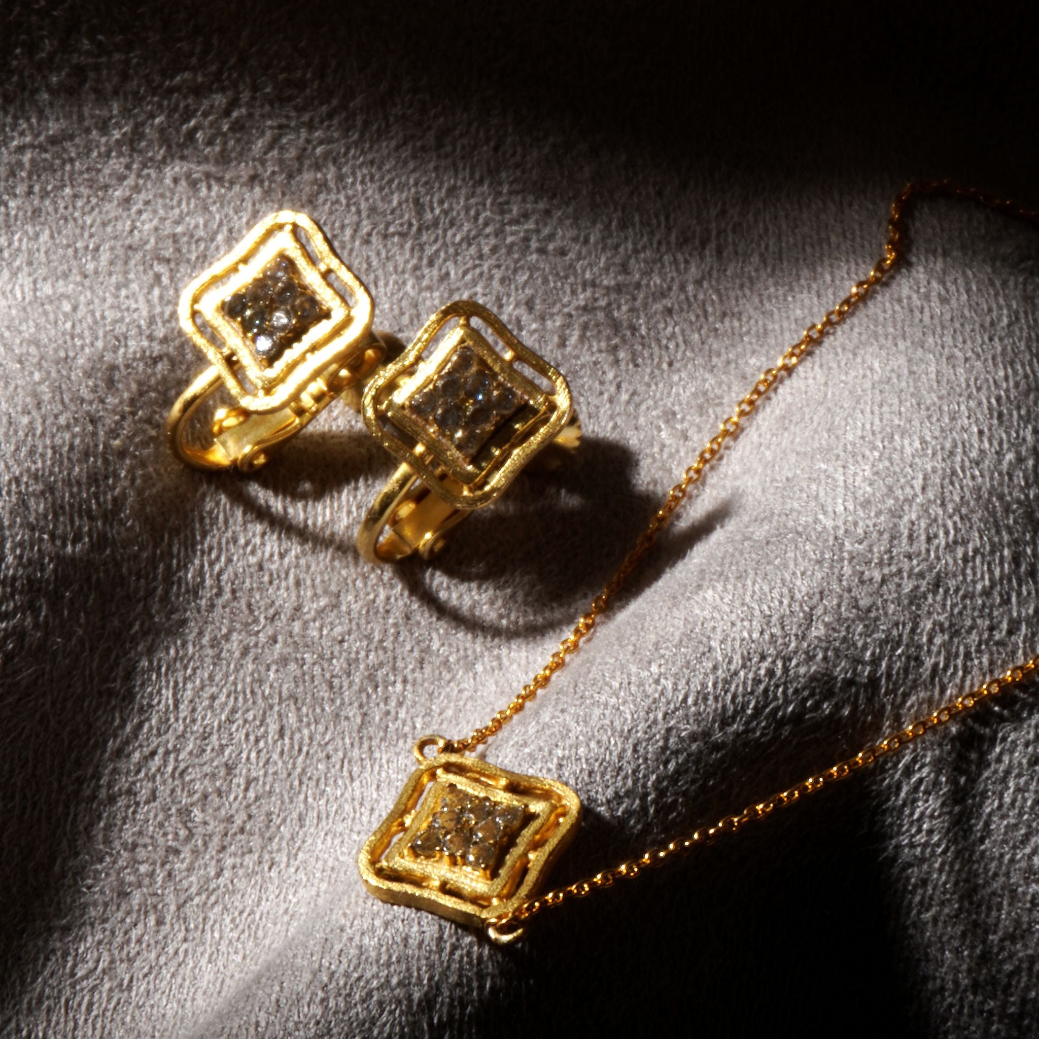 長い年月に渡り大切に伝えられてきた伝統技術を持つ職人の技巧を駆使したジュエリーがMAYGLOBEから誕生。1枚の固い真鍮から石をセットする土台をハンマーで作り出す加工は非常に高度な技術が必要なため、熟練の職人だけがなせる業。モチーフ裏は裏抜き加工を施し、底から入る光はオモテ面の立体感と輝きを際立たせます。