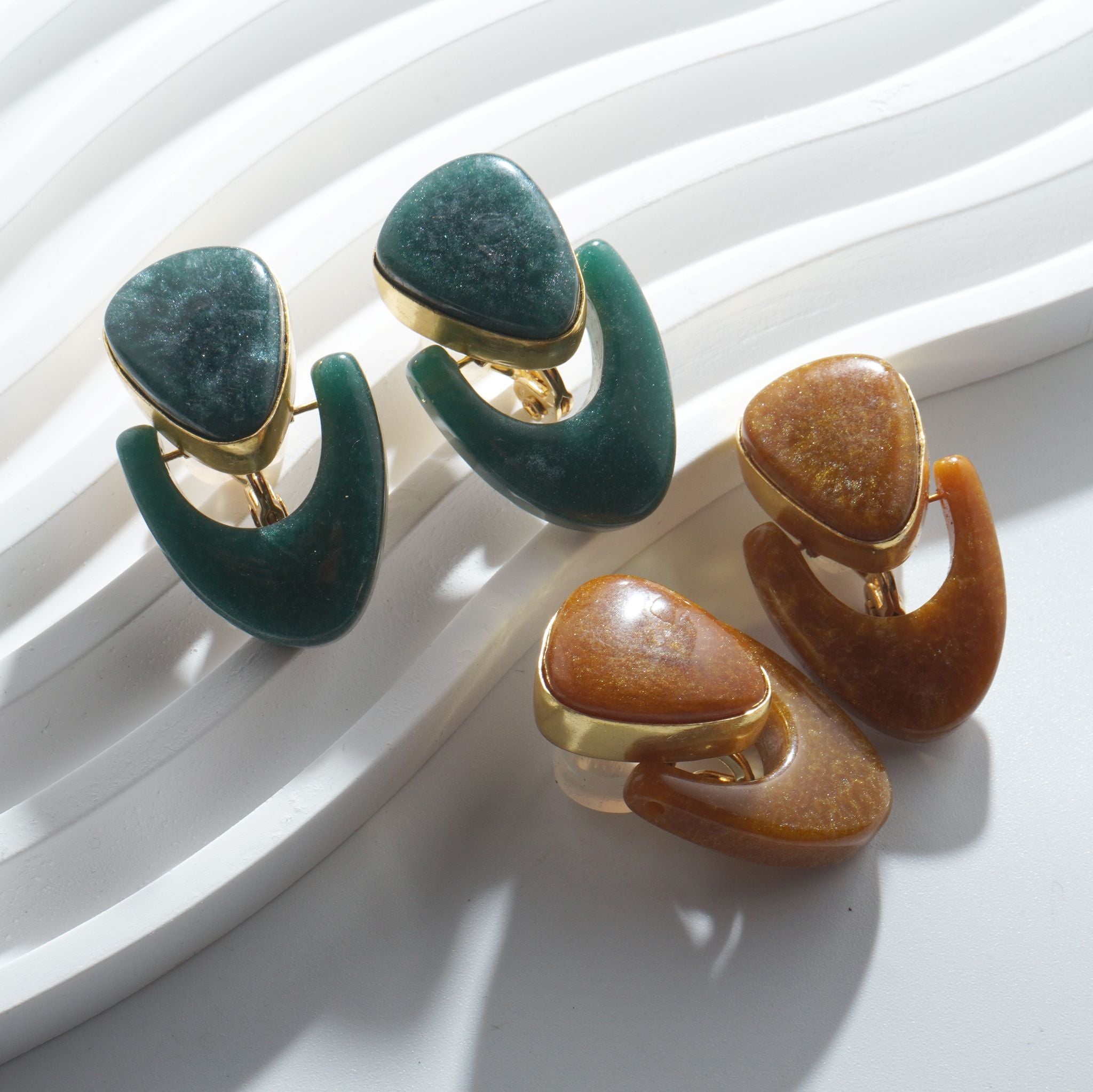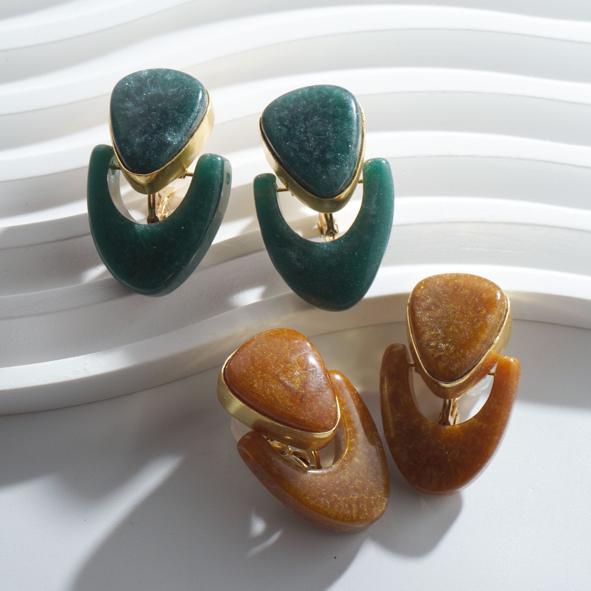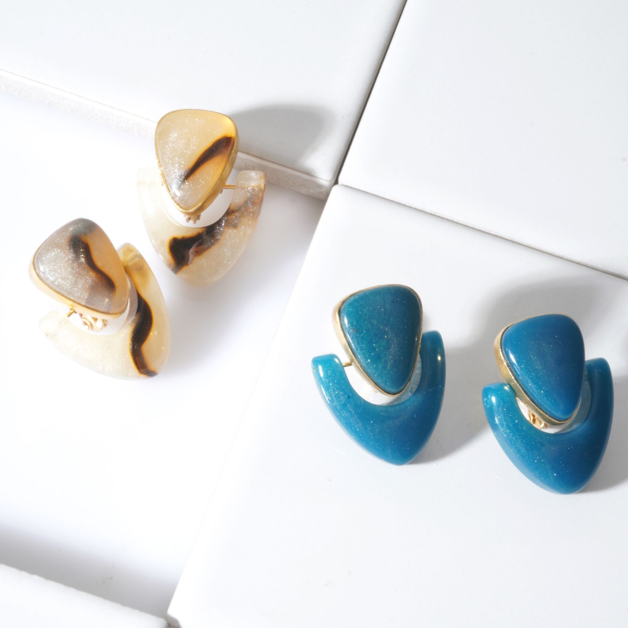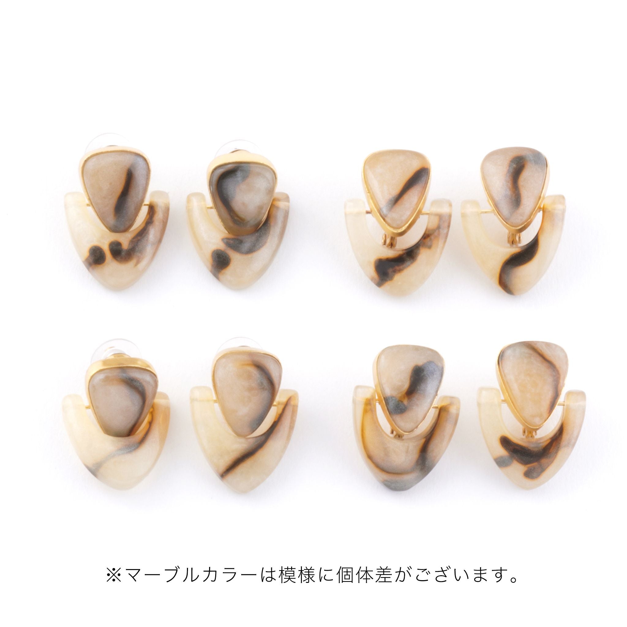 天然石を思わせるマーブル調の表情と、柔らかな光沢感が印象的なピアス・イヤリング。ひとつとして同じ柄の出方がないため、色の重なりや濃淡が耳元にさりげない個性を添えます。程よいボリューム感がありながらも、丸みとエッジのあるフォルムで肌なじみが良く、日常のコーディネートに自然と溶け込むデザイン。
