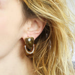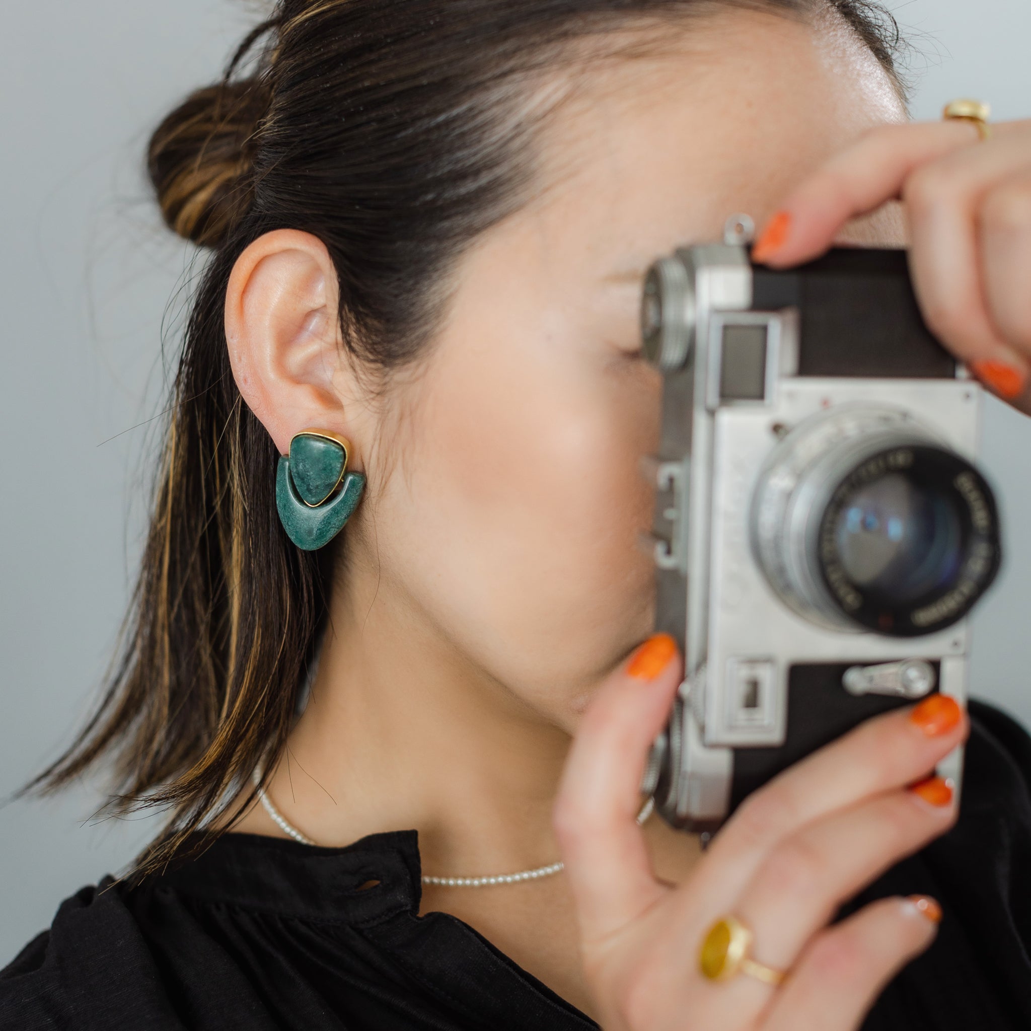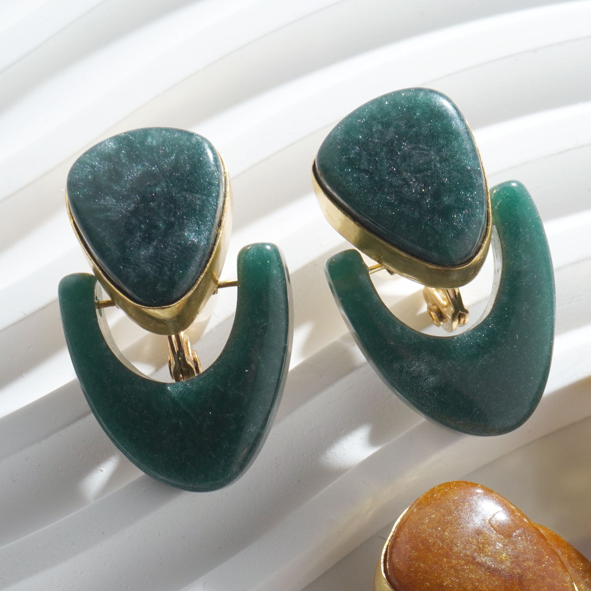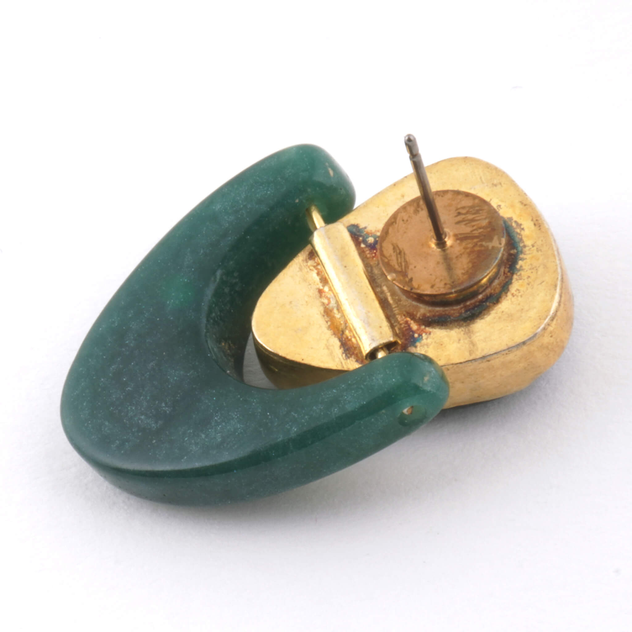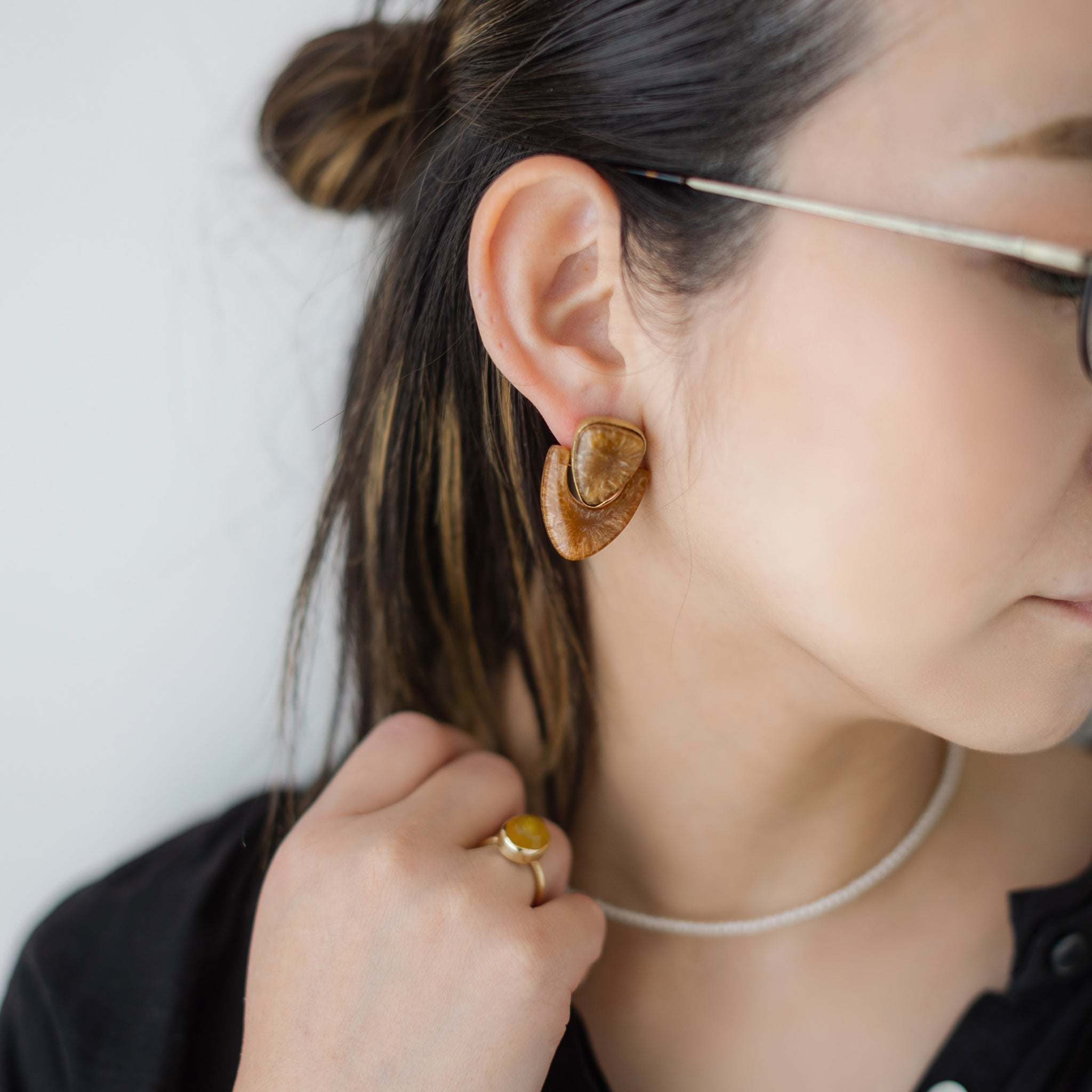 天然石を思わせるマーブル調の表情と、柔らかな光沢感が印象的なピアス・イヤリング。ひとつとして同じ柄の出方がないため、色の重なりや濃淡が耳元にさりげない個性を添えます。程よいボリューム感がありながらも、丸みとエッジのあるフォルムで肌なじみが良く、日常のコーディネートに自然と溶け込むデザイン。