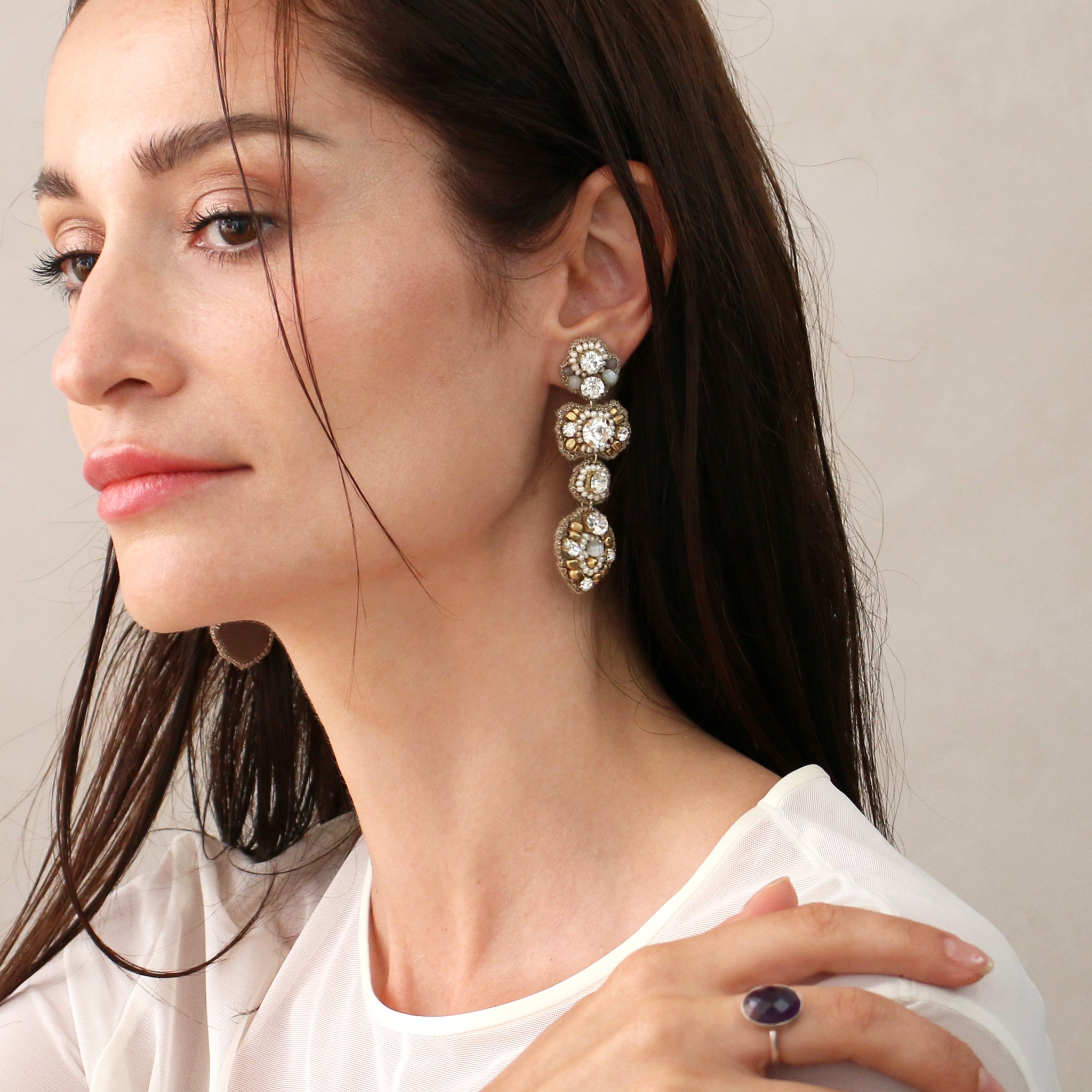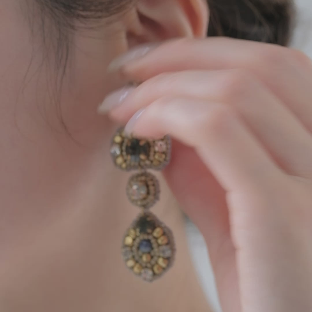 ビジューとビーズ刺繍を重ねたロングシルエットが、横顔に奥行きのある輝きを生むイヤリング。動くたび揺れるデザインが光を集め、装いに静かな存在感を添えます。大人のスタイルに映える、モードで印象的なロングアクセサリーです。