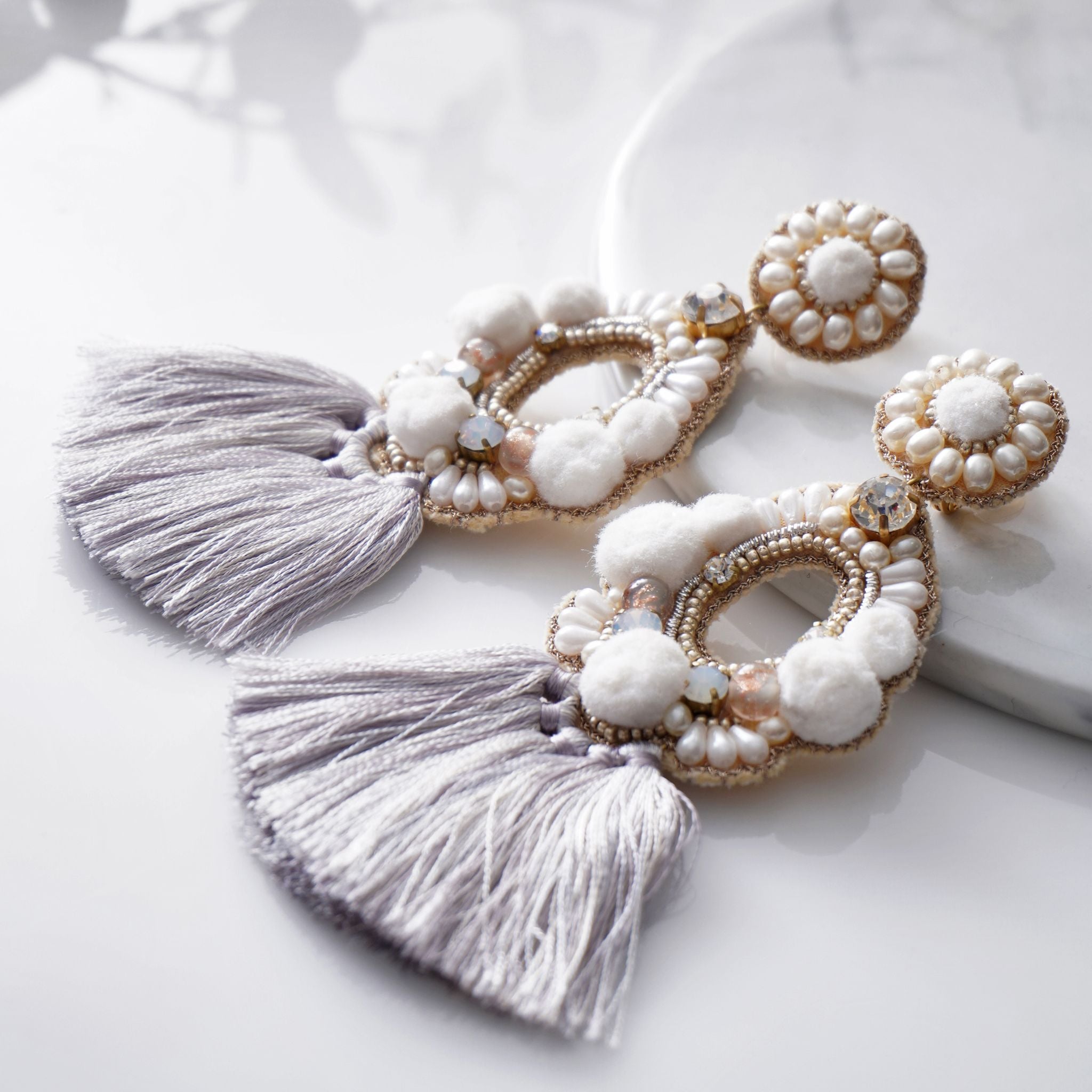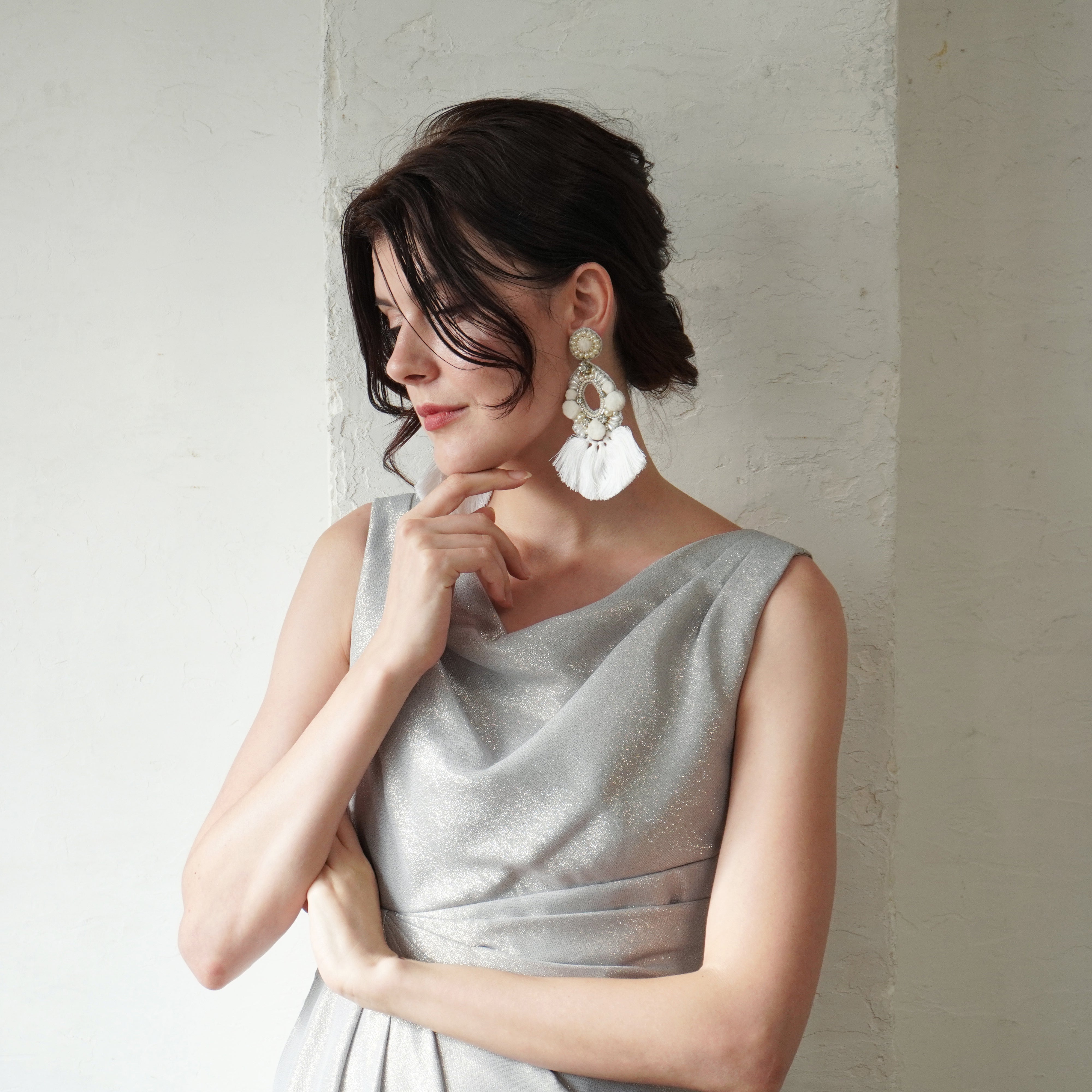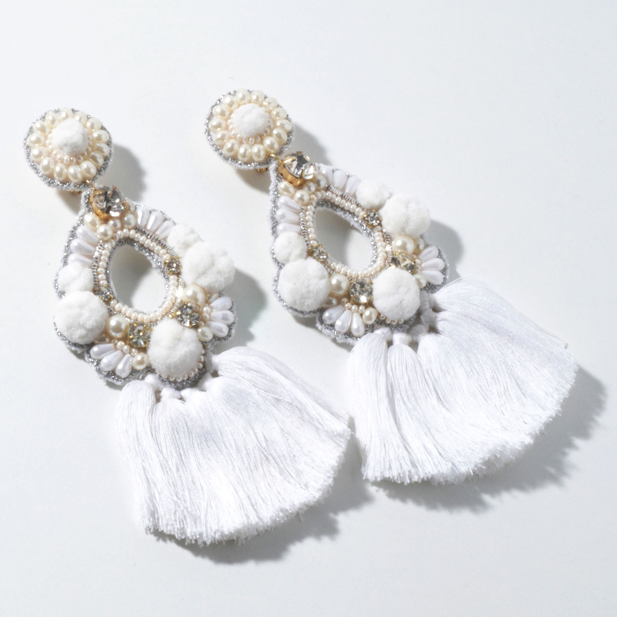 祝福の光を耳元にまとったような、華やかなビーズ刺繍イヤリング。パールやビジューの繊細な輝きに、歩くたび揺れるタッセルが花嫁の横顔を美しく引き立てます。特別な一日をより印象的に彩る、ドラマティックなアクセサリーです。