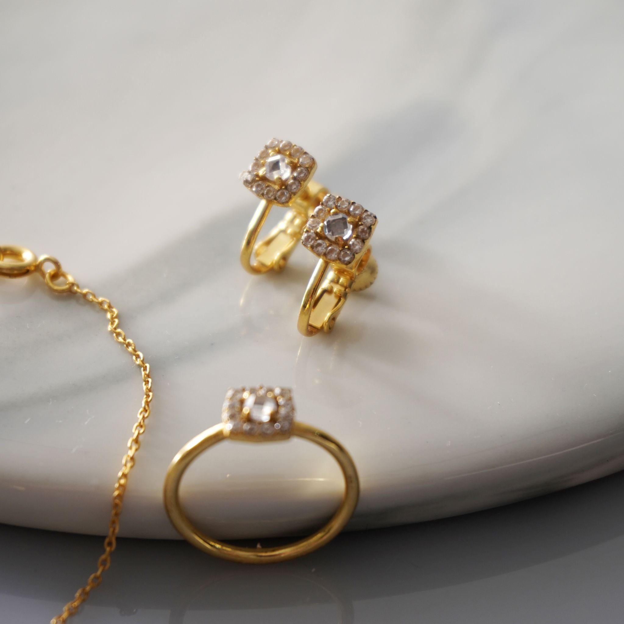 周囲と差がつくMAYGLOBEのジュエリーシリーズ。高級ジュエリーと同じ技法で作られたアンティーク調の風合いは手に取っていただくとその繊細さにうっとり。中央のクリスタルクオーツはバラのようにカットされたローズカットを採用。多方面にきらめく光がとても上品です。玉留めという技法でストーンをセッティングしているため、チープな印象がなく、衣服などにアクセサリーが引っ掛からないのも嬉しいポイント。ストーンをのり貼りしているお手頃なスキンアクセサリーとは違い、石座にストーンをセッティングしているので、一度手に取っていただくと本物を感じれます。
