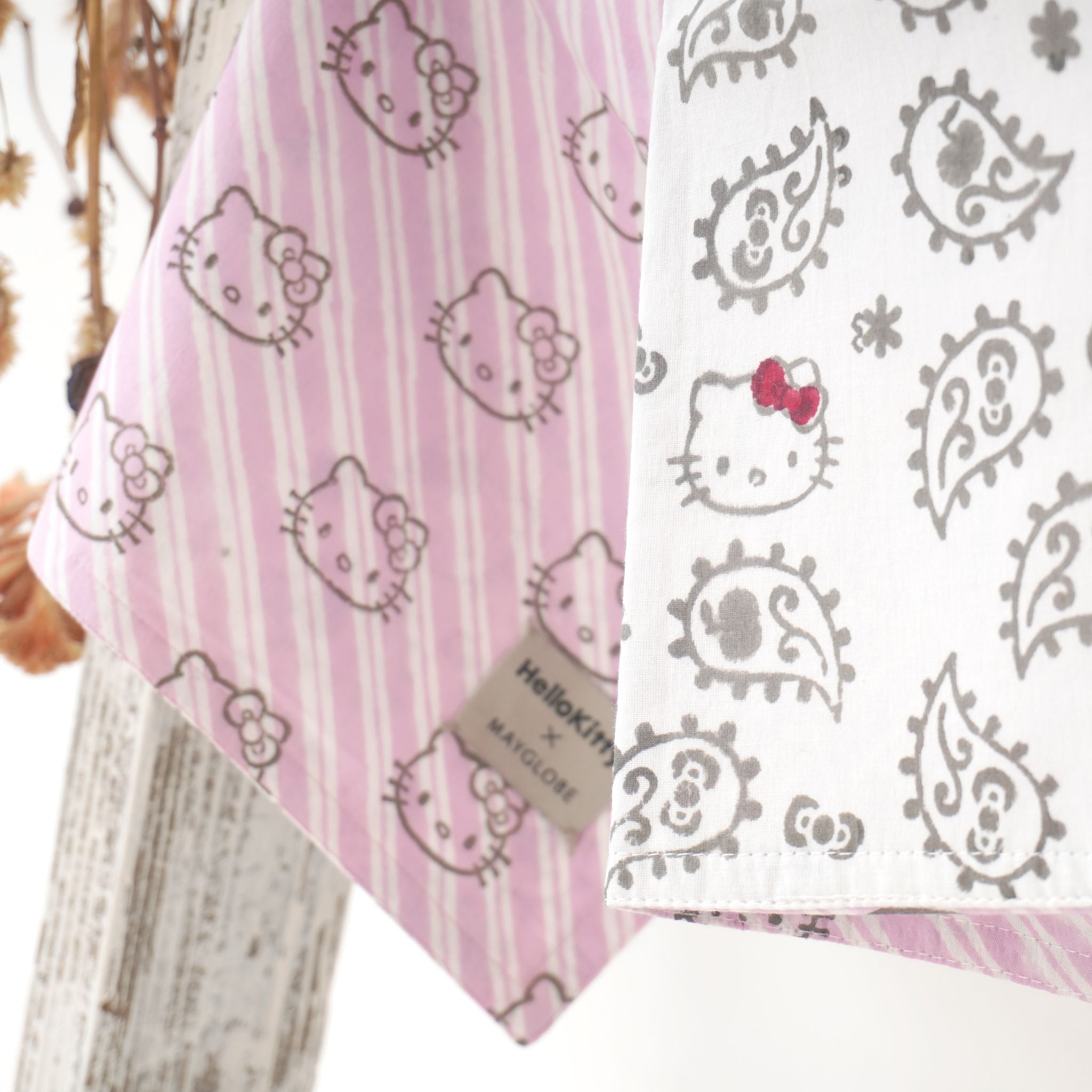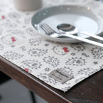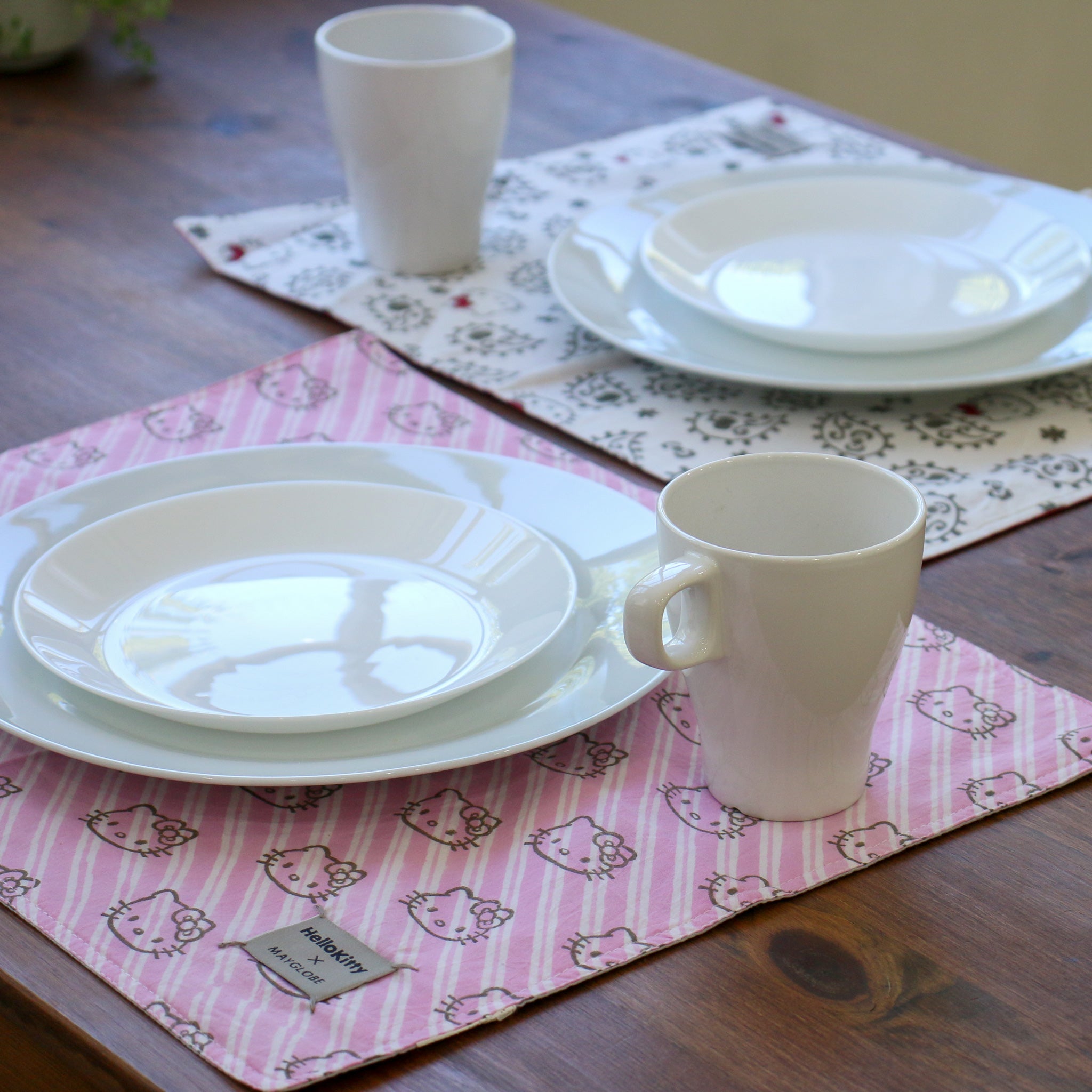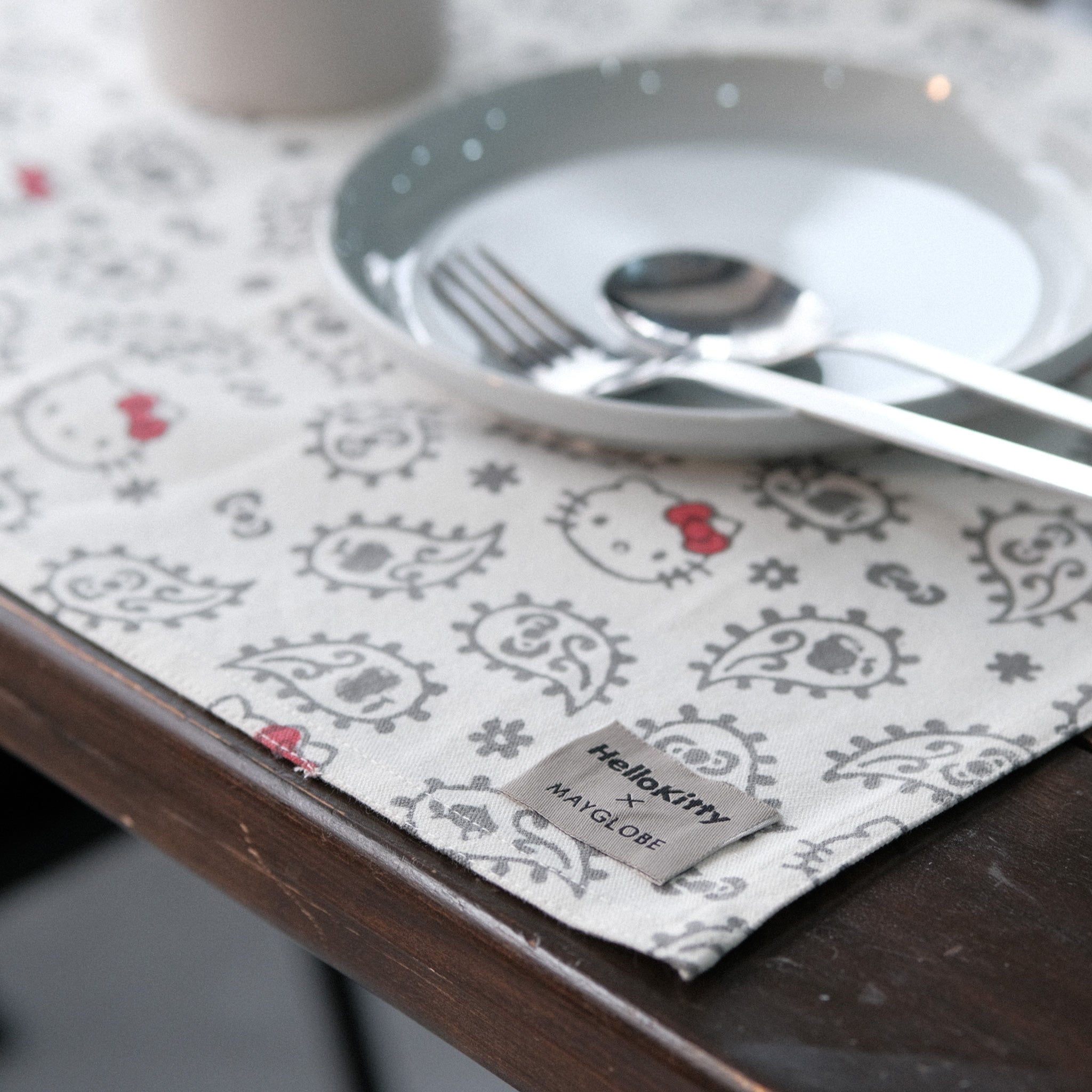 インドで起源前から語り継がれていると言われているブロックプリントという技法で作ったハローキティの生地をランチョンマットにしました。ハローキティの柔らかい風合いが食卓シーンを彩ります。リバーシブルもご用意しているので、1枚で2柄をお楽しみいただけます。