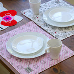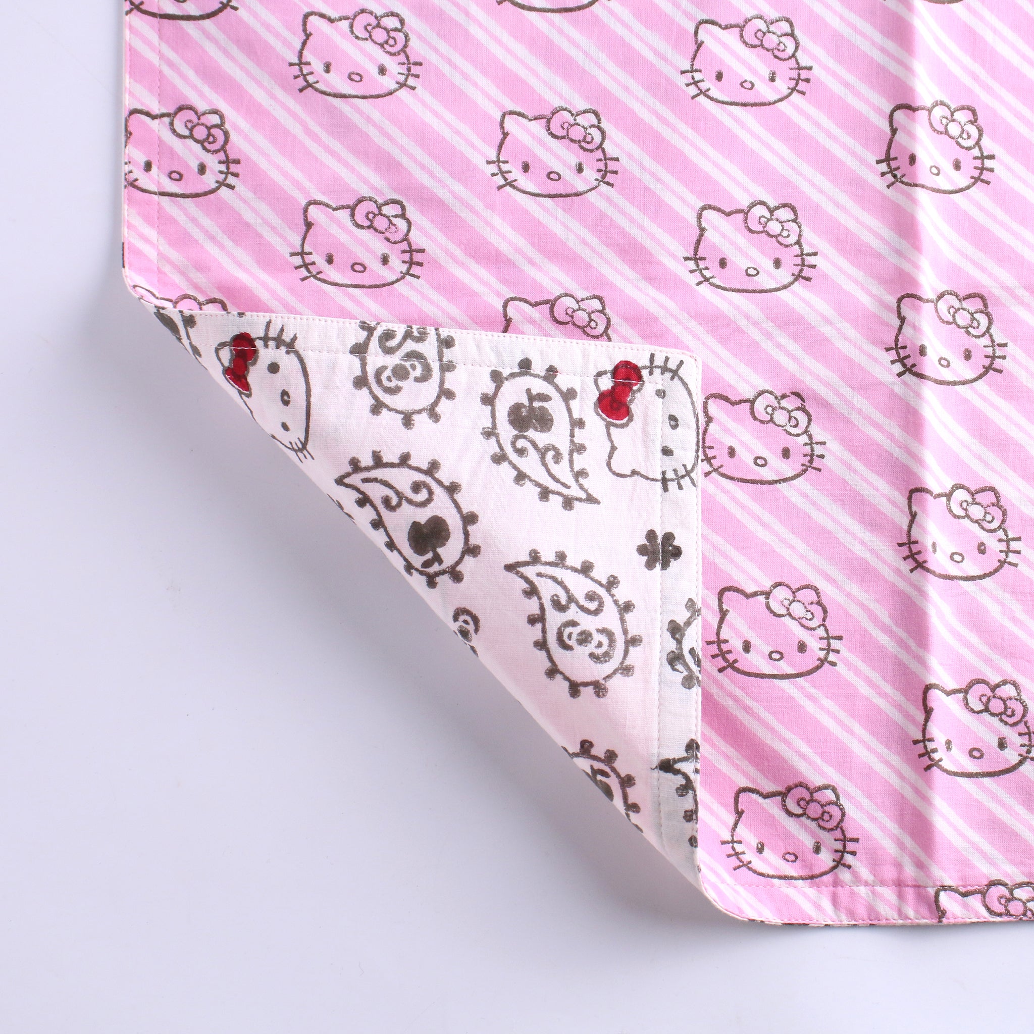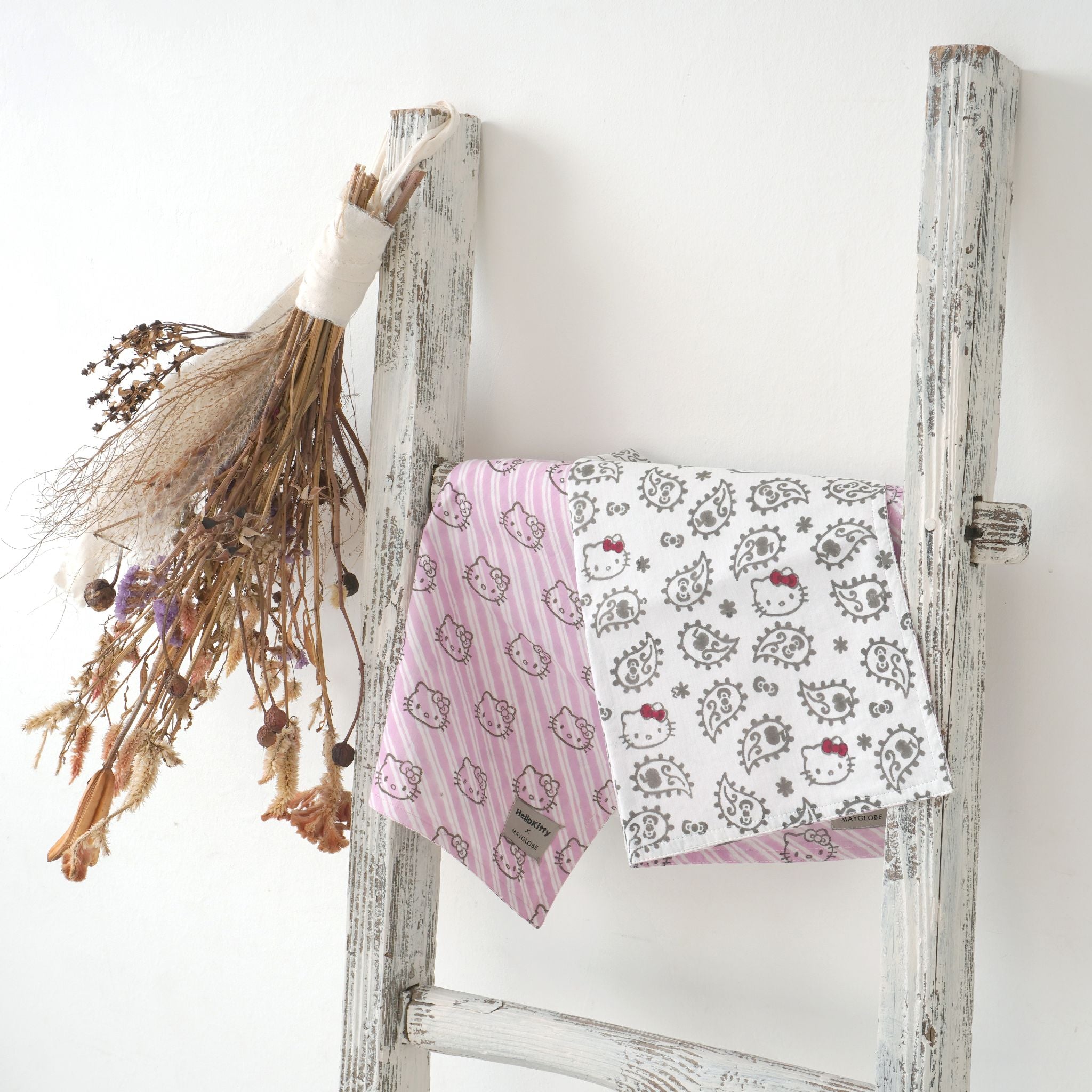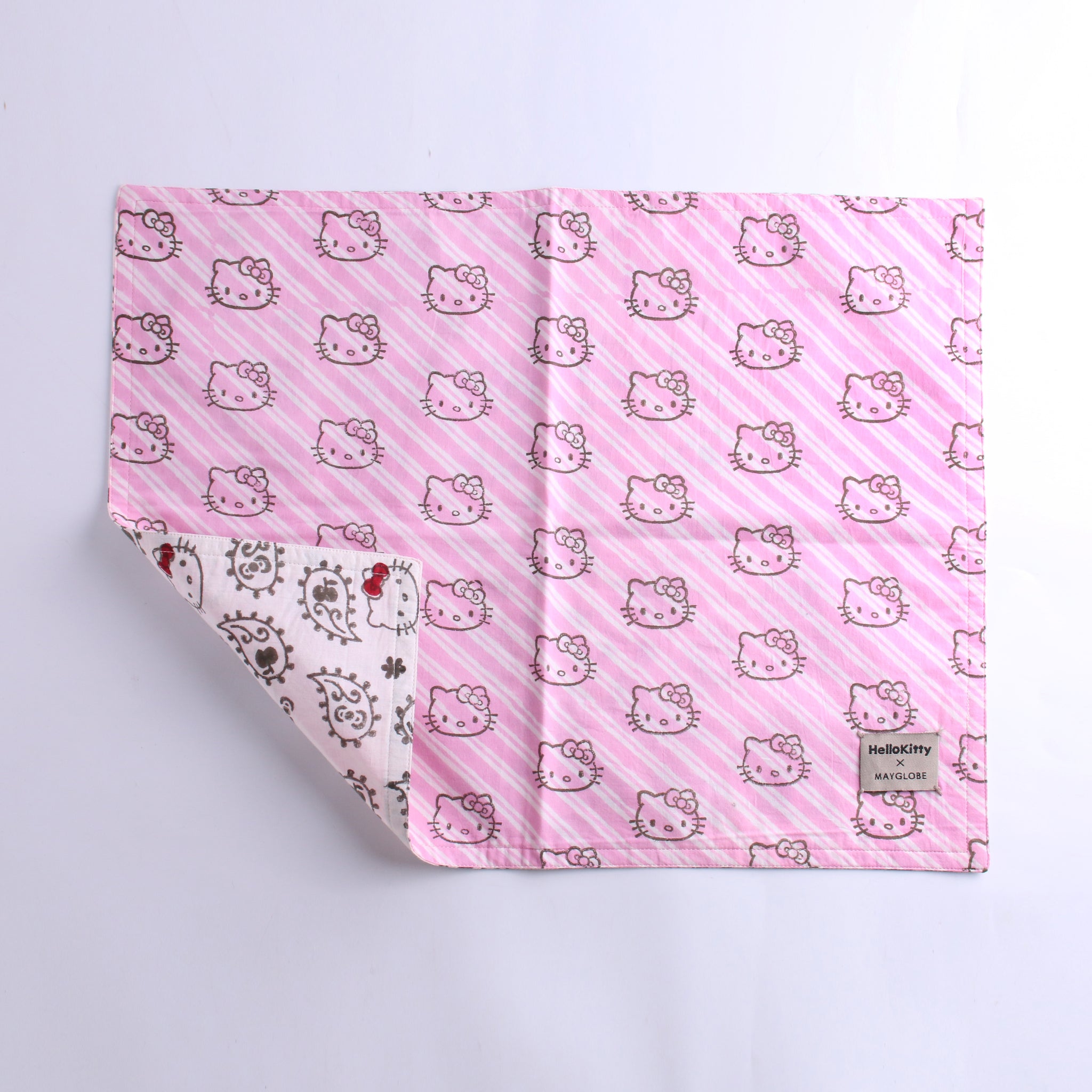 インドで起源前から語り継がれていると言われているブロックプリントという技法で作ったハローキティの生地をランチョンマットにしました。ハローキティの柔らかい風合いが食卓シーンを彩ります。リバーシブルもご用意しているので、1枚で2柄をお楽しみいただけます。