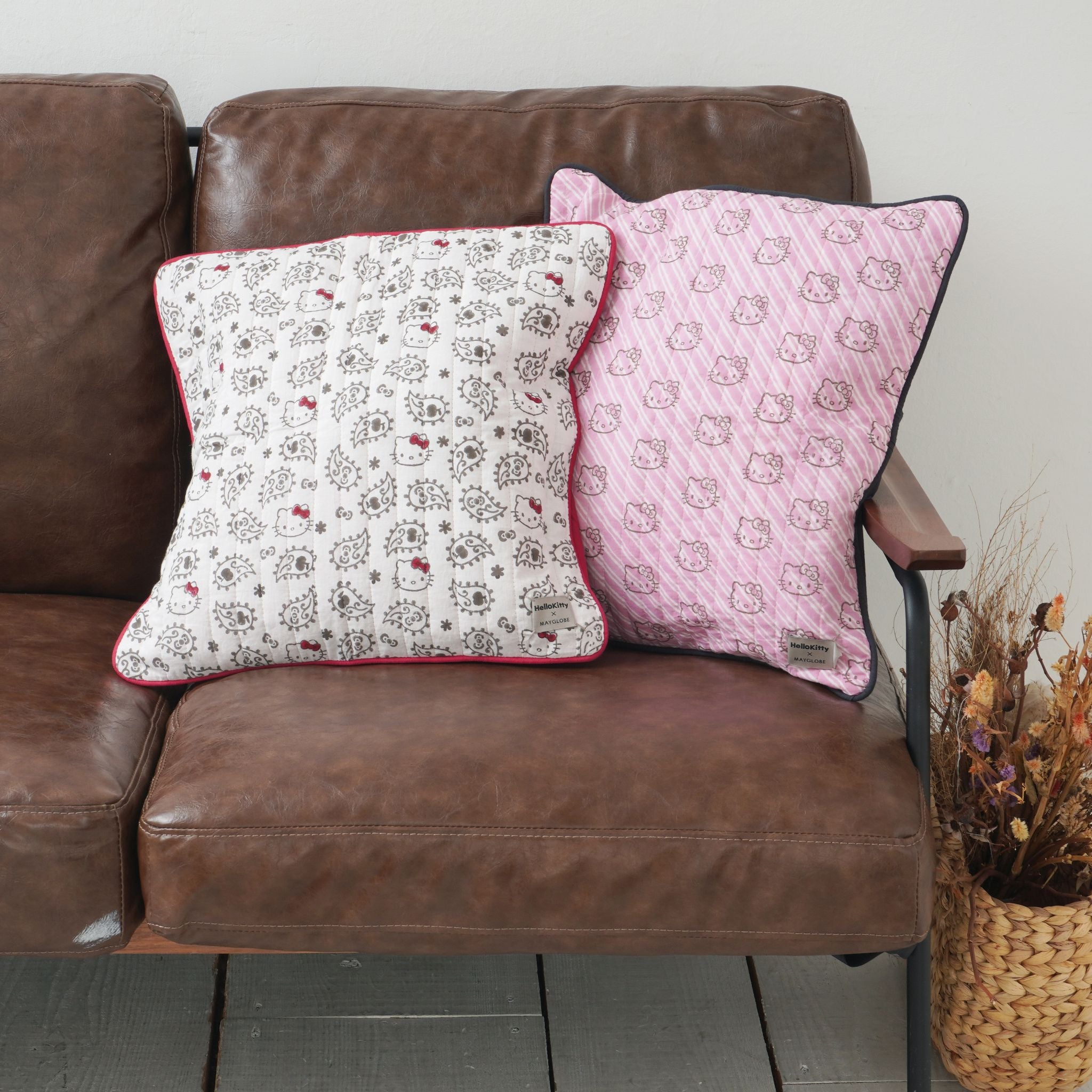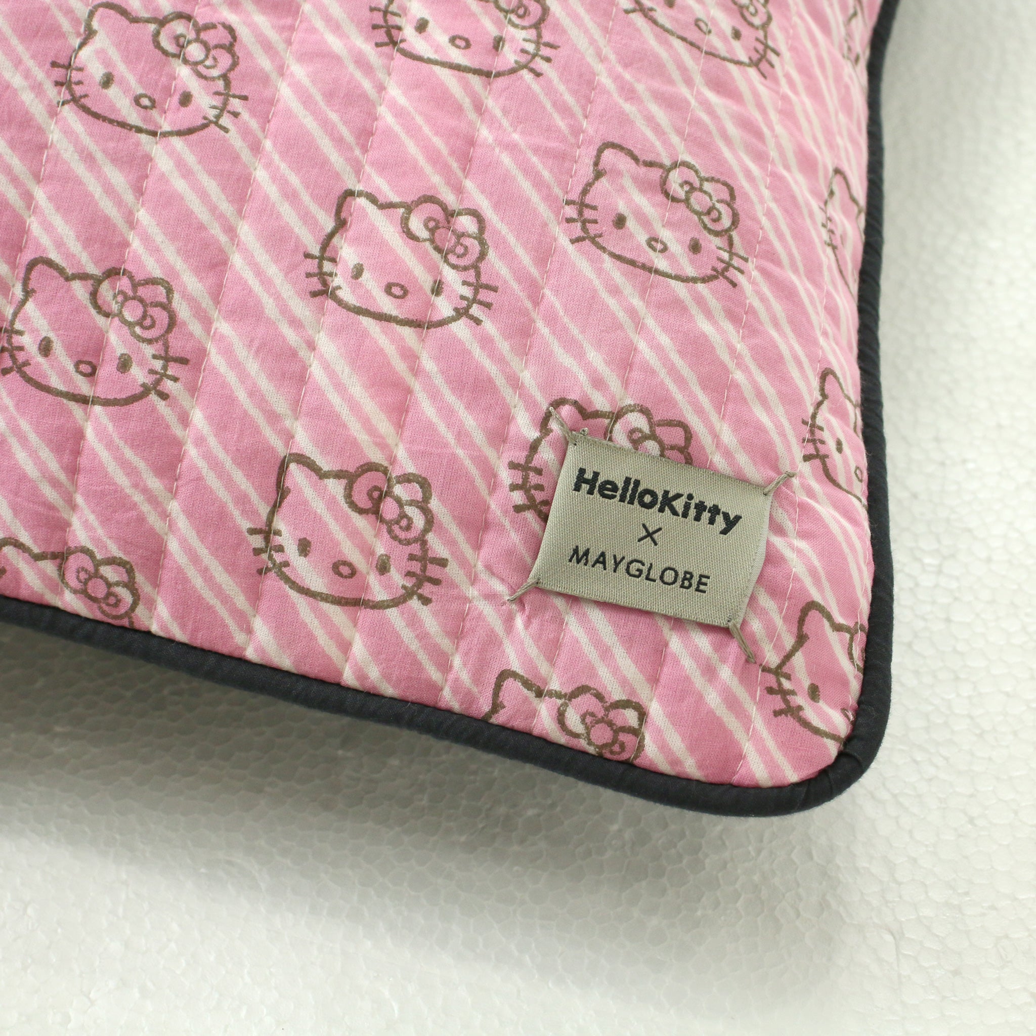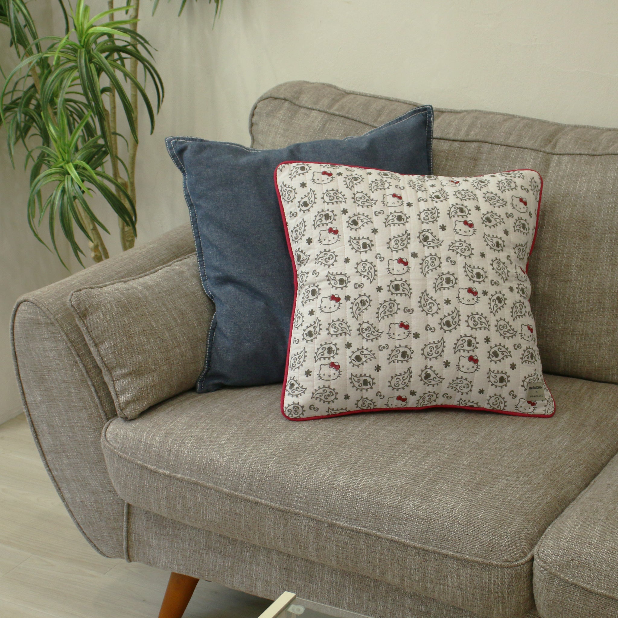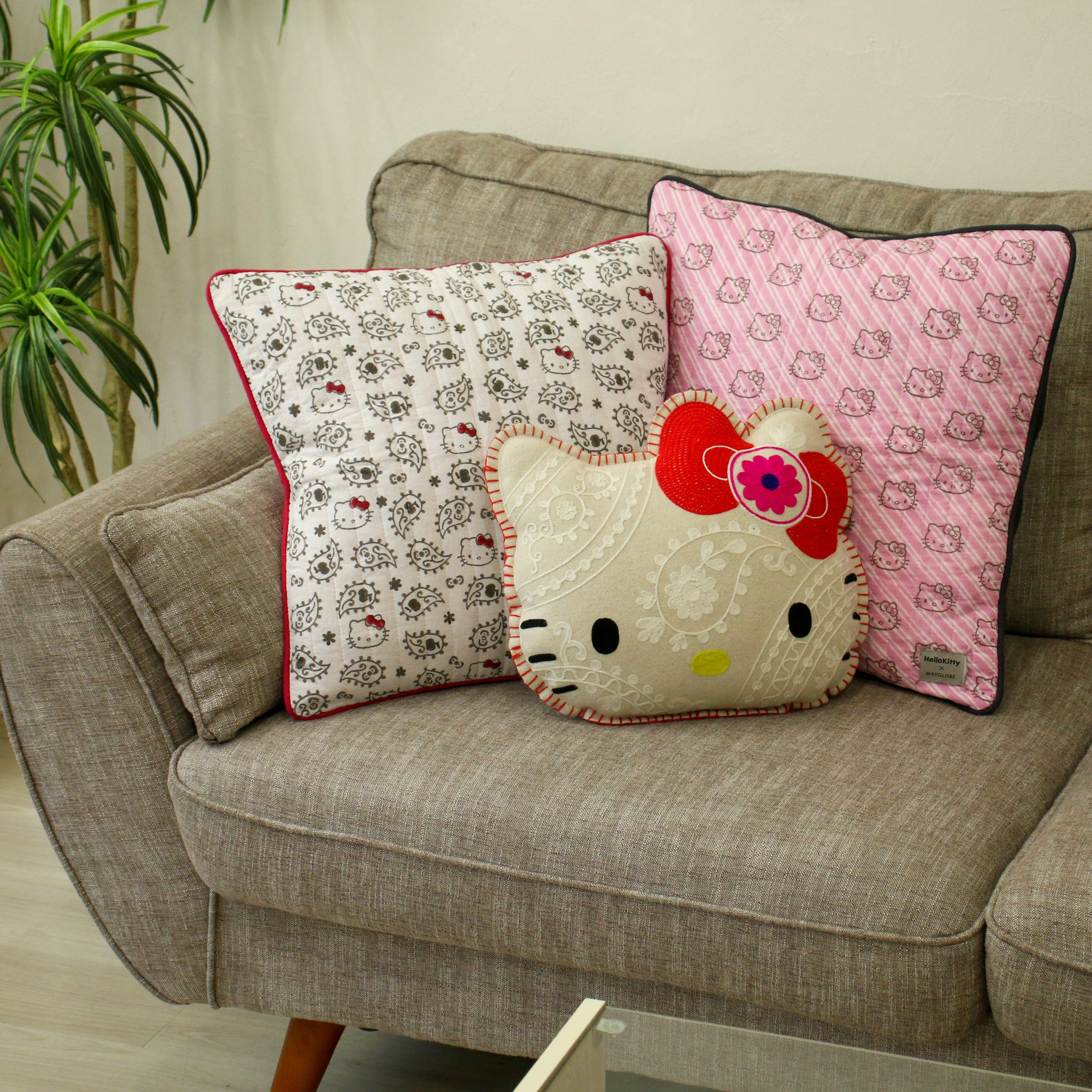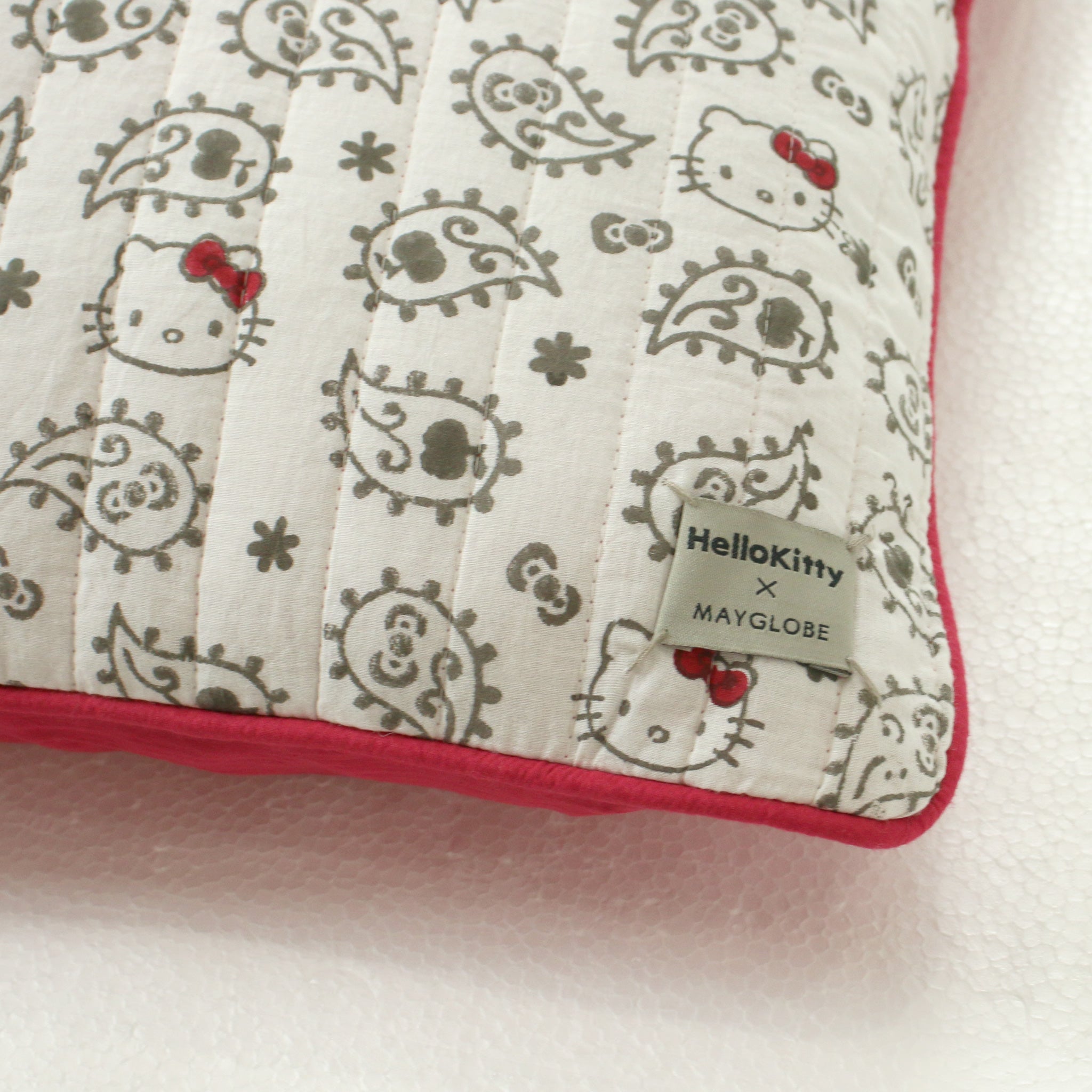 インドで起源前から語り継がれていると言われているブロックプリントという技法で作ったハローキティの生地をクッションカバーにしました。ハローキティとキルティングの柔らかい風合いがお部屋をかわいらしいくぬくもりのある雰囲気にします。