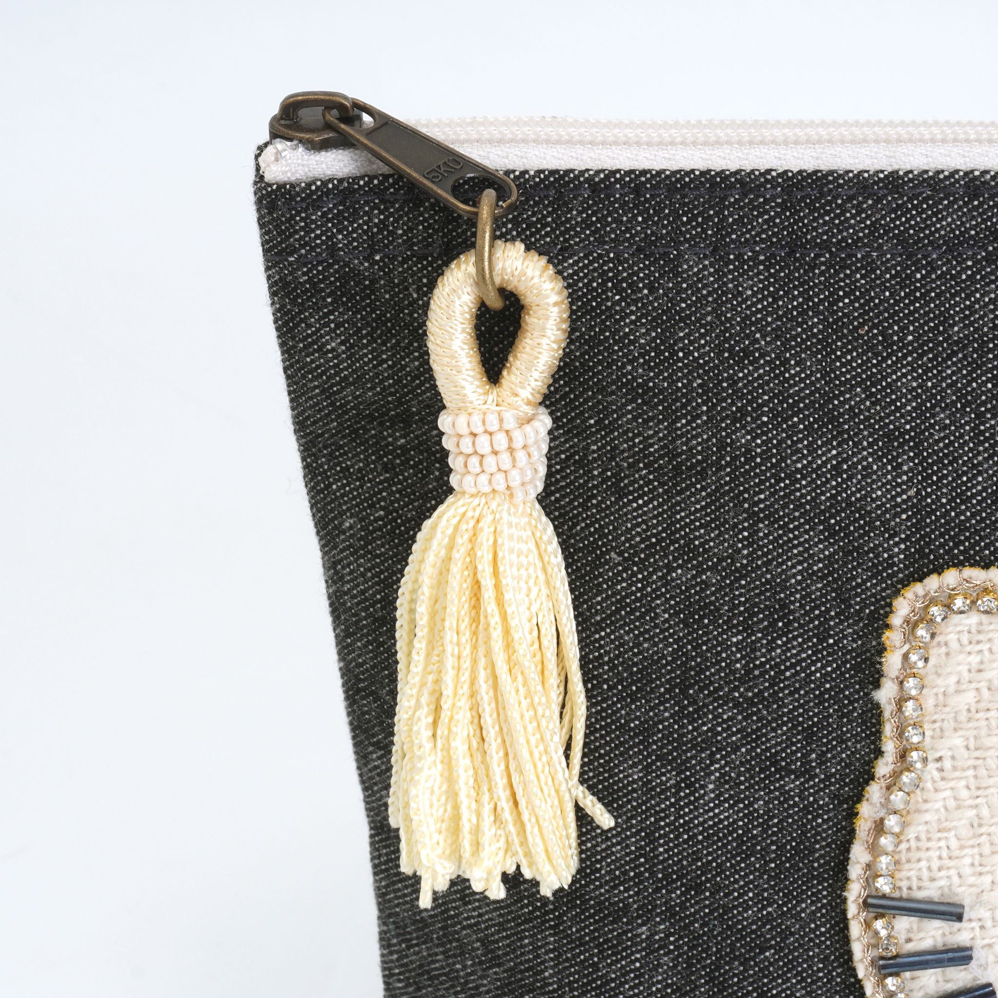 上品な艶を放つタッセルは、インドの職人による丁寧な手仕事によるもの。シンプルなデニムに優しい彩りを添え、日常使いの中にふと「ときめき」を感じられる仕上がりです。