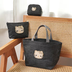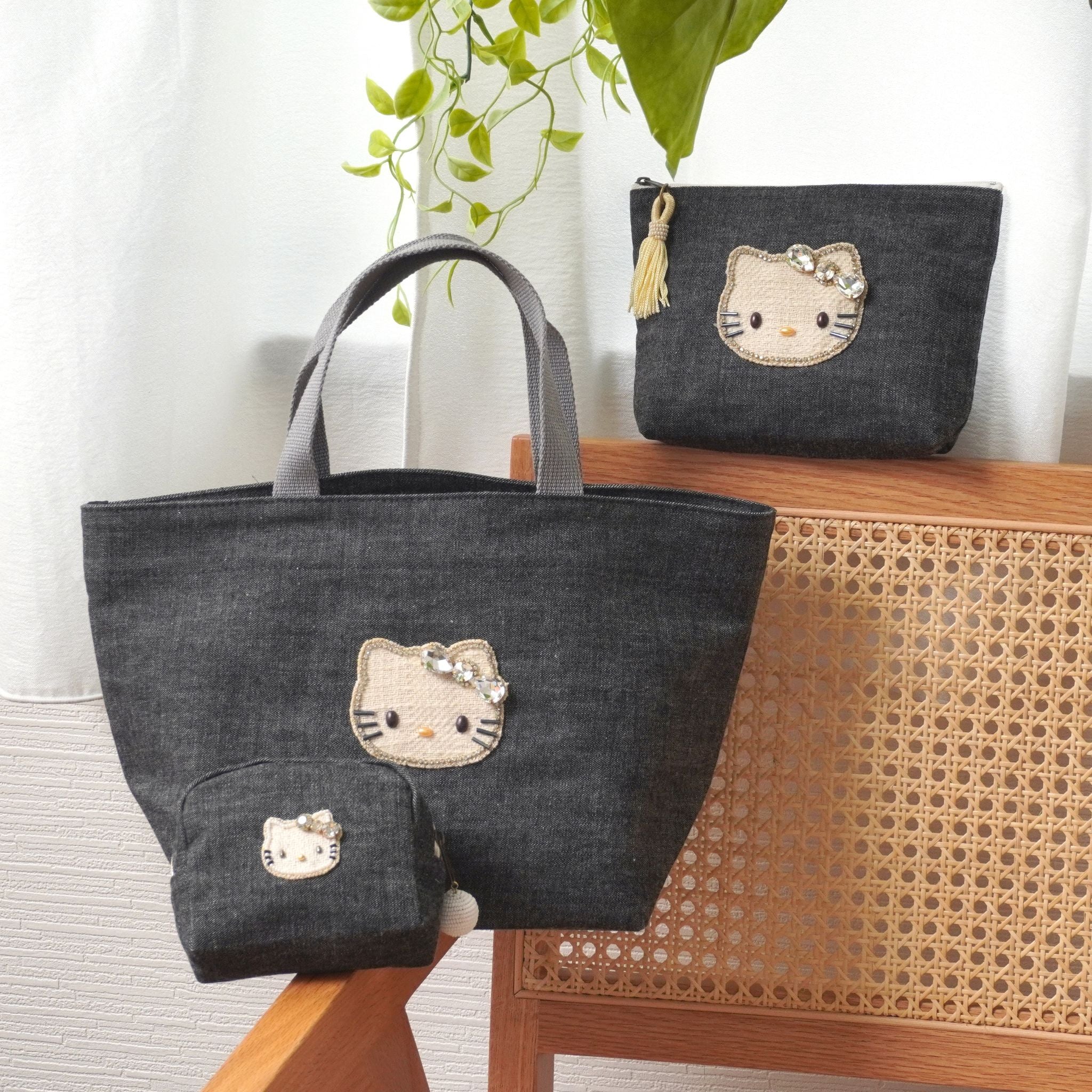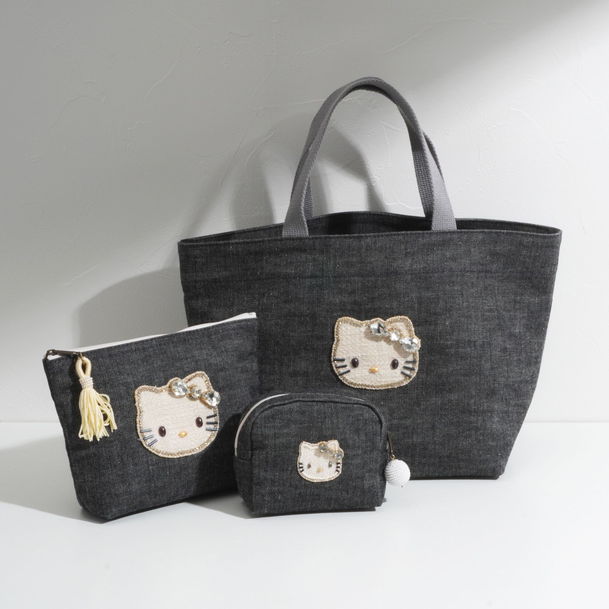 落ち着いたブラックデニムに、きらめくビジューリボンのキティが映える、大人のためのスペシャルアイテムです。バッグ・ポーチ・ミニポーチの3型展開。
