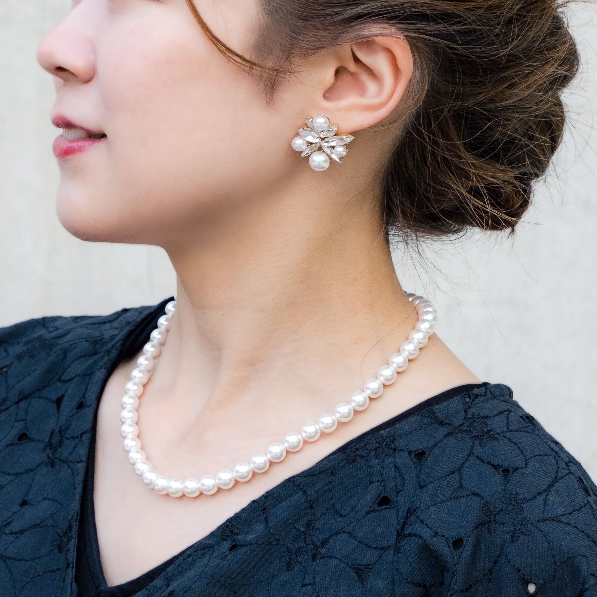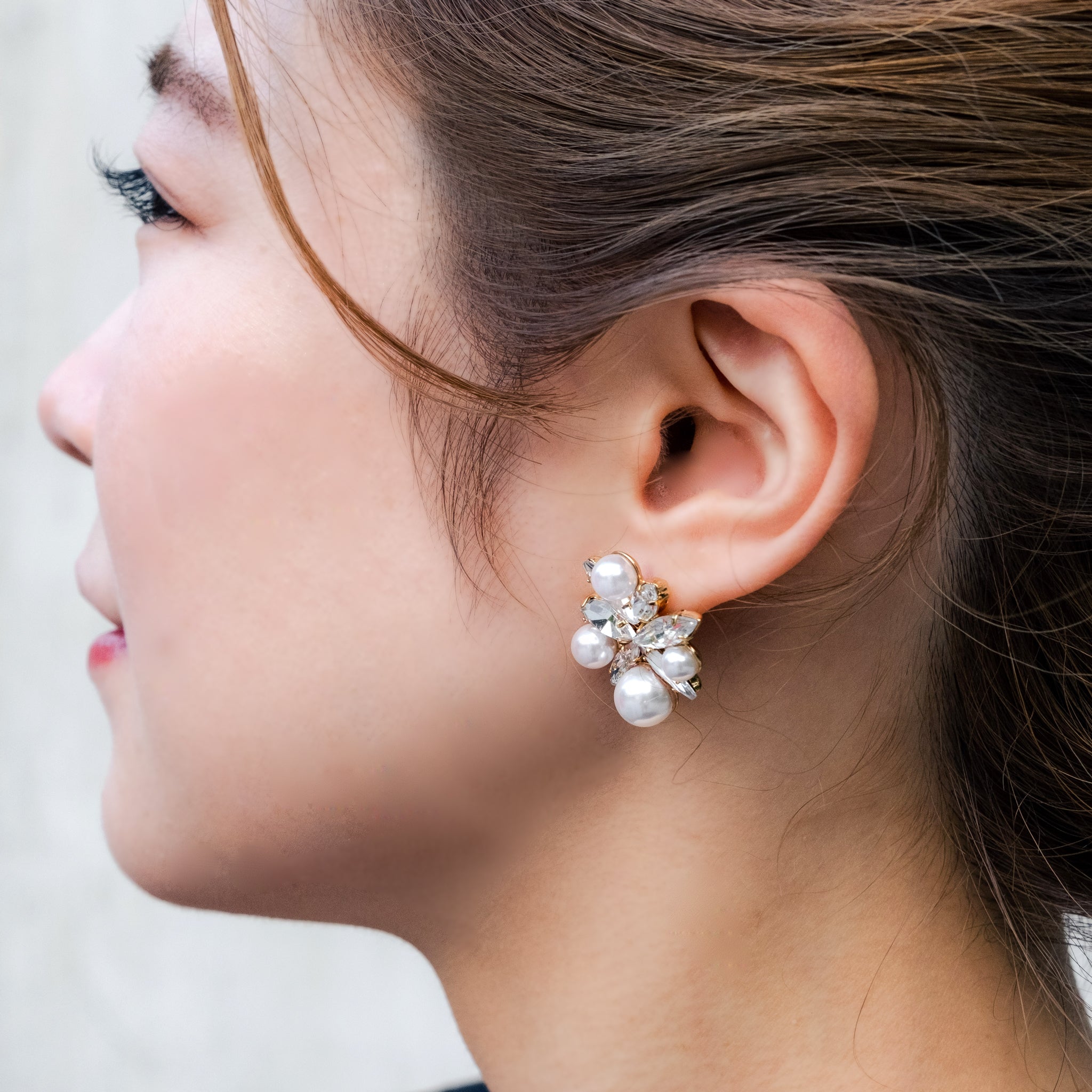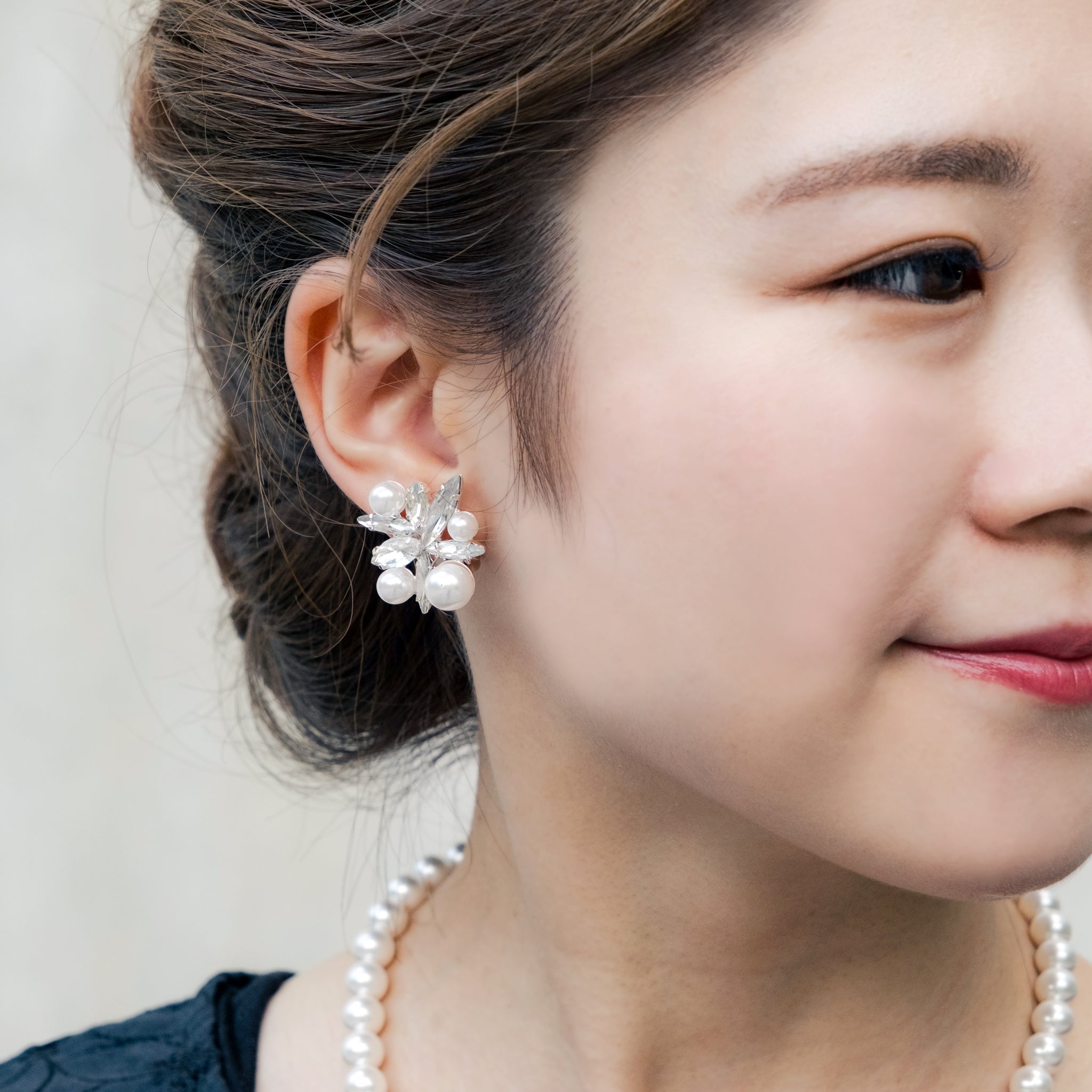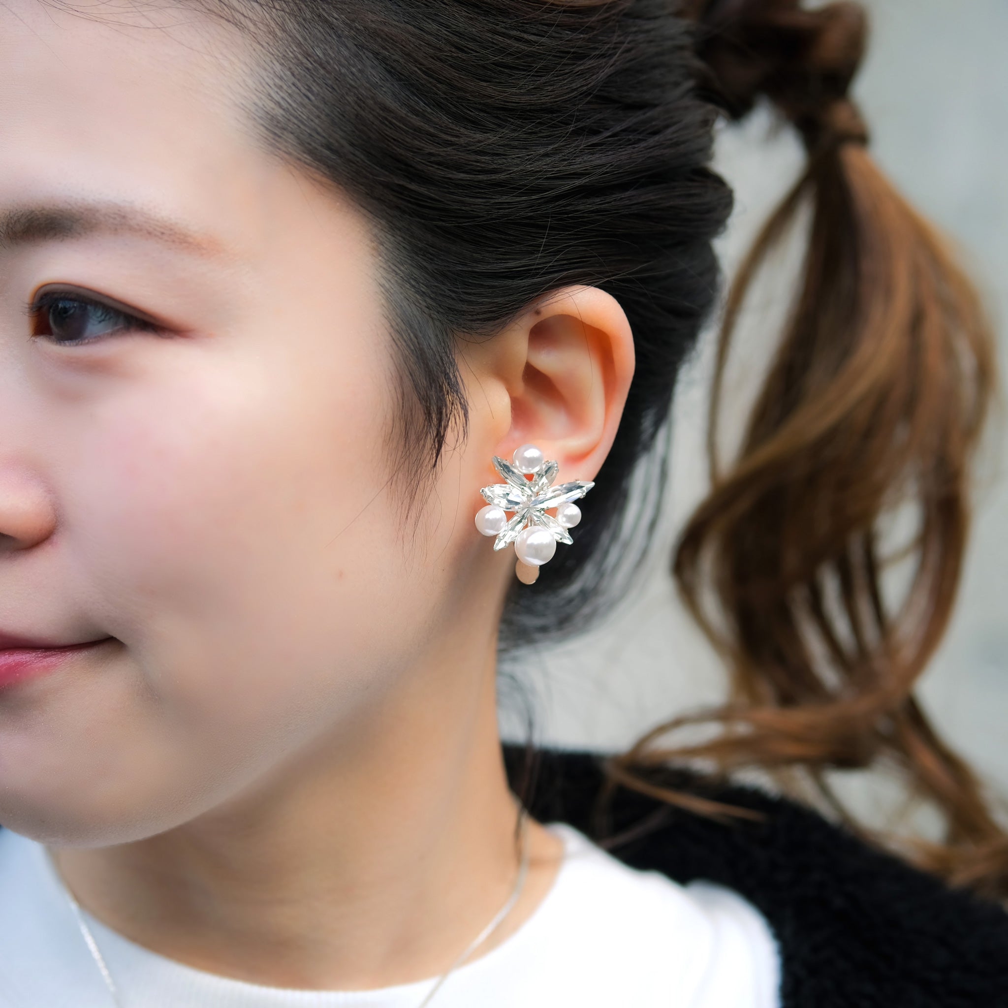 パールとカットガラスが上品な華やかさを演出し、フォーマルにもデイリーにもマッチ。写真映えも抜群。アップスタイルにも映える存在感で洗練された印象に。