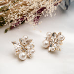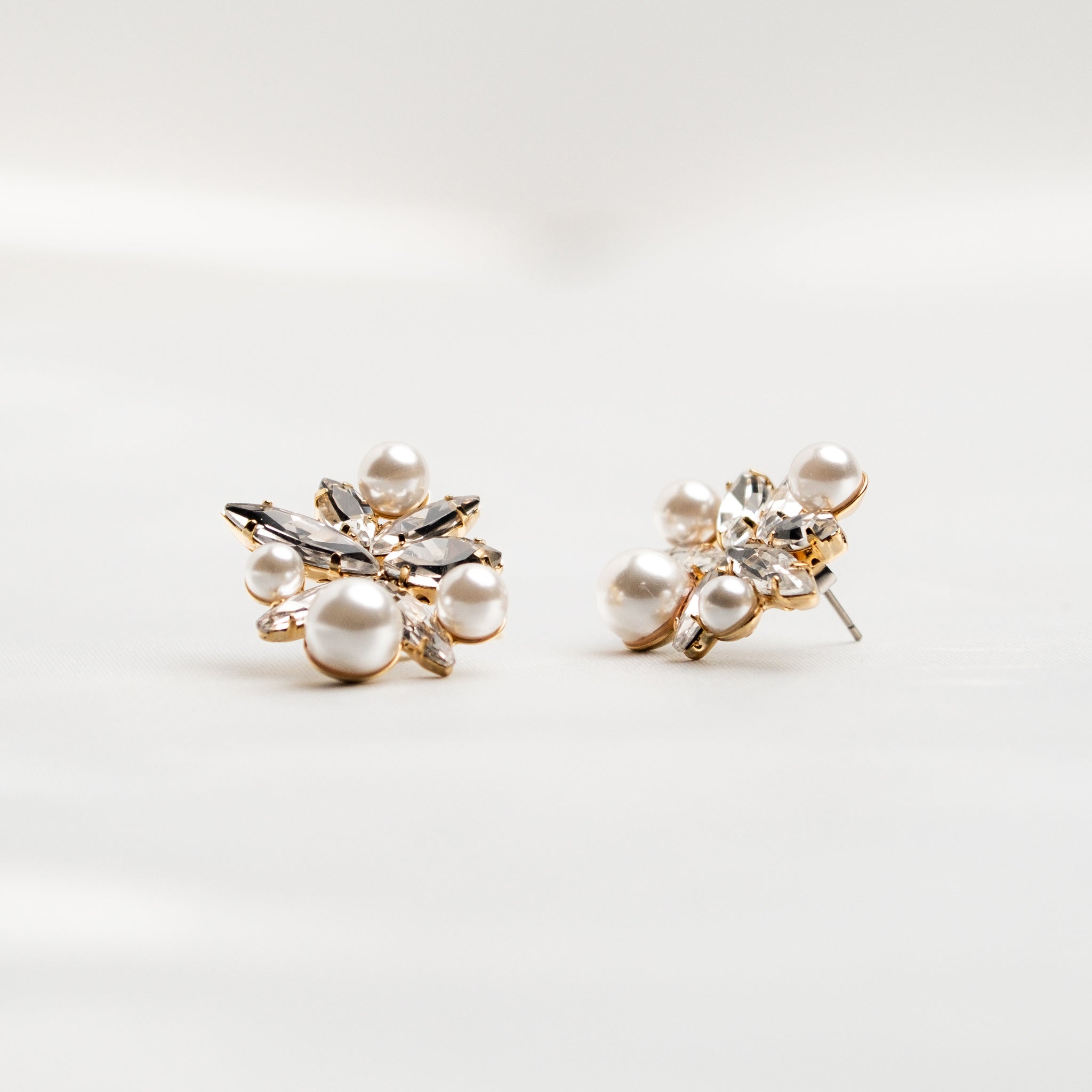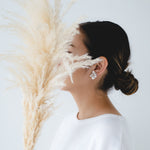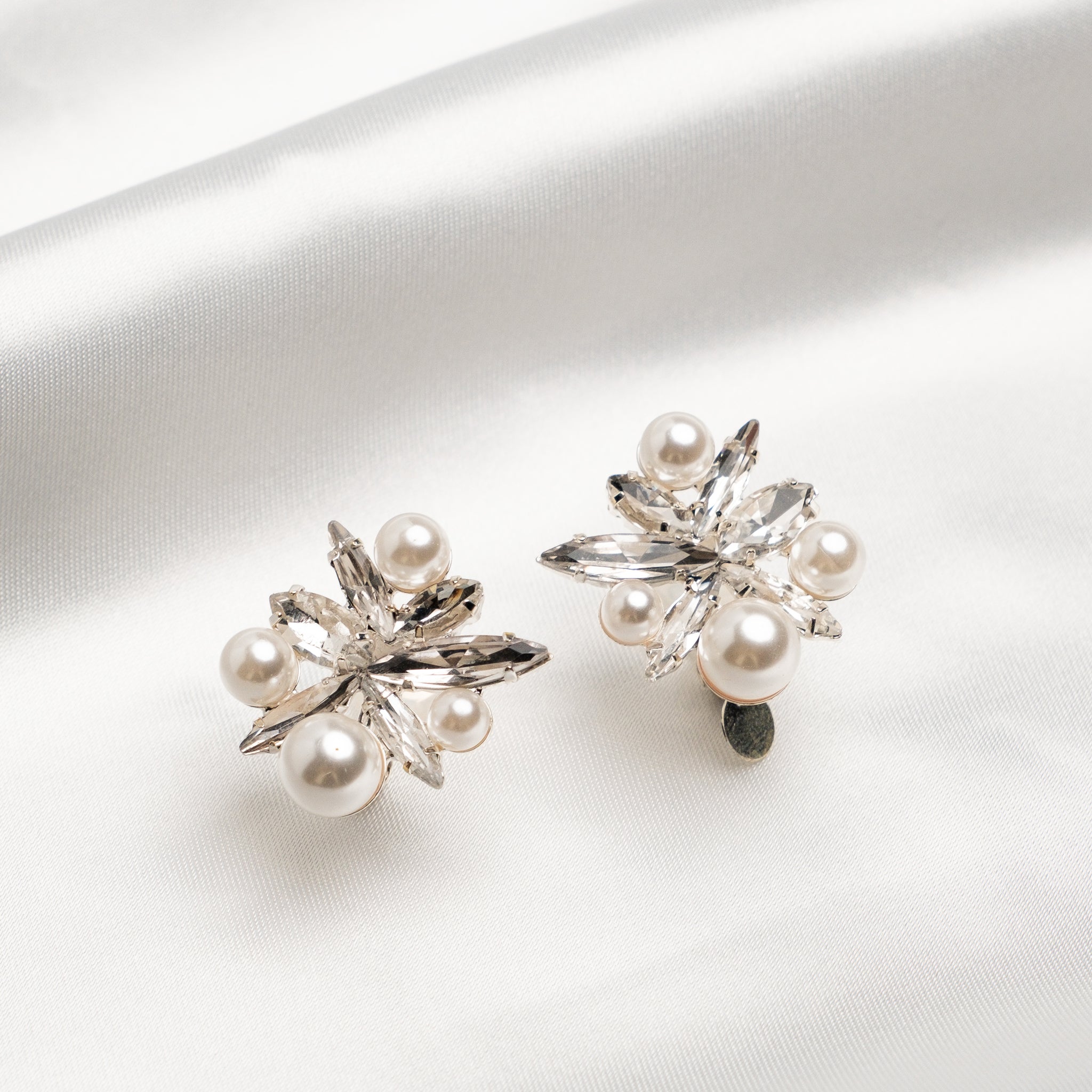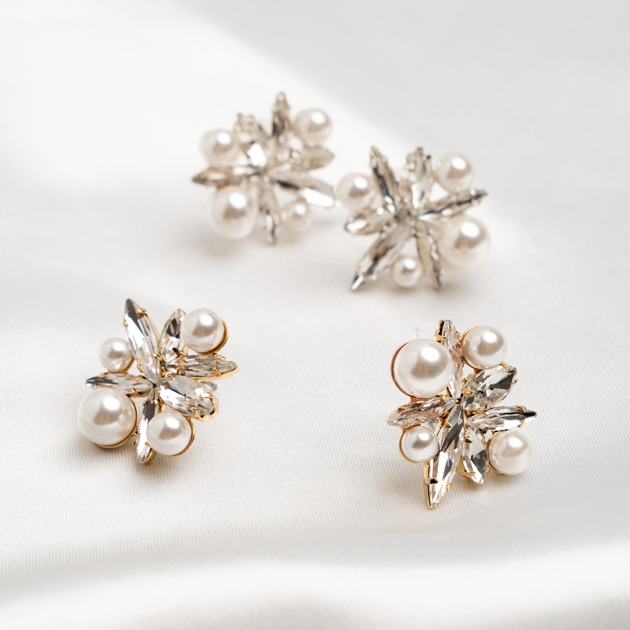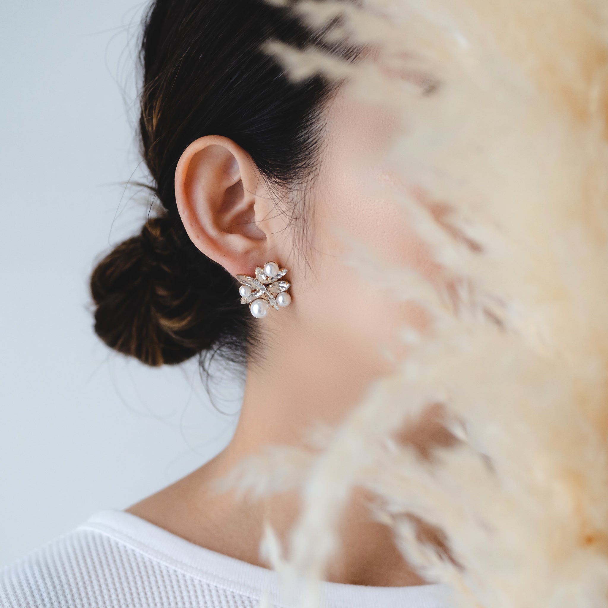 パールとカットガラスが上品な華やかさを演出し、フォーマルにもデイリーにもマッチ。写真映えも抜群。アップスタイルにも映える存在感で洗練された印象に。
