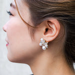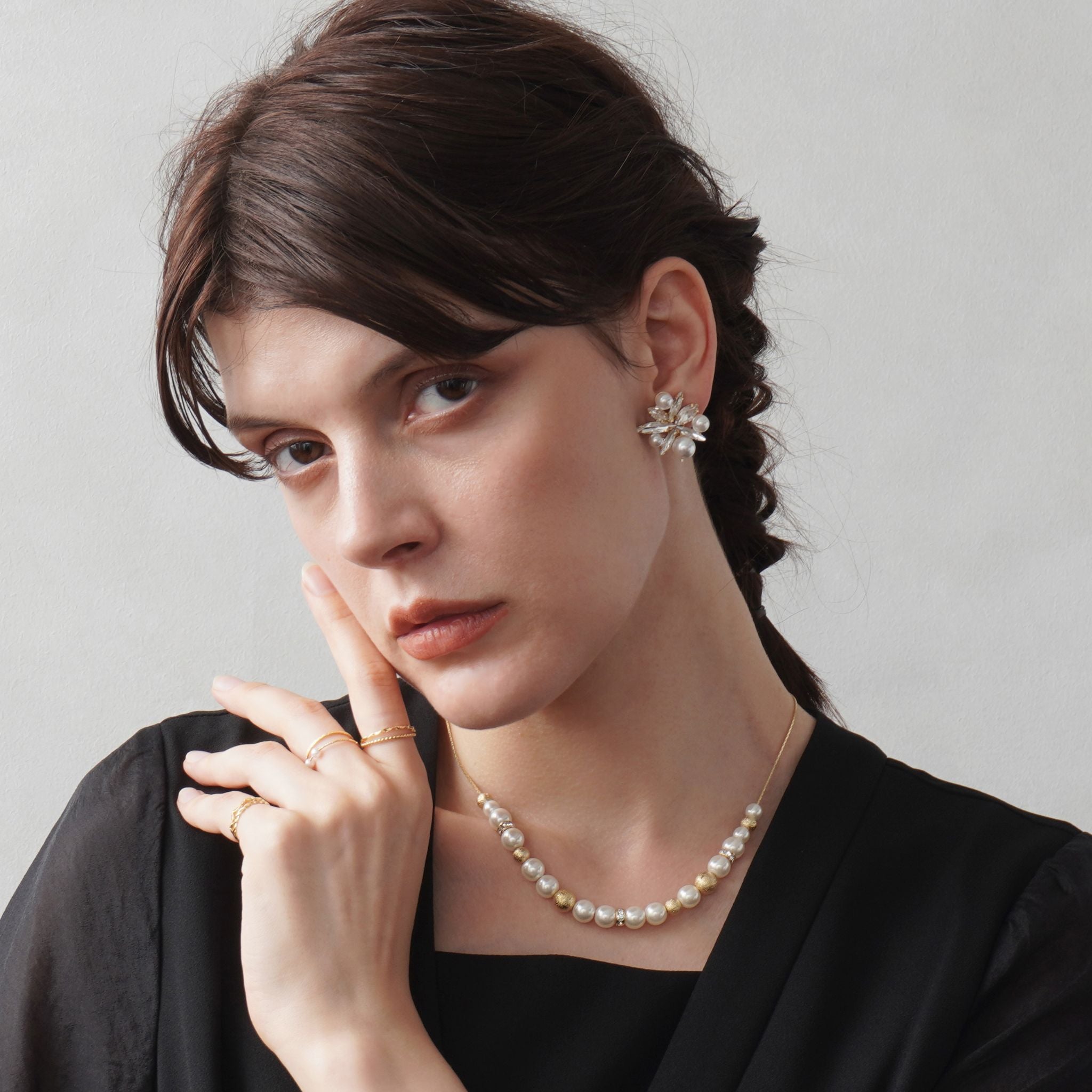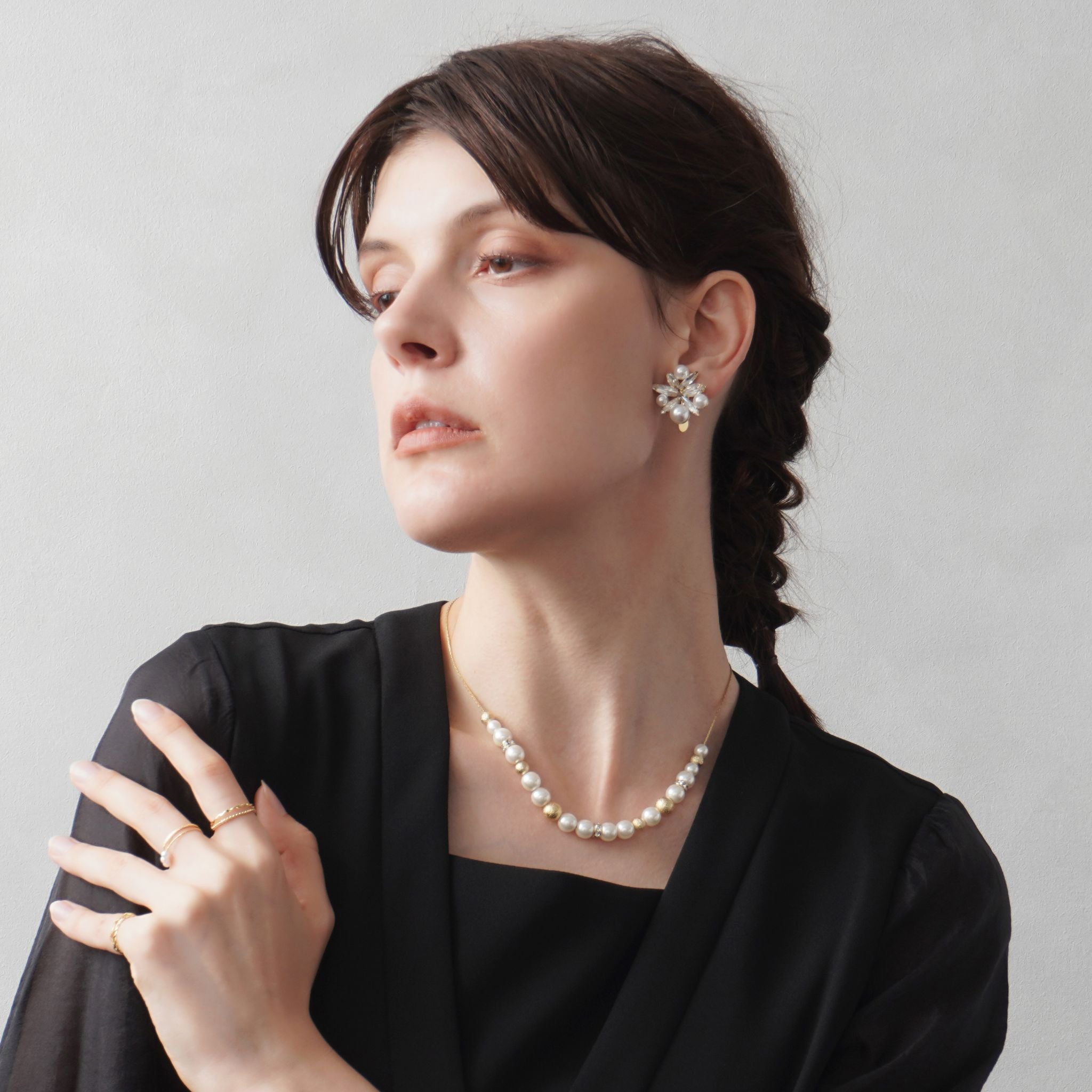 パールとカットガラスを花束のように組み合わせた、立体感あふれるイヤリング/ピアス。上品なツヤ感と程よいボリュームで、フォーマルから普段使いまで幅広く活躍します。写真に映える華やかさがありつつ、デザインは甘すぎずモダンな印象。顔まわりに光を集めることで、自然と表情を明るく見せてくれます。アップスタイルにも、髪を下ろした日にも、耳元で確かな存在感を放つアクセサリーです。