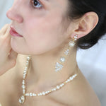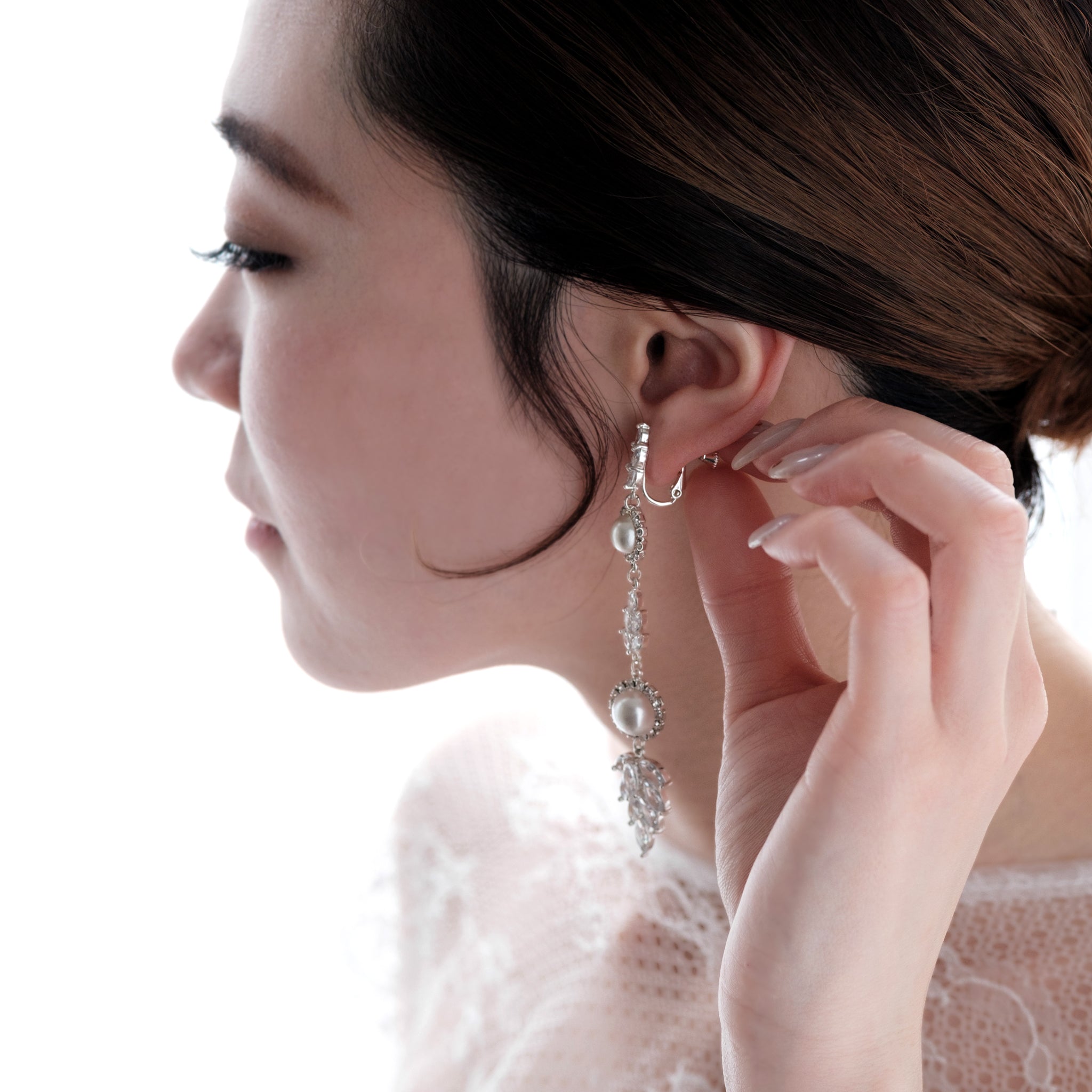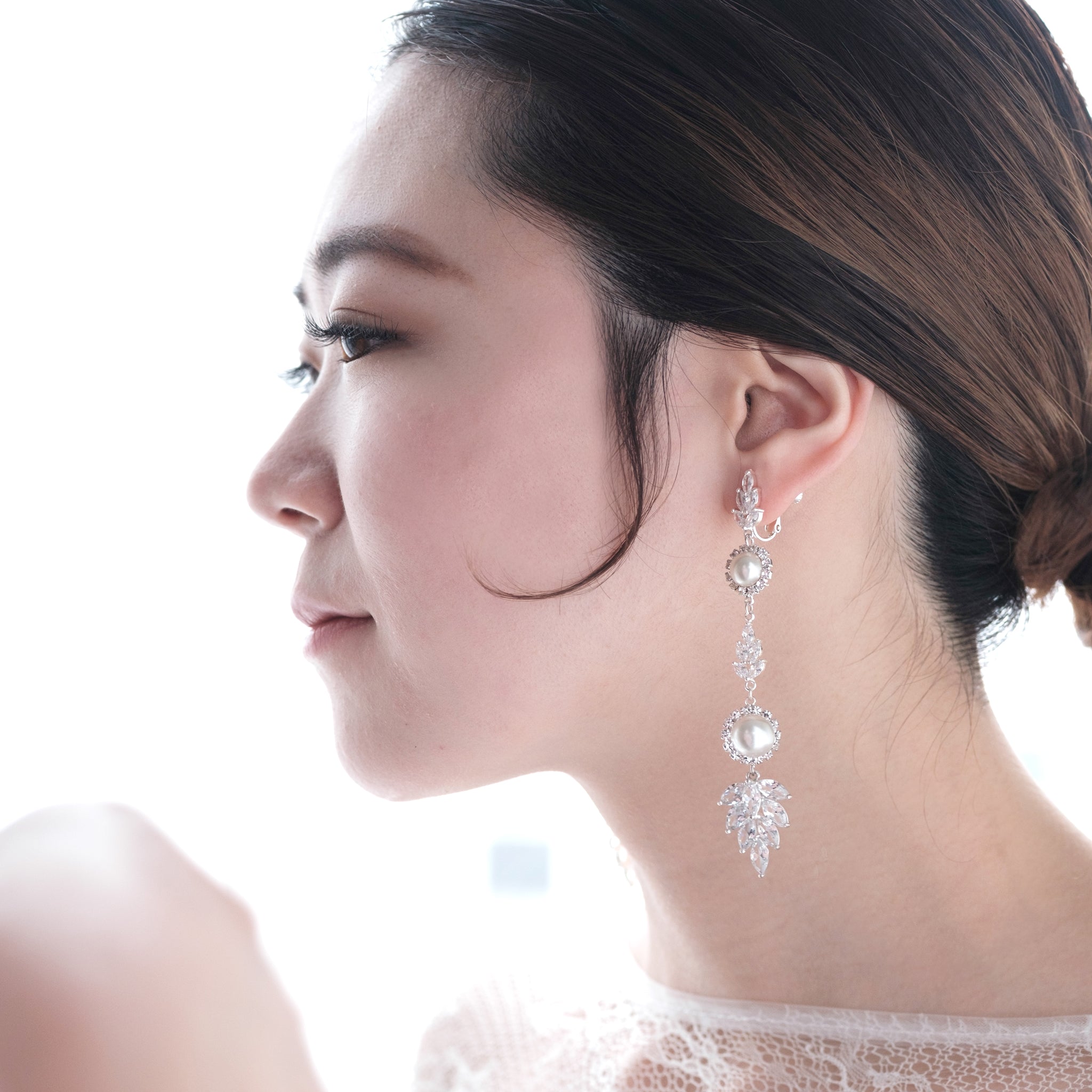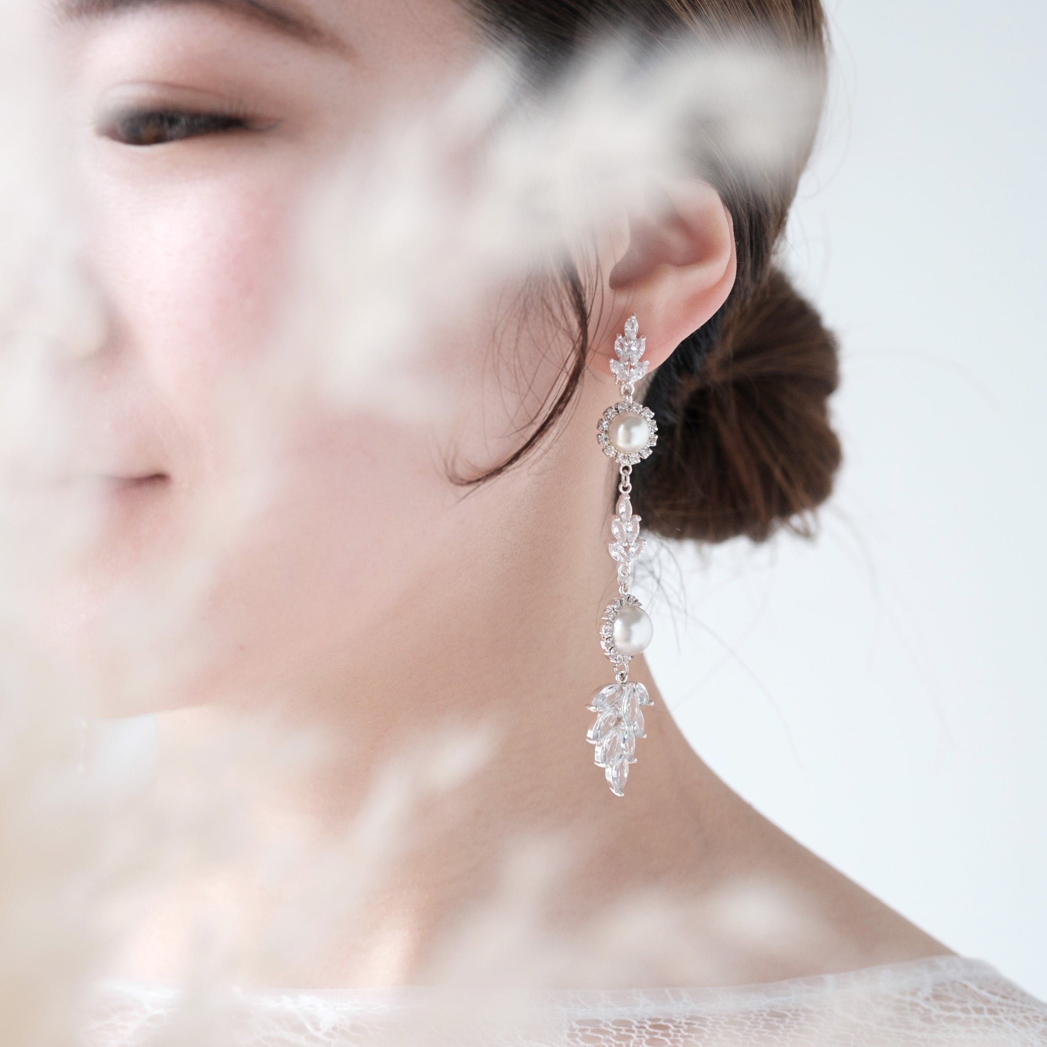 繊細なパールとクリスタルの輝きを贅沢にあしらったロングイヤリング。クラシカルなデザインに、マーキス型ストーンの集まりが上品な動きを与え、あなたの横顔をより印象的に演出します。大切な1日を、気品ある美しさで彩ります。