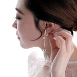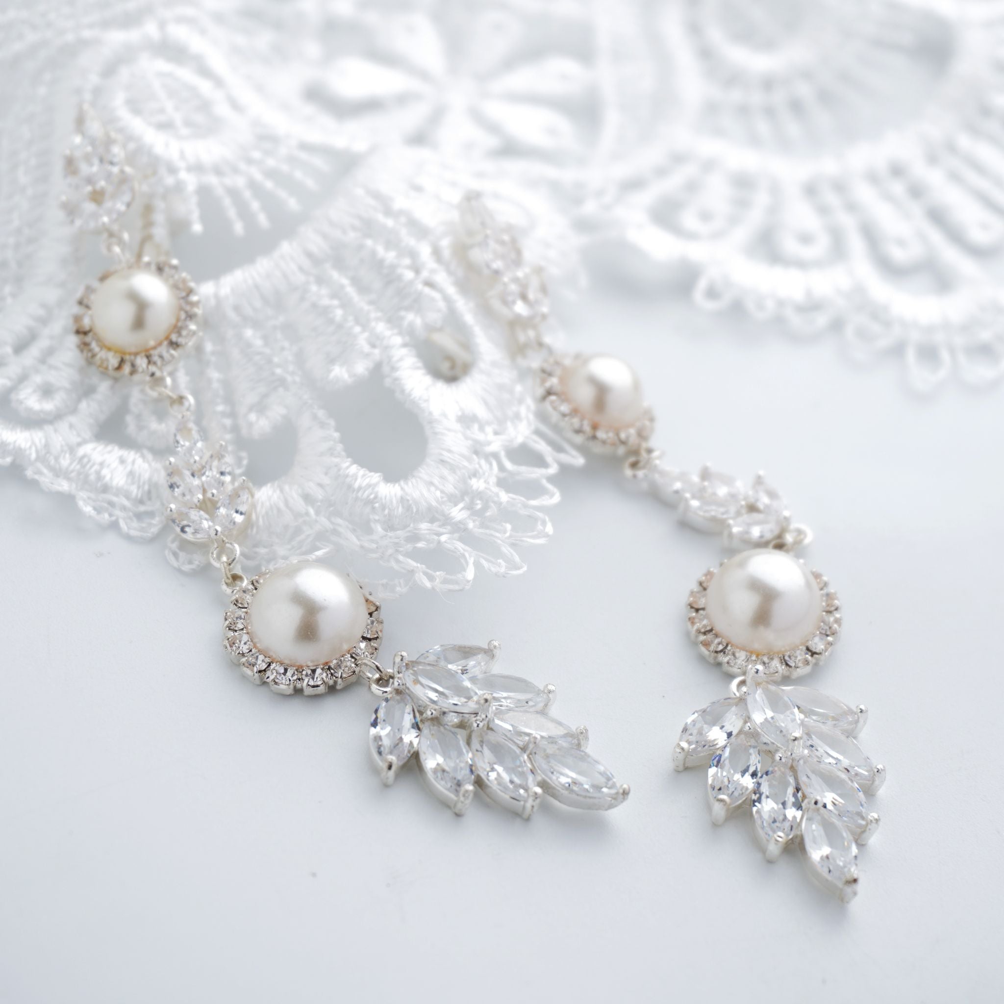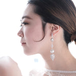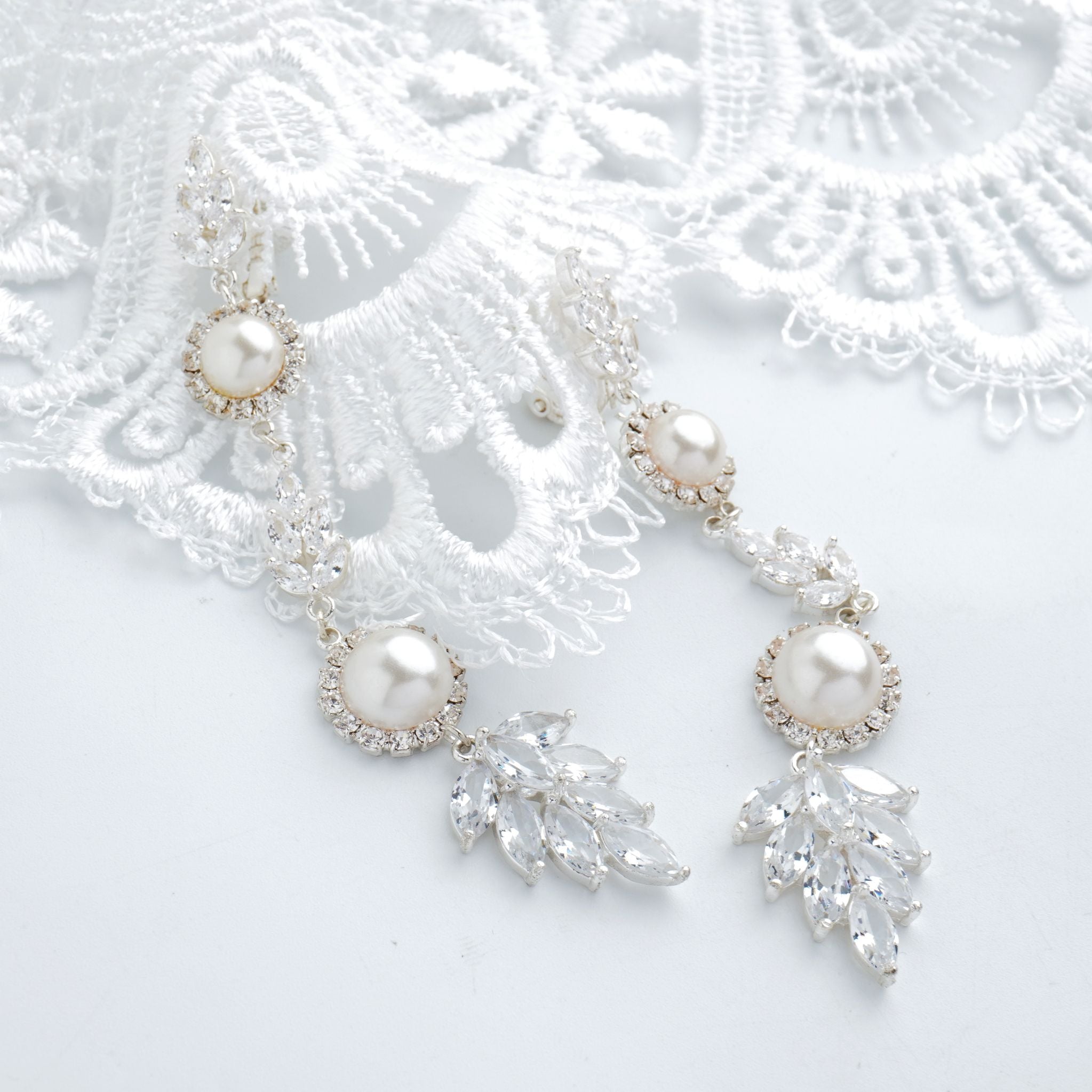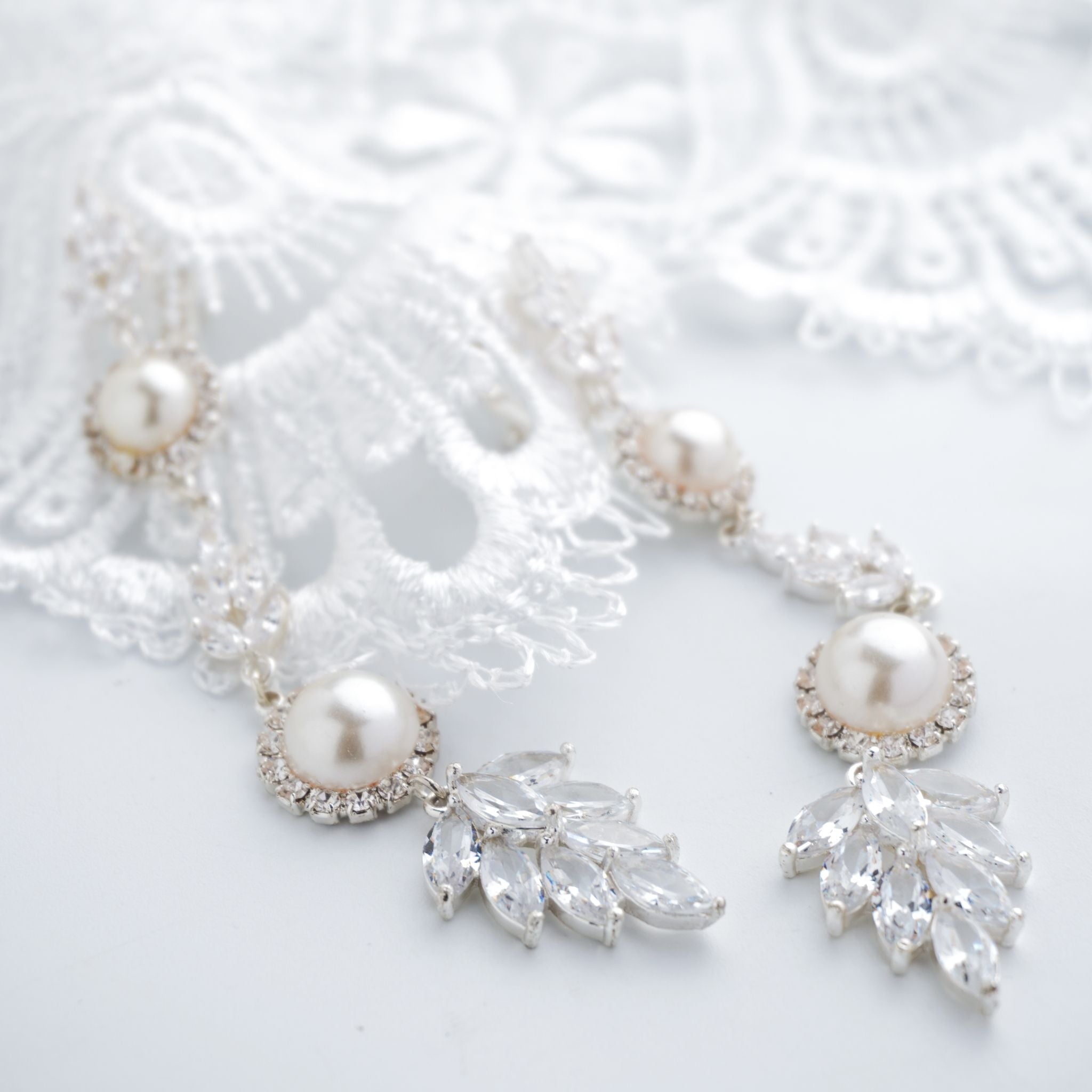 繊細なパールとクリスタルの輝きを贅沢にあしらったロングイヤリング。クラシカルなデザインに、マーキス型ストーンの集まりが上品な動きを与え、あなたの横顔をより印象的に演出します。大切な1日を、気品ある美しさで彩ります。