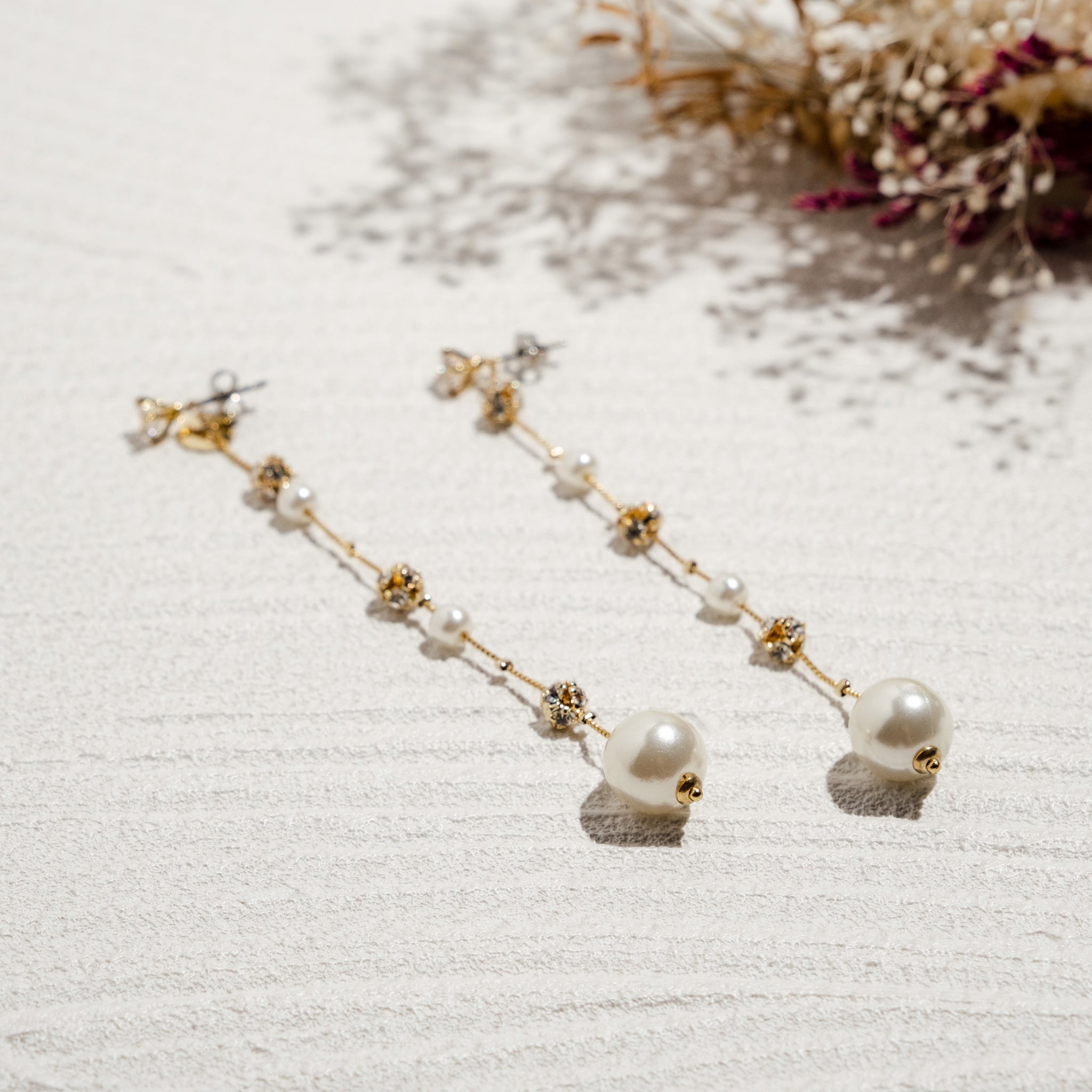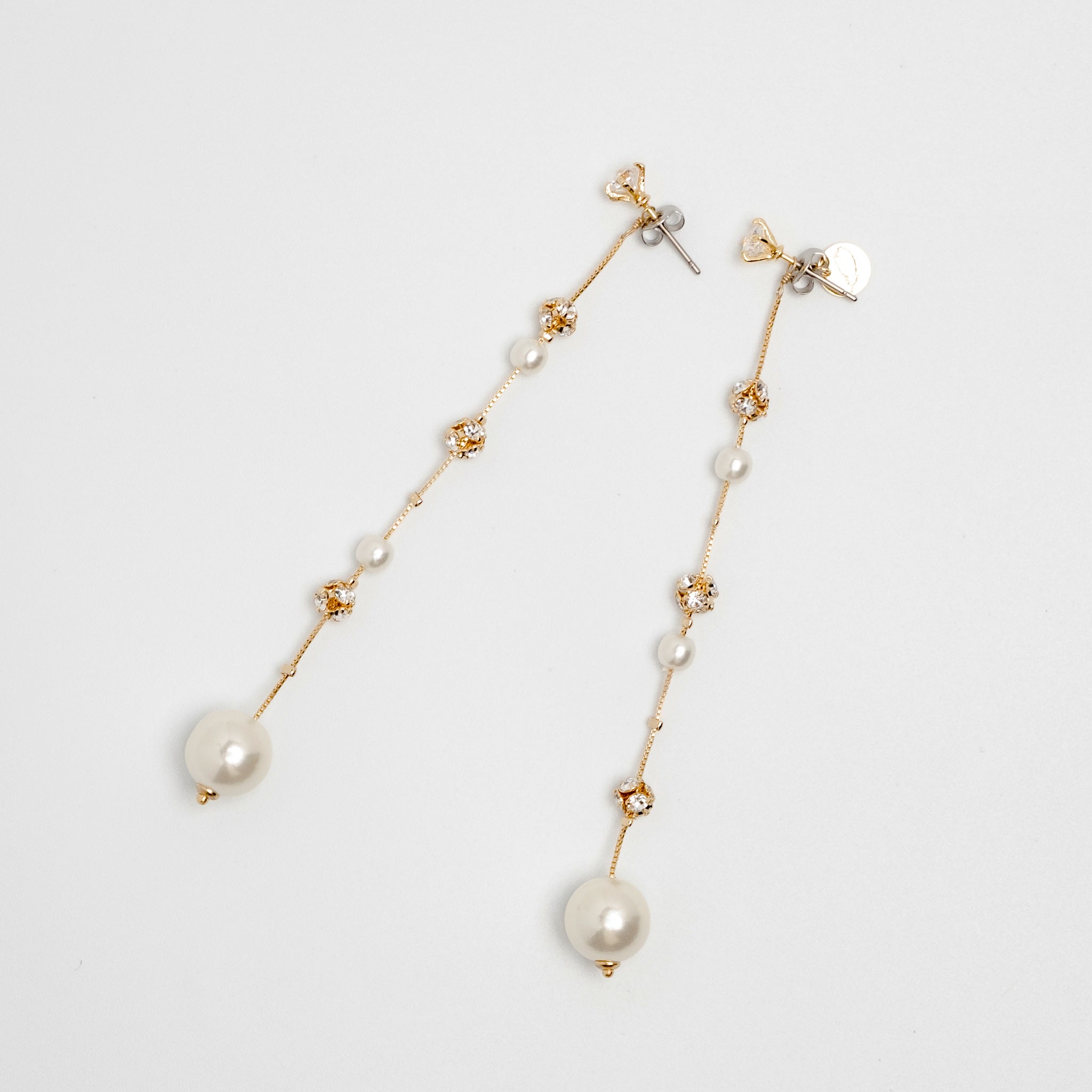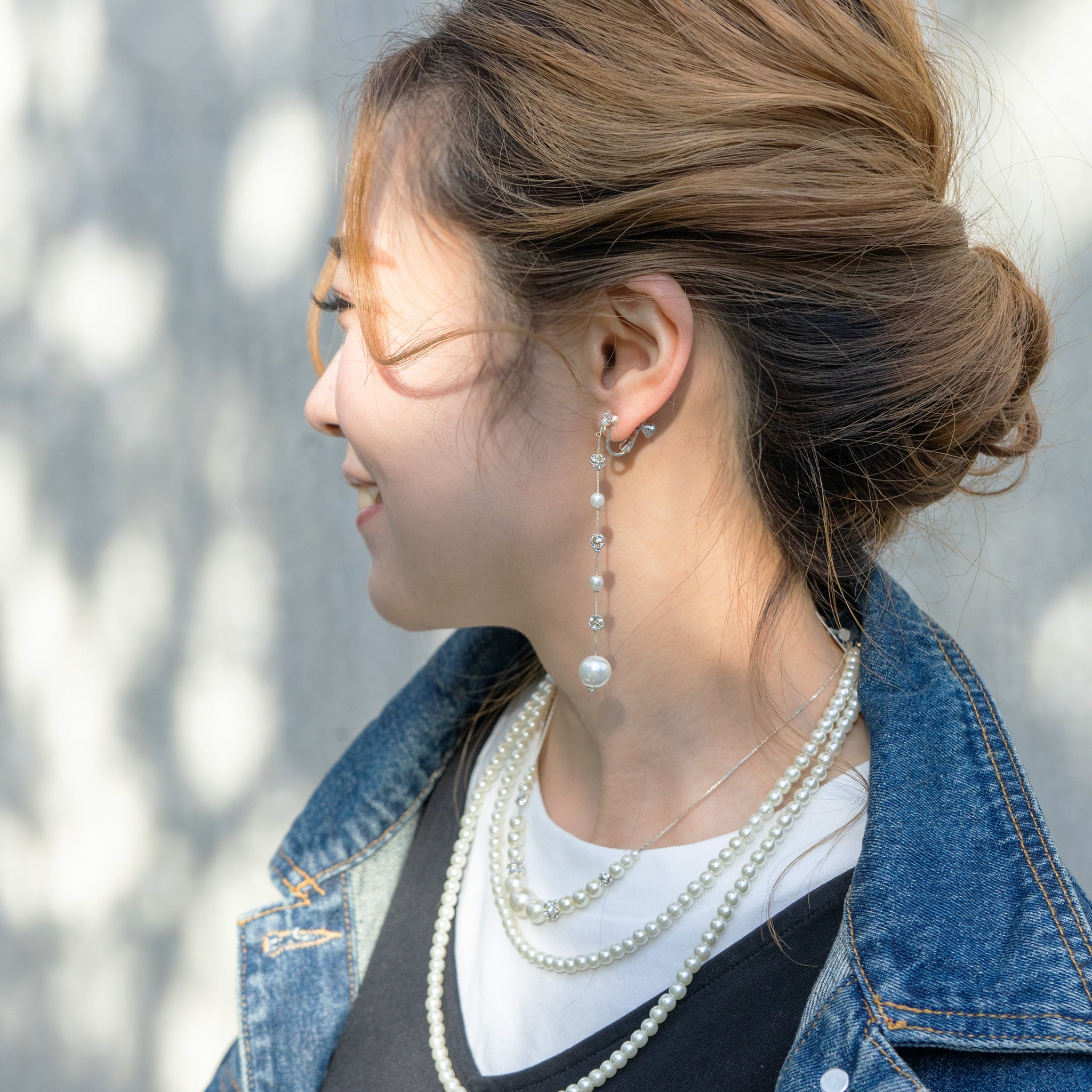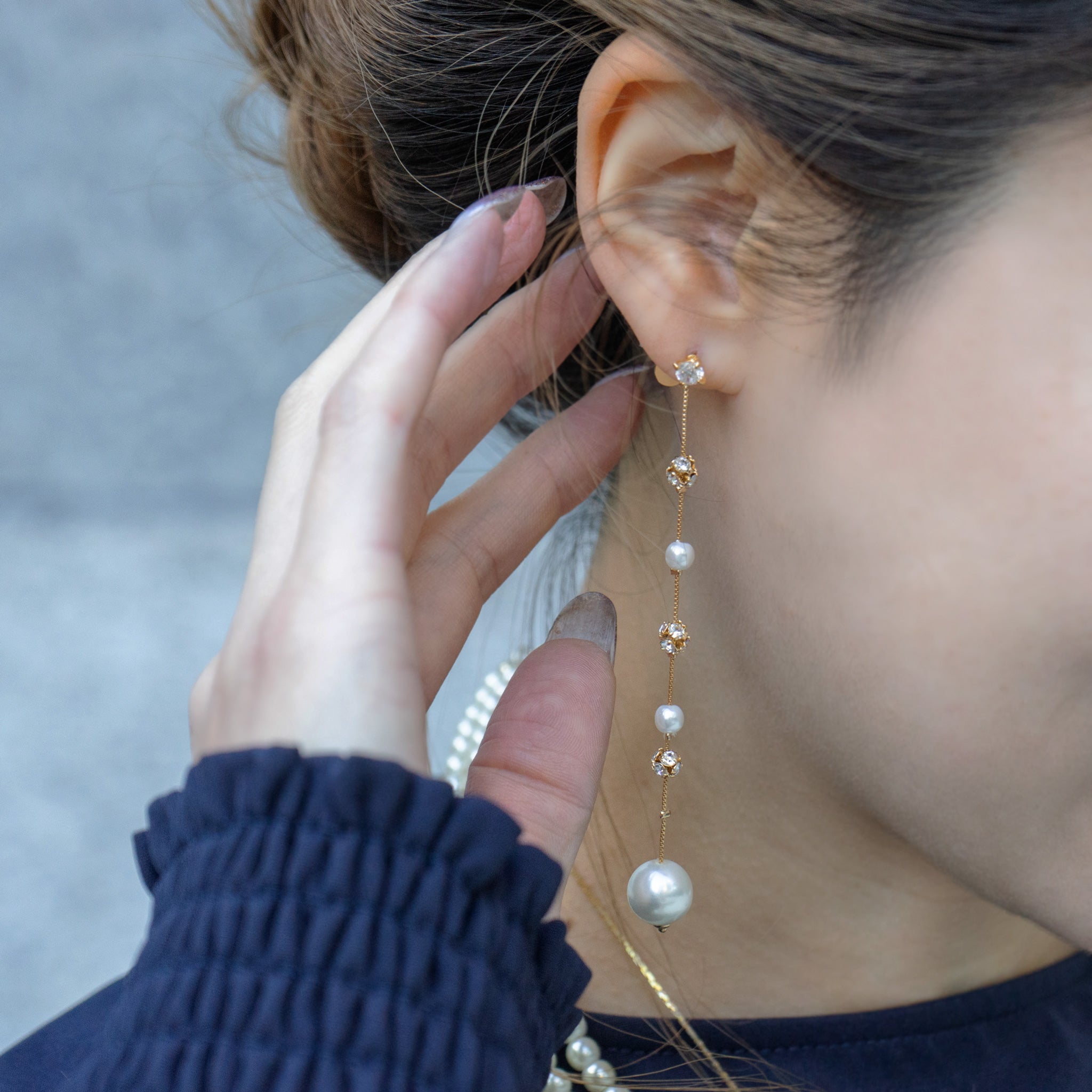 繊細なパールとビジューを連ねた、女性らしい表情を引き立ててくれるロングピアス / イヤリング。軽やかに揺れるシルエットが、顔まわりをやさしく華やかに演出してくれます。パールの柔らかい光沢と、ビジューの透明感ある輝きが絶妙なバランスで溶け合い、上品ながらも印象的な耳もとに仕上がります。清楚さと華やかさを兼ね備えた、洗練された大人のためのアクセサリーです。
