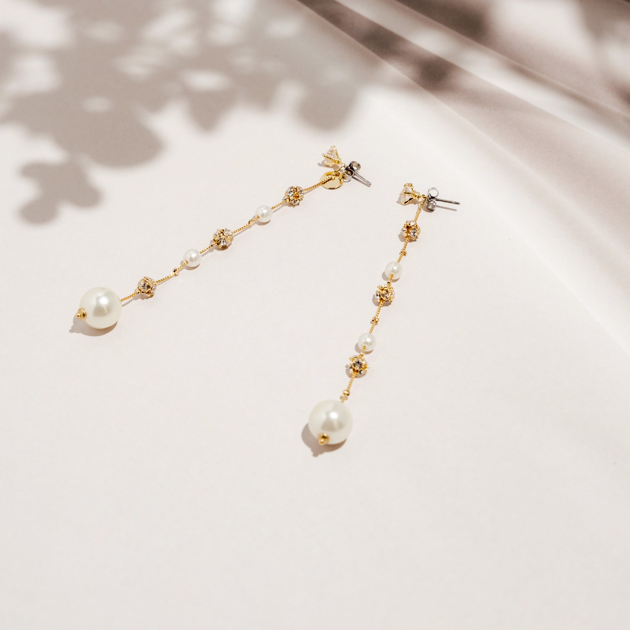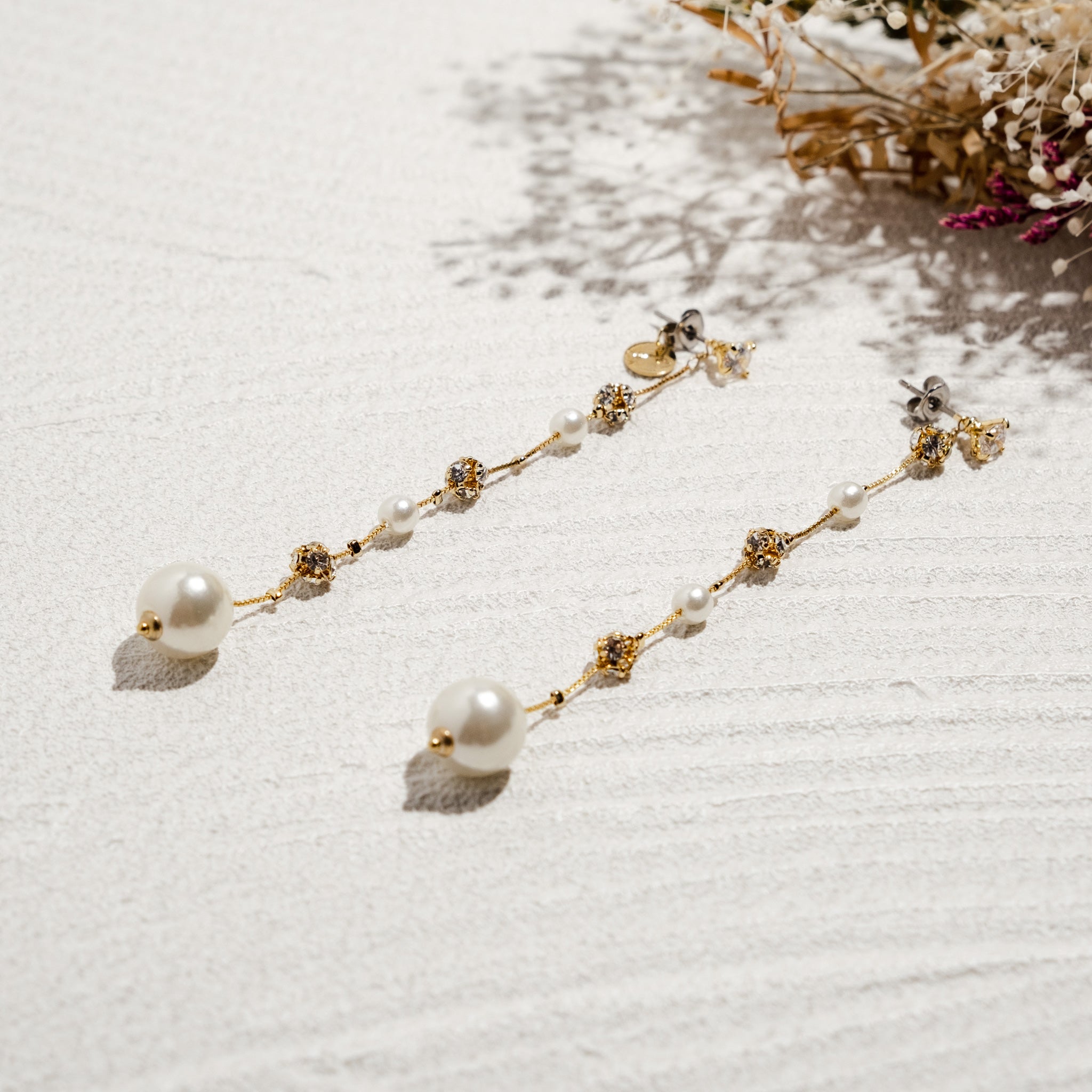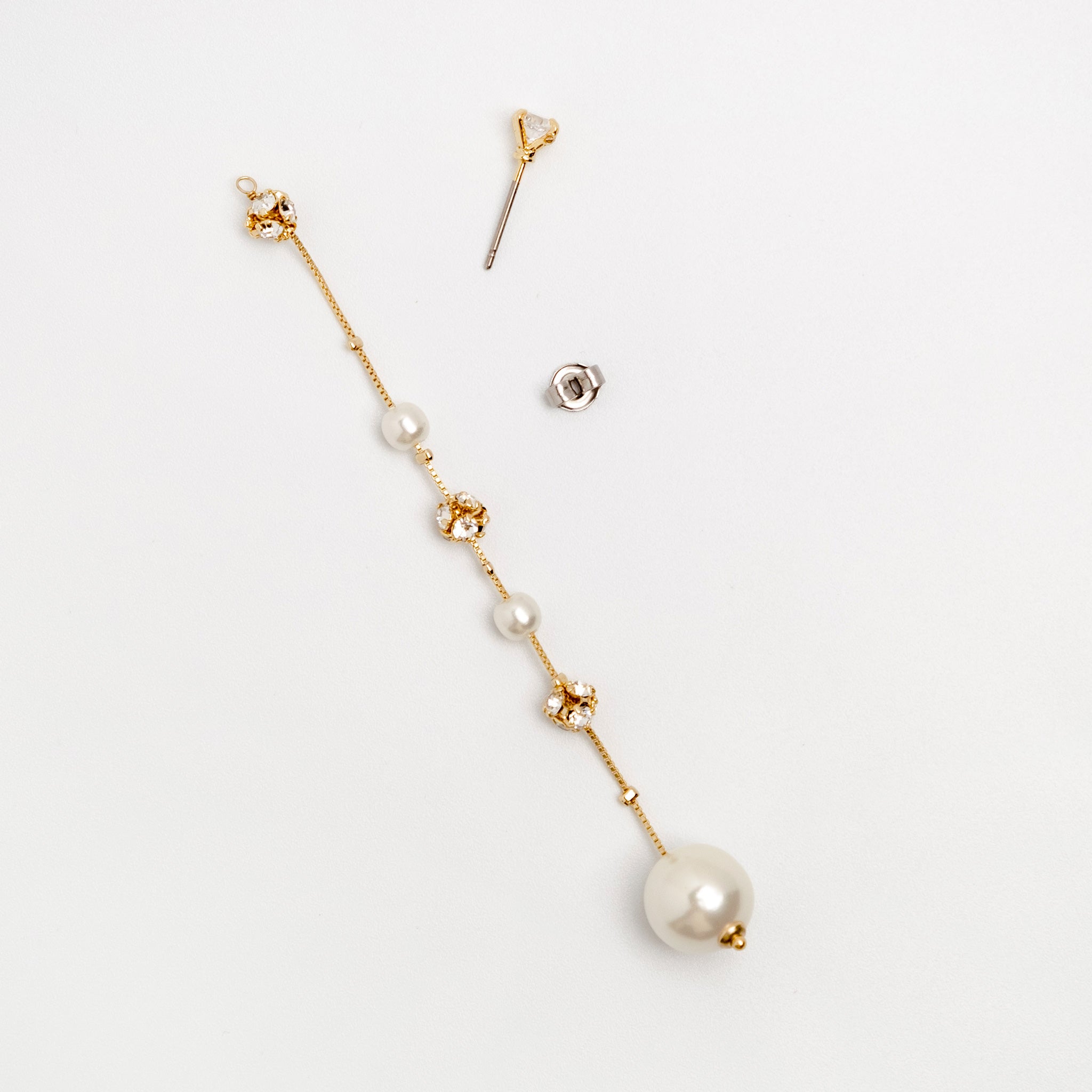 繊細なパールとビジューを連ねた、女性らしい表情を引き立ててくれるロングピアス / イヤリング。軽やかに揺れるシルエットが、顔まわりをやさしく華やかに演出してくれます。パールの柔らかい光沢と、ビジューの透明感ある輝きが絶妙なバランスで溶け合い、上品ながらも印象的な耳もとに仕上がります。清楚さと華やかさを兼ね備えた、洗練された大人のためのアクセサリーです。