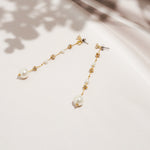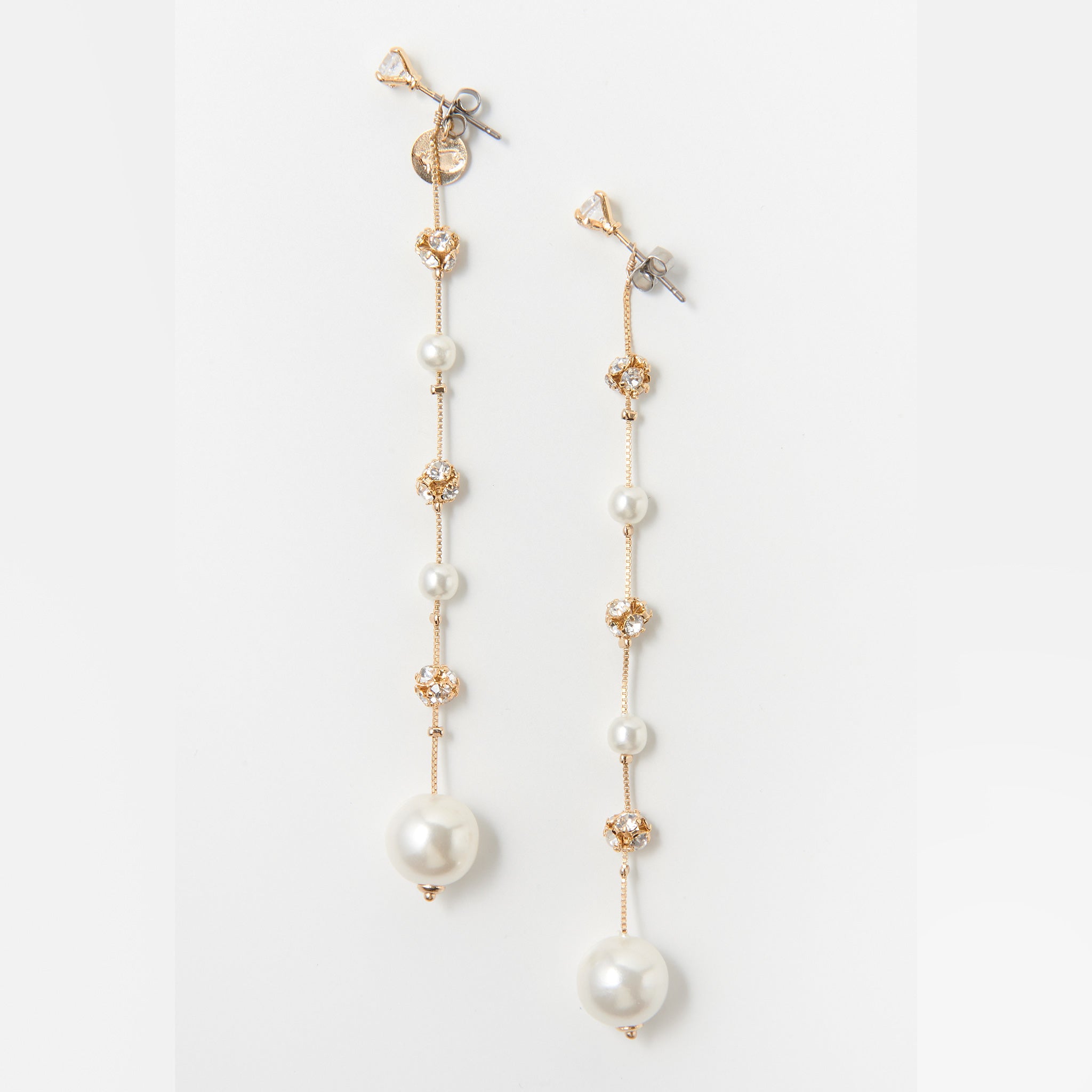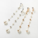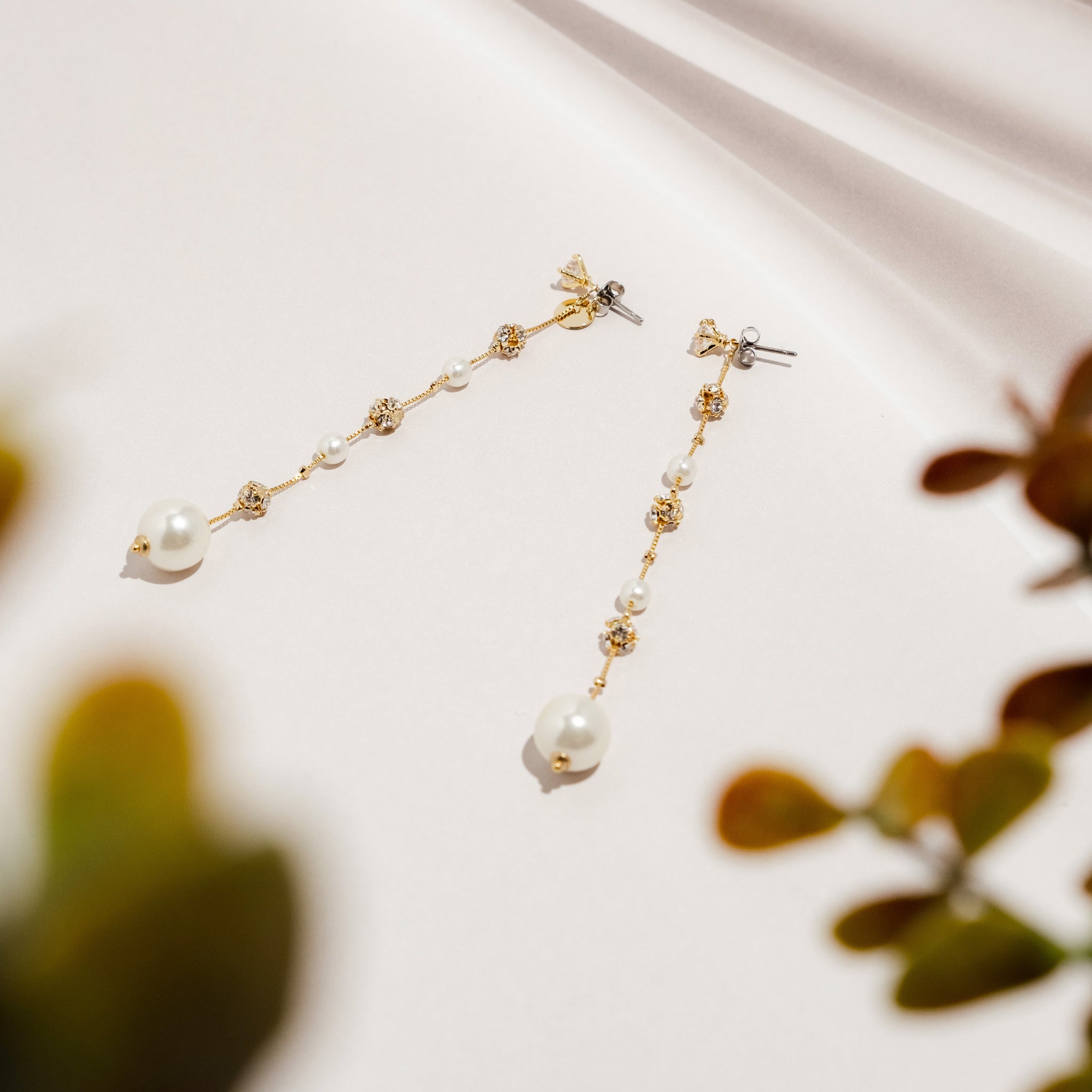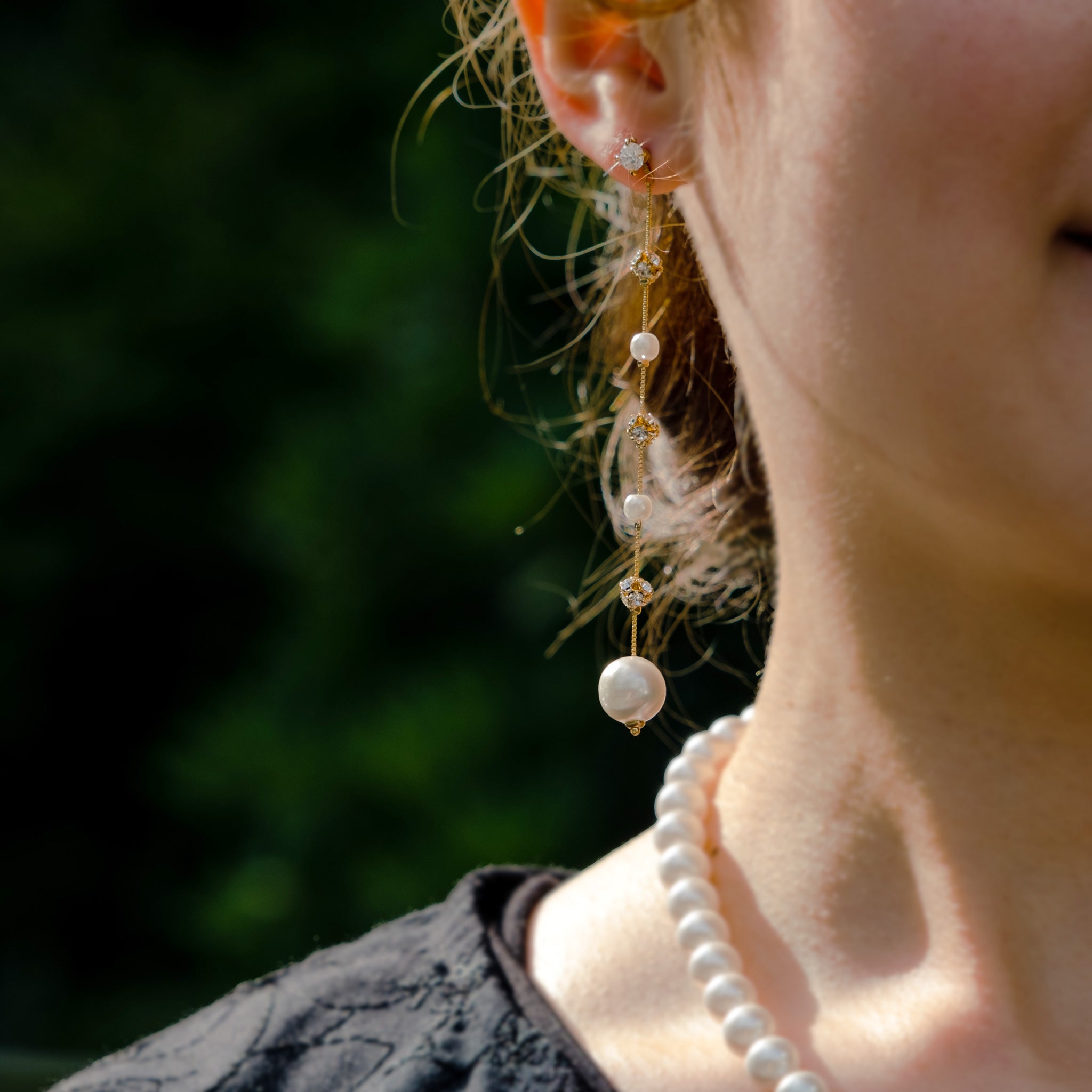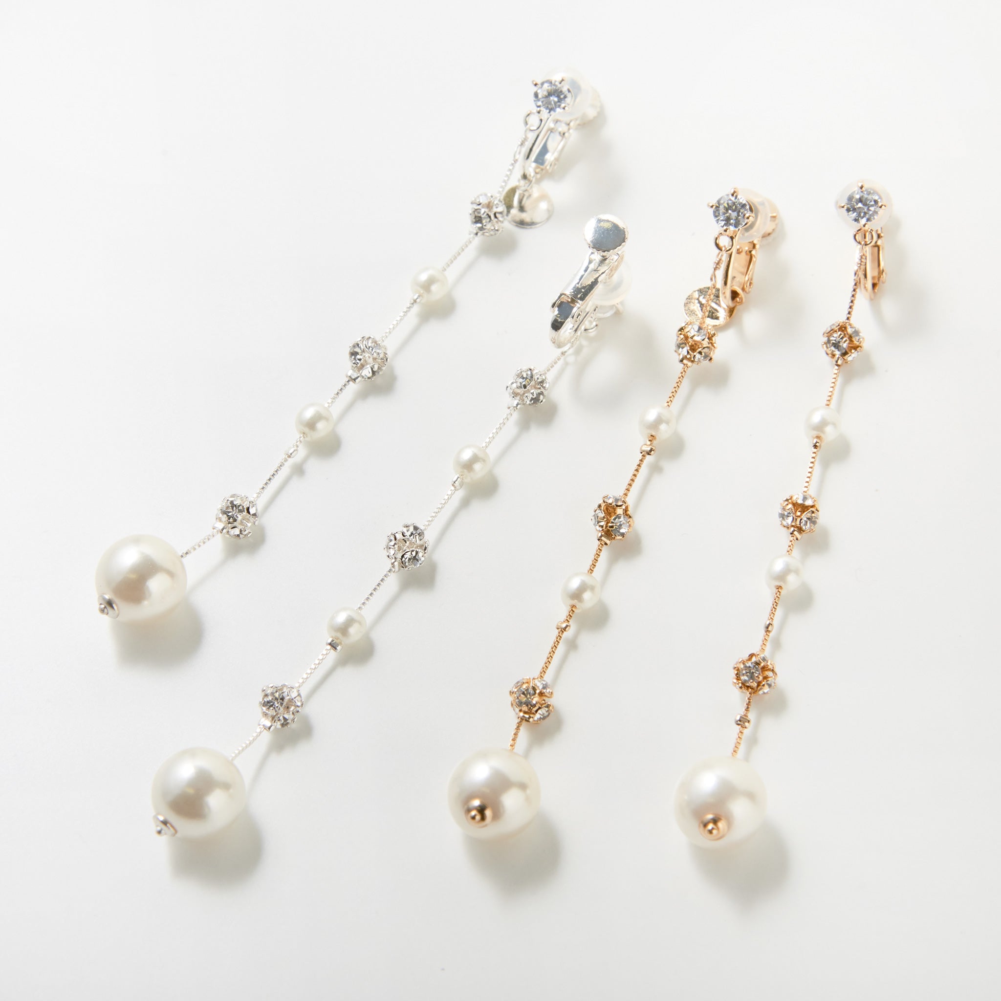繊細なパールとビジューを連ねた、女性らしい表情を引き立ててくれるロングピアス / イヤリング。軽やかに揺れるシルエットが、顔まわりをやさしく華やかに演出してくれます。パールの柔らかい光沢と、ビジューの透明感ある輝きが絶妙なバランスで溶け合い、上品ながらも印象的な耳もとに仕上がります。清楚さと華やかさを兼ね備えた、洗練された大人のためのアクセサリーです。