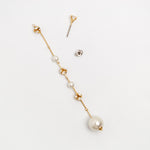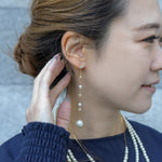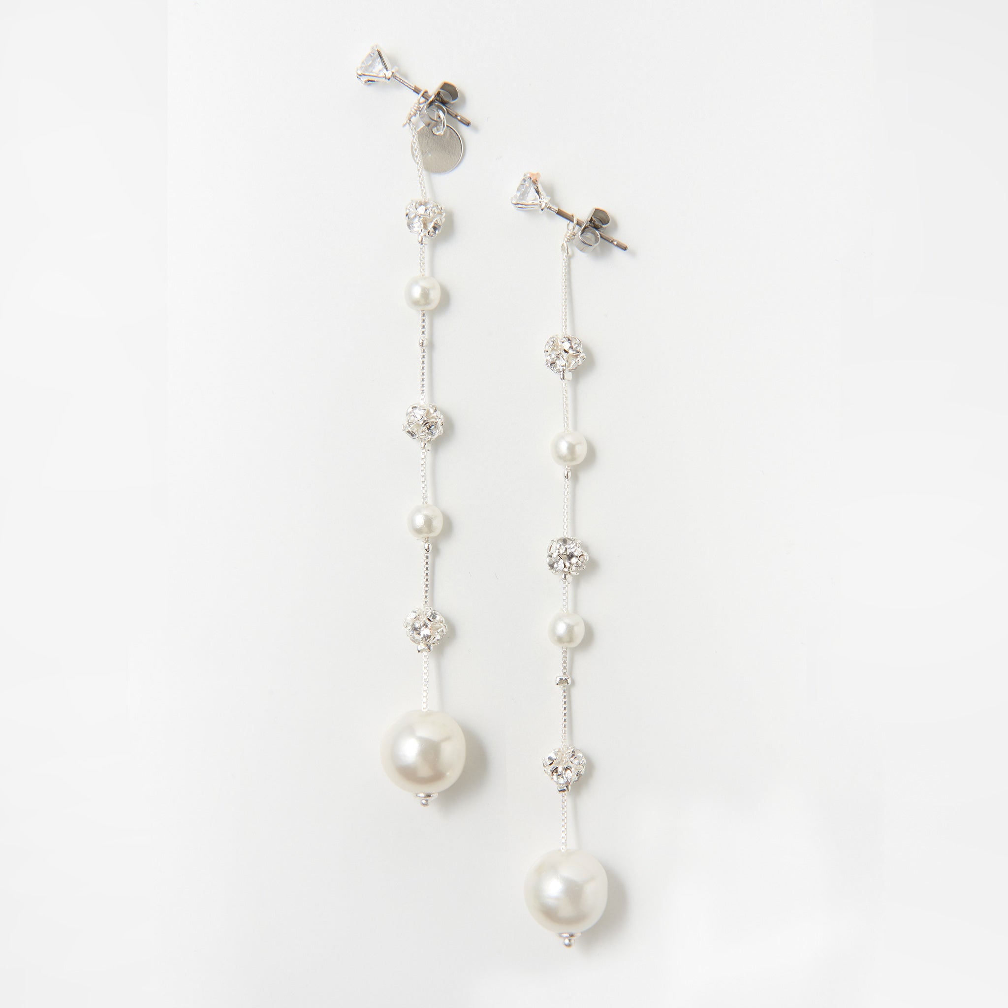 パールとキュービックジルコニアのステーションロングピアス/イヤリングです。ピアスのみ2wayとなっており、1粒キュービックジルコニアのピアスとしてもお使いいただけます。ボリューム違いの1番下のパールがゆらゆら揺れるエレガントなデザイン。オーナメントを集めたようなデザインは冬の季節にピッタリです。フォーマルはもちろんカジュアルスタイルにあえて合わせるのも◎ ※ピアスのみ2way