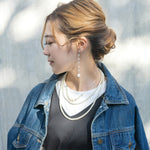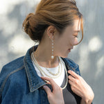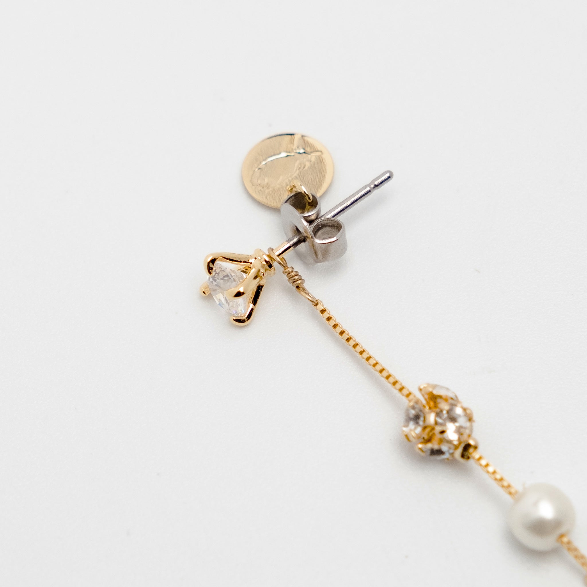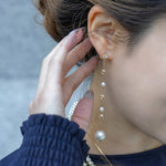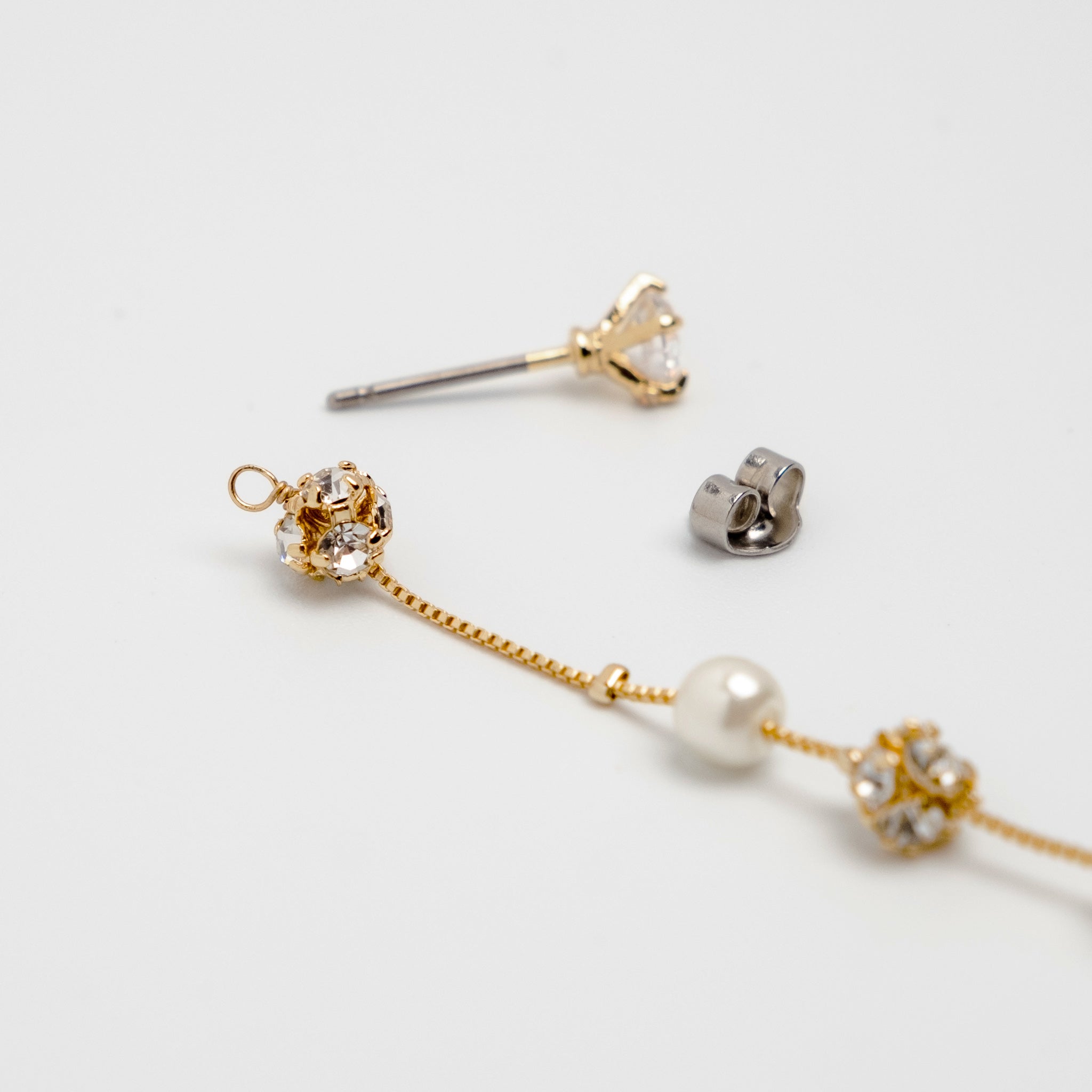耳たぶにちょこんと留まる一粒ビジューをベースに、チェーン部分の取り外しが可能(ピアスのみ)。シンプルなスタイルから、華やかで動きのあるロングスタイルまで、シーンや気分に合わせて自在にアレンジできます。