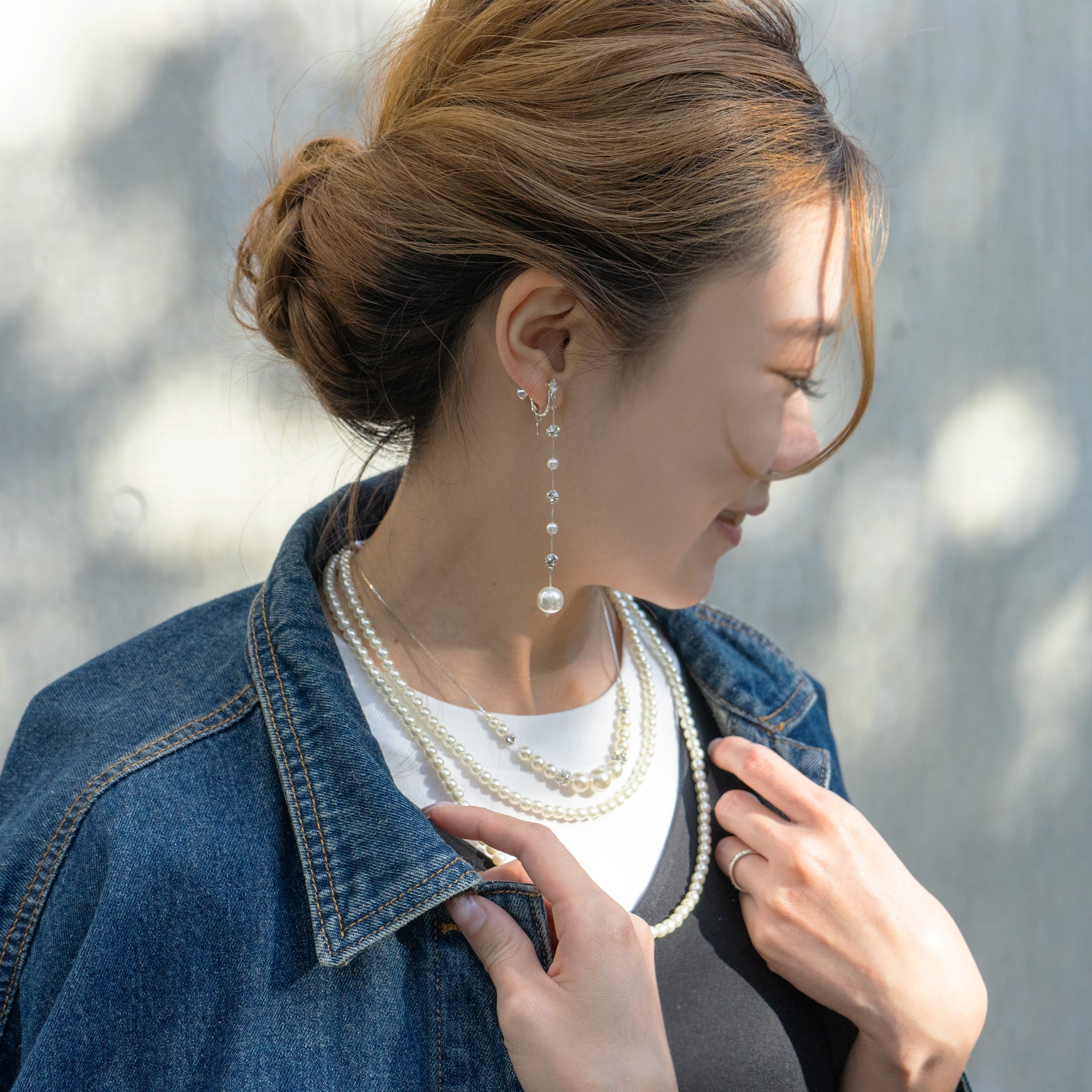 トレンド感のある繊細なチェーンデザインとビジューとパールの上品な組み合わせがシーンレスな万能アクセサリー。