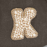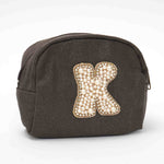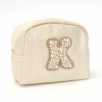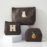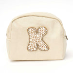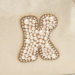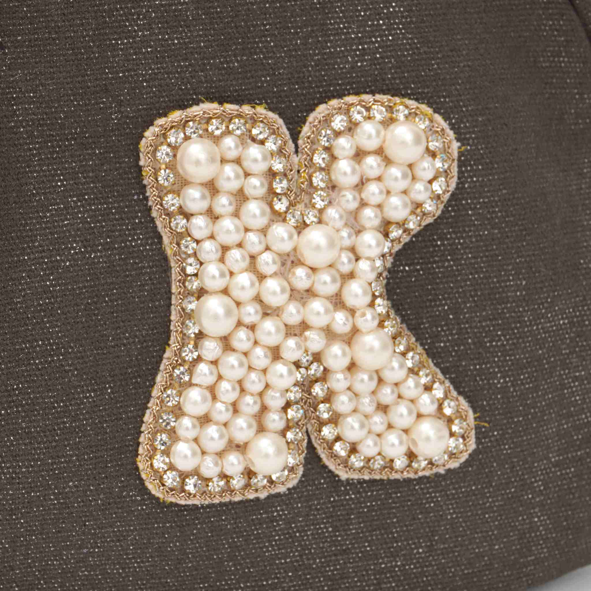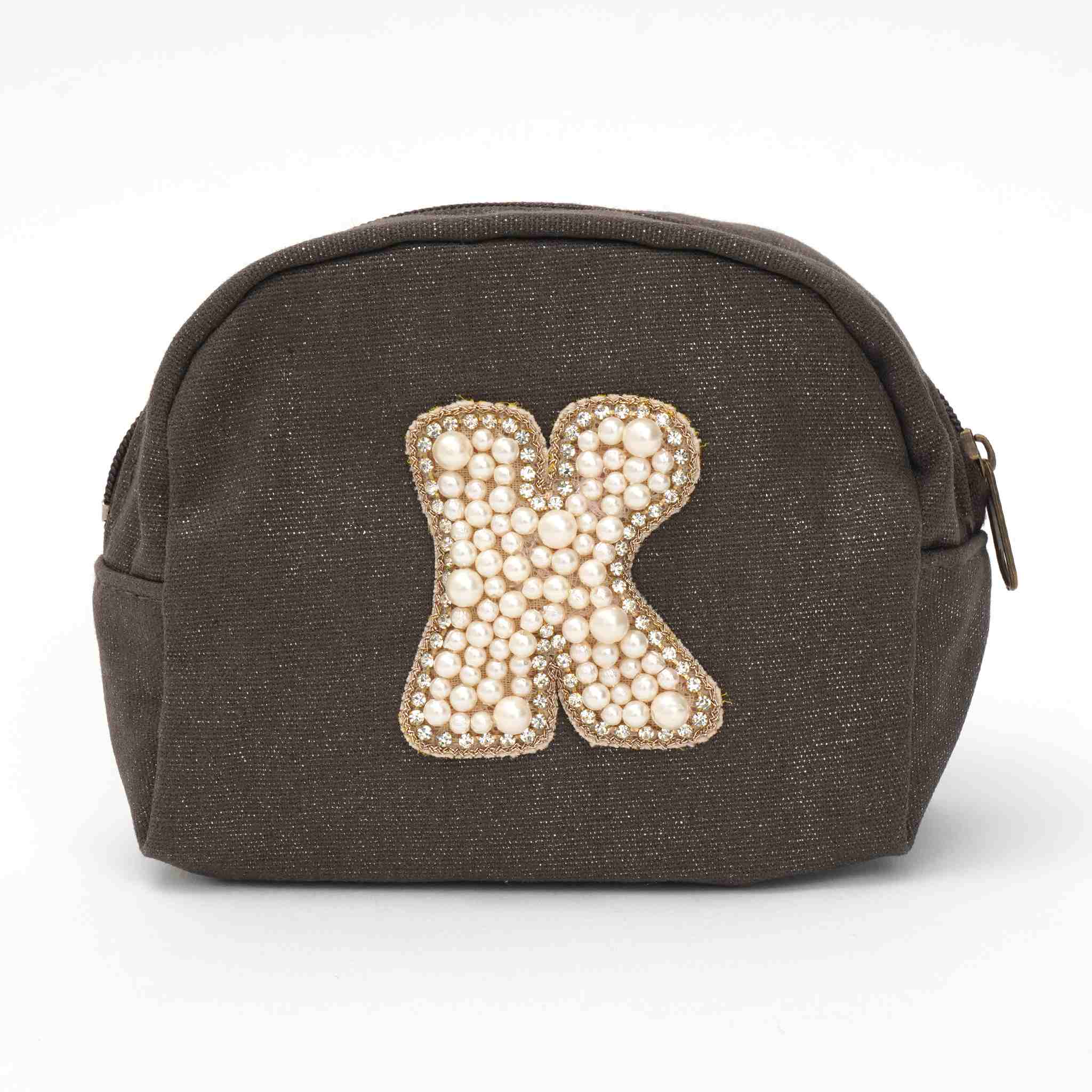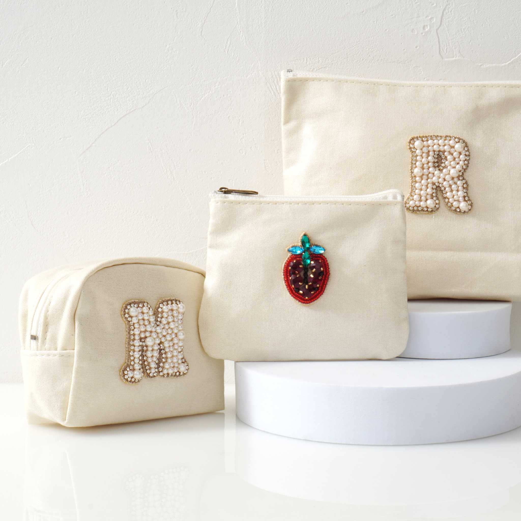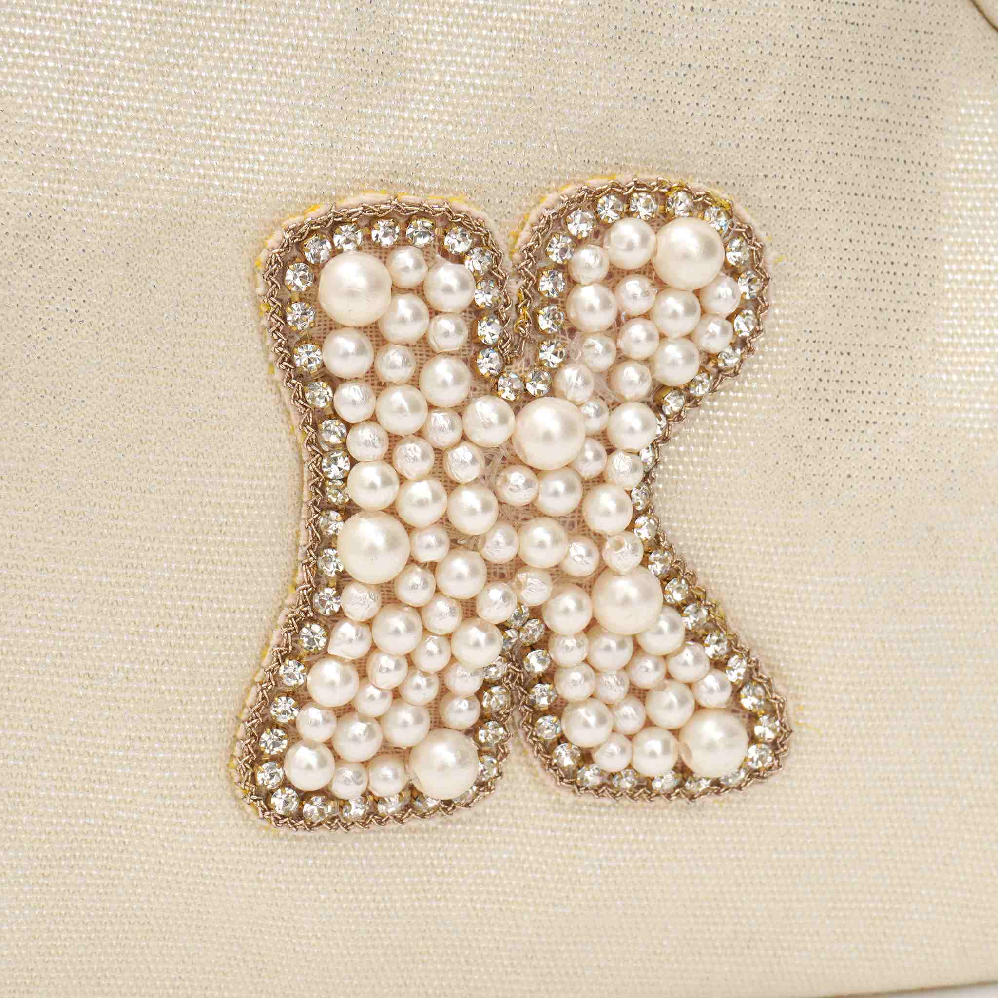 さりげなく輝く箔プリント素材に、パール刺繍のイニシャルをあしらったボックスタイプのポーチ。