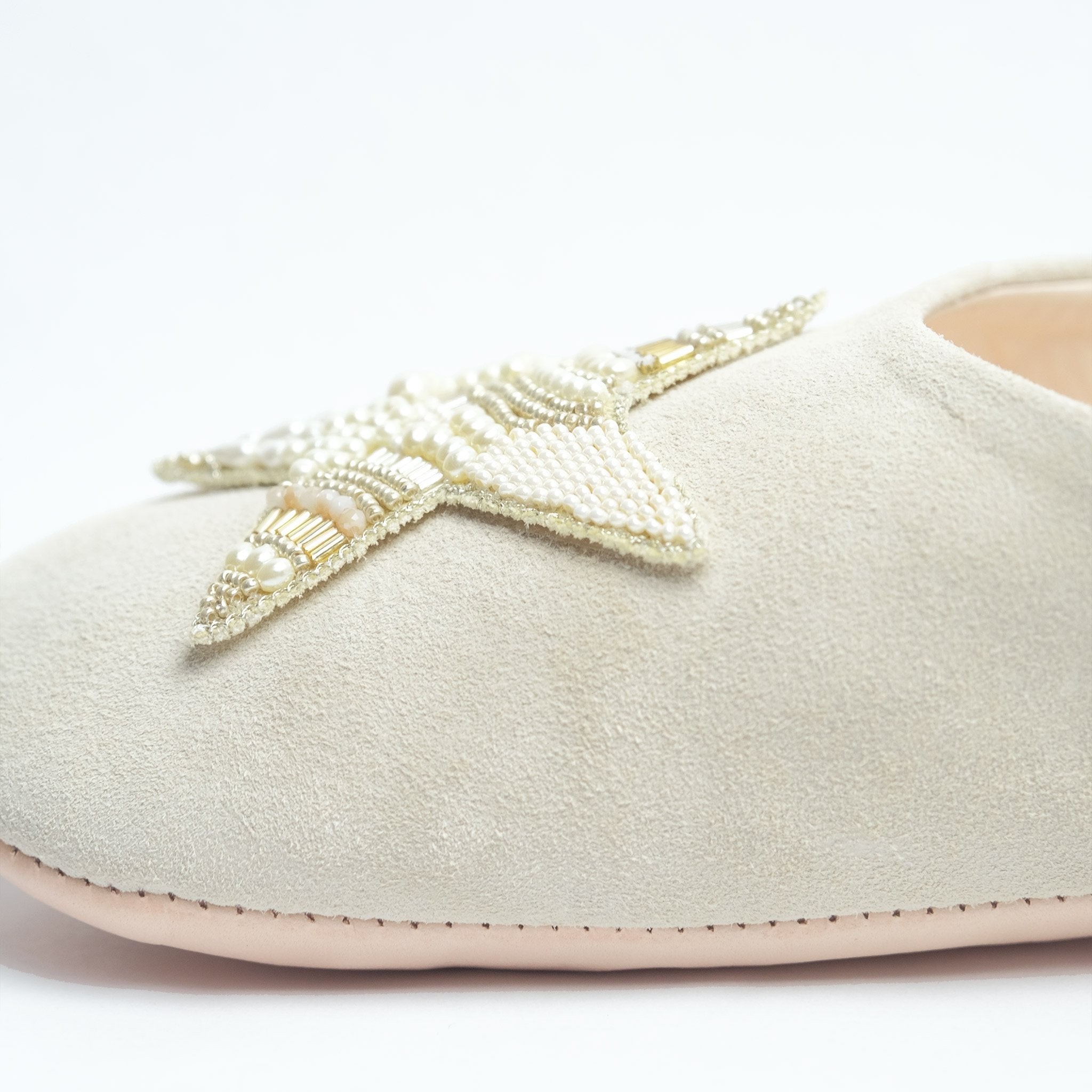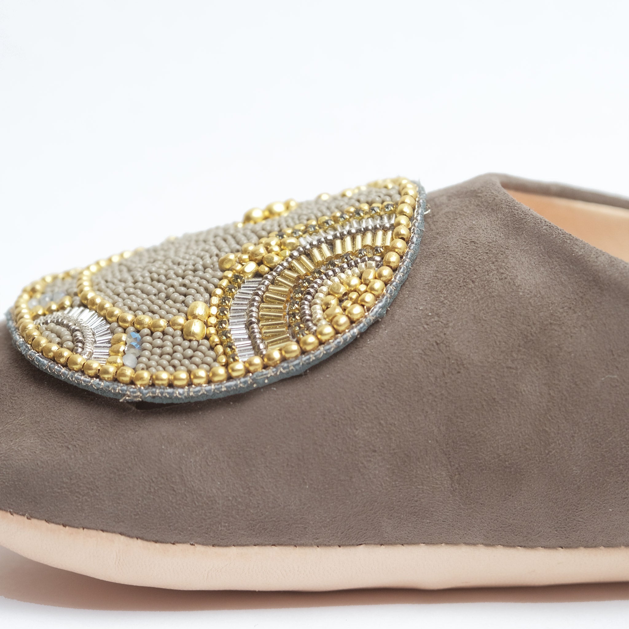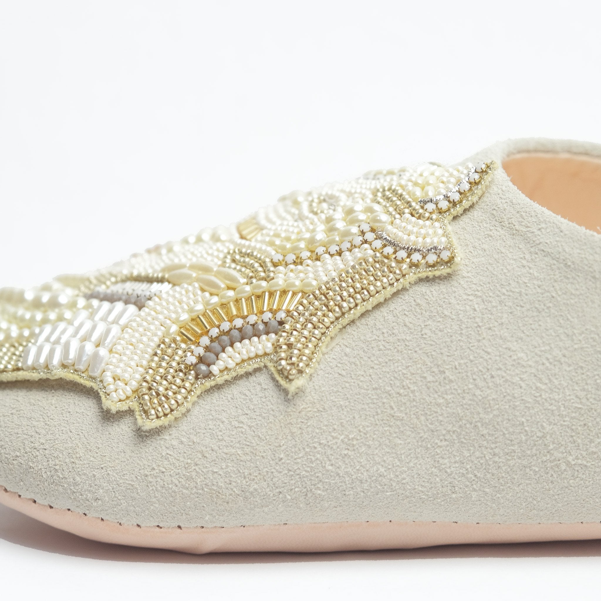 職人の手仕事が生み出す、繊細で美しい刺繍がこのバブーシュの最大の魅力。一針一針丁寧に施されたビジュー刺繍は、光の加減でさりげなく輝き、足元に上品なアクセントをプラスします。