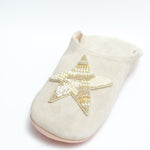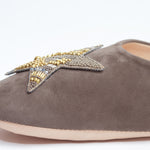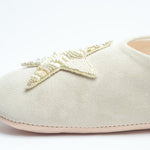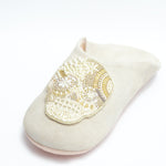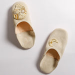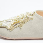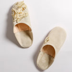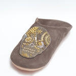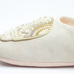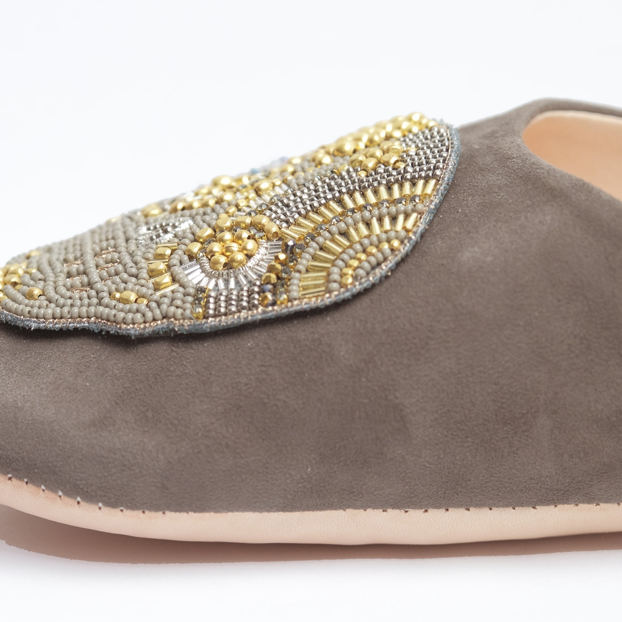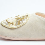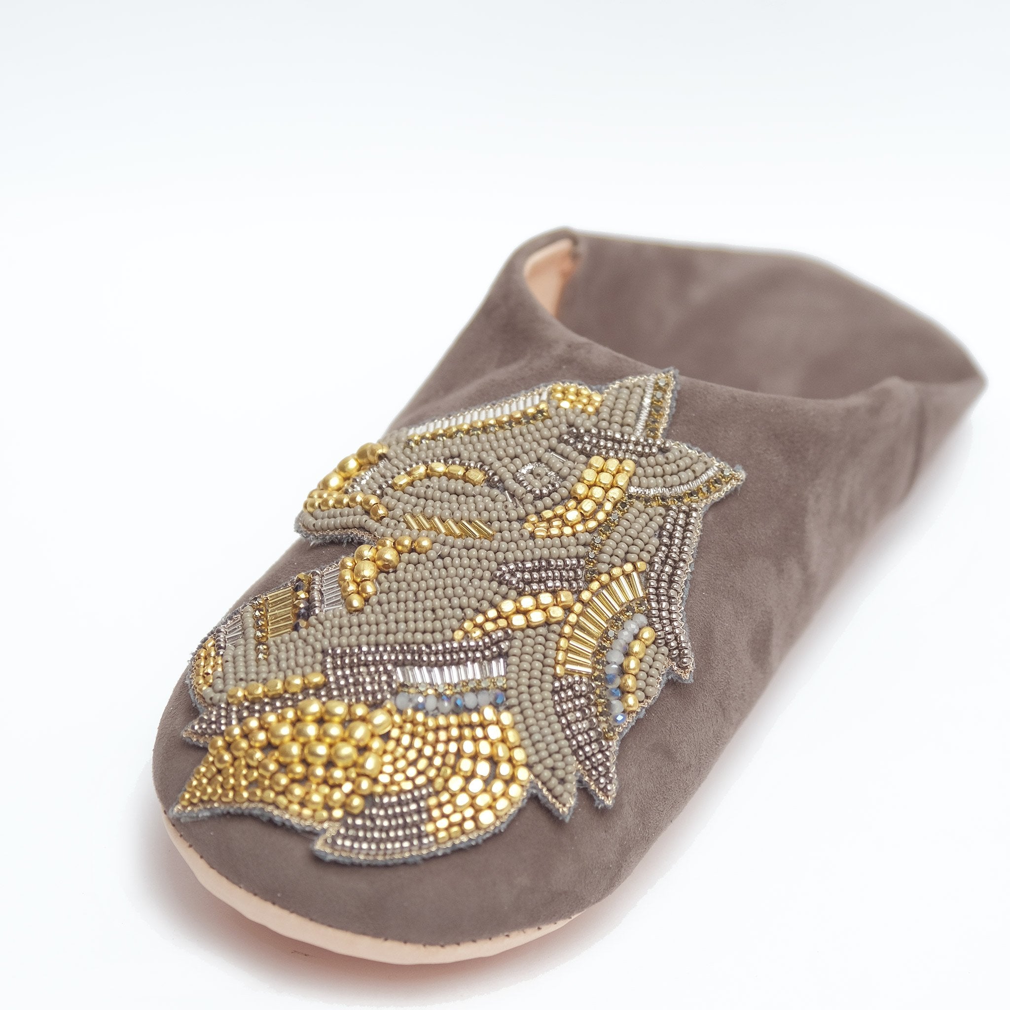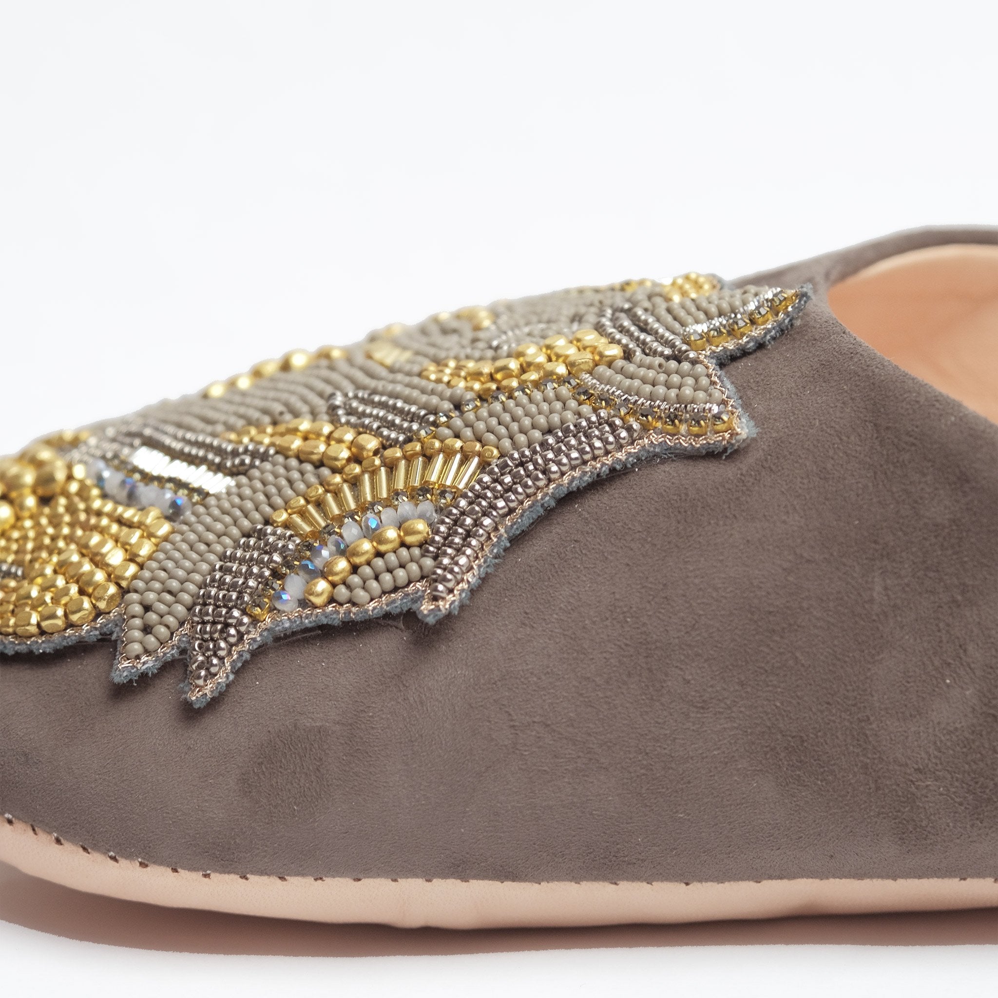 職人の手仕事が生み出す、繊細で美しい刺繍がこのバブーシュの最大の魅力。一針一針丁寧に施されたビジュー刺繍は、光の加減でさりげなく輝き、足元に上品なアクセントをプラスします。