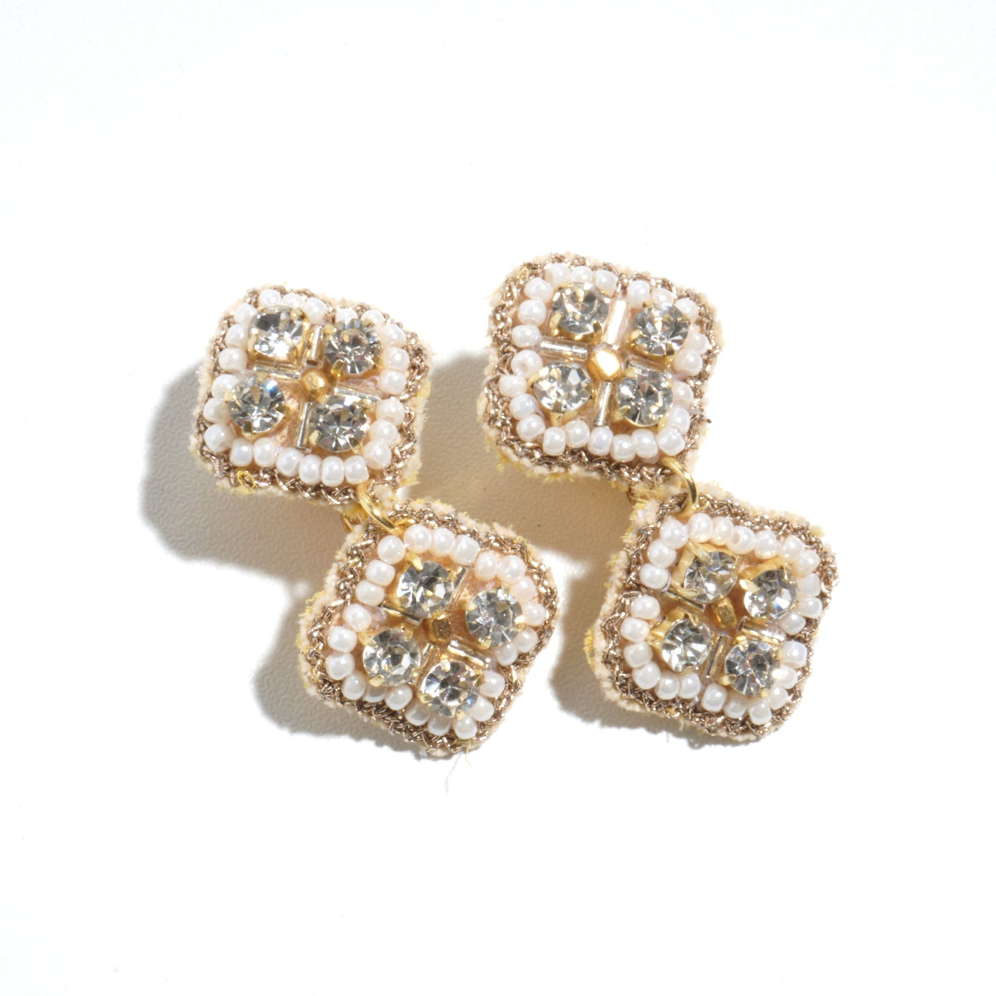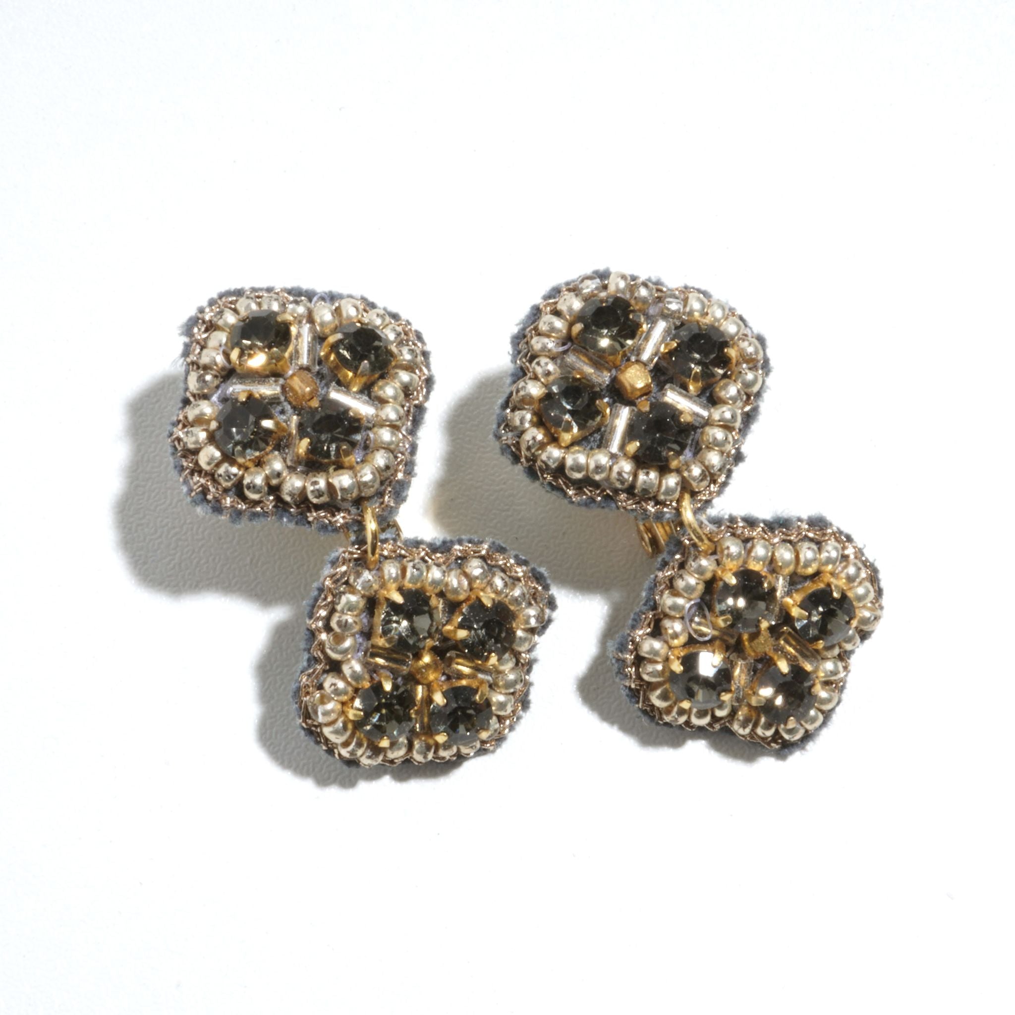 四つ葉のクローバーのようなモチーフを連ねたピアス/イヤリング。上品なかわいらしさをデイリーでも使いやすいサイズ感にぎゅっと詰め込みました。ホワイトは清楚で上品なイメージ、ブラックダイアモンドは落ち着いたモードさをイメージしています。