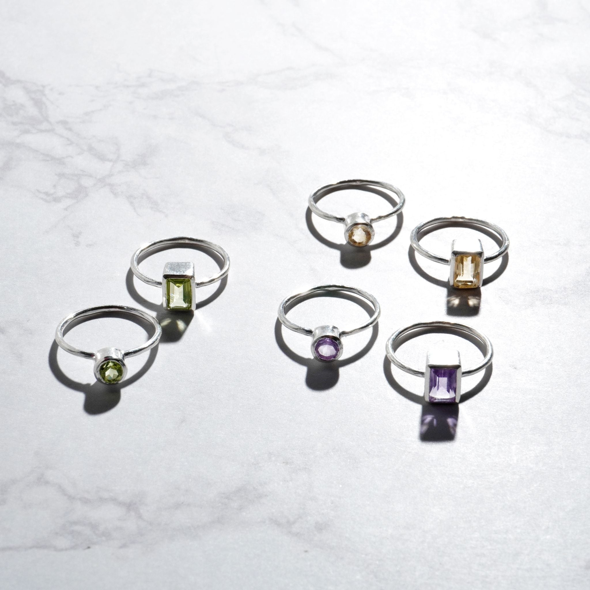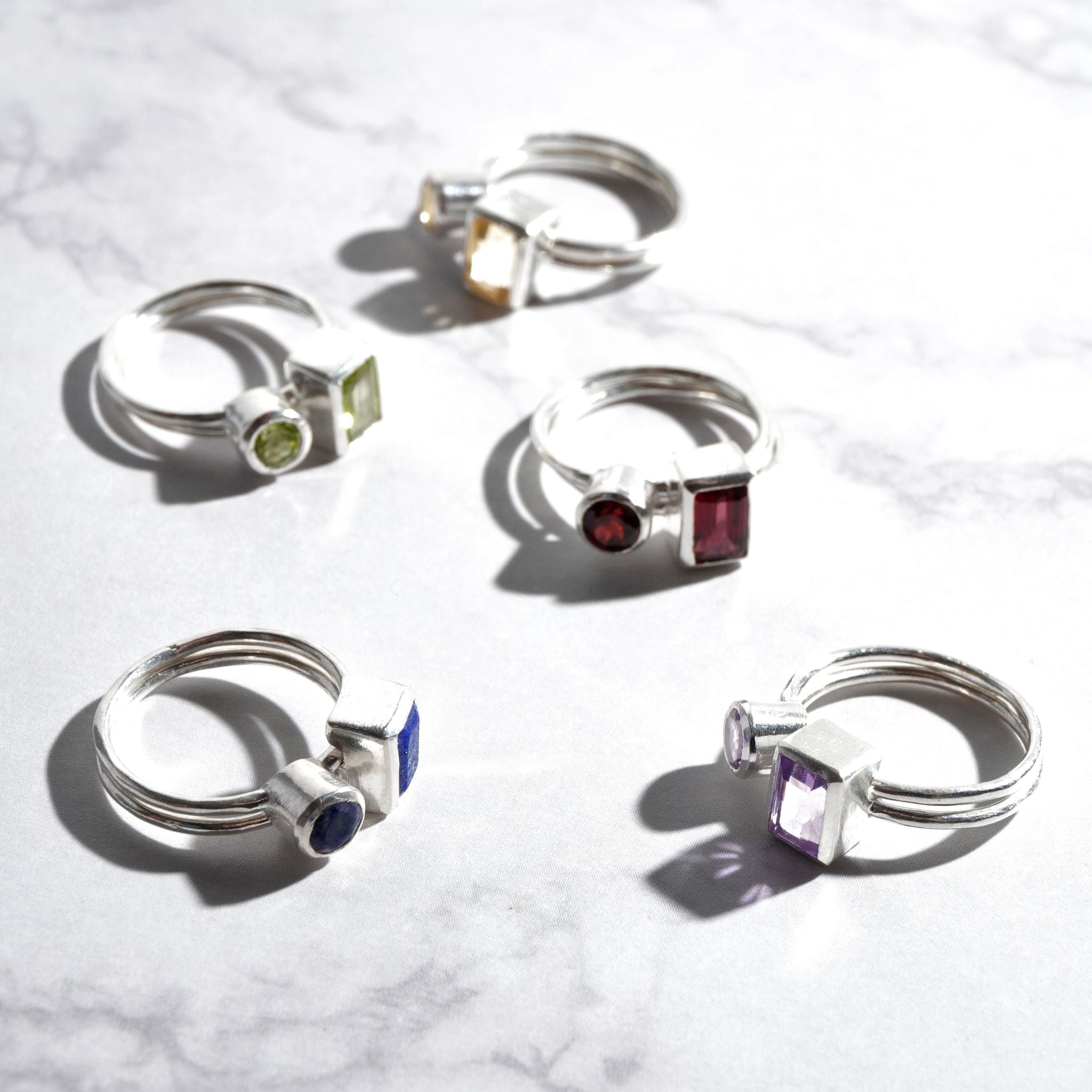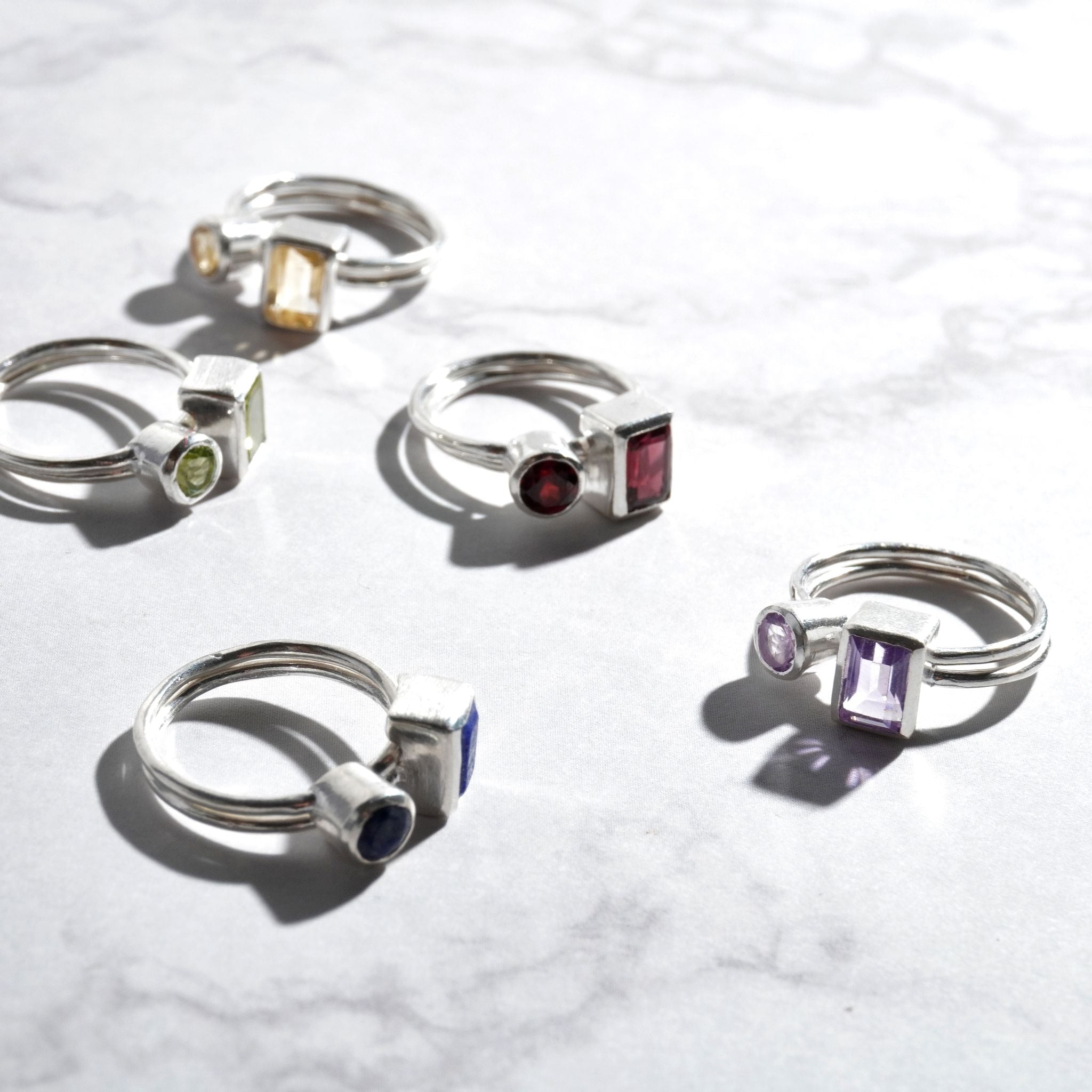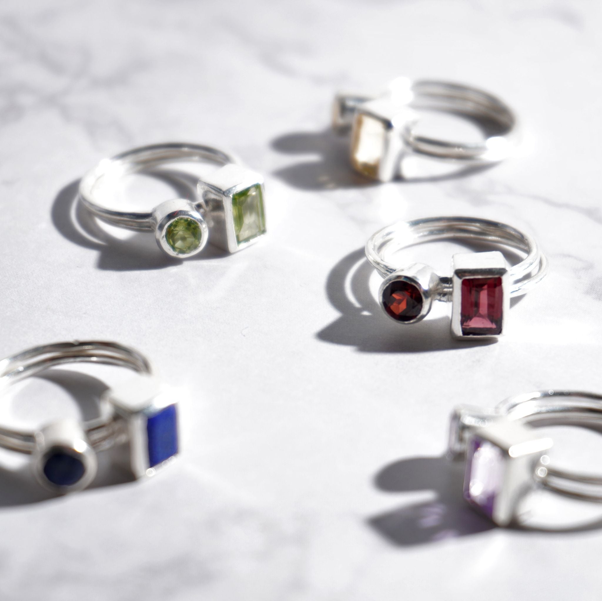 インド・ジャイプールで厳選された良質の天然石。厳選した5種類の石を2サイズ組み合わせたMAYGLOBE初のスタッキングリング。組み合わせてはめることも、別々にはめることも可能です。オーバルの石の台座にはくぼみを設けており、2つのリングがきっちり重なるようにデザインしています。お持ちのリングとの重ね付けもお楽しみいただけます。