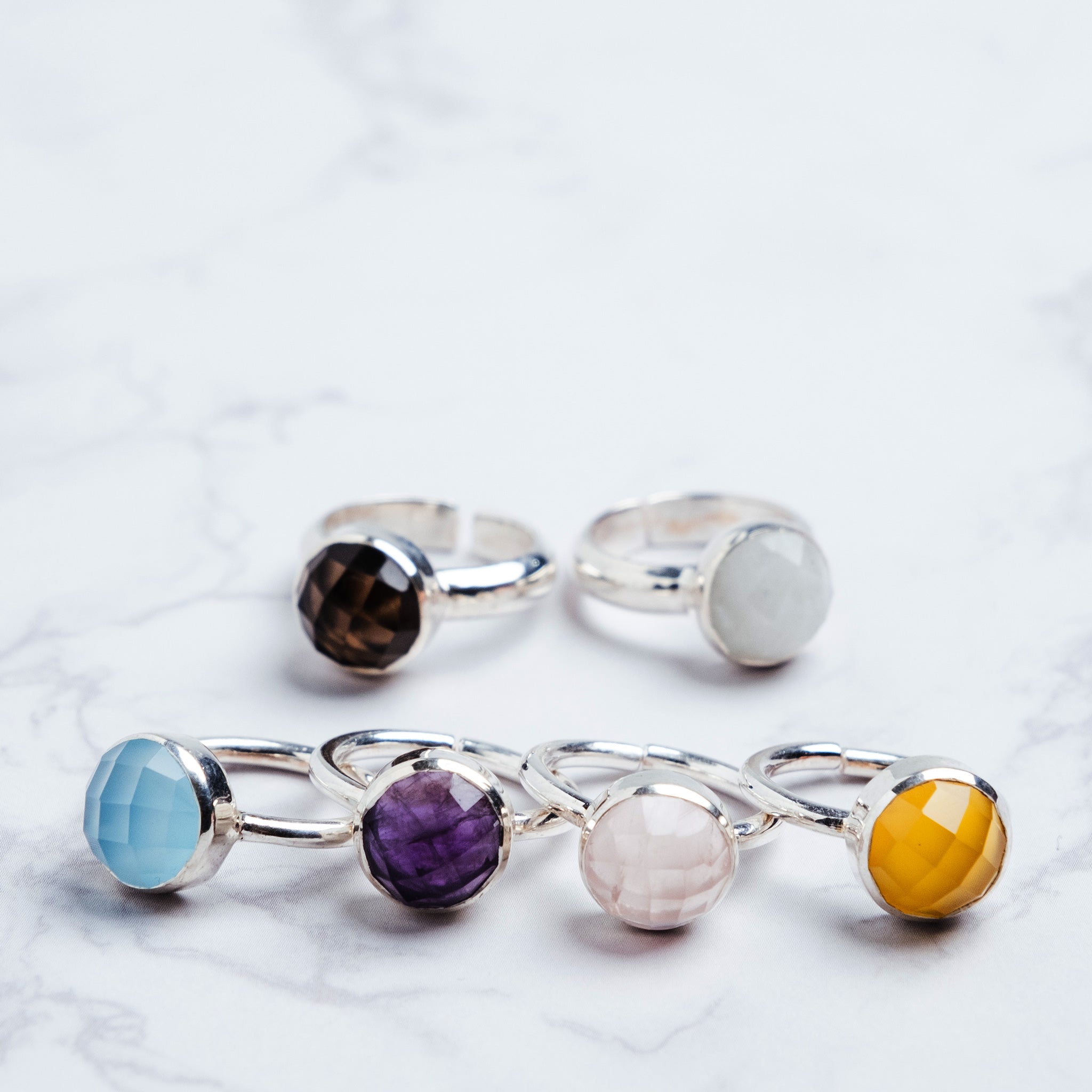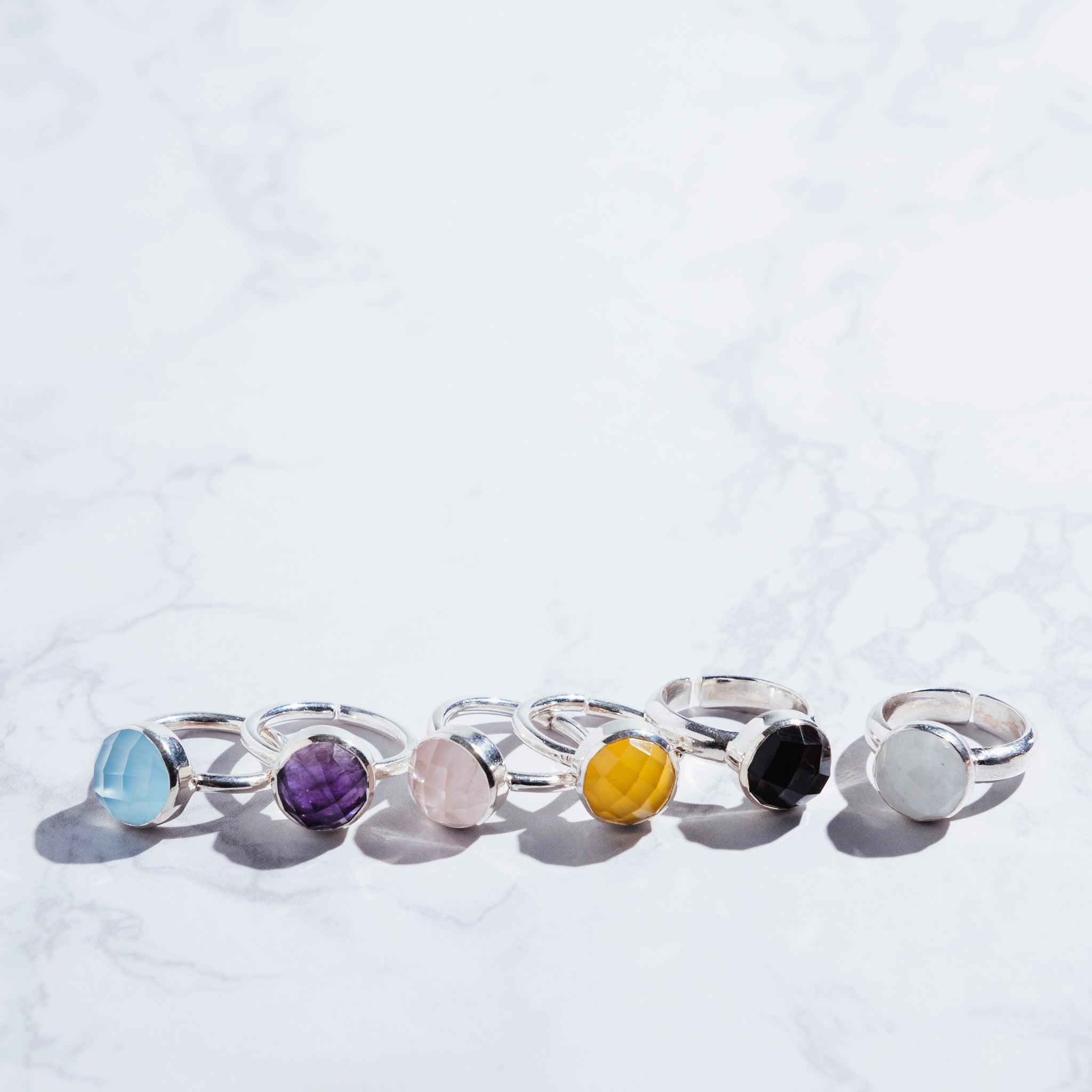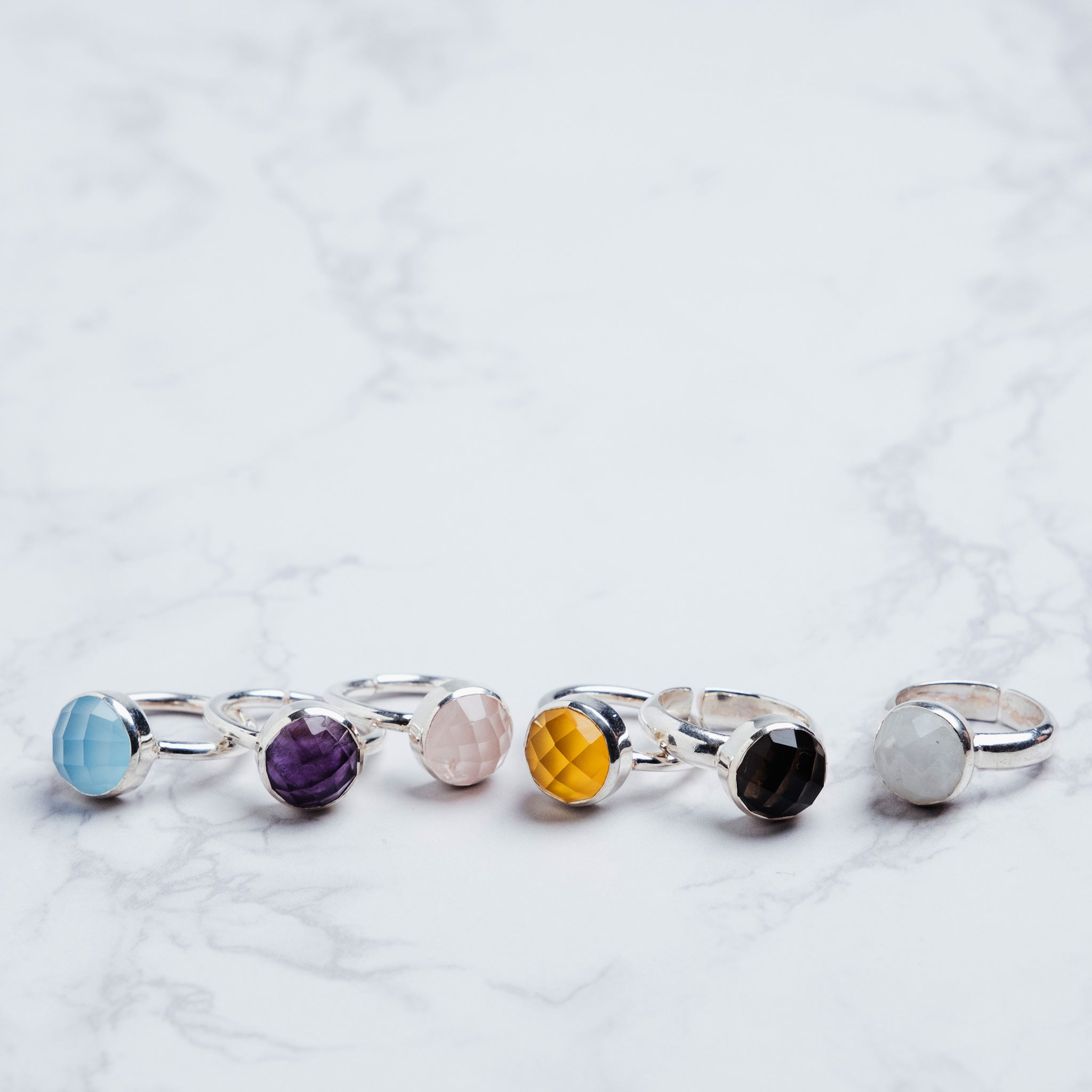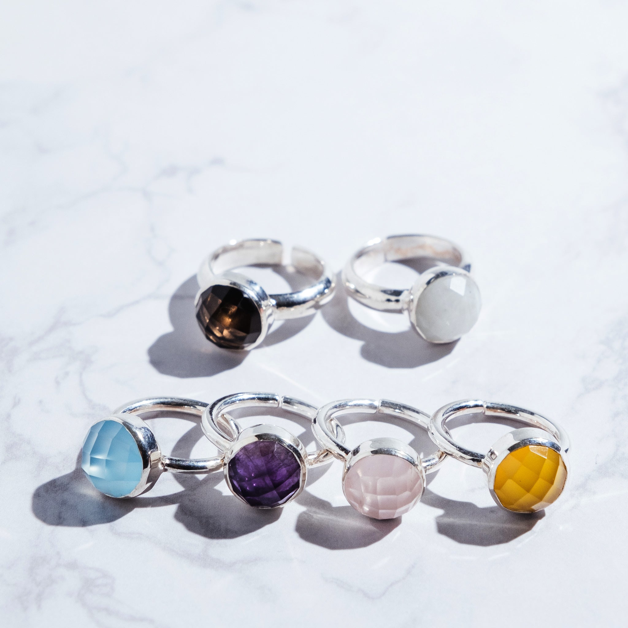 インド・ジャイプールで厳選された良質の天然石。厳選した7種類の石に キラキラと石を輝かせるカッティングを 施した華やかなラウンド型リング。インドの職人が1つ1つ丁寧に作り上げています。全て1点物、あなただけのオンリーワンジュエリーです。