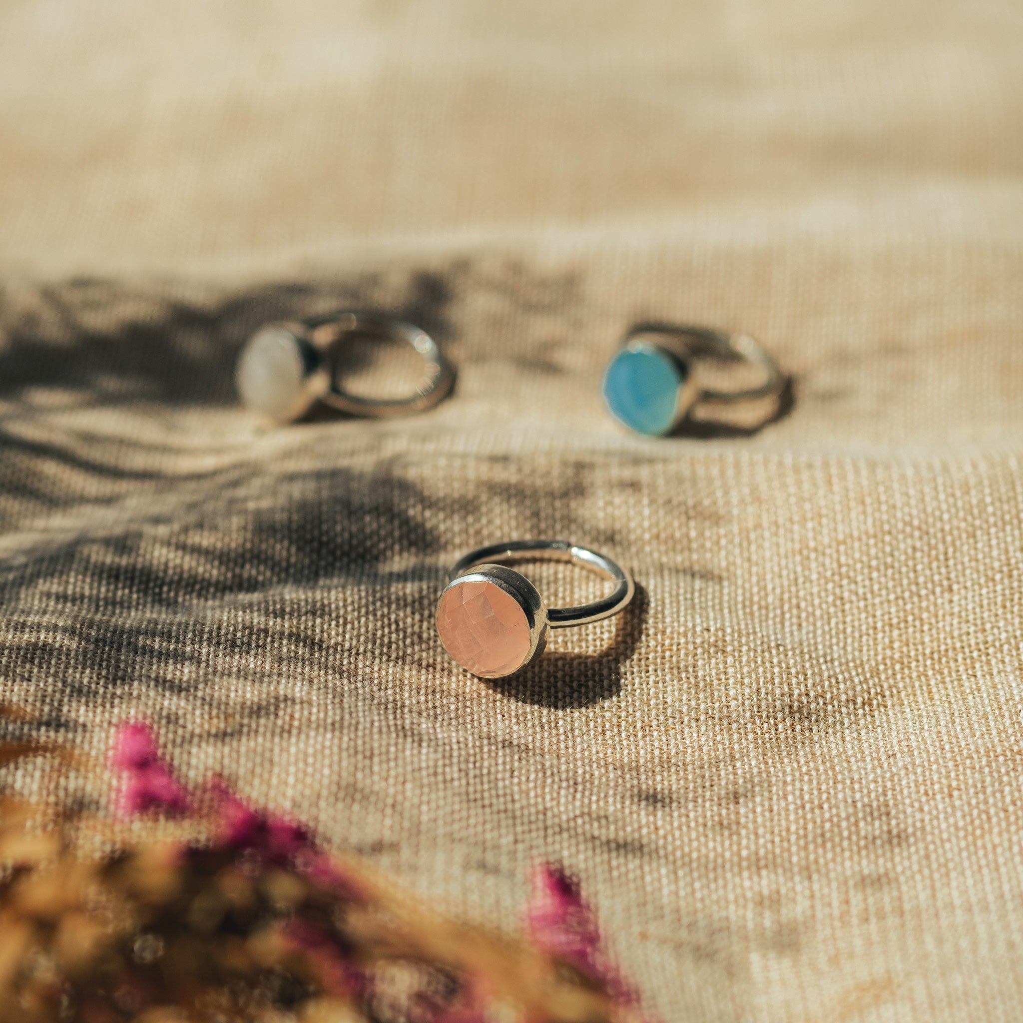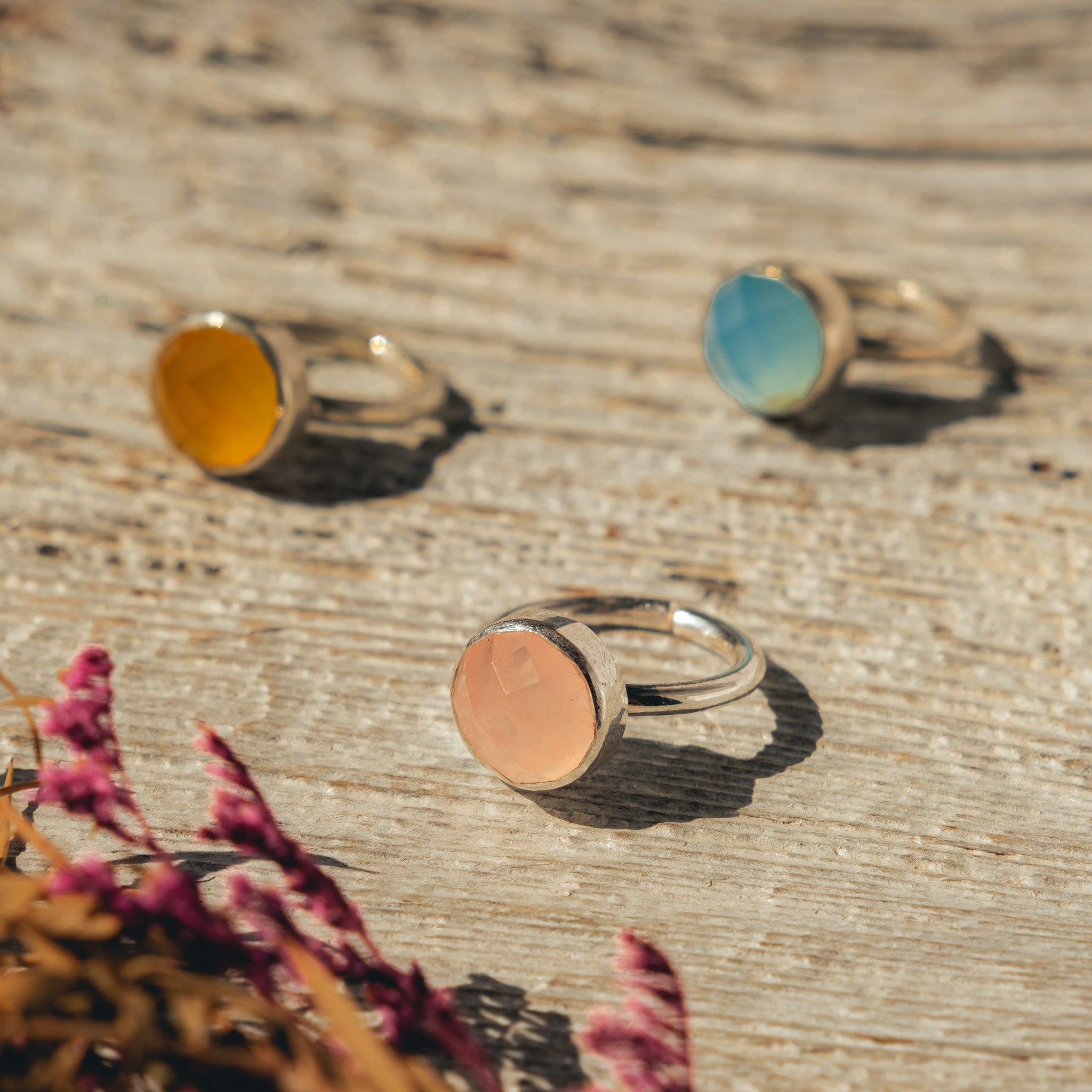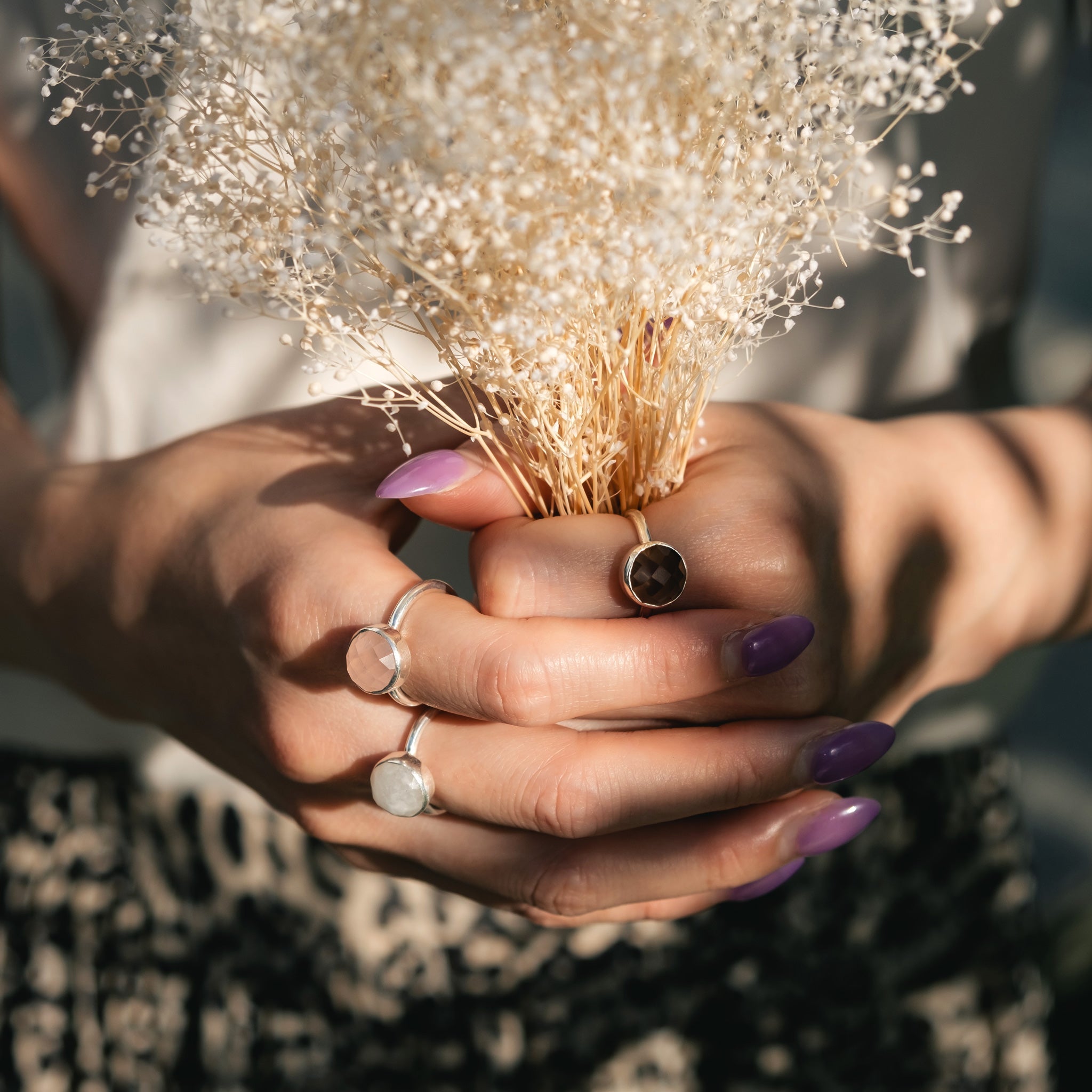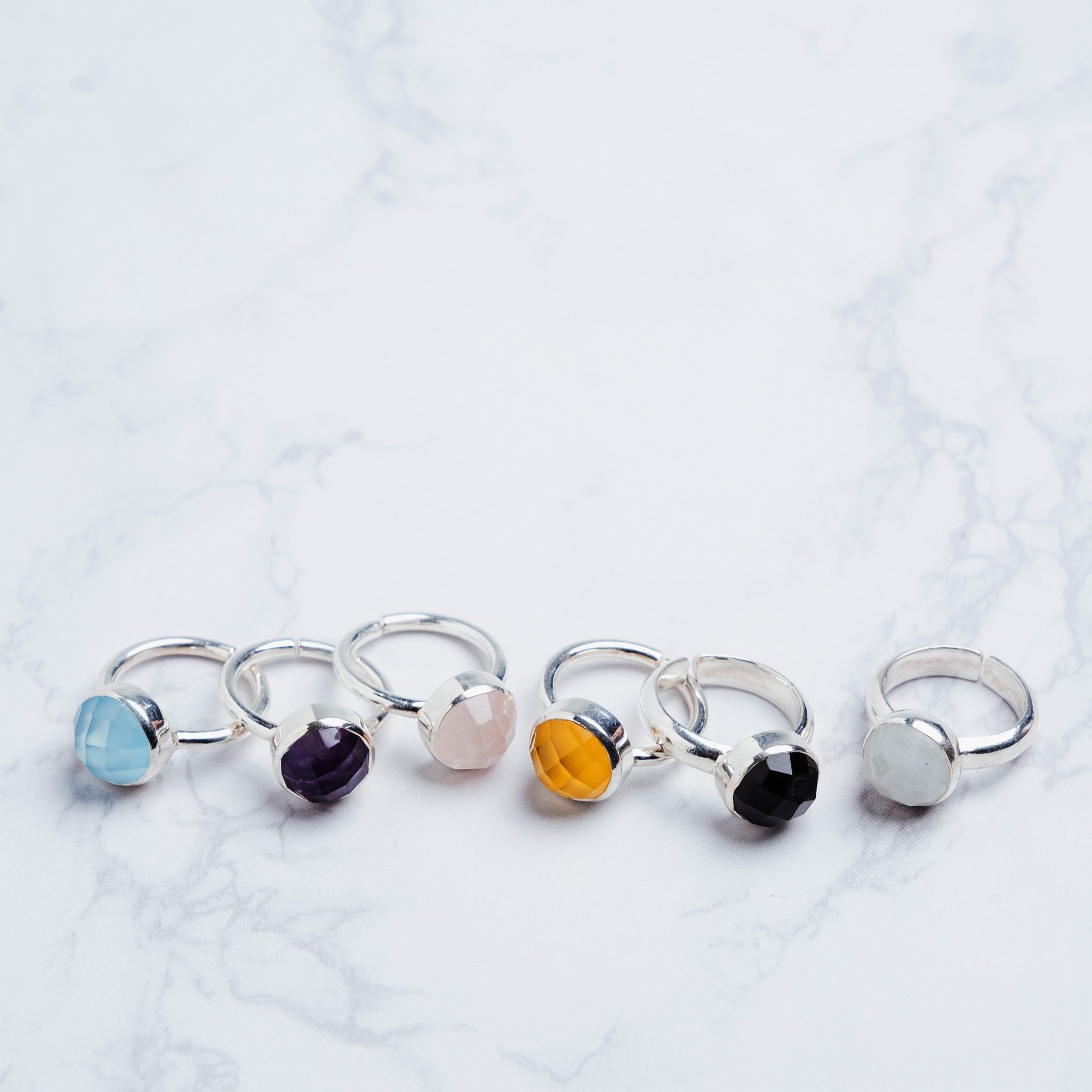 インド・ジャイプールで厳選された良質の天然石。厳選した7種類の石に キラキラと石を輝かせるカッティングを 施した華やかなラウンド型リング。インドの職人が1つ1つ丁寧に作り上げています。全て1点物、あなただけのオンリーワンジュエリーです。